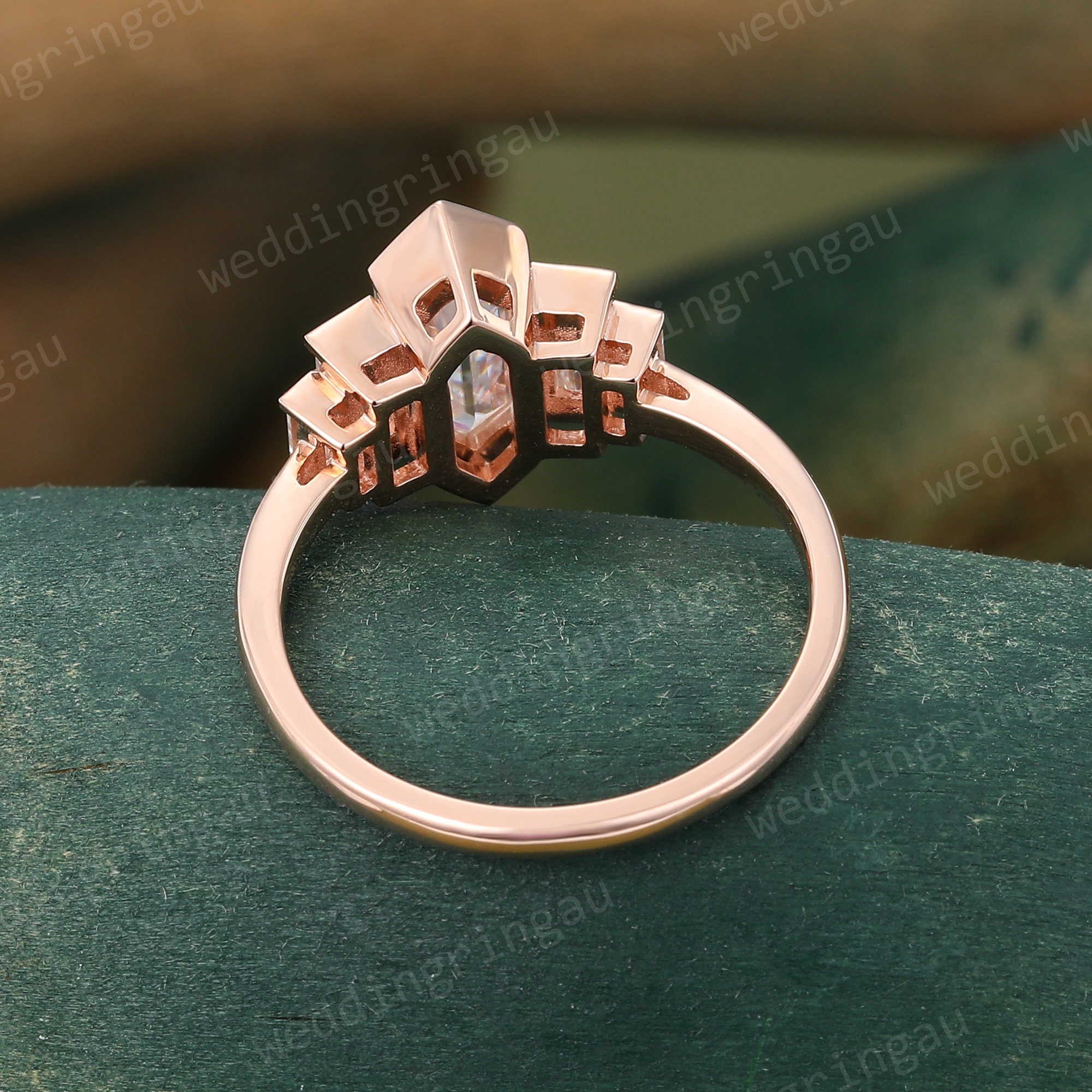 Hexagon Cut Moissanite Engagement Ring Set Vintage Rose Gold Baguette Moissanite Ring Leaf Curved Wedding Ring Bridal Promise Ring