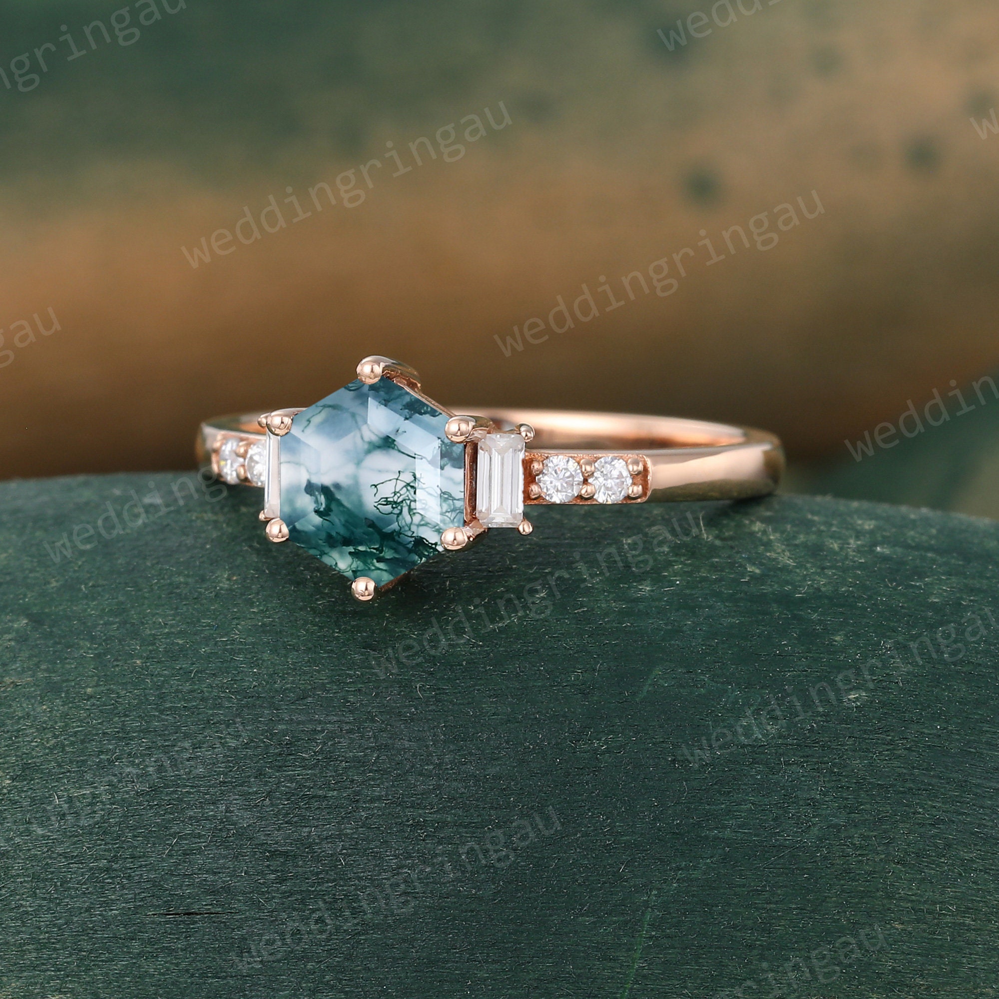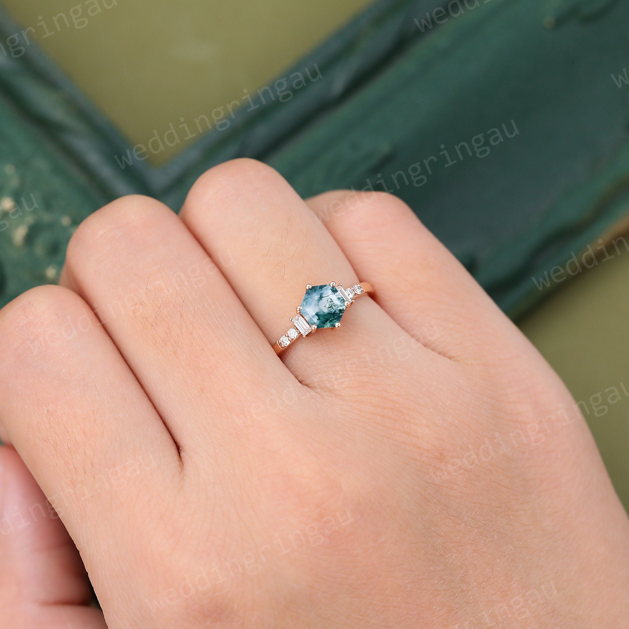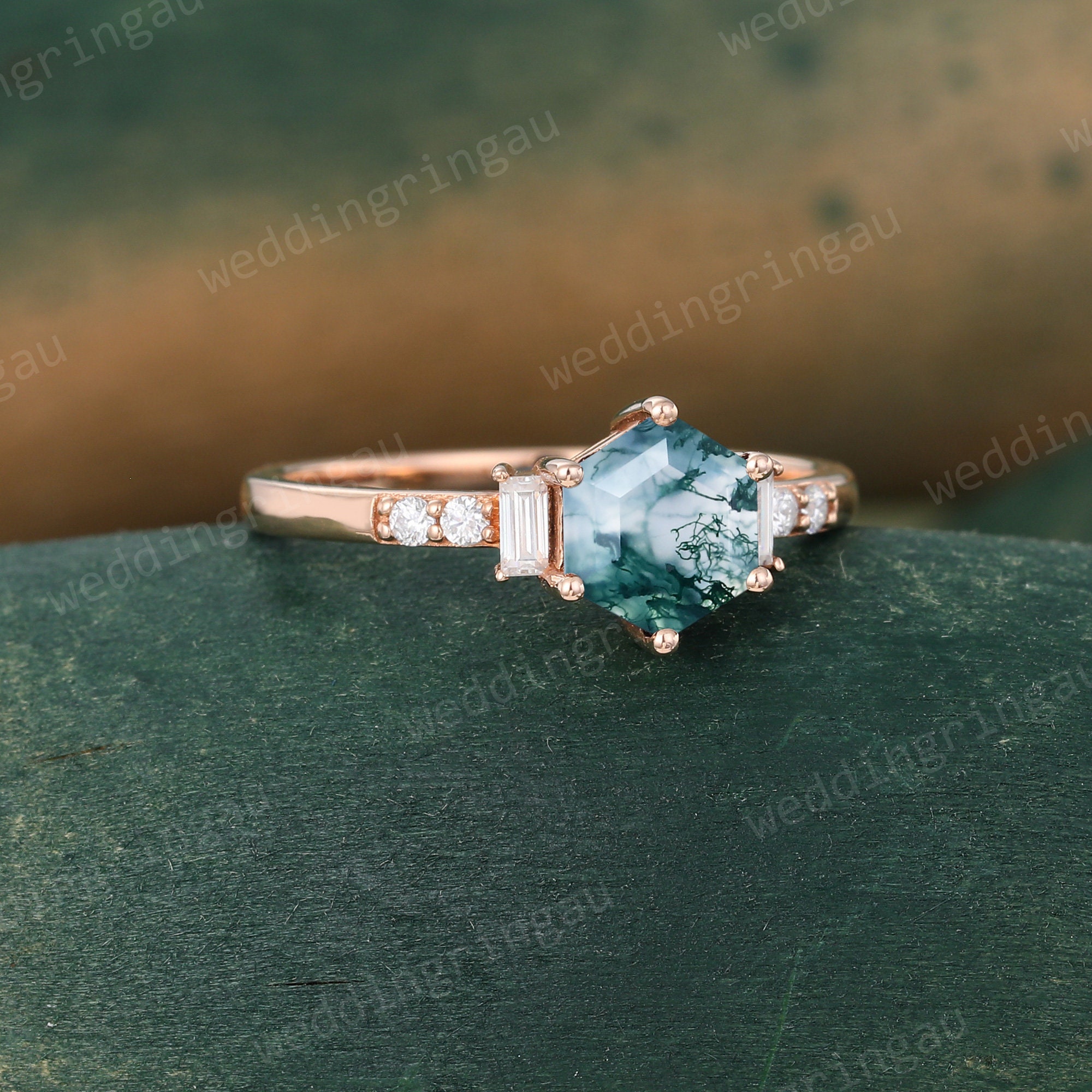 Hexagon cut Green Moss agate ring Vintage Rose gold engagement ring Baguette cut moissanite ring Diamond bridal anniversary ring for women