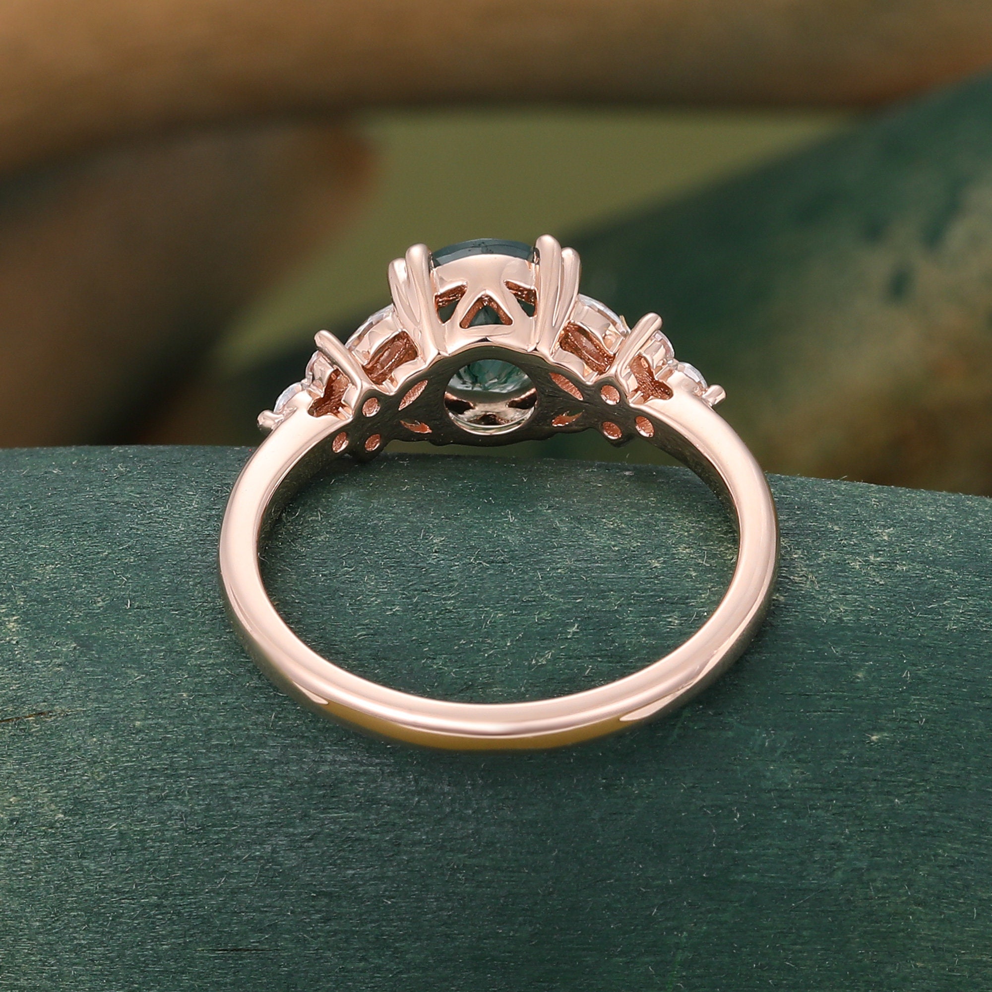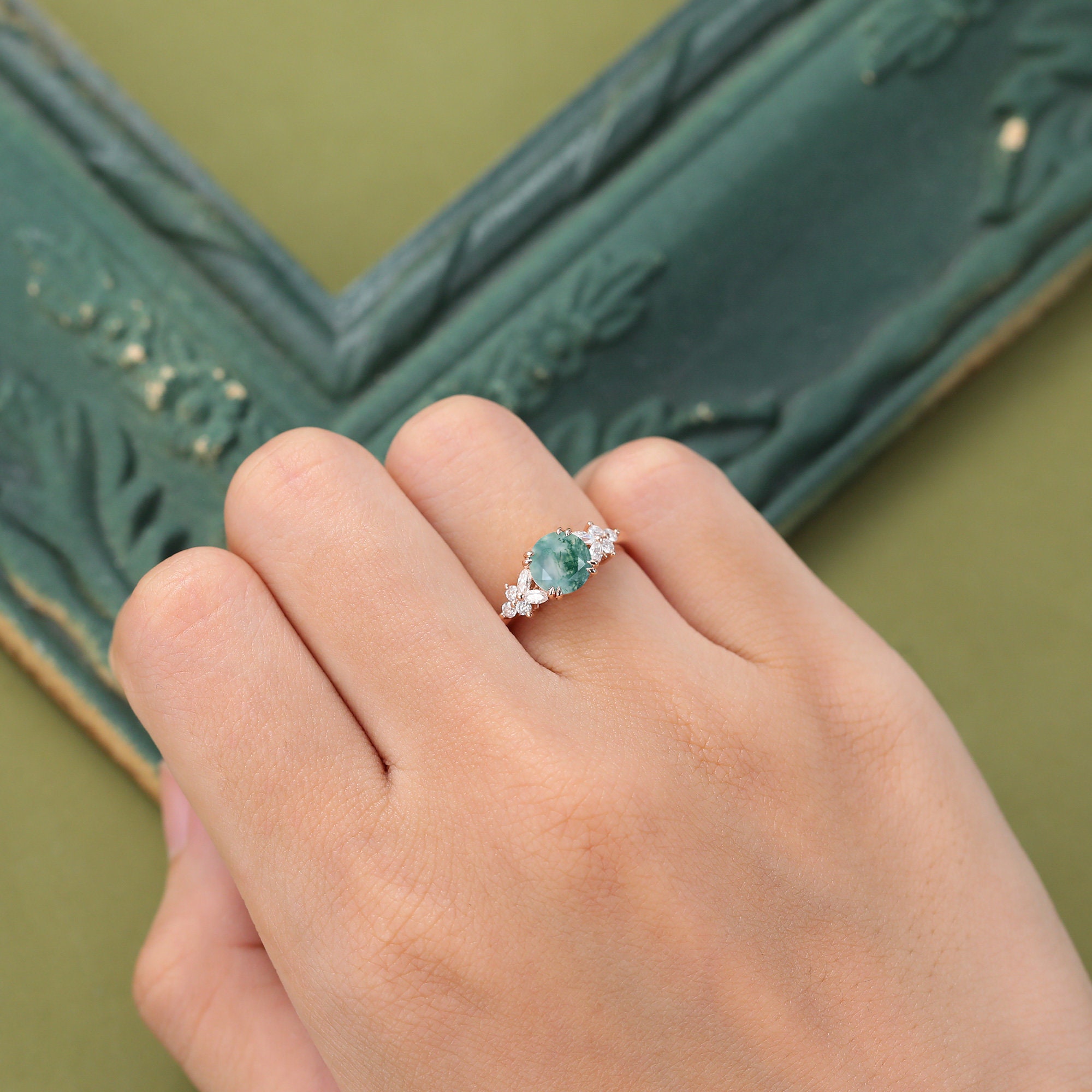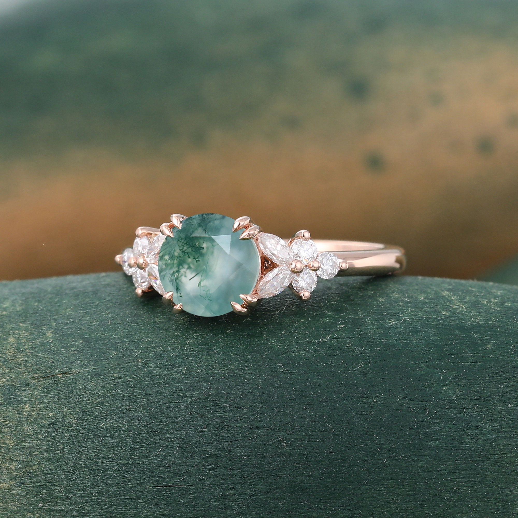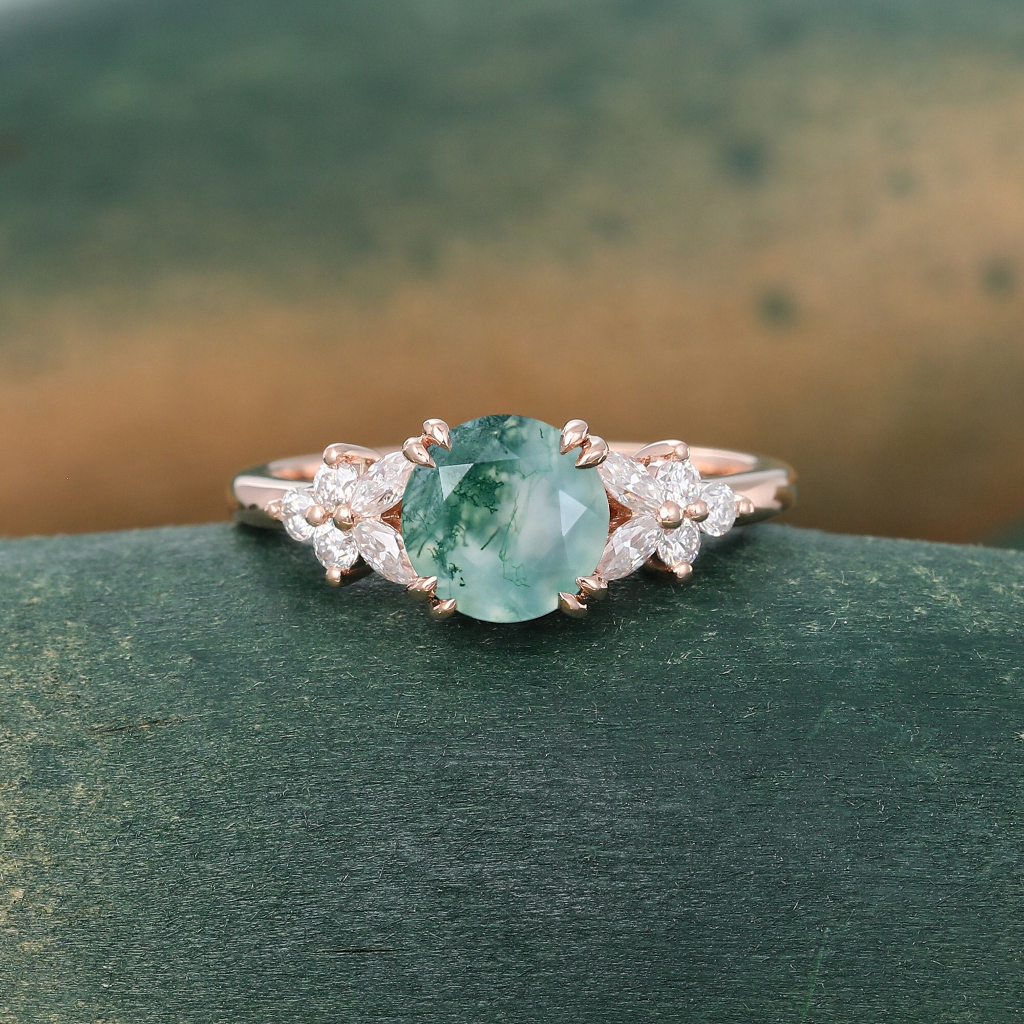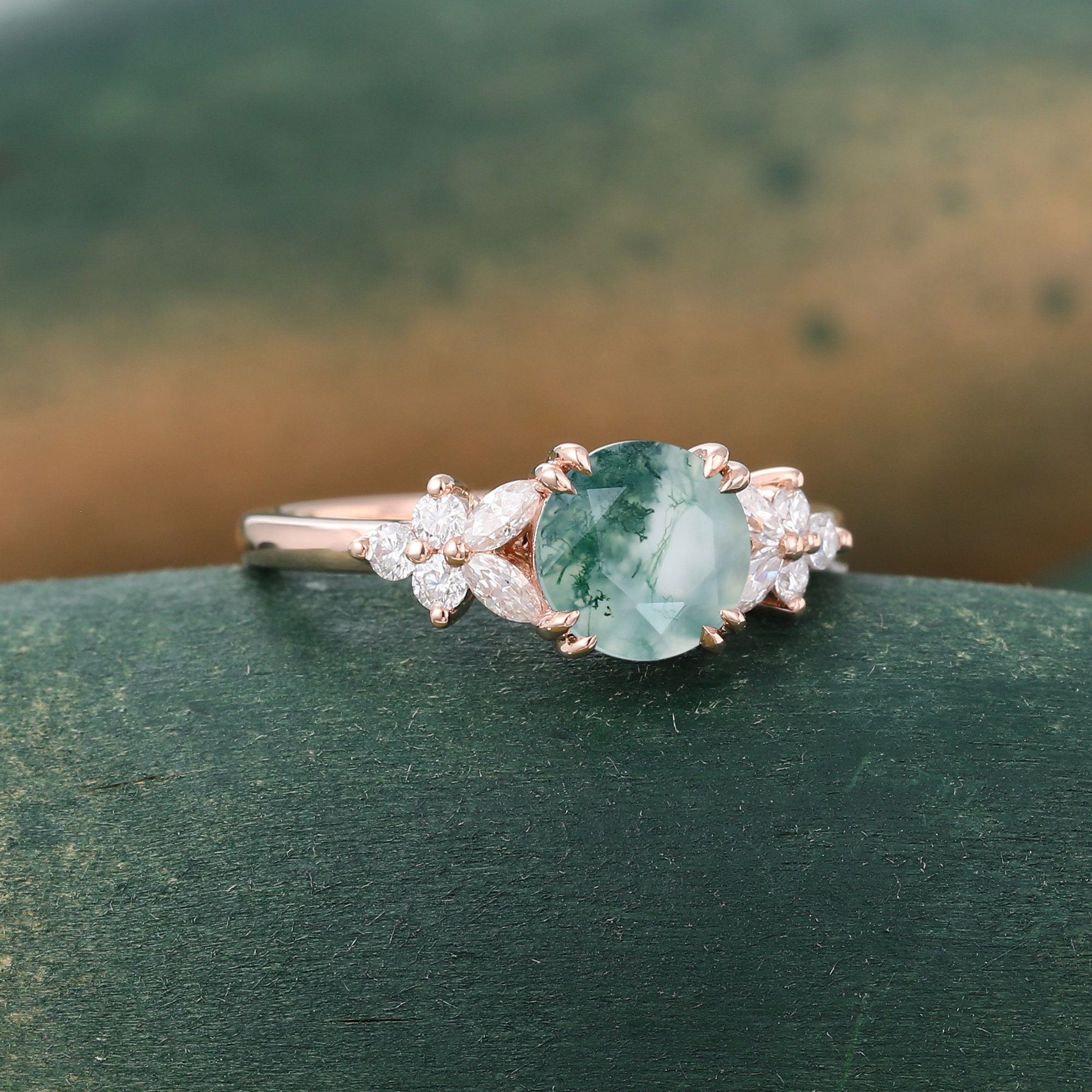 Unique Green Moss agate engagement ring Vintage Rose gold ring Marquise cut Moissanite ring Diamond Cluster ring anniversary ring for women