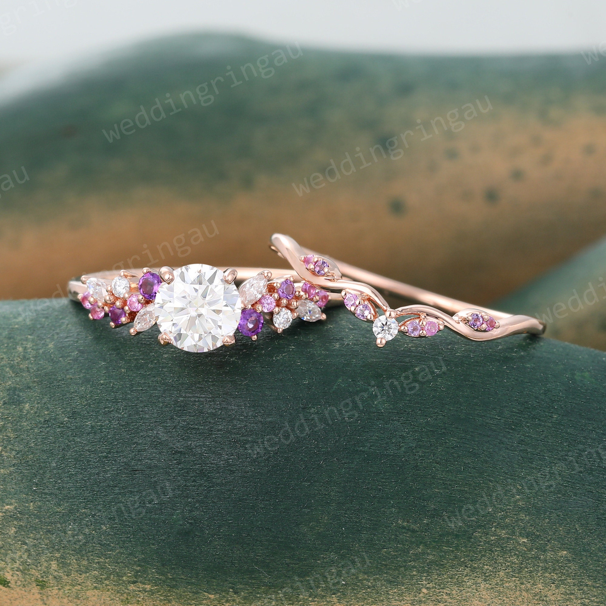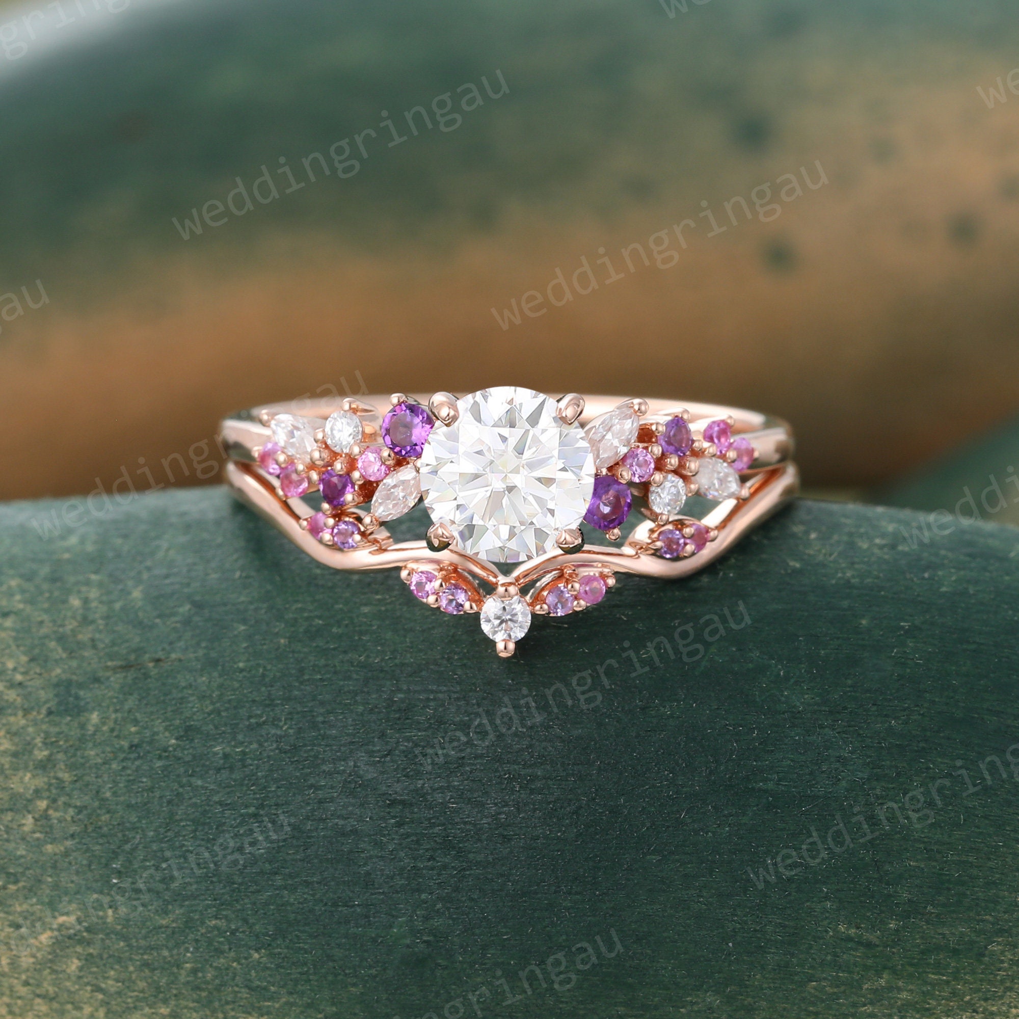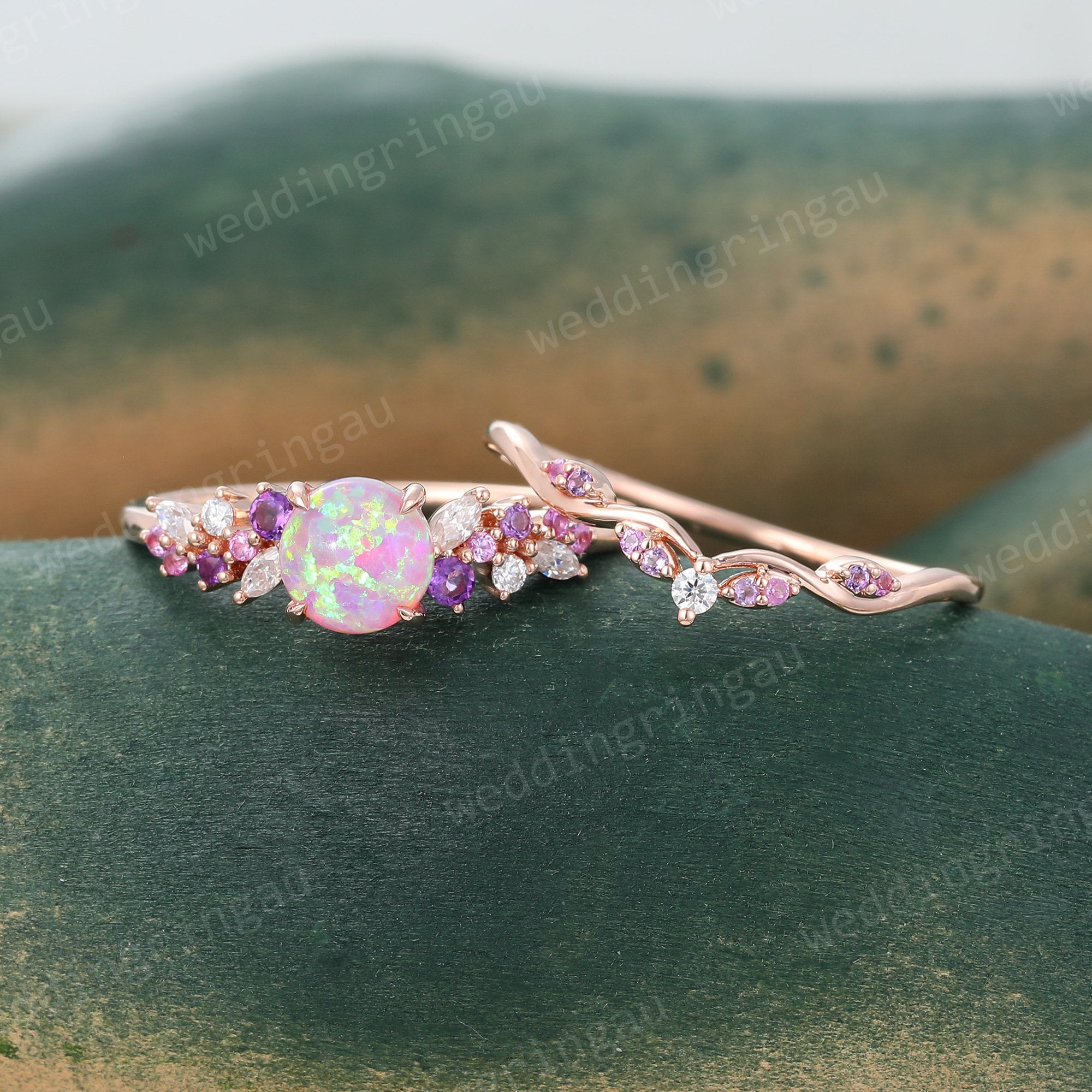 Pink Opal Engagement ring set Vintage Rose gold Bridal ring set Amethyst ring Pink sapphire Curved wedding ring Diamond ring Promise ring
