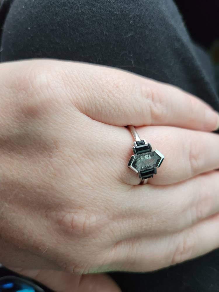 Hexagon cut Black rutilated quartz ring Unique gemstone engagement ring Vintage Rose gold ring Baguette cut Black onyx ring promise ring