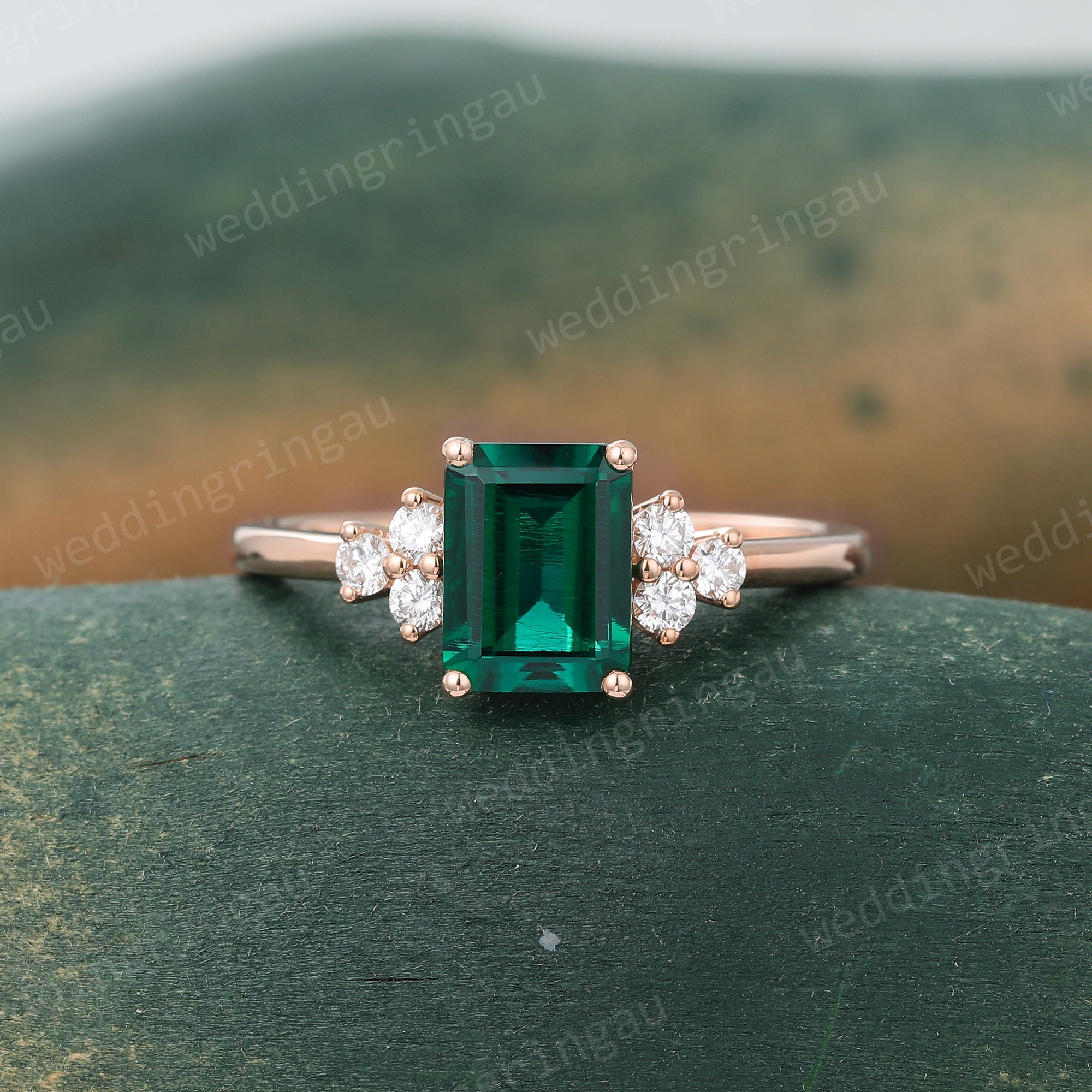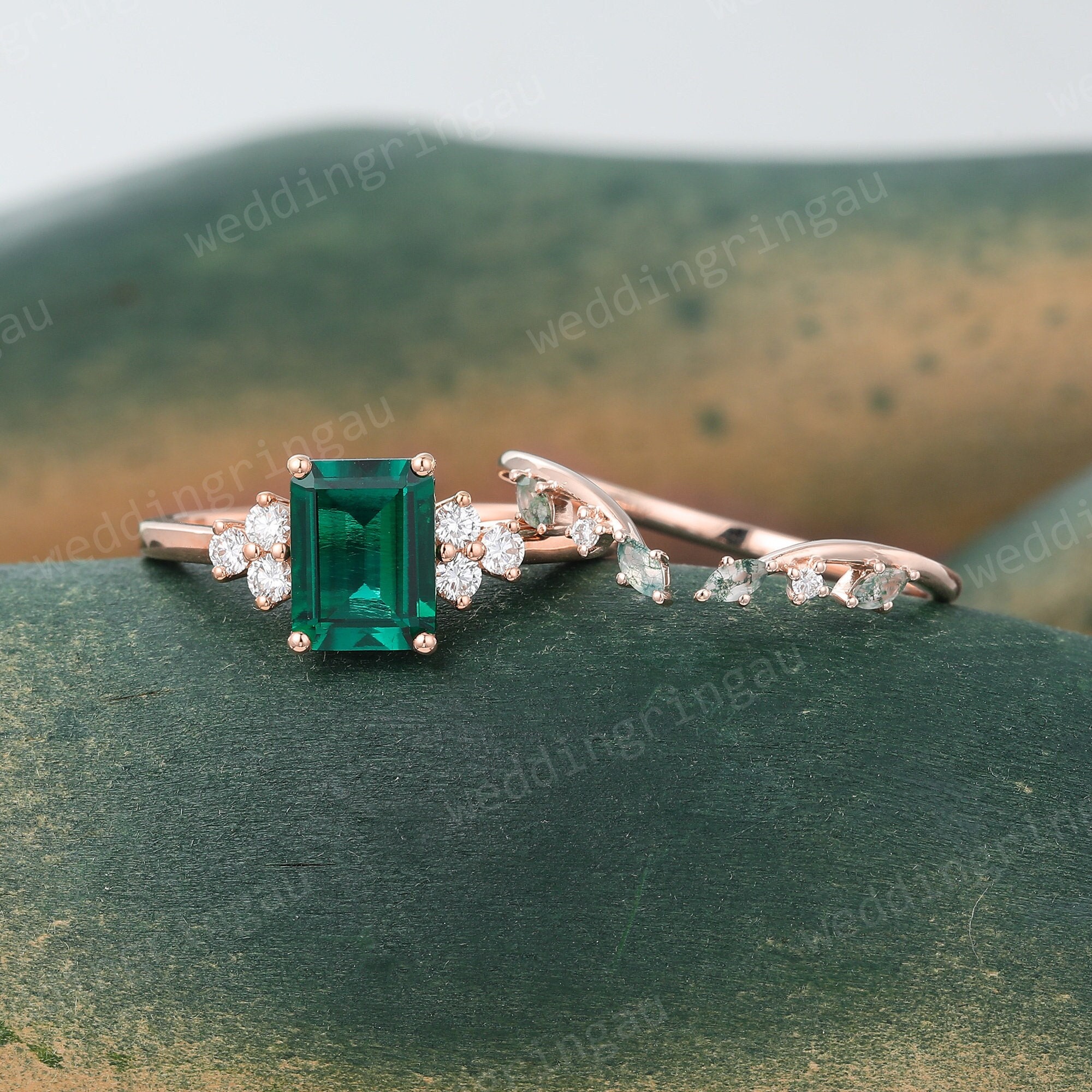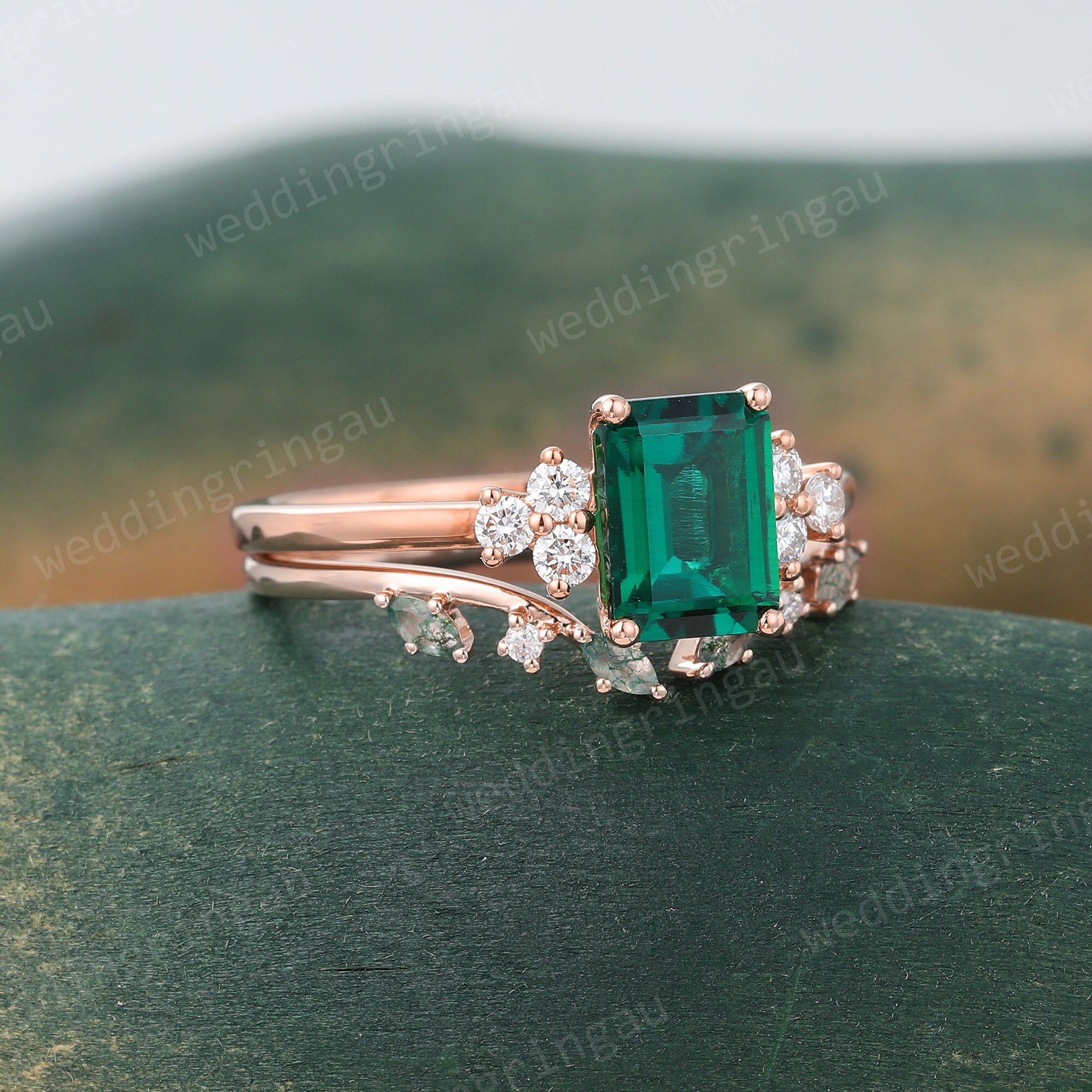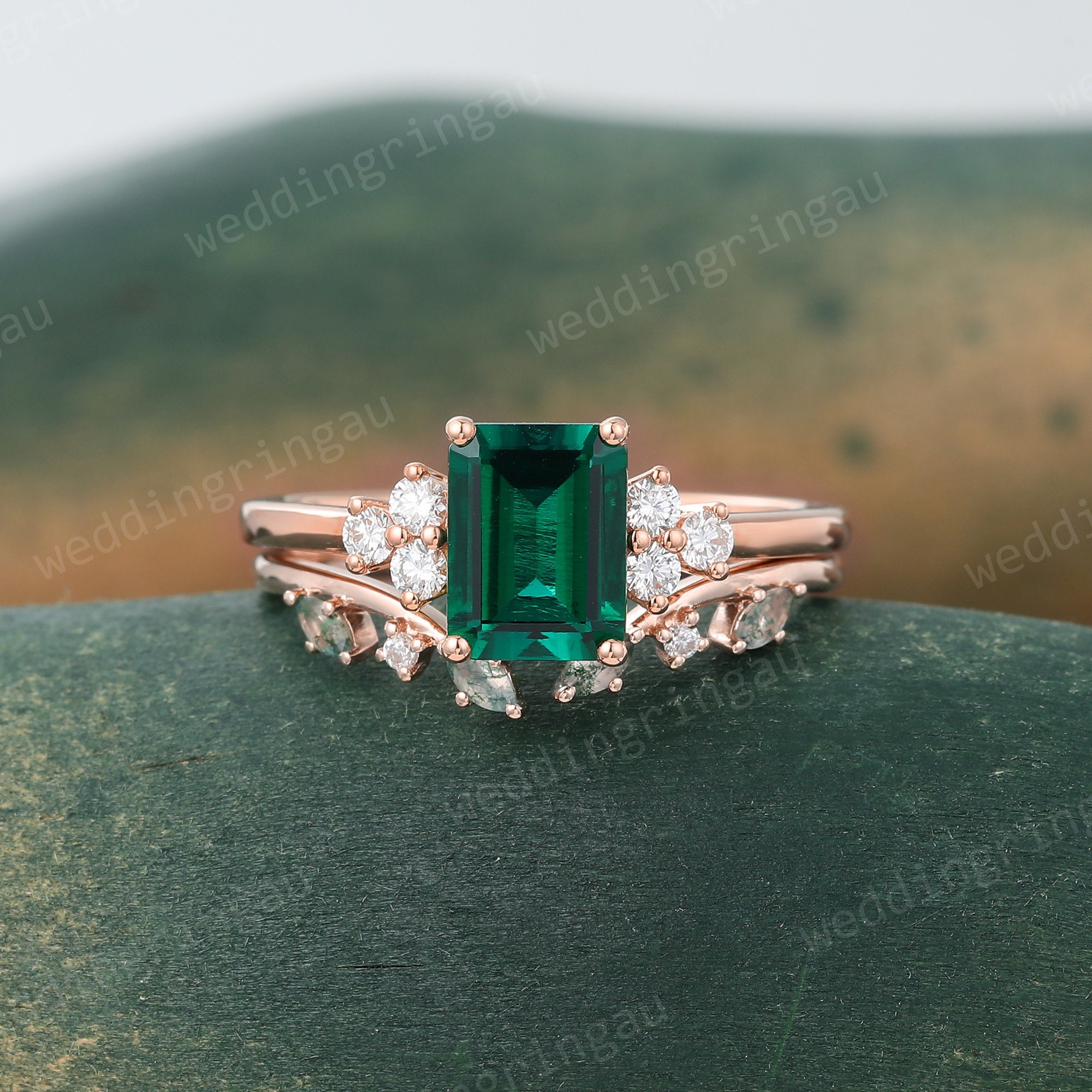 Emerald Engagement ring set Vintage Rose gold Moissanite Bridal Ring set Marquise cut Moss agate Curved wedding ring Open ring Promise ring