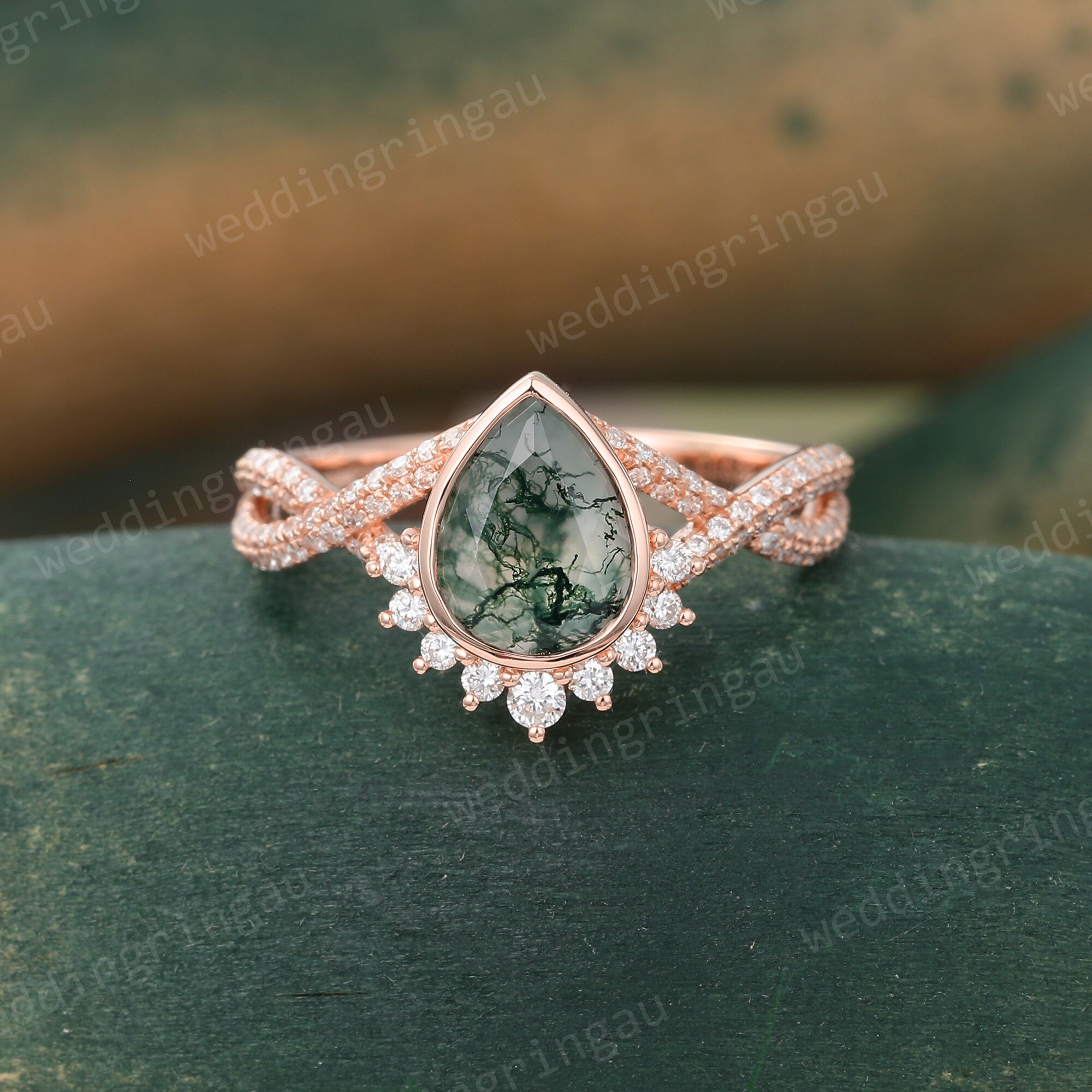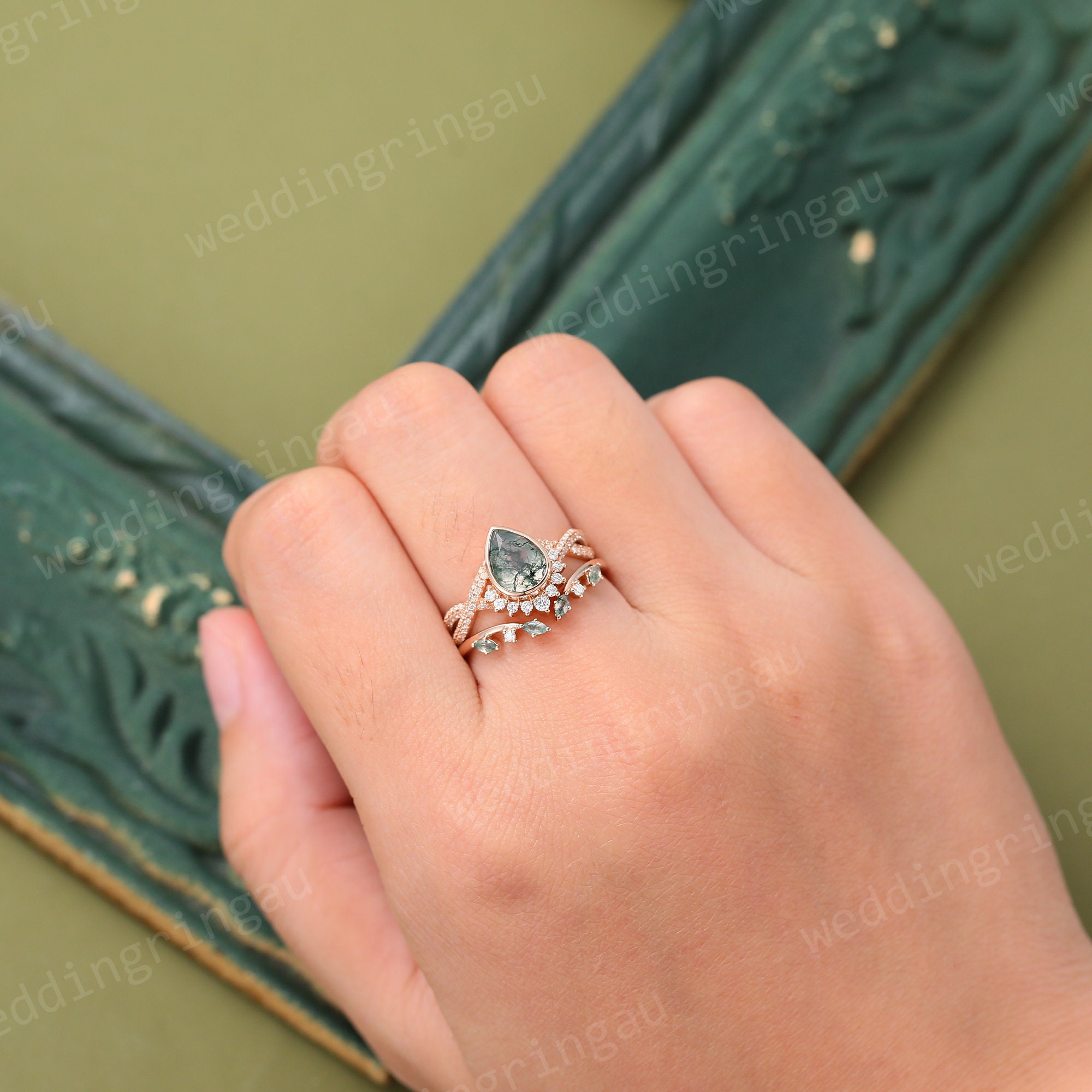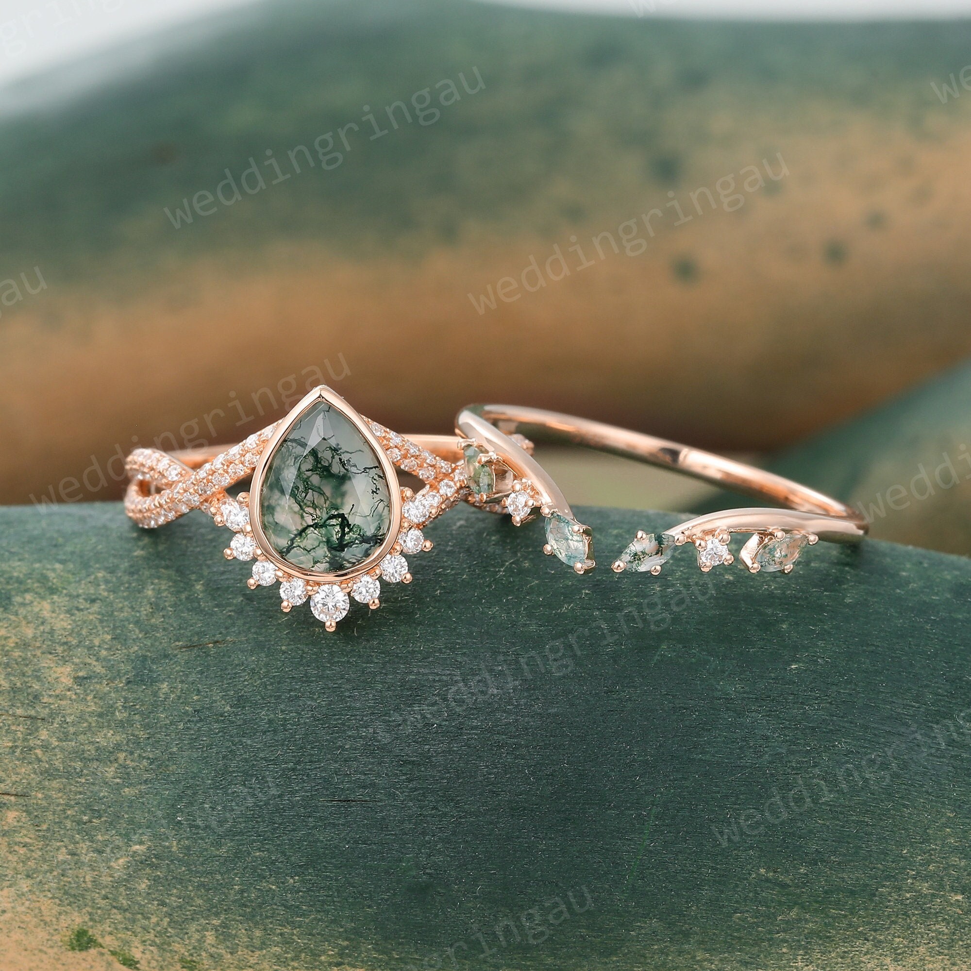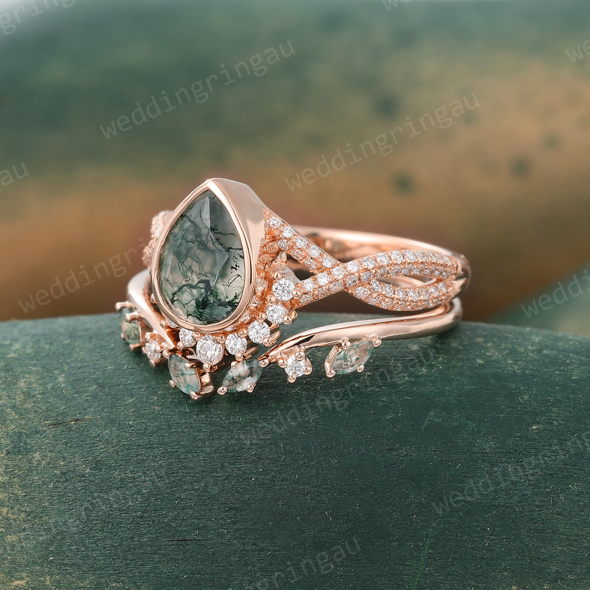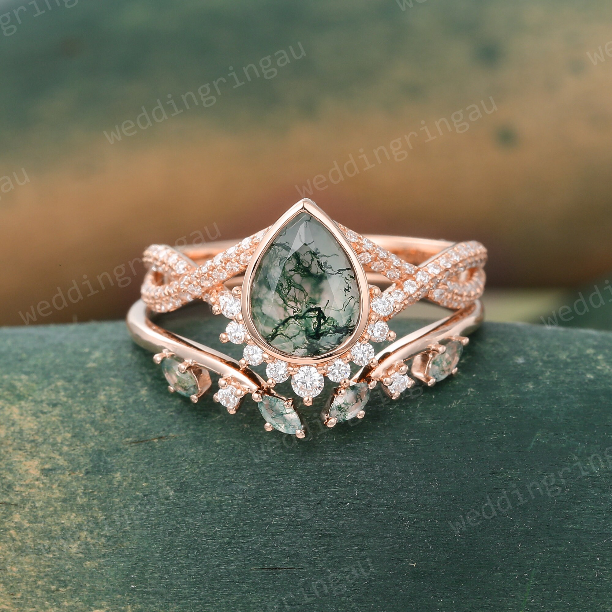 Pear cut Moss agate engagement ring set Unique Rose gold Moissanite Bridal ring set Twisted wedding ring Diamond open ring Promise ring