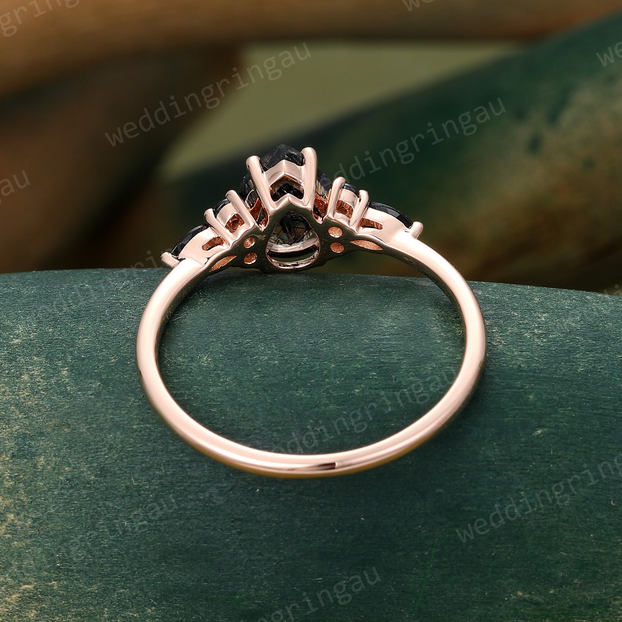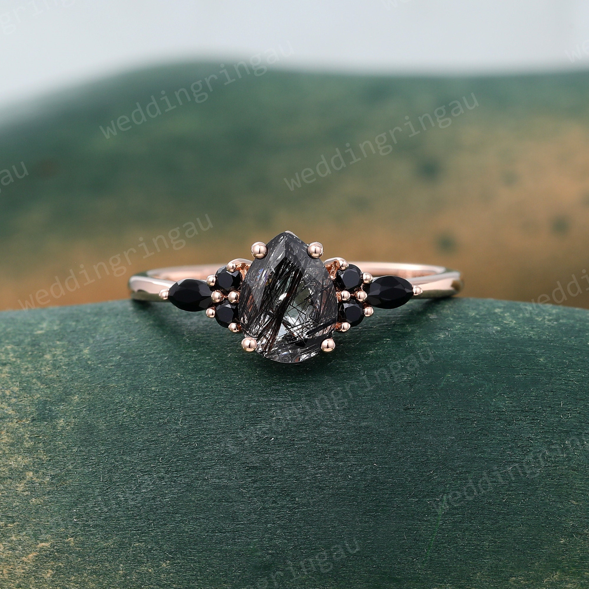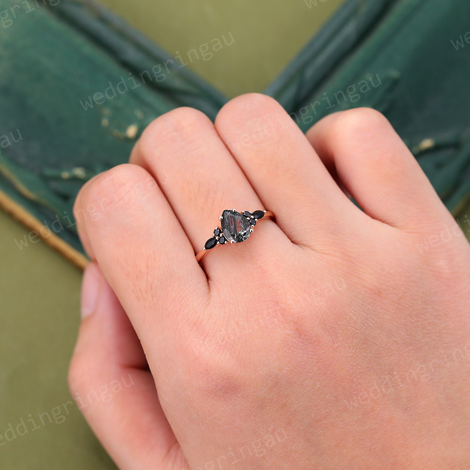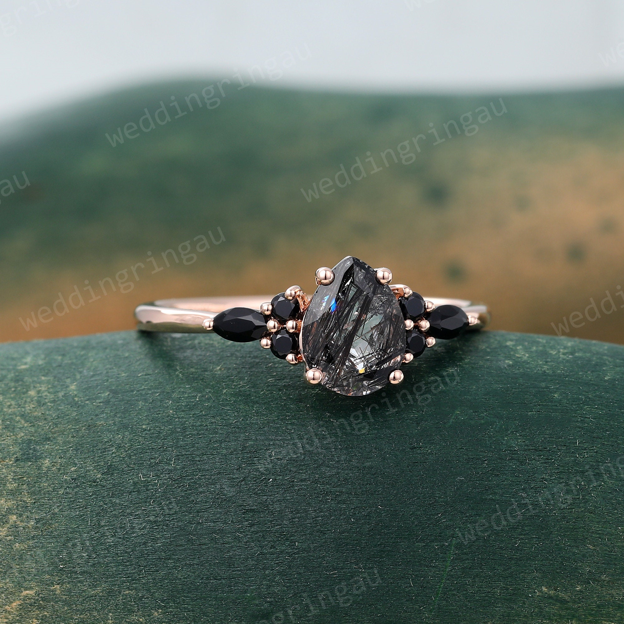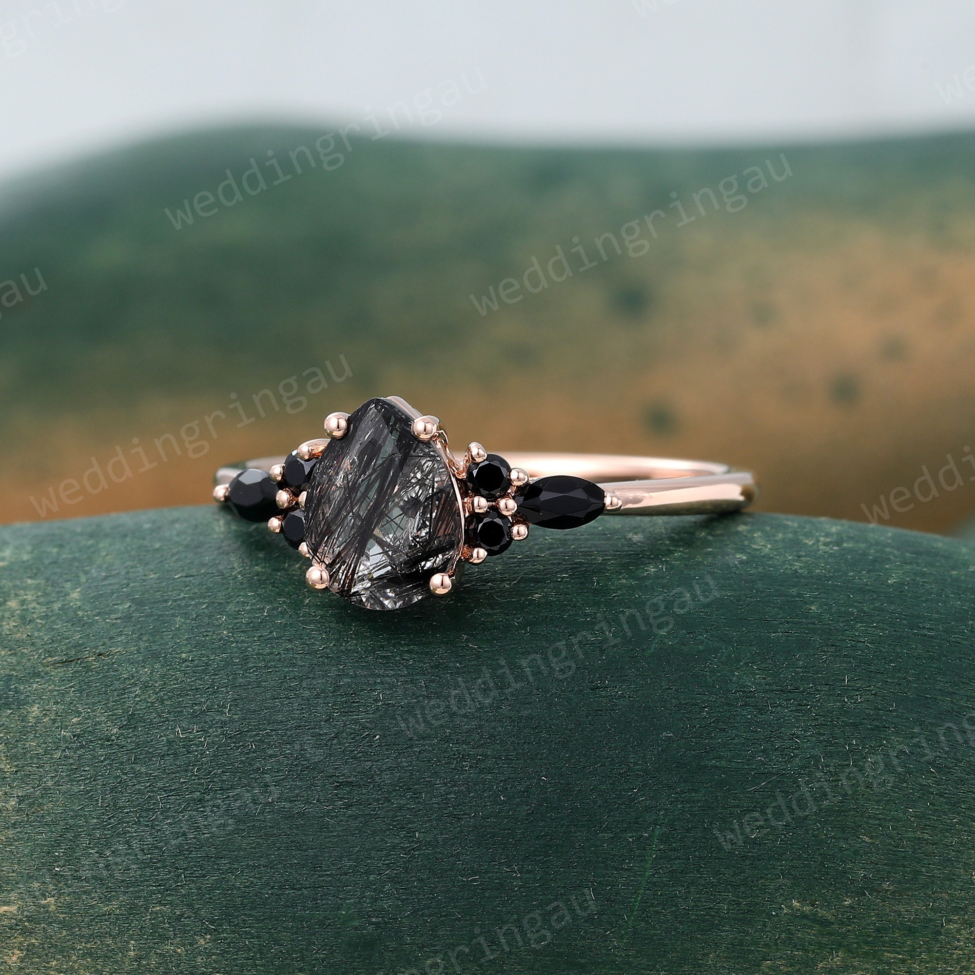 Pear Shaped Black rutilated quartz ring Vintage Rose gold engagement ring Teardrop quartz ring Cluster ring Black onyx ring Promise ring