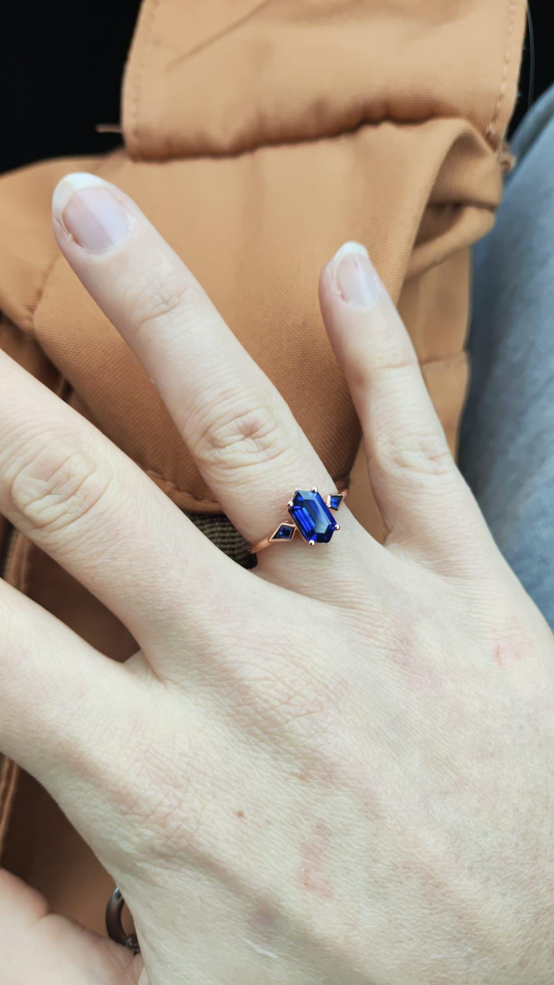 Hexagon cut Blue sapphire engagement ring Unique White gold Kite cut Blue sapphire Three stone ring Vintage Birthstone ring anniversary ring