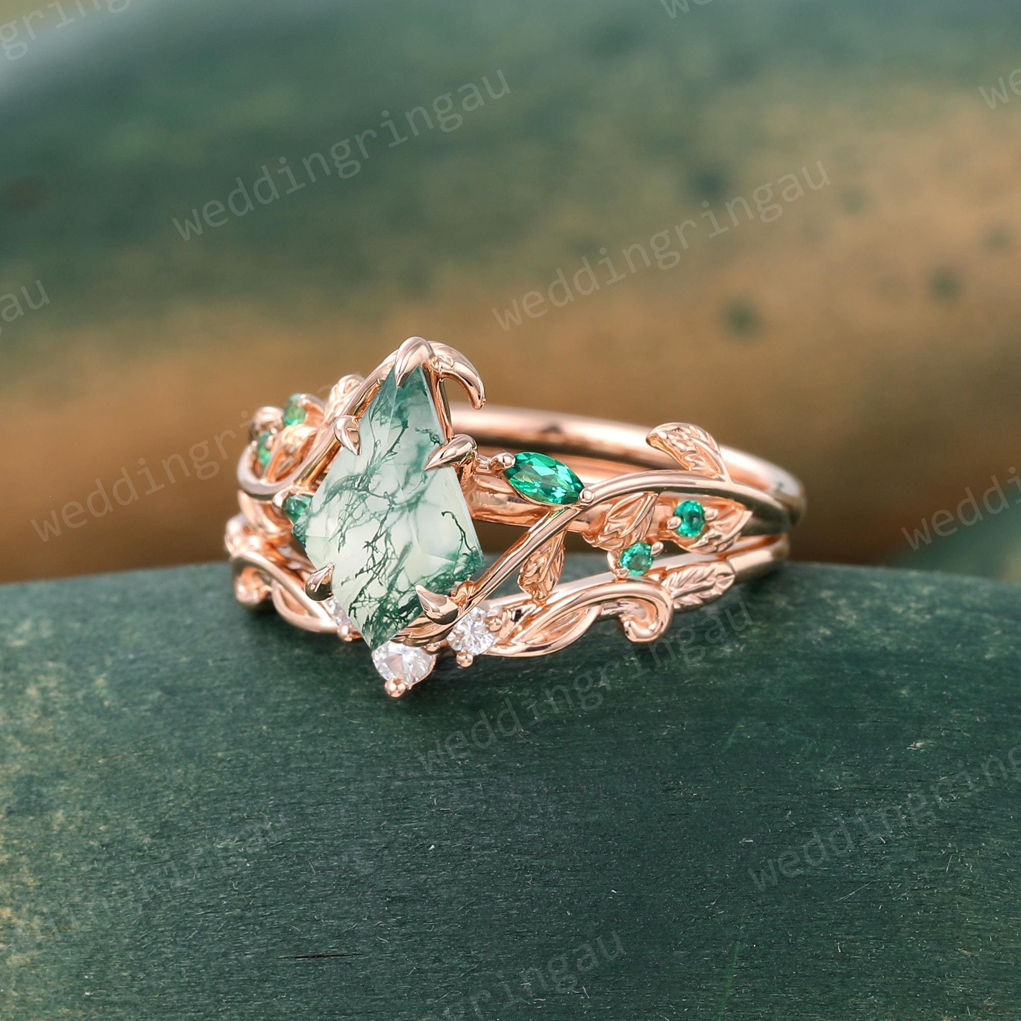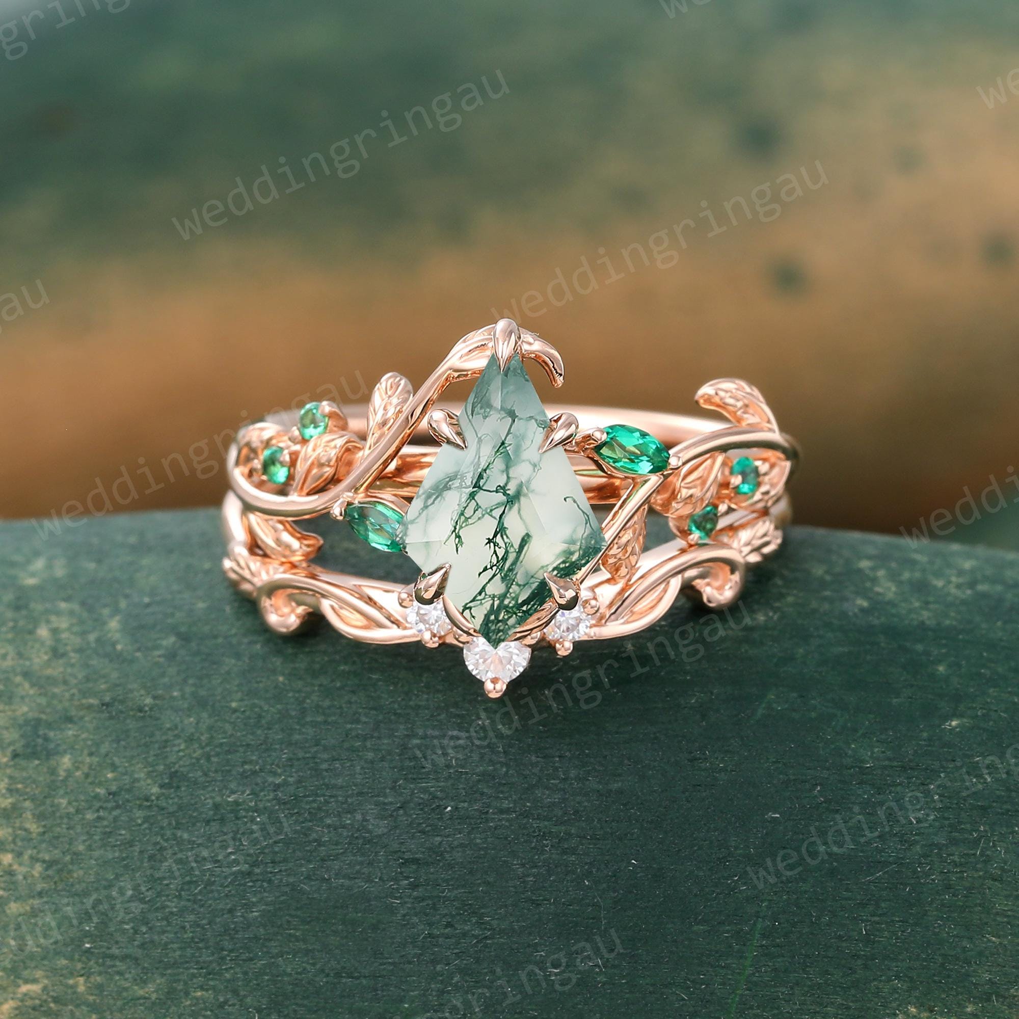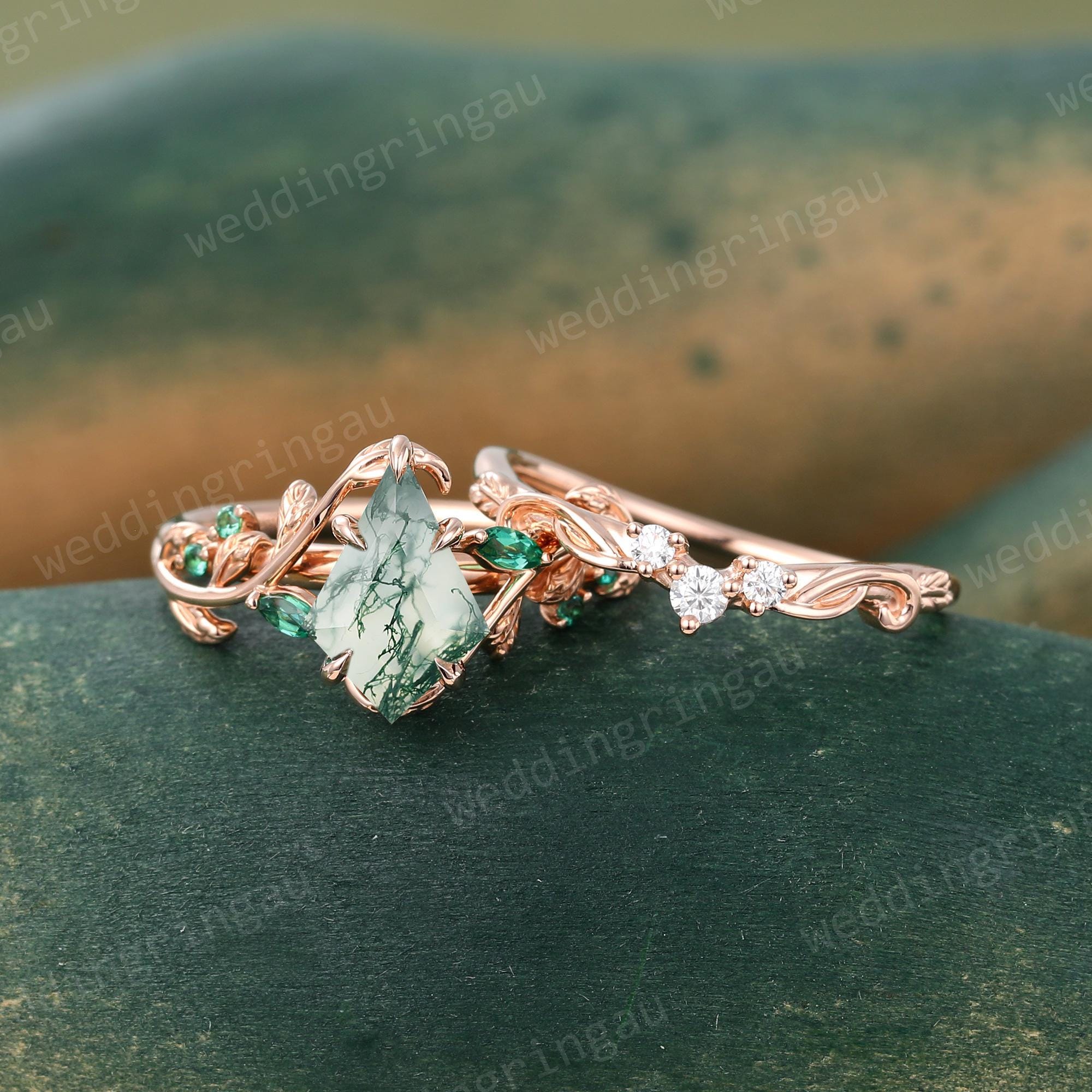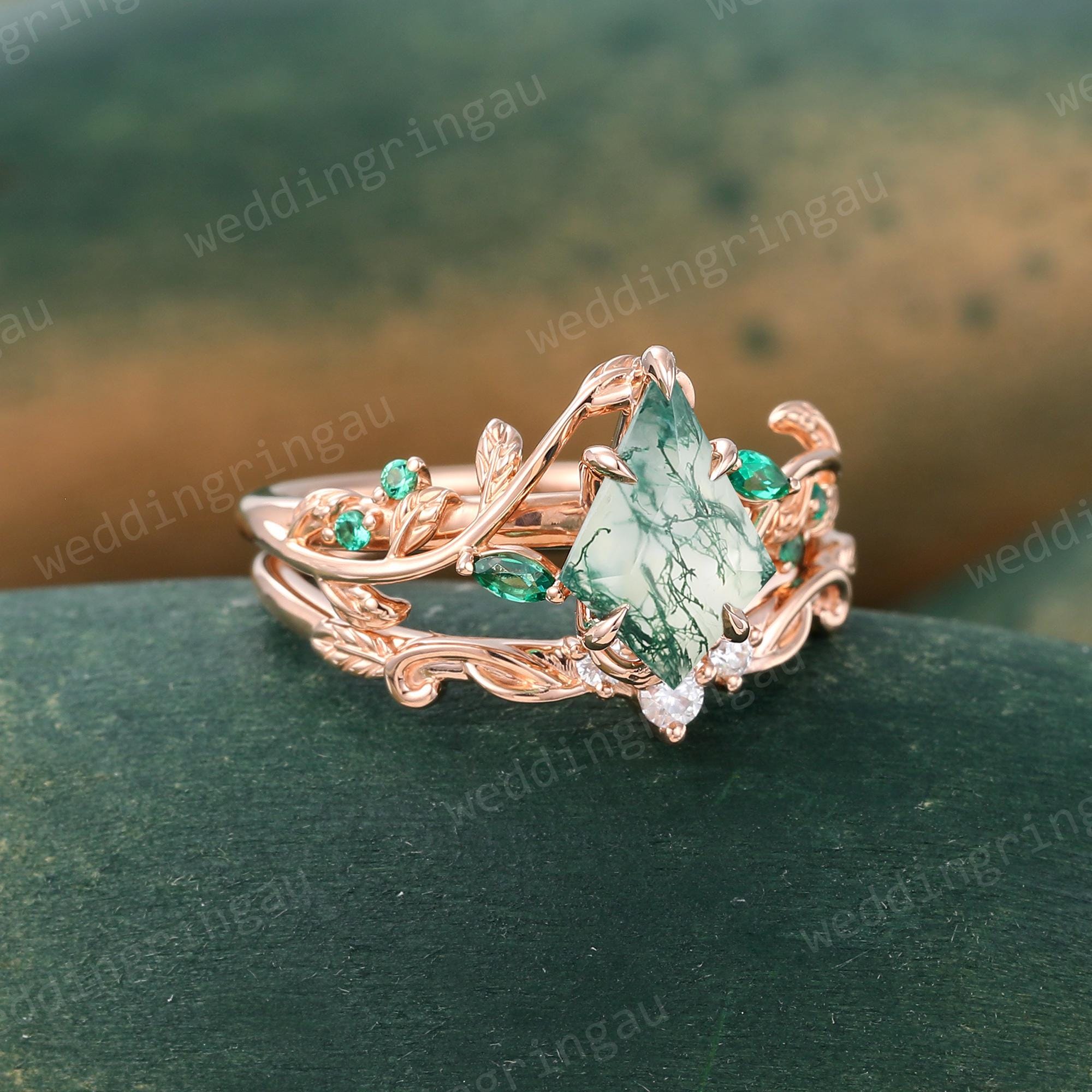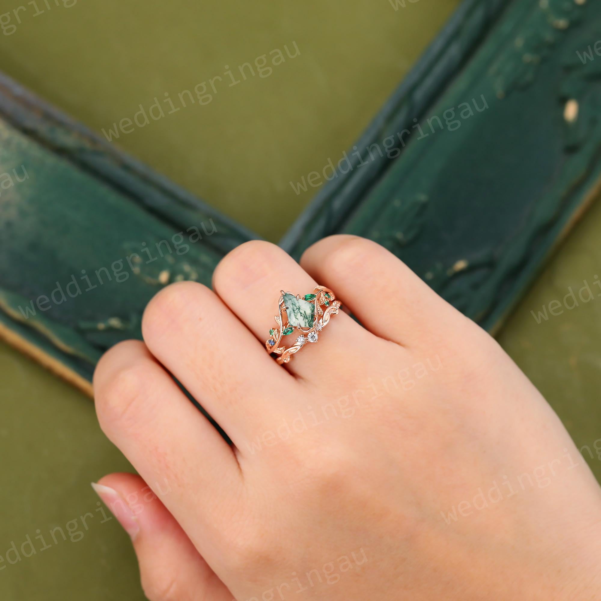Kite cut Moss agate engagement ring set Vintage Twig engagement ring Leaf Round cut Emerald ring Moissanite wedding ring Promise ring set
