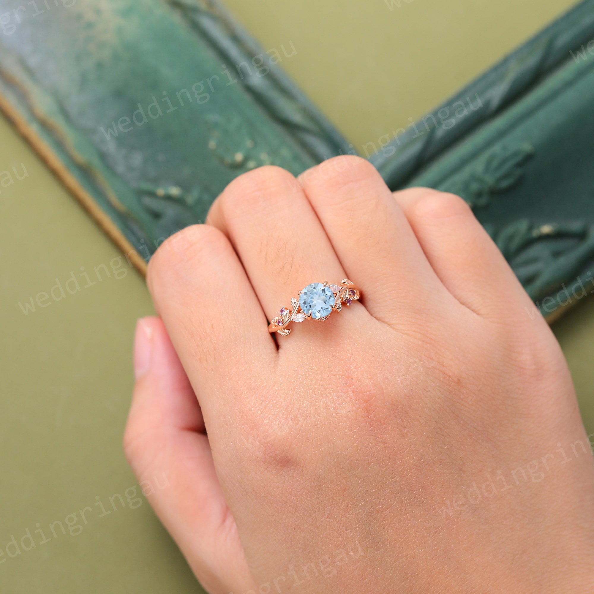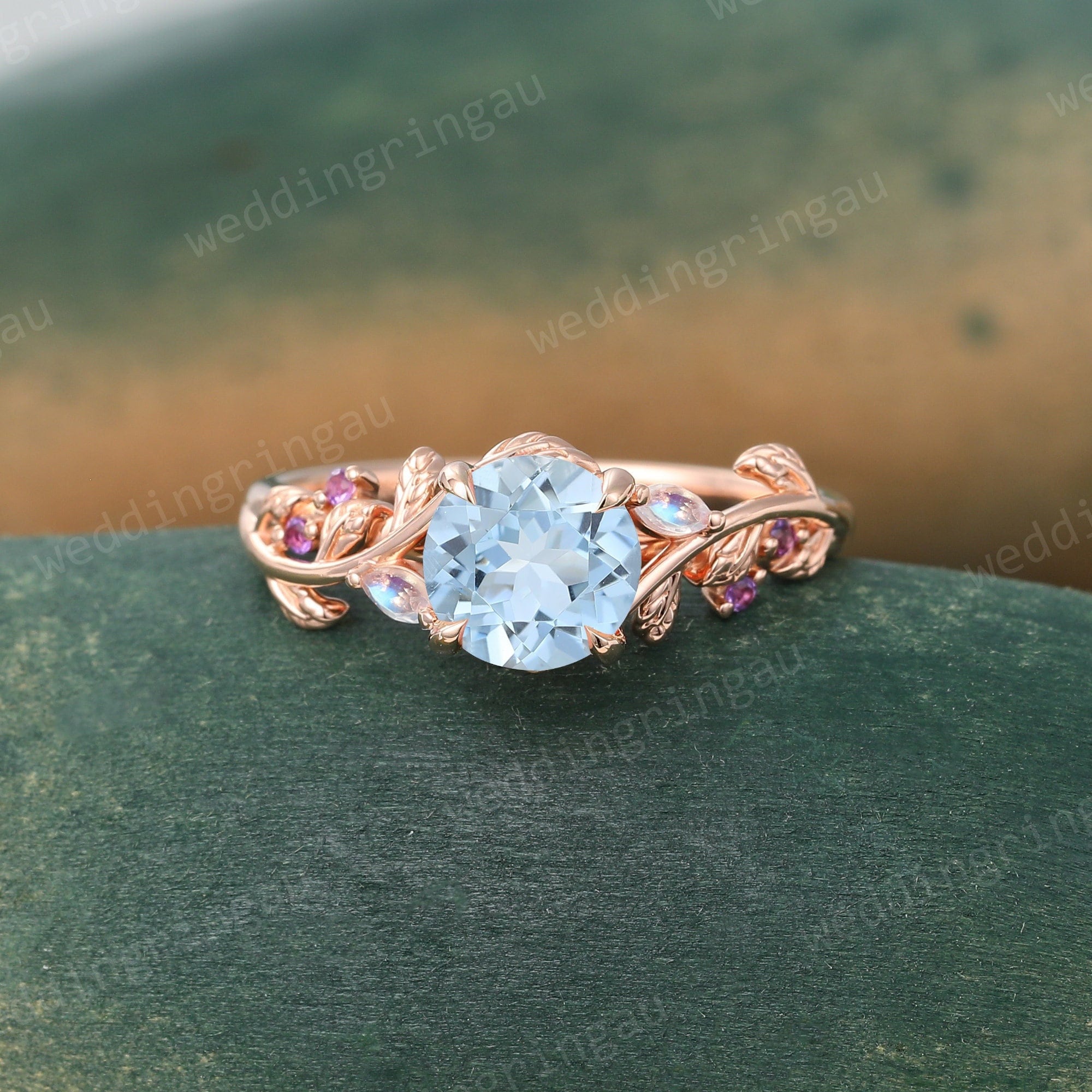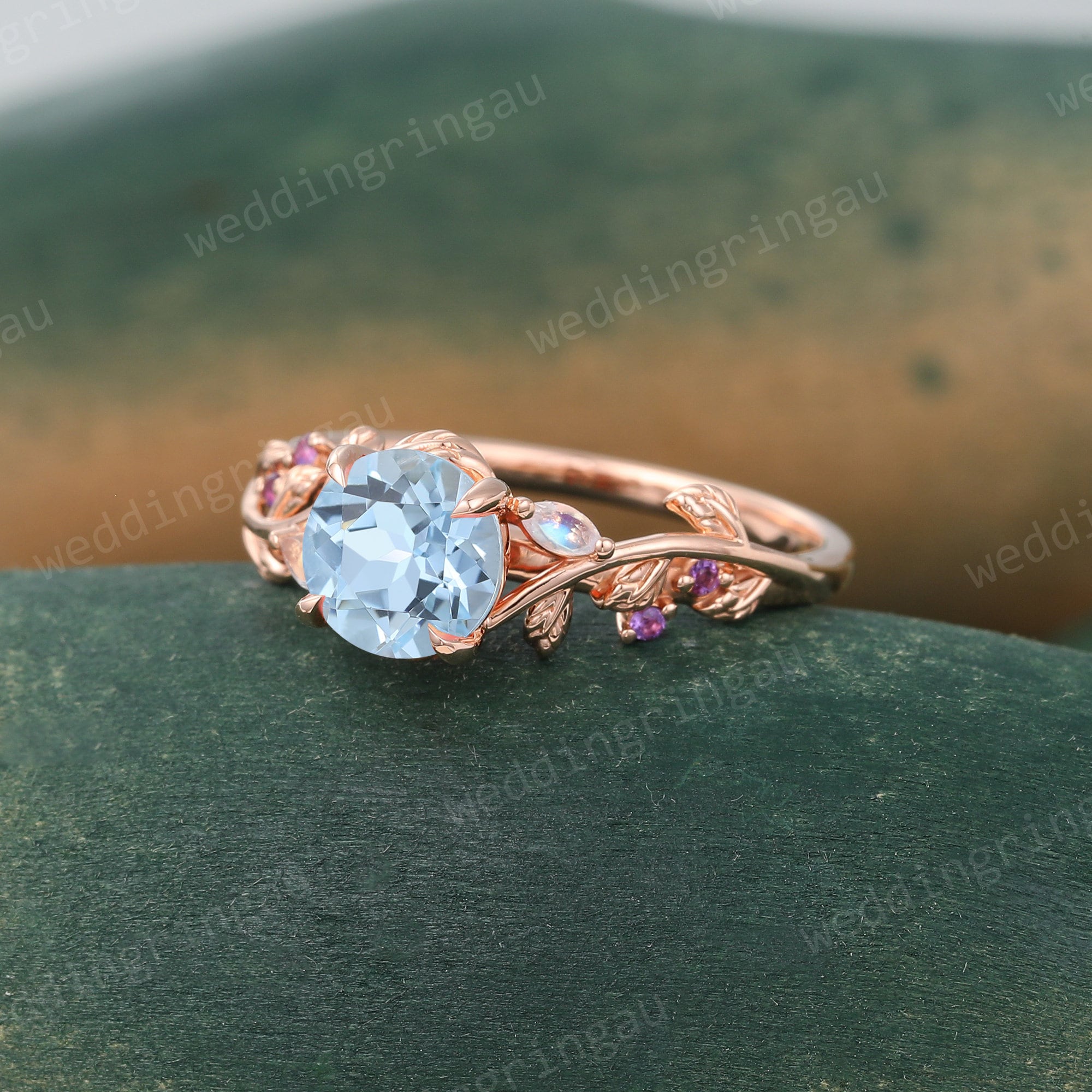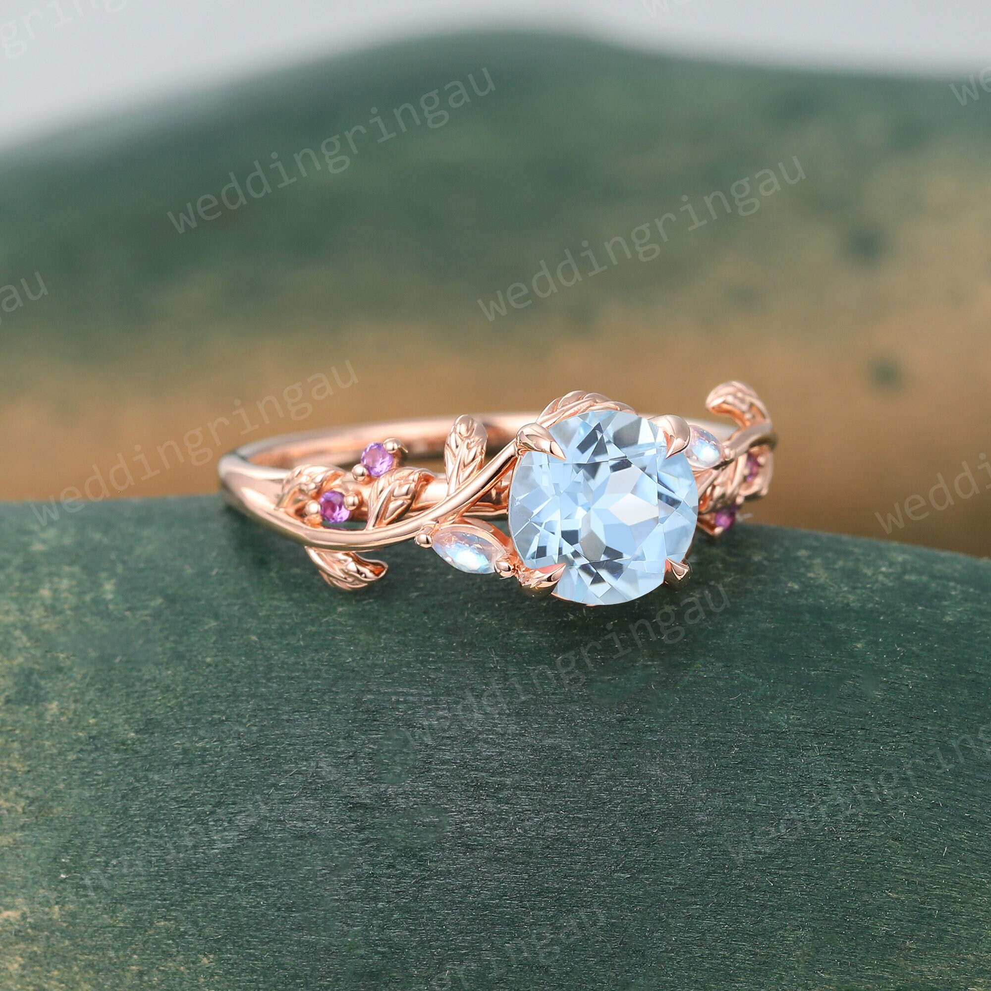 Round cut Aquamarine ring Vintage Rose gold Leaf engagement ring Marquise cut Moonstone ring Amethyst ring Nature inspired Twig ring Gift