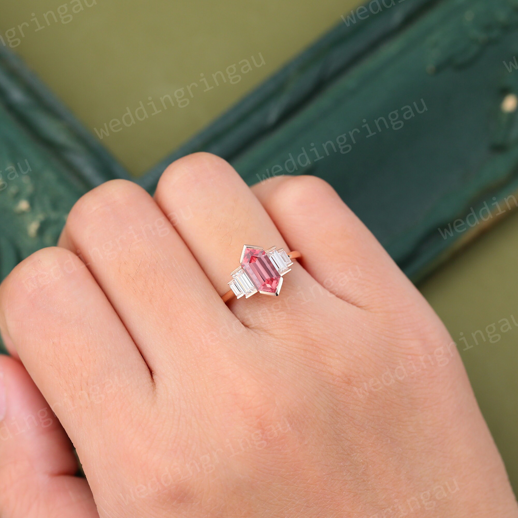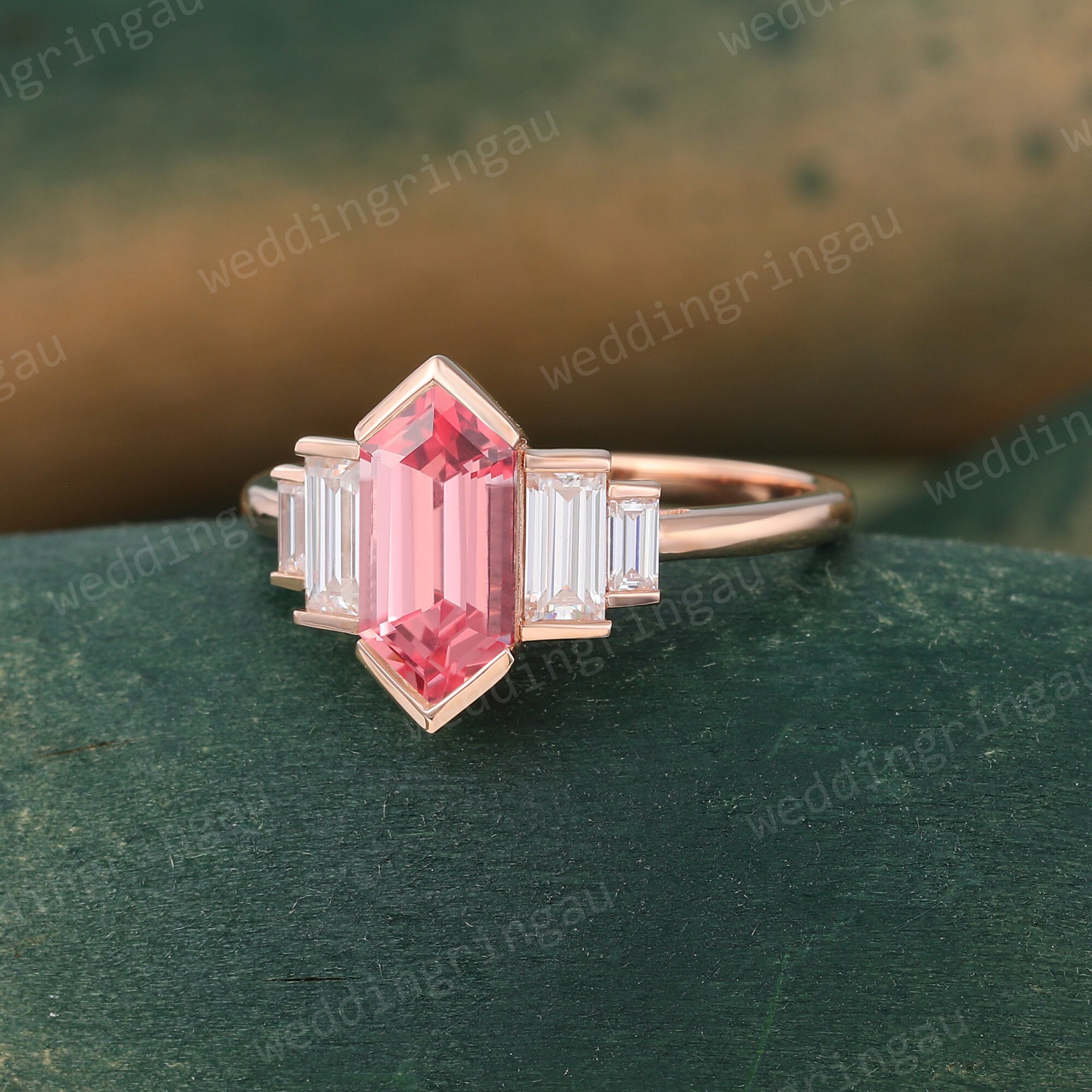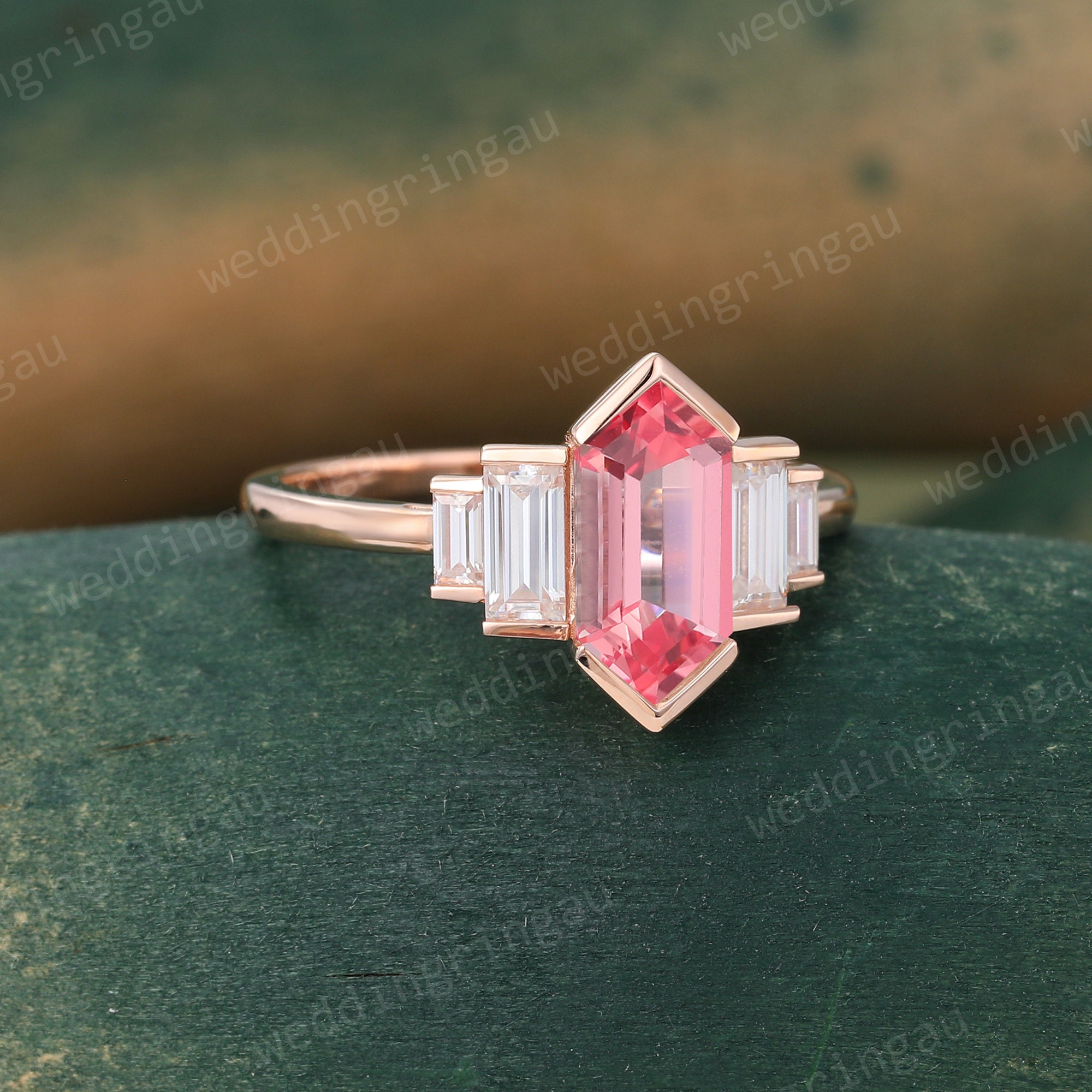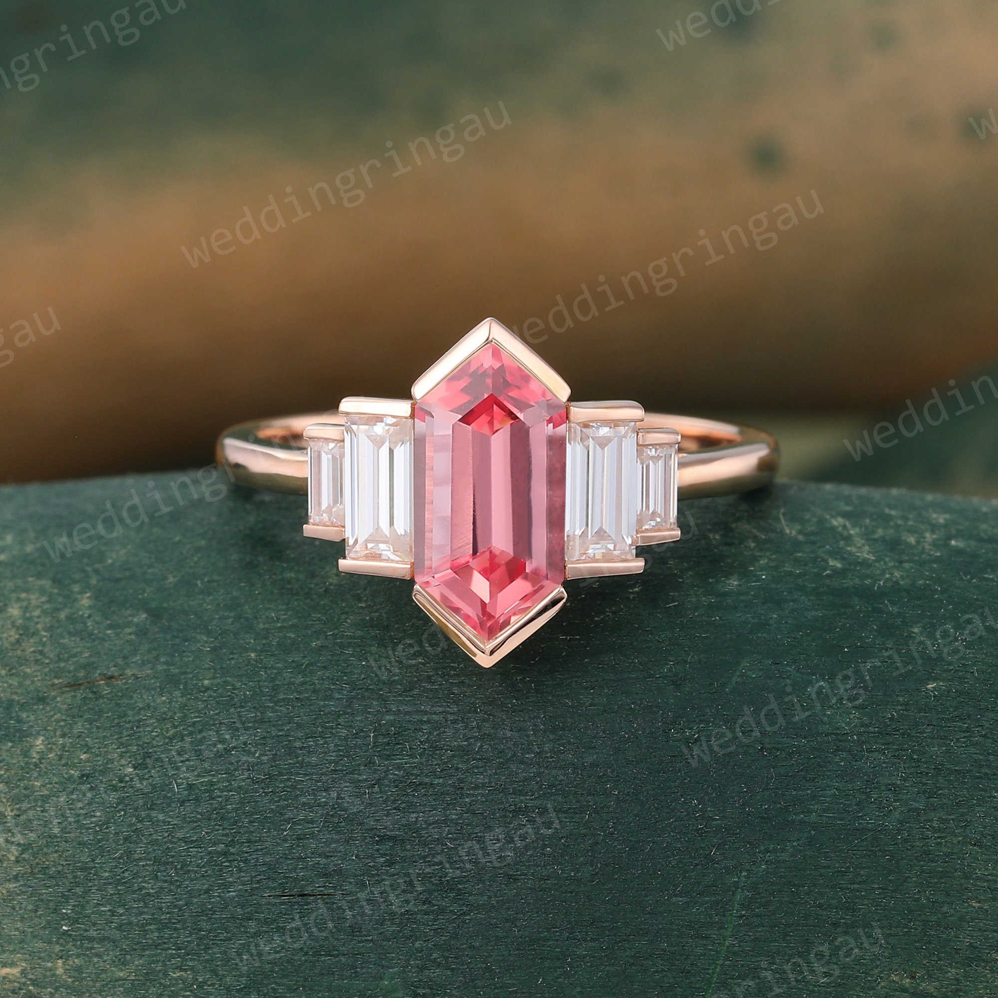 Hexagon cut Pink sapphire engagement ring Unique Rose gold Sapphire ring baguette cut Diamond ring Bridal Art deco promise anniversary ring