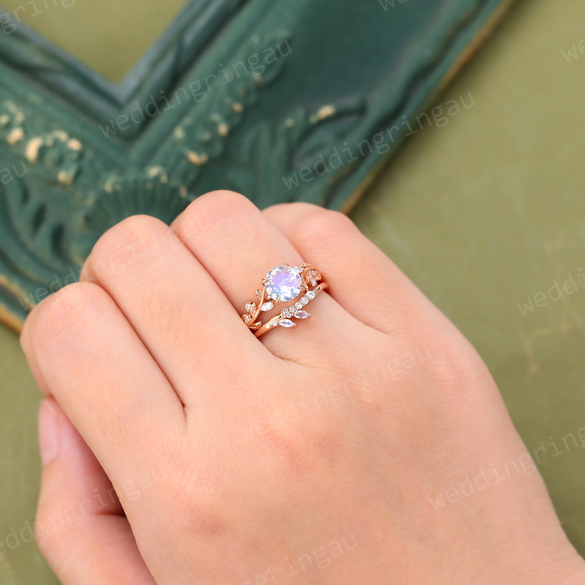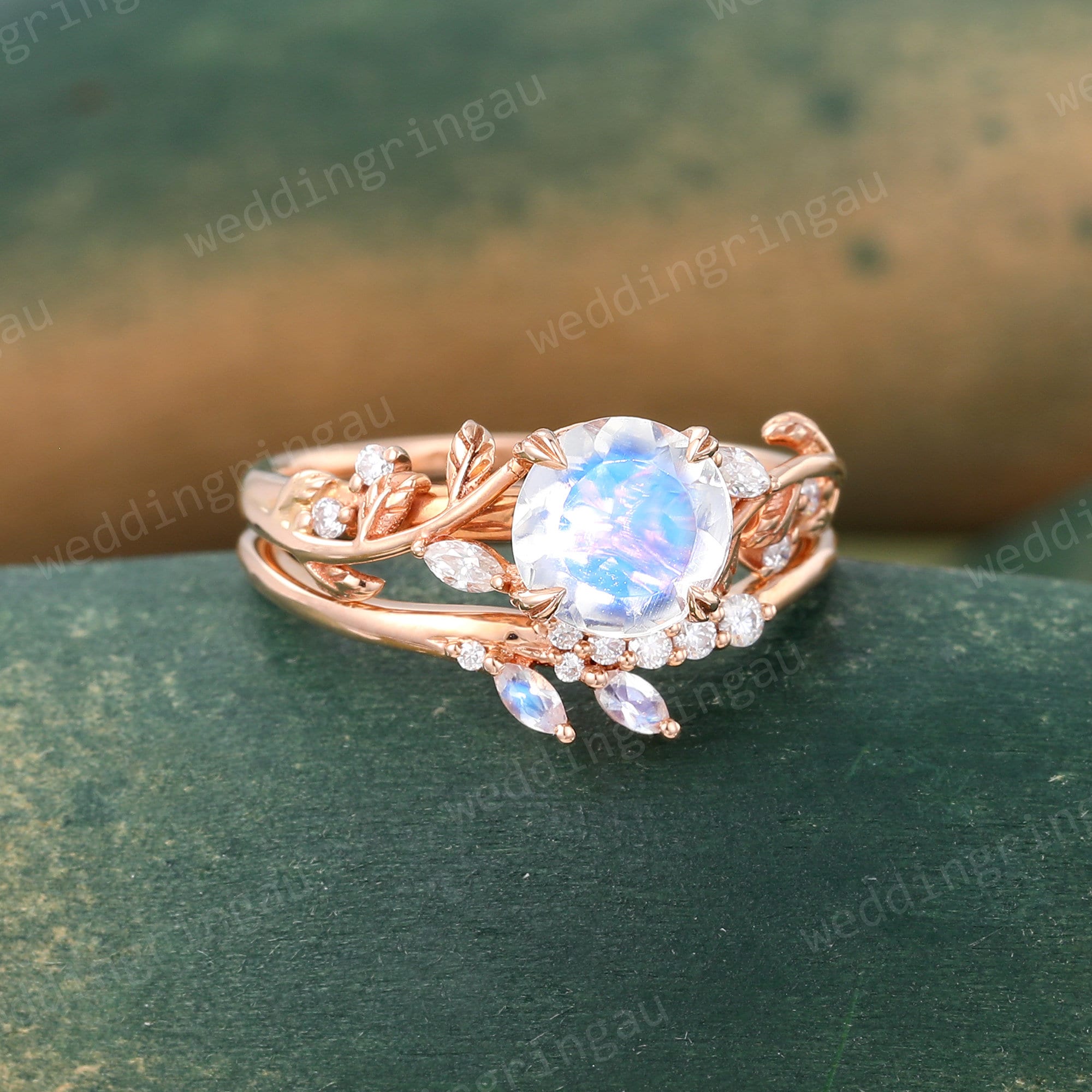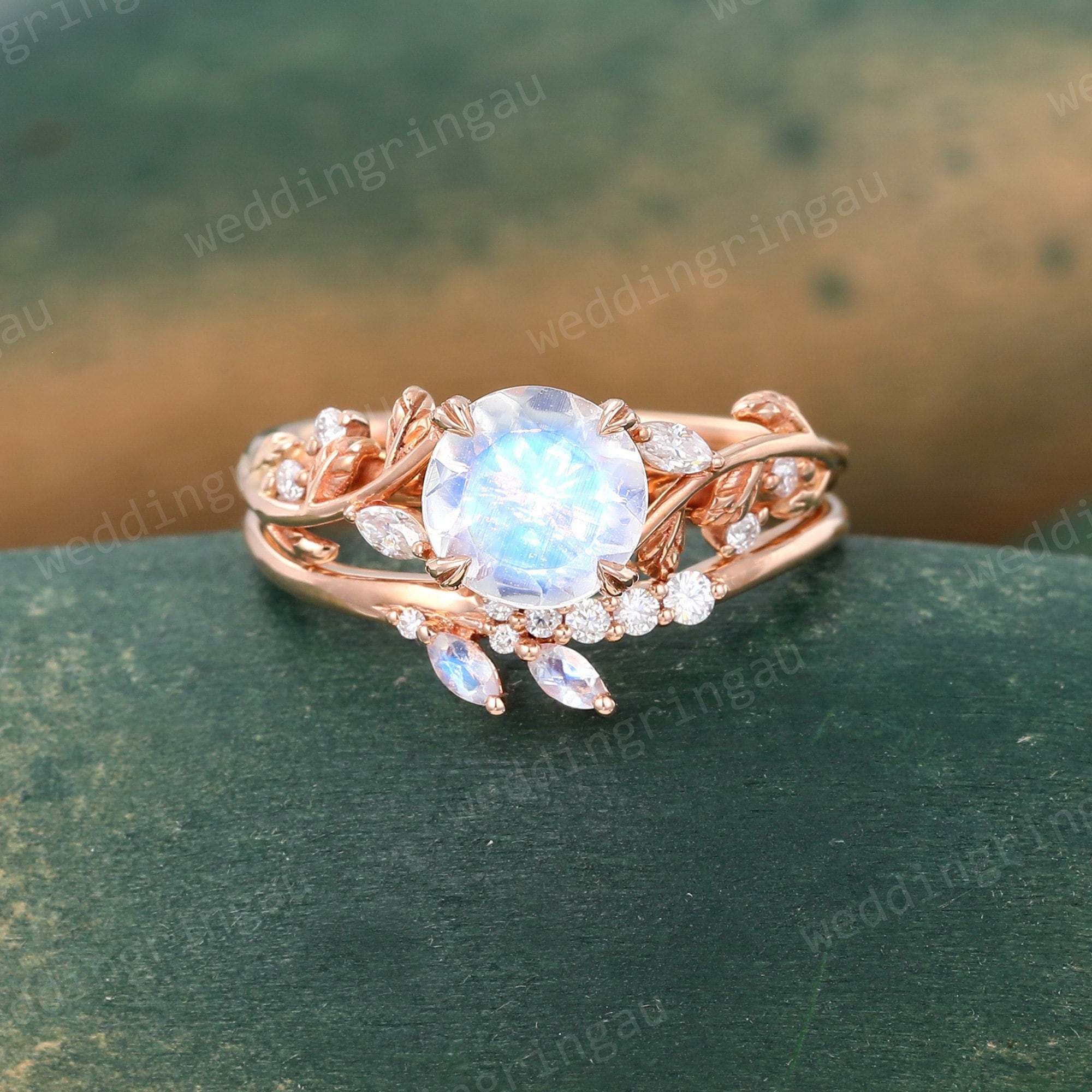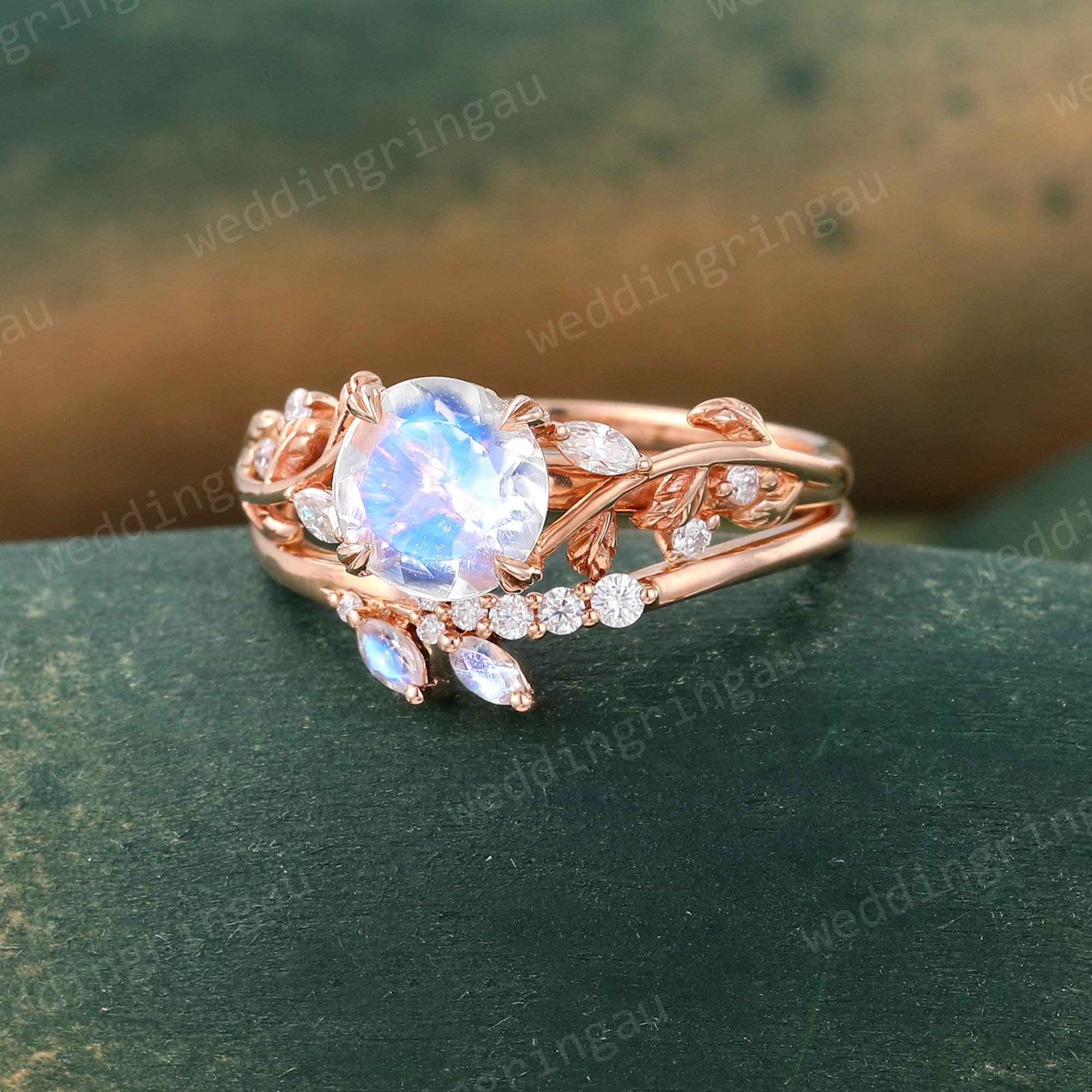 Round cut Moonstone engagement ring set Vintage Rose gold Leaf engagement ring Moonstone ring Moissanite Curved wedding ring Promise ring