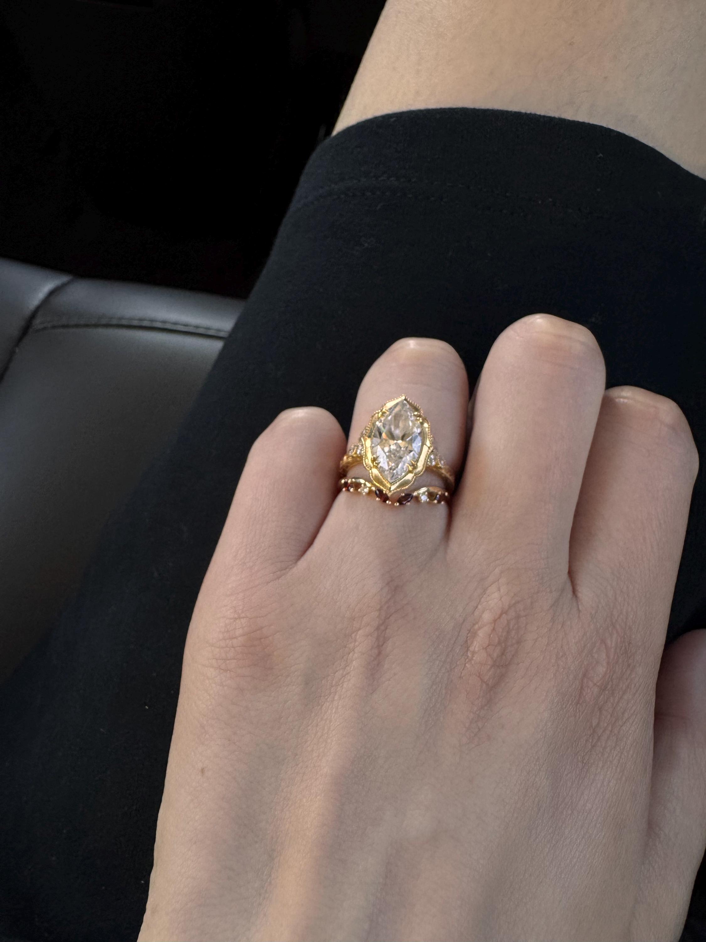 Marquise cut Garnet Wedding band Unique Rose gold Moissanite Curved Wedding band Vintage Art deco Bridal Open Stacking ring Promise ring