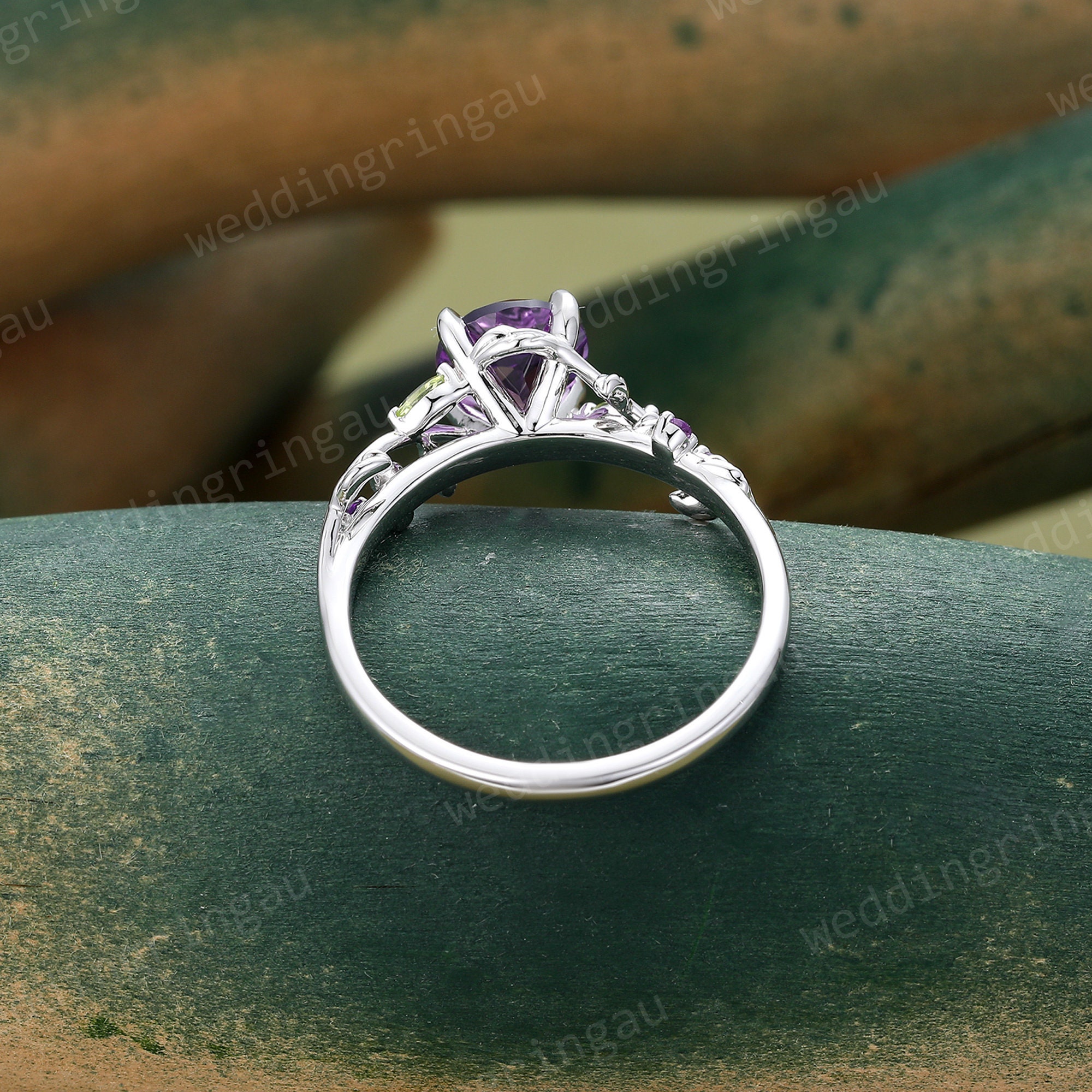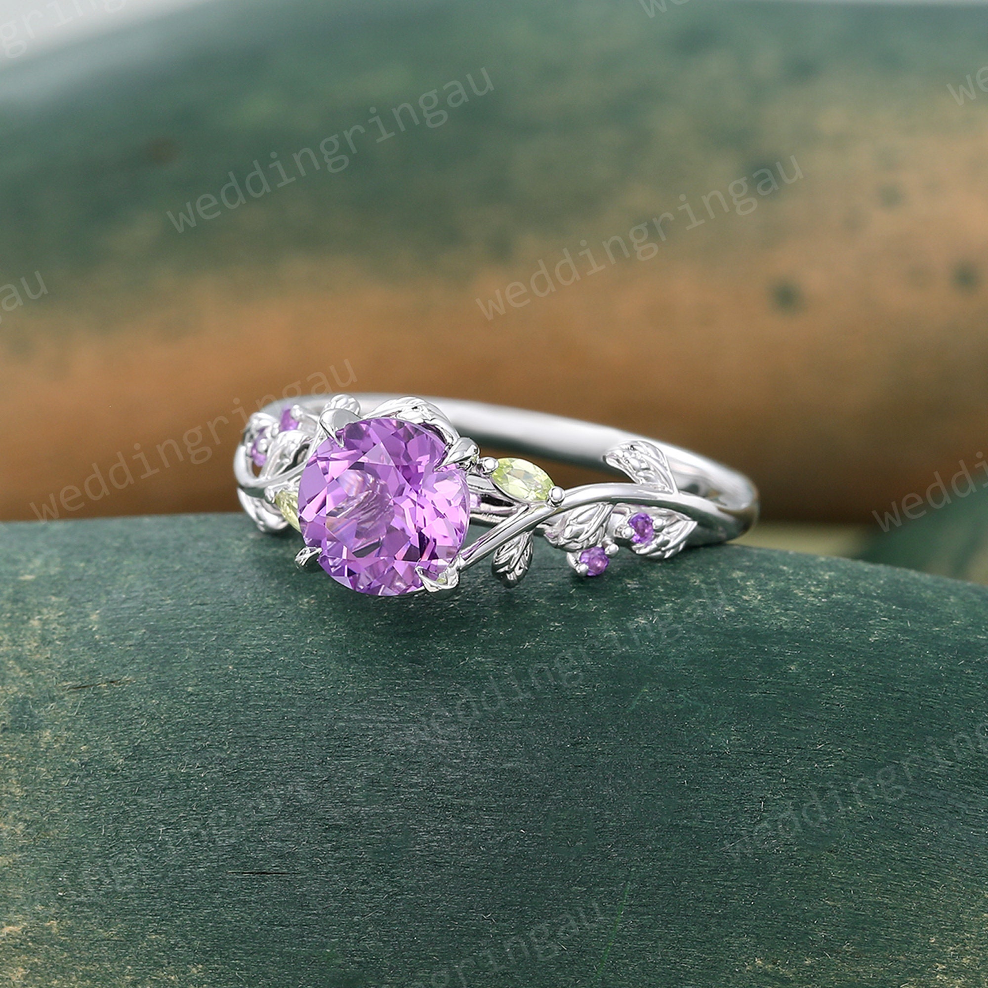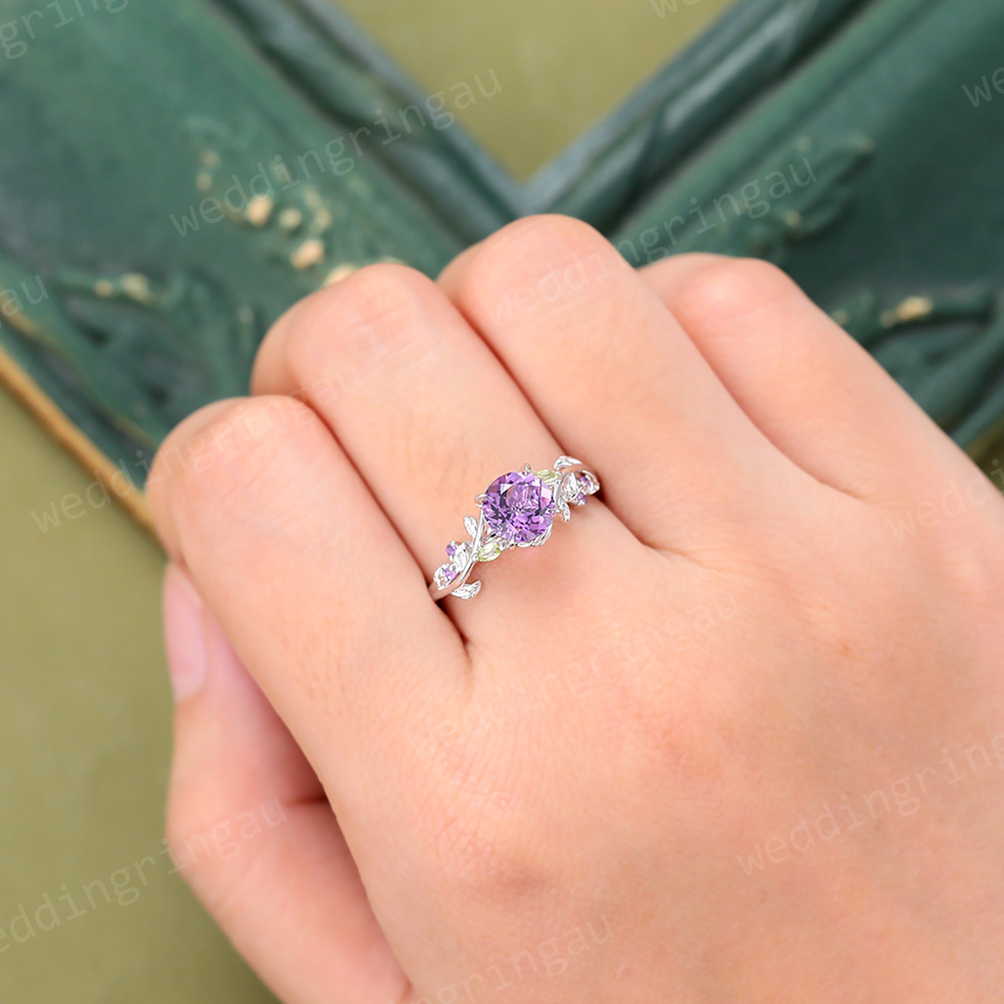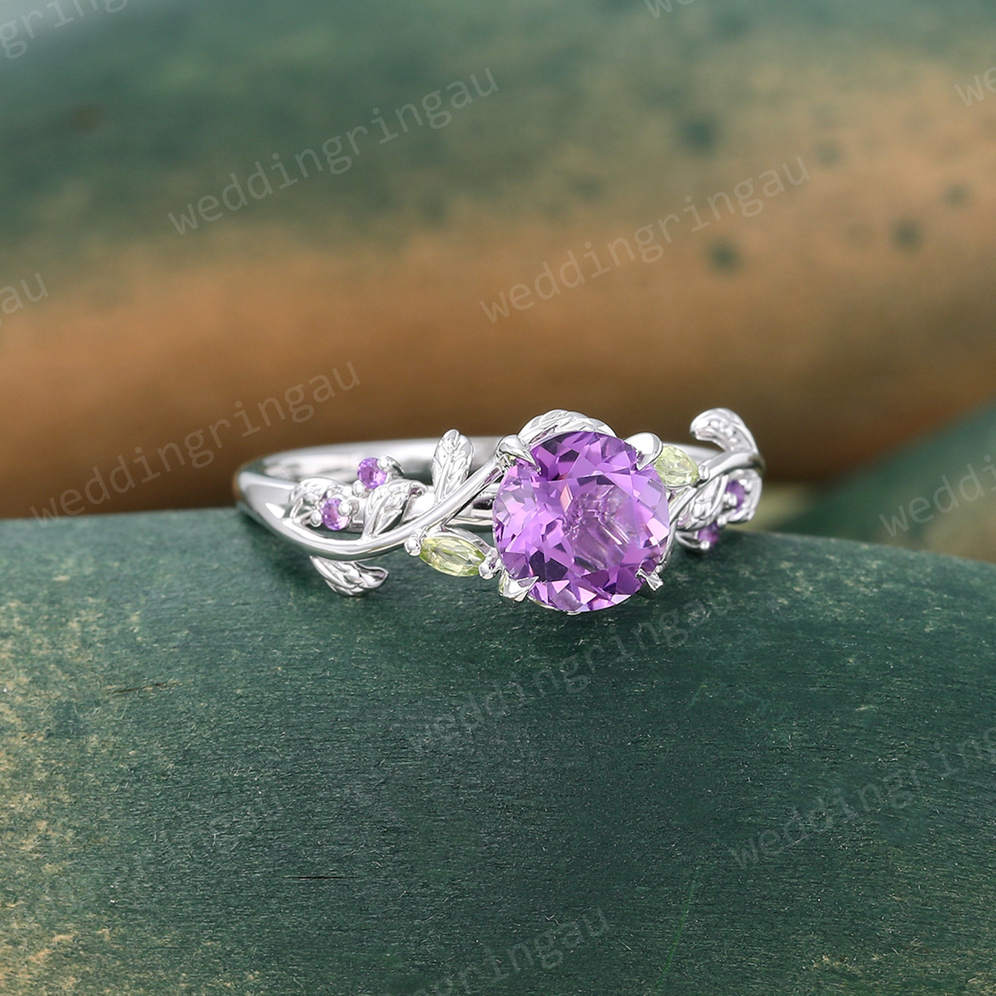Round Purple Amethyst ring Vintage White gold engagement ring marquise cut peridot ring Nature inspired ring Leaf Branch ring Promise ring