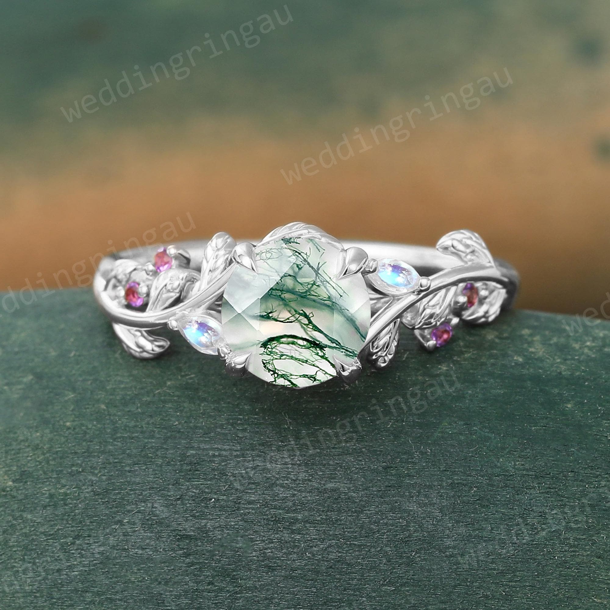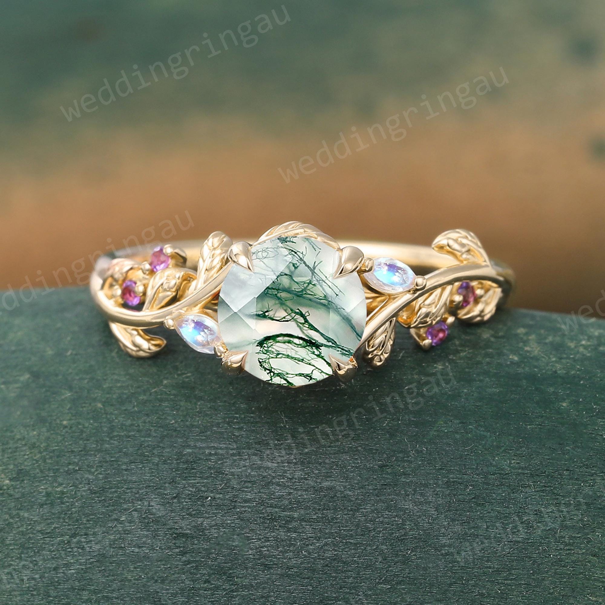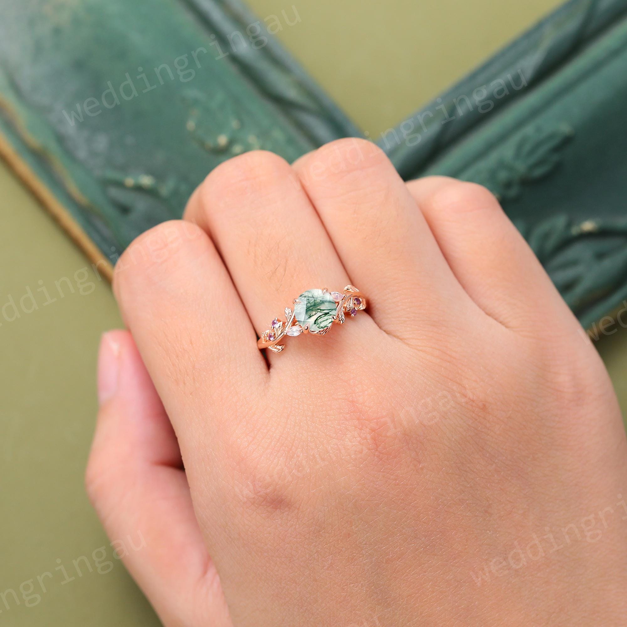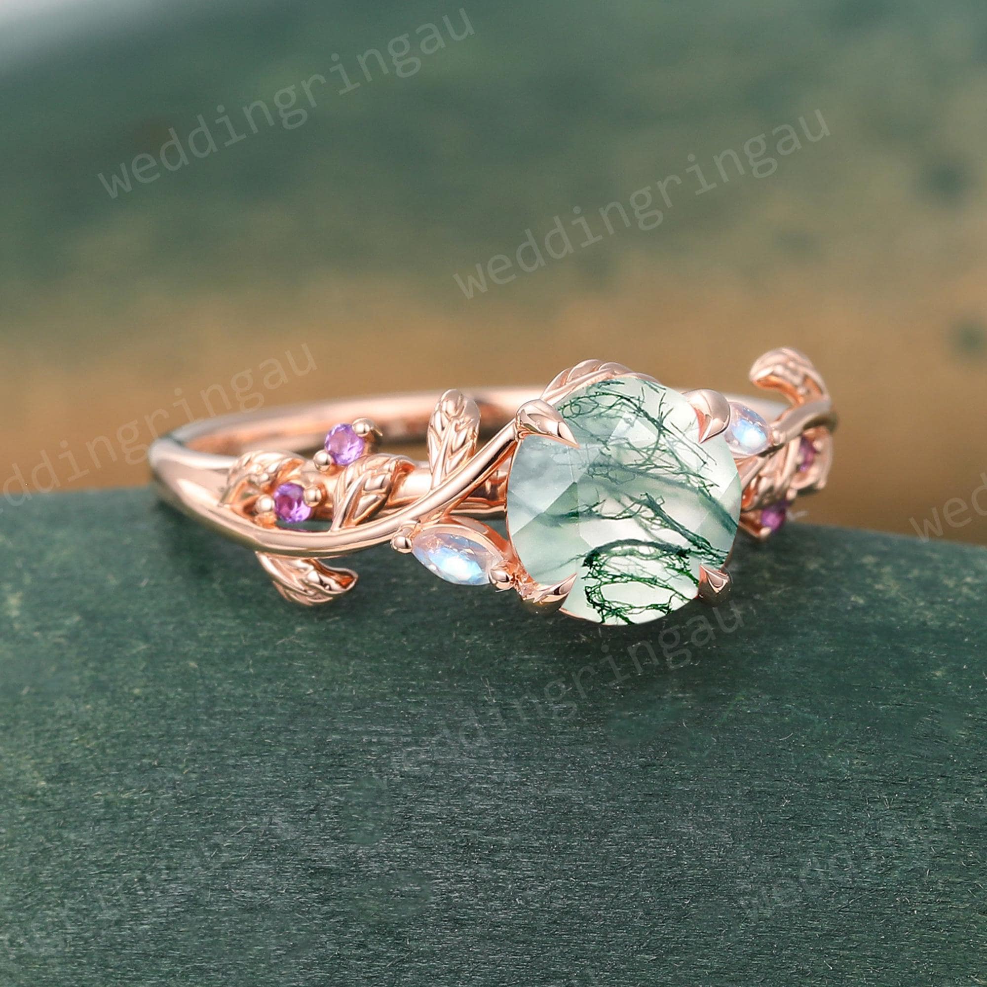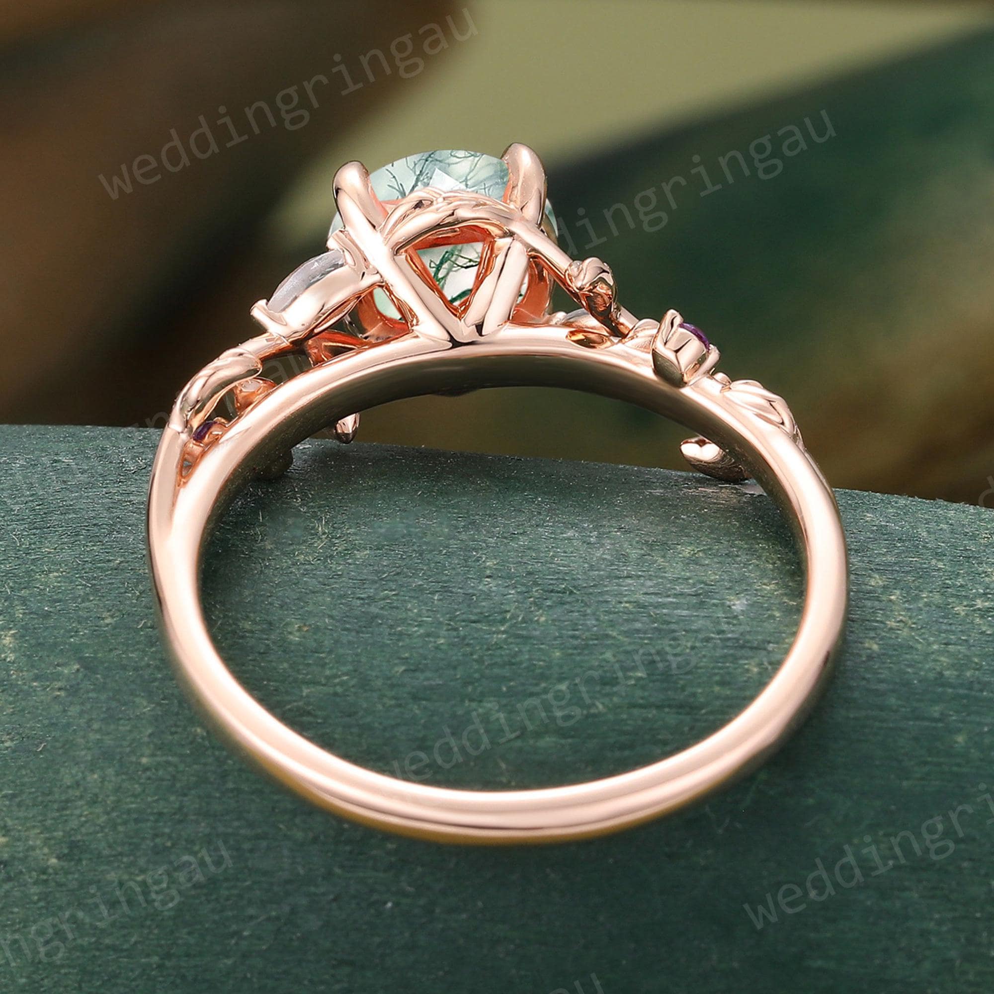Natural Moss agate ring Vintage Rose gold Leaf engagement ring Marquise cut Moonstone ring Amethyst ring Nature inspired Twig ring Gift