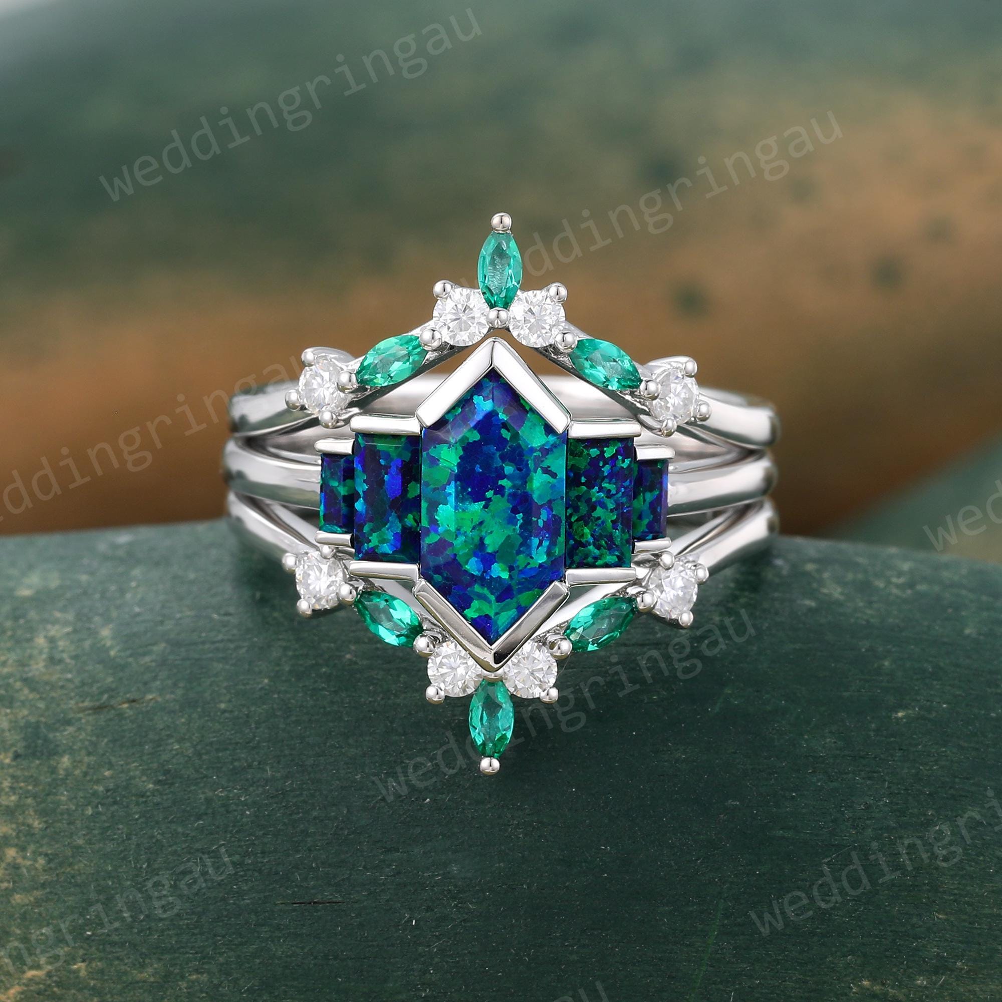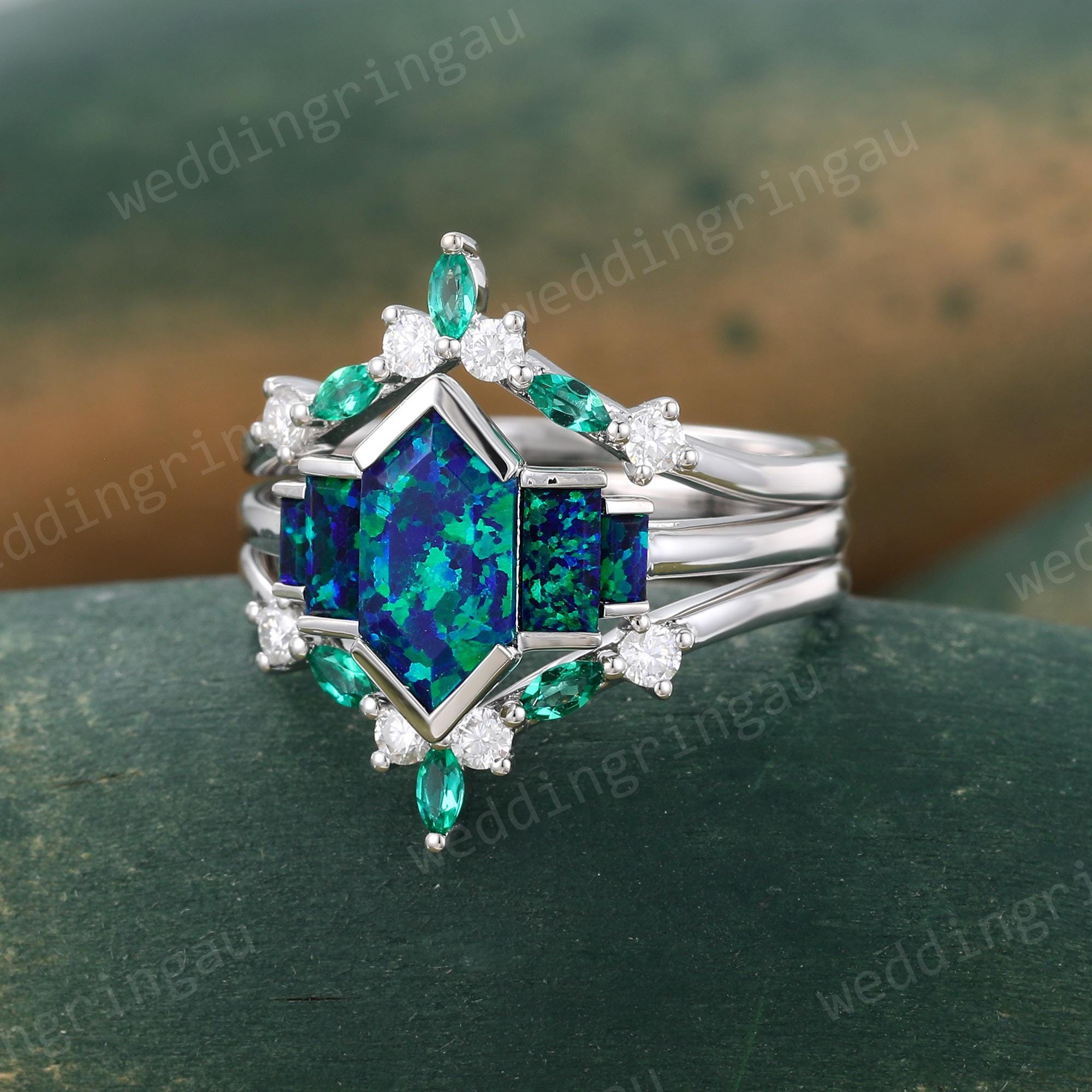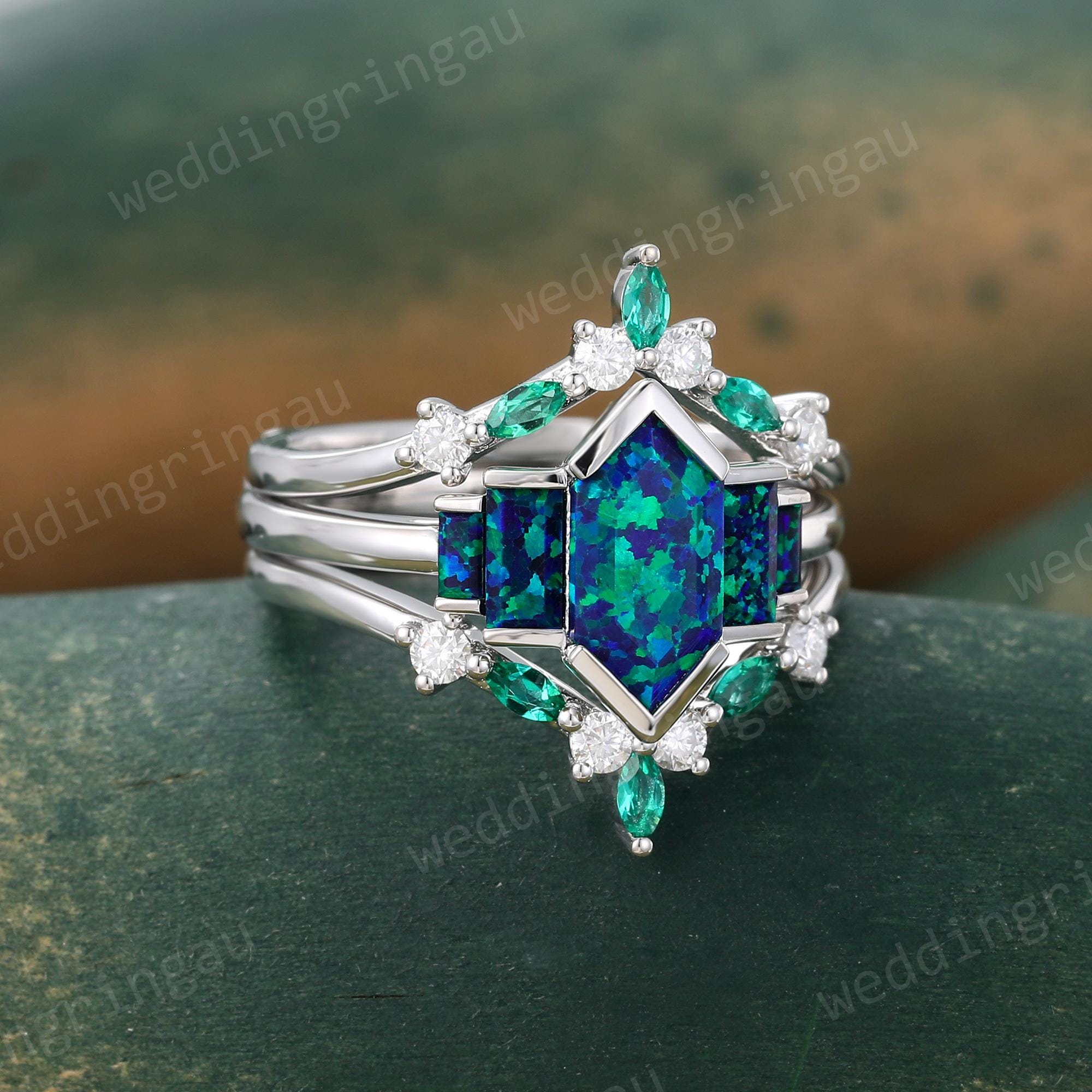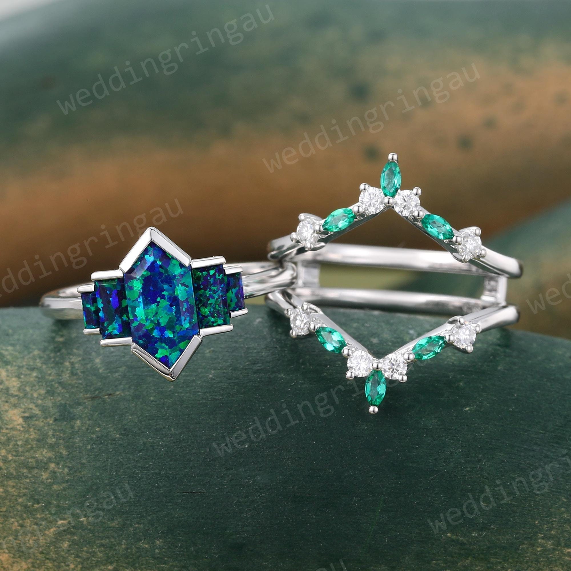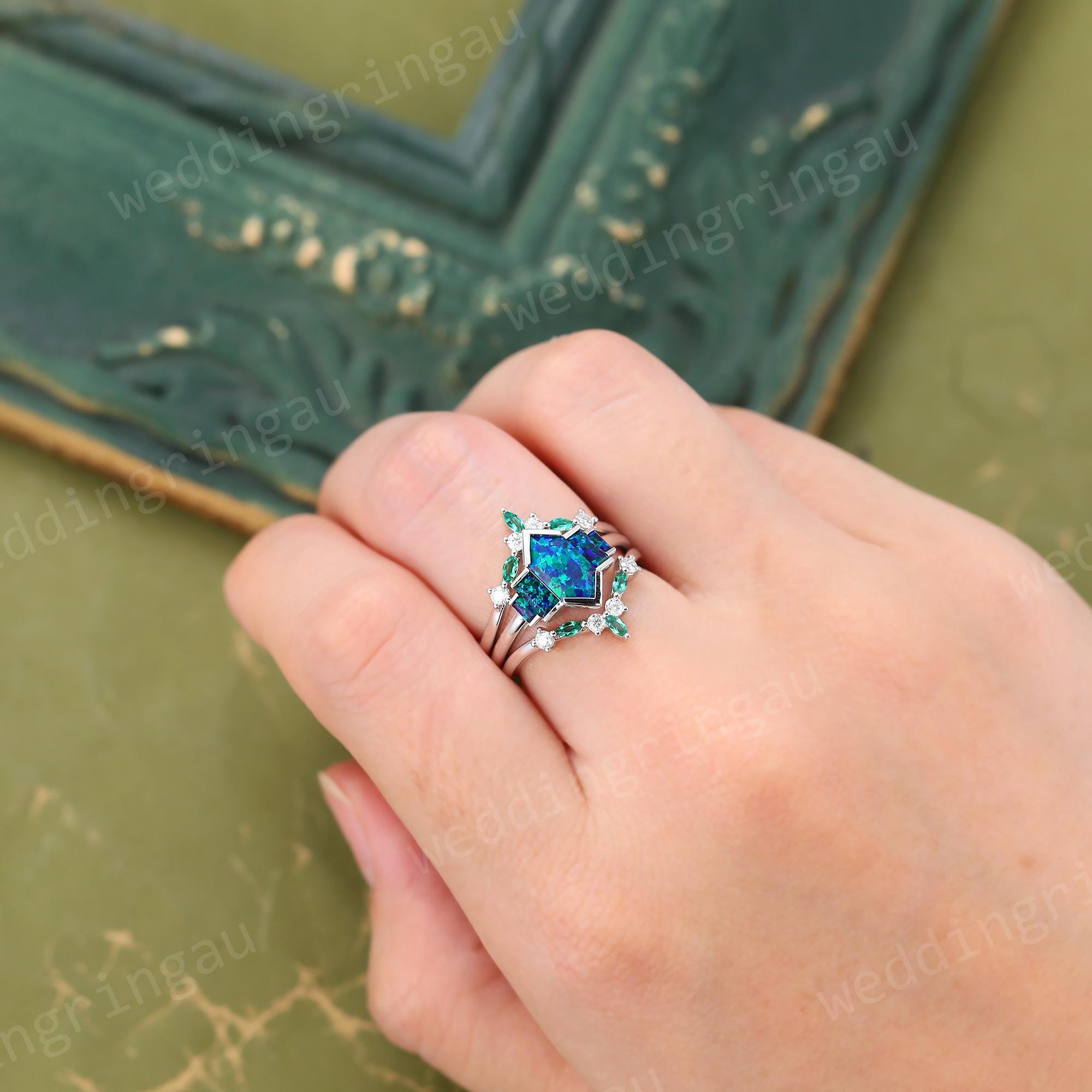 Hexagon cut Blue Green Opal Engagement ring set Vintage White gold Opal Bridal ring set Marquise Emerald Double wedding ring Promise ring