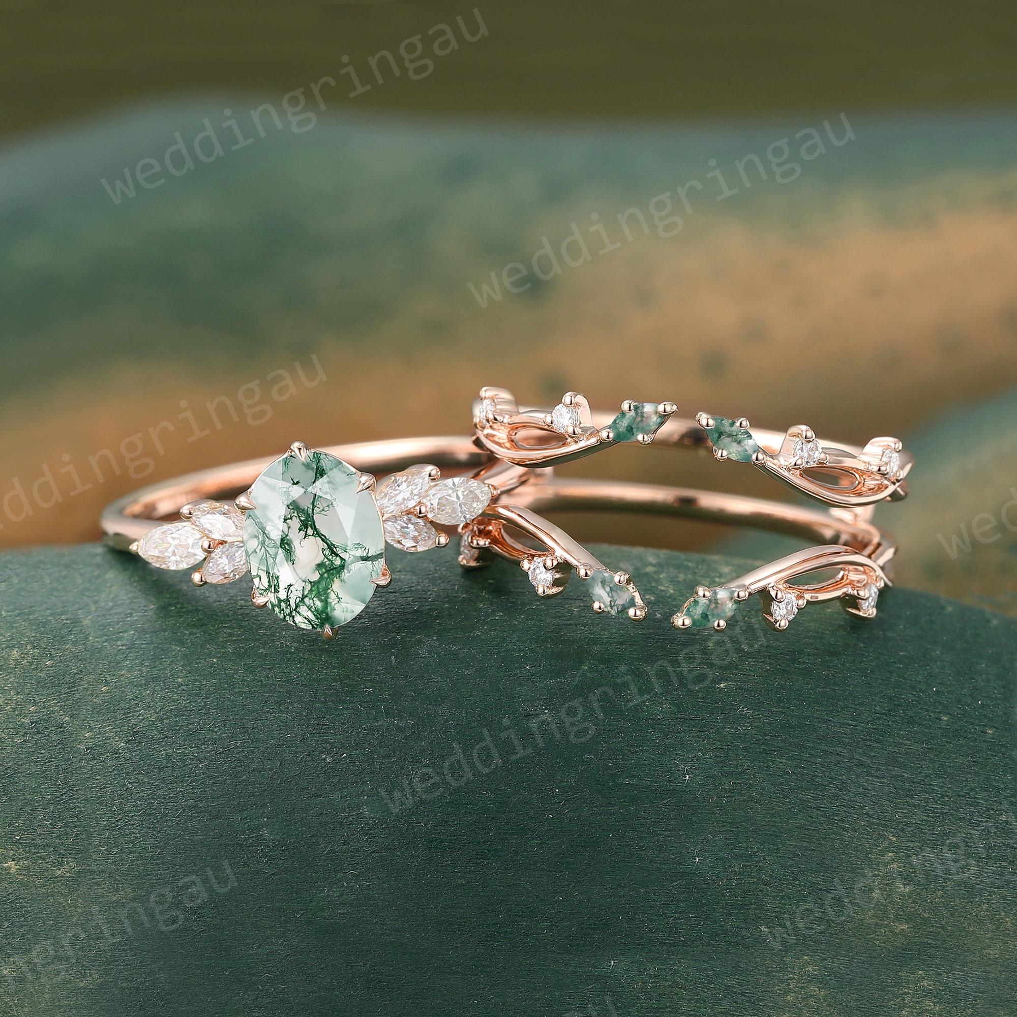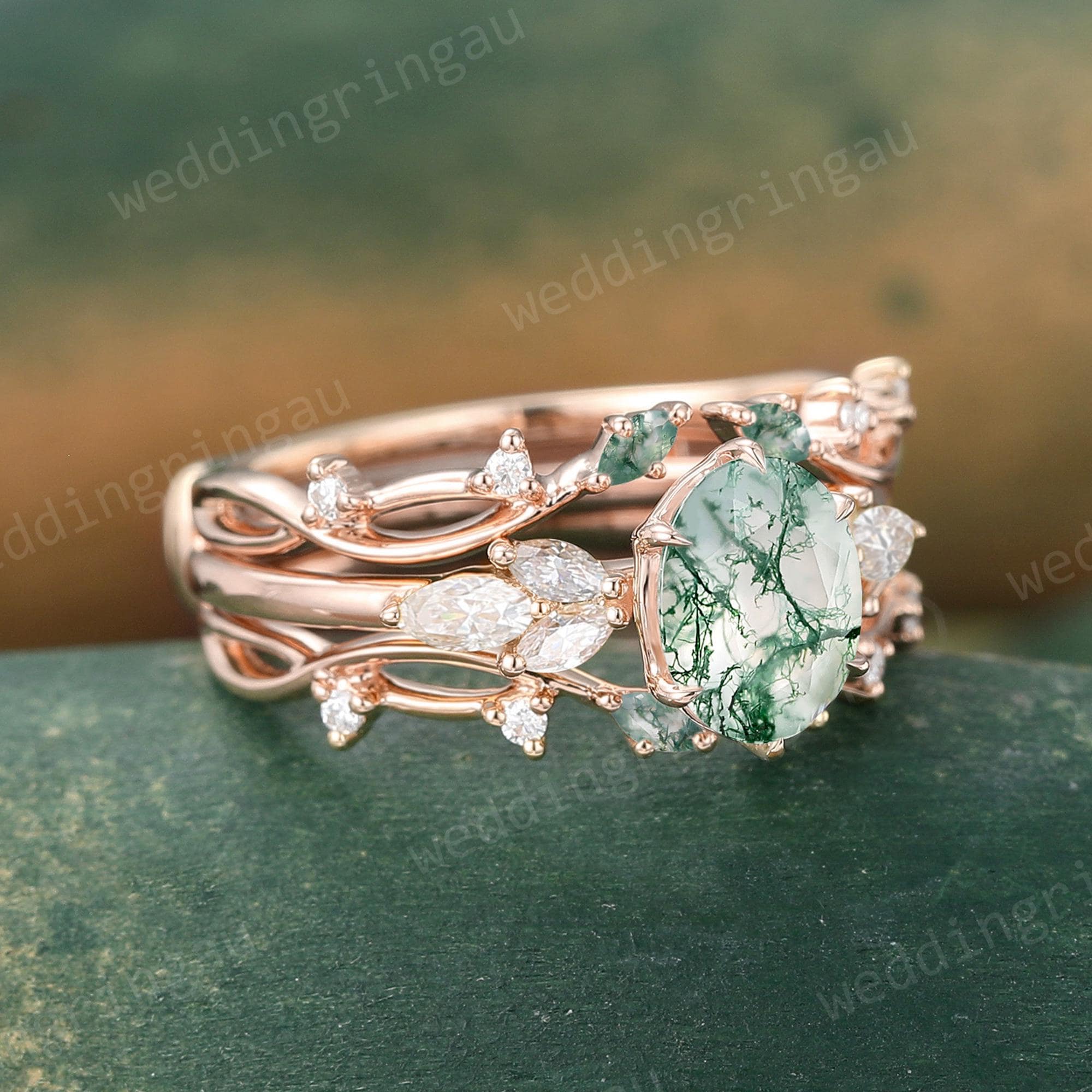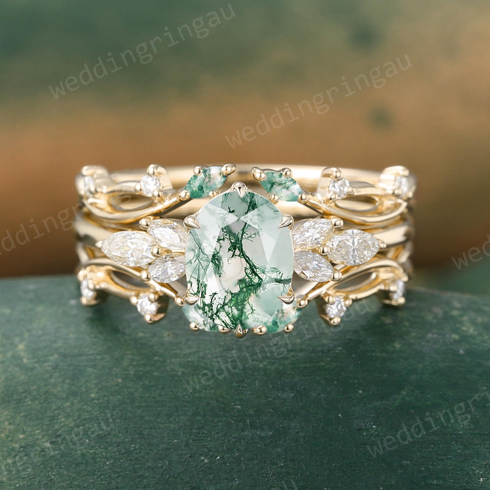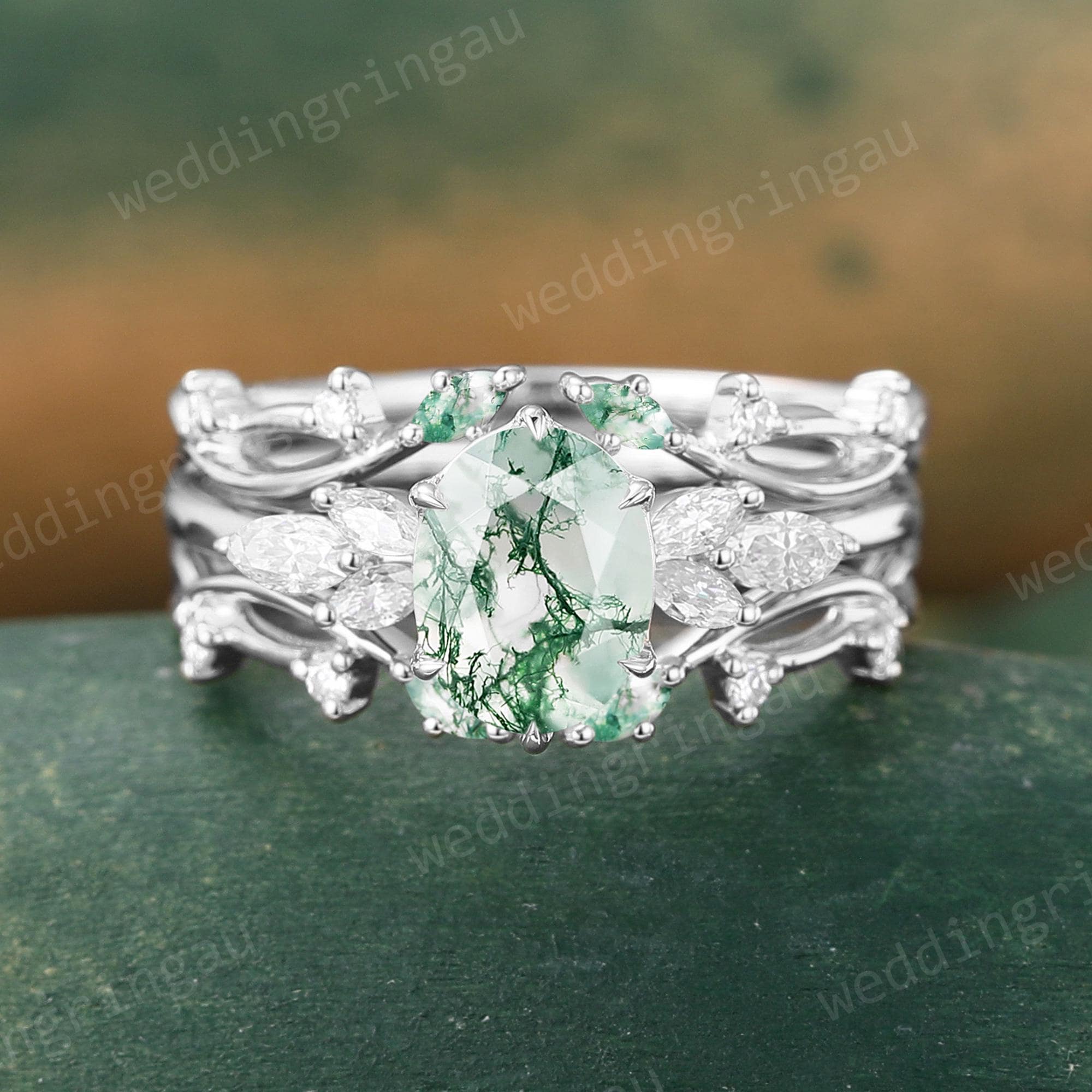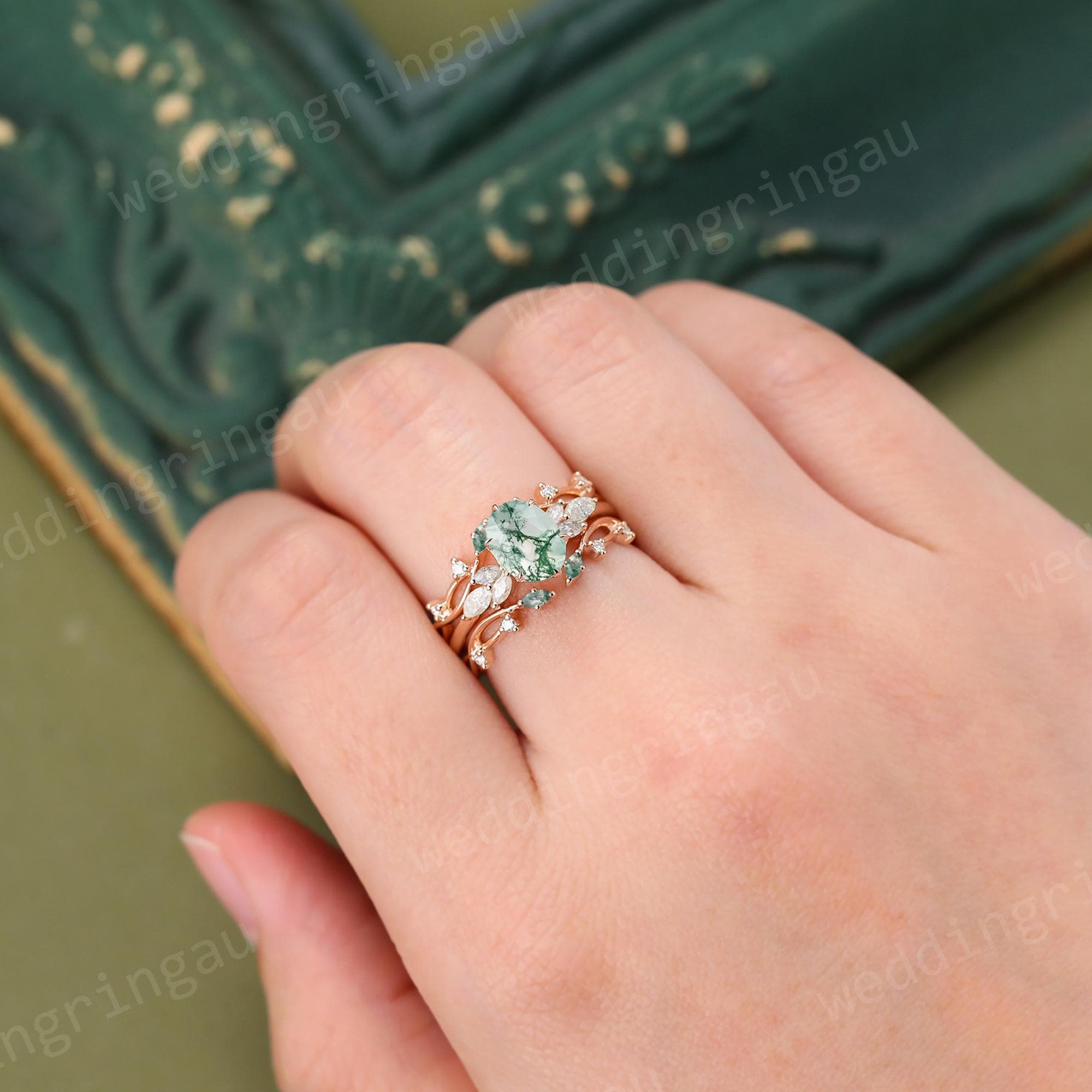 Oval Moss agate Engagement ring set Unique Rose gold Moissanite Cluster ring Leaf Double Enhancer wedding band bridal promise ring set