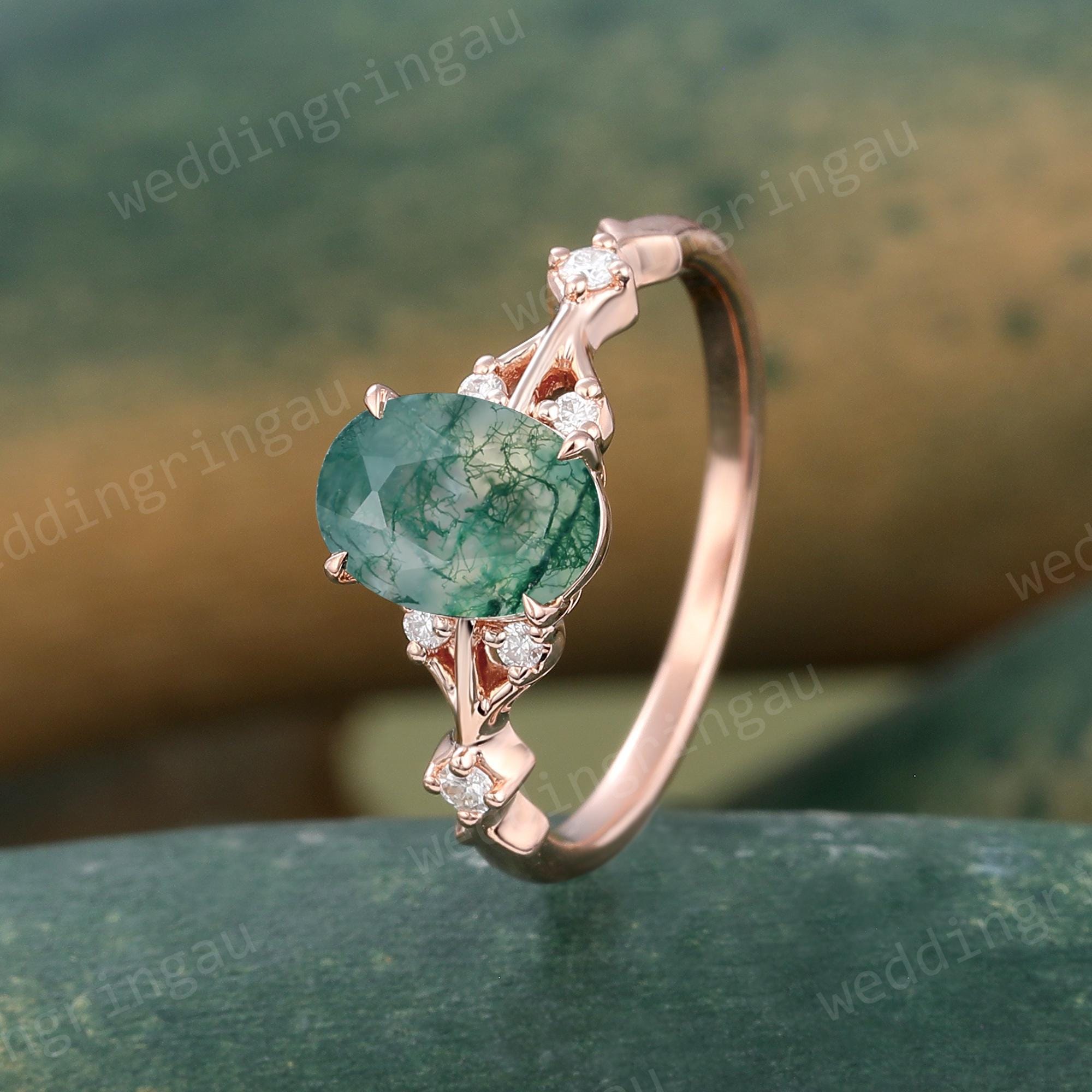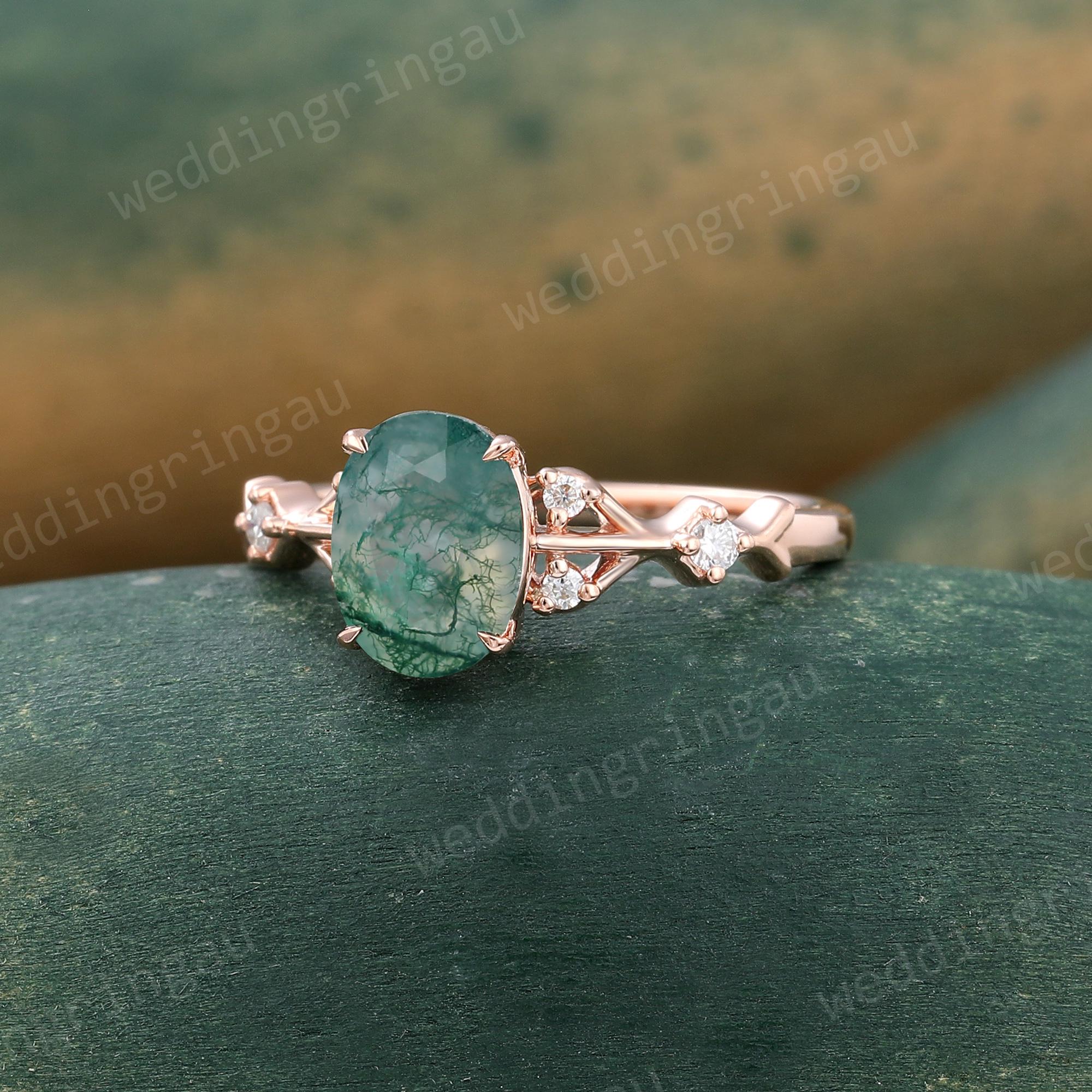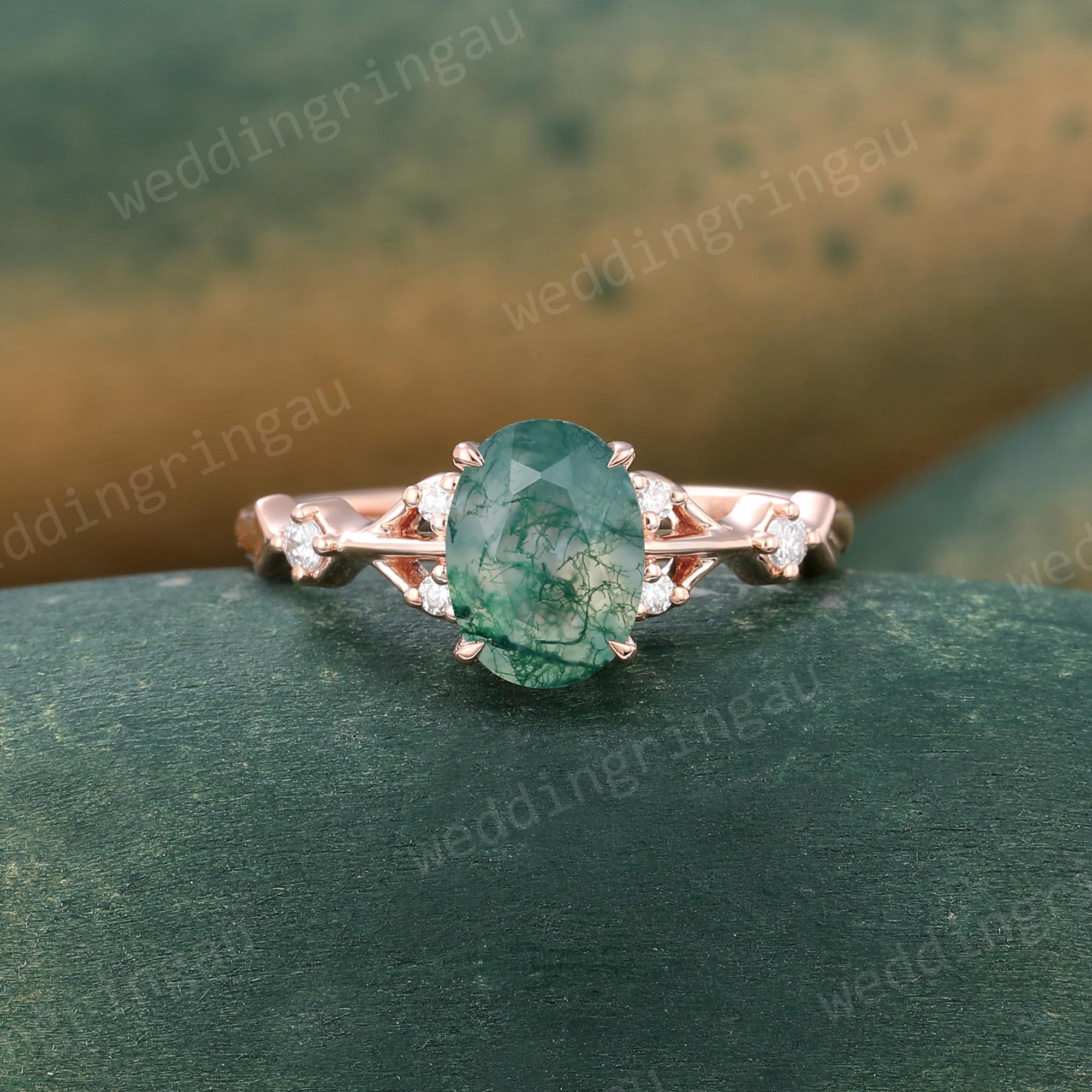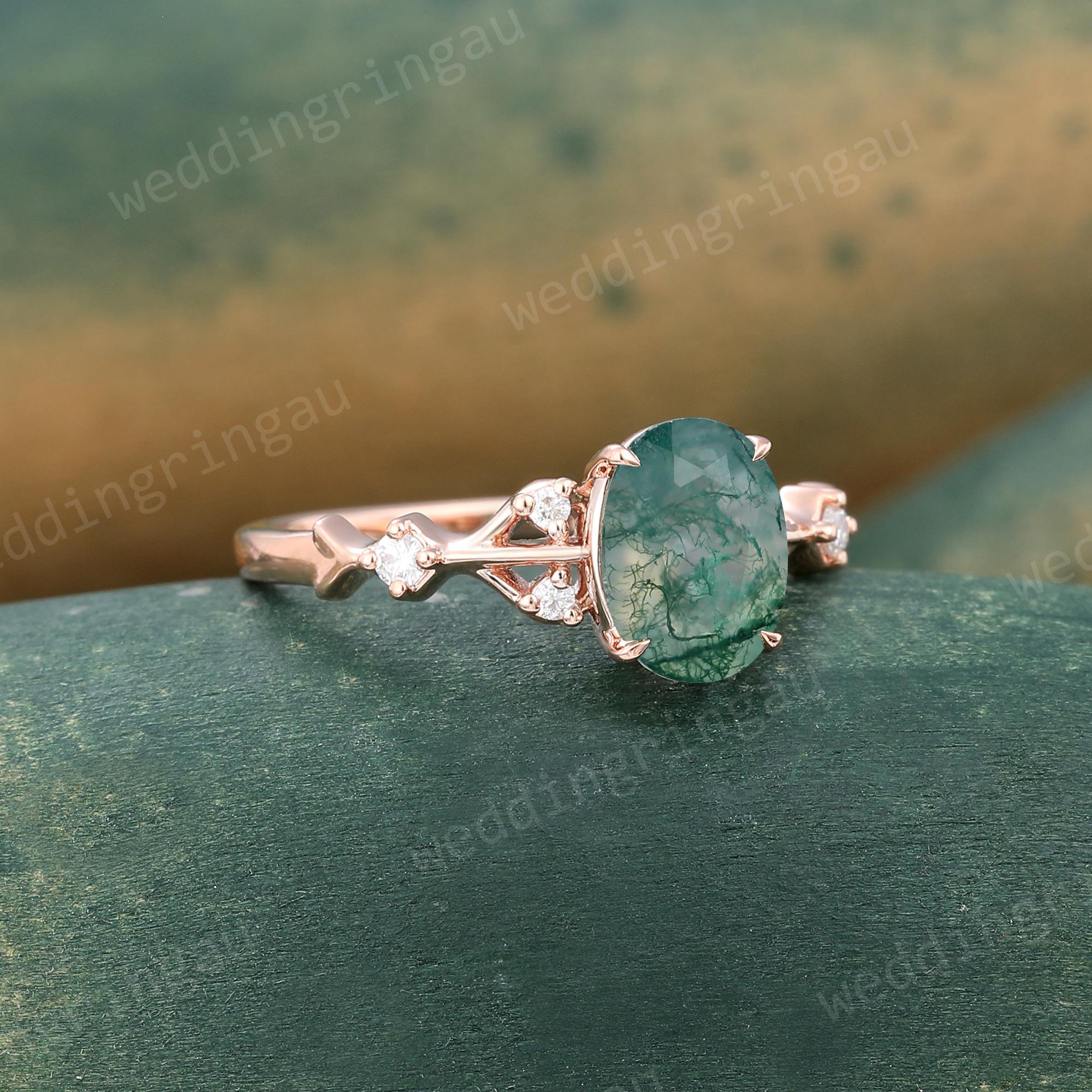 Oval Cut Moss Agate Engagement Ring Vintage Unique Rose Gold Round Moissanite Ring Aquatic Agate Wedding Anniversary Ring Women Gift