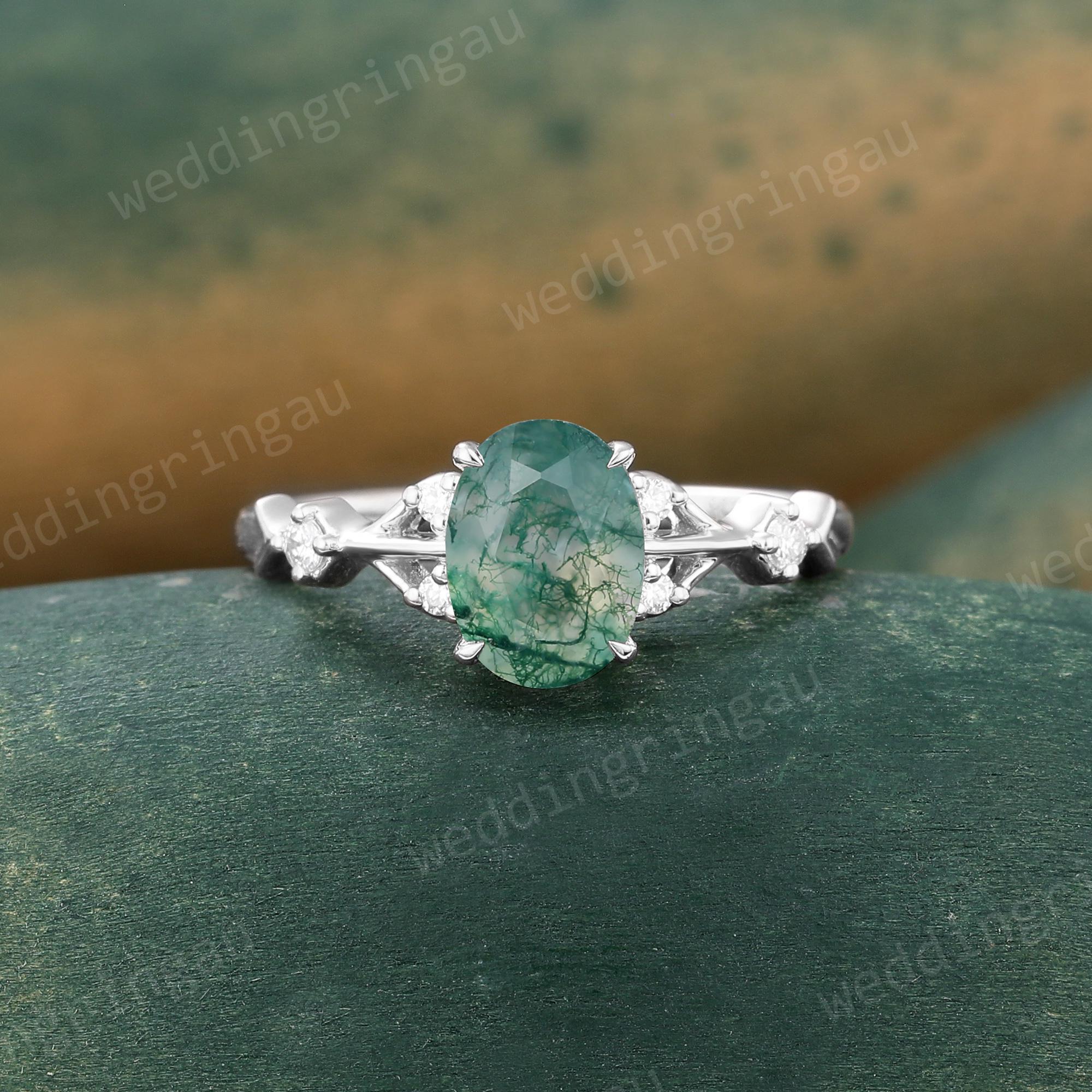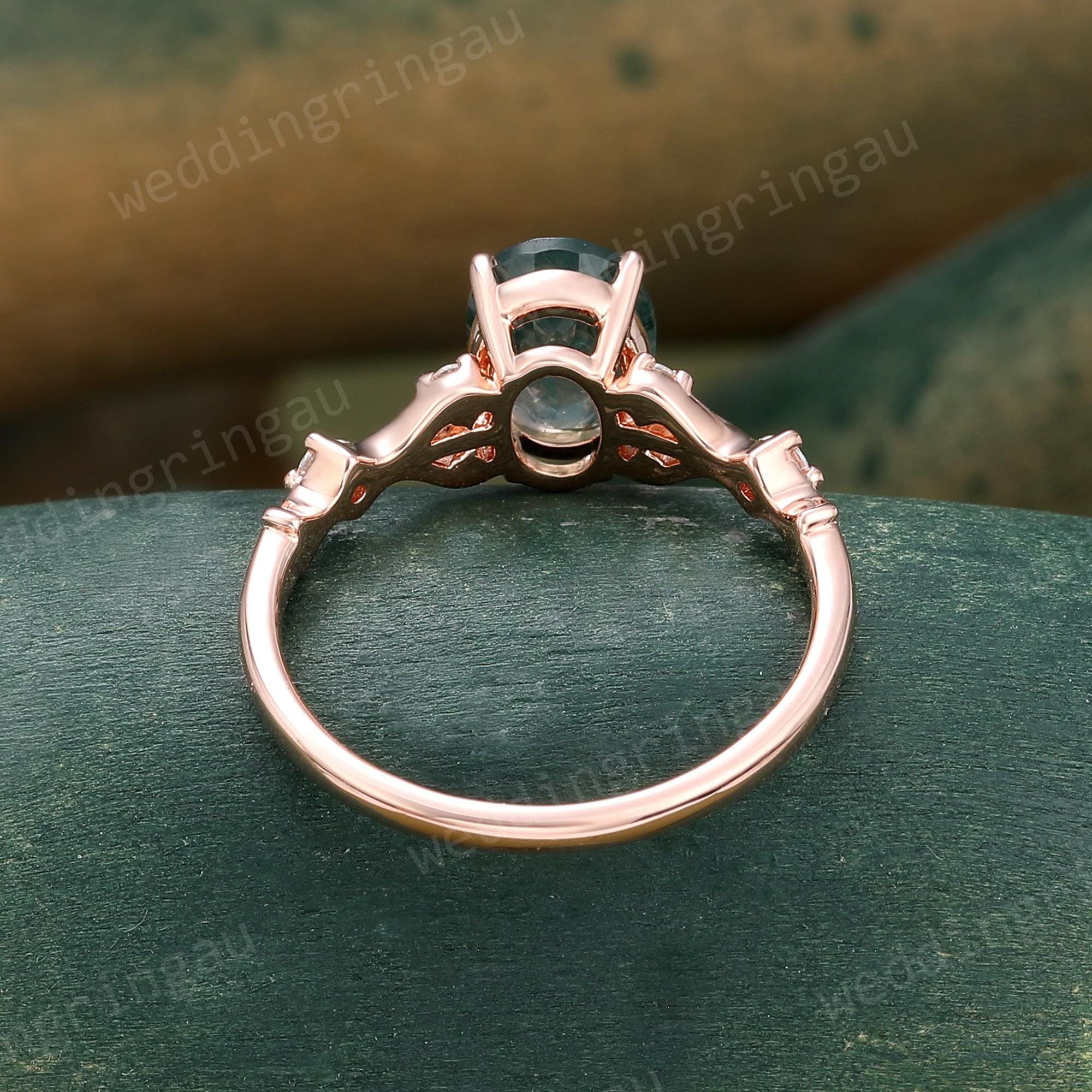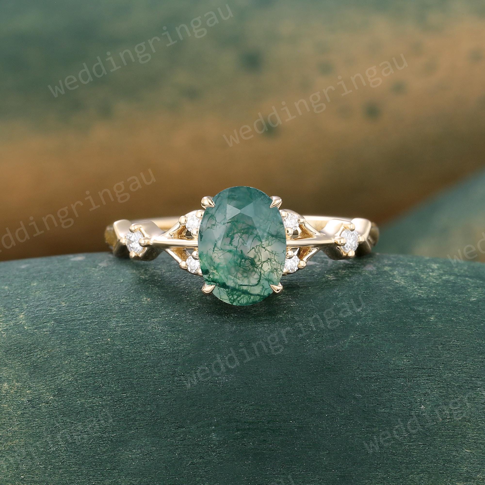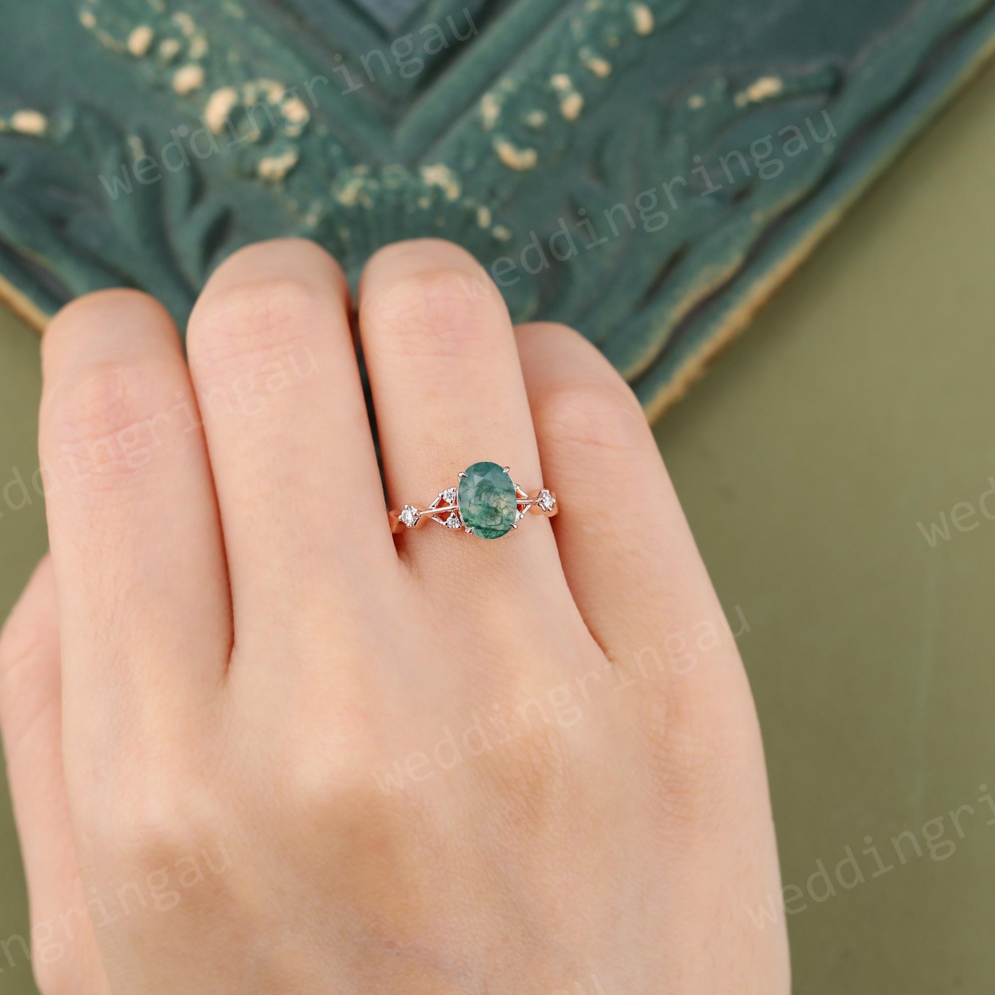 Oval Cut Moss Agate Engagement Ring Vintage Unique Rose Gold Round Moissanite Ring Aquatic Agate Wedding Anniversary Ring Women Gift