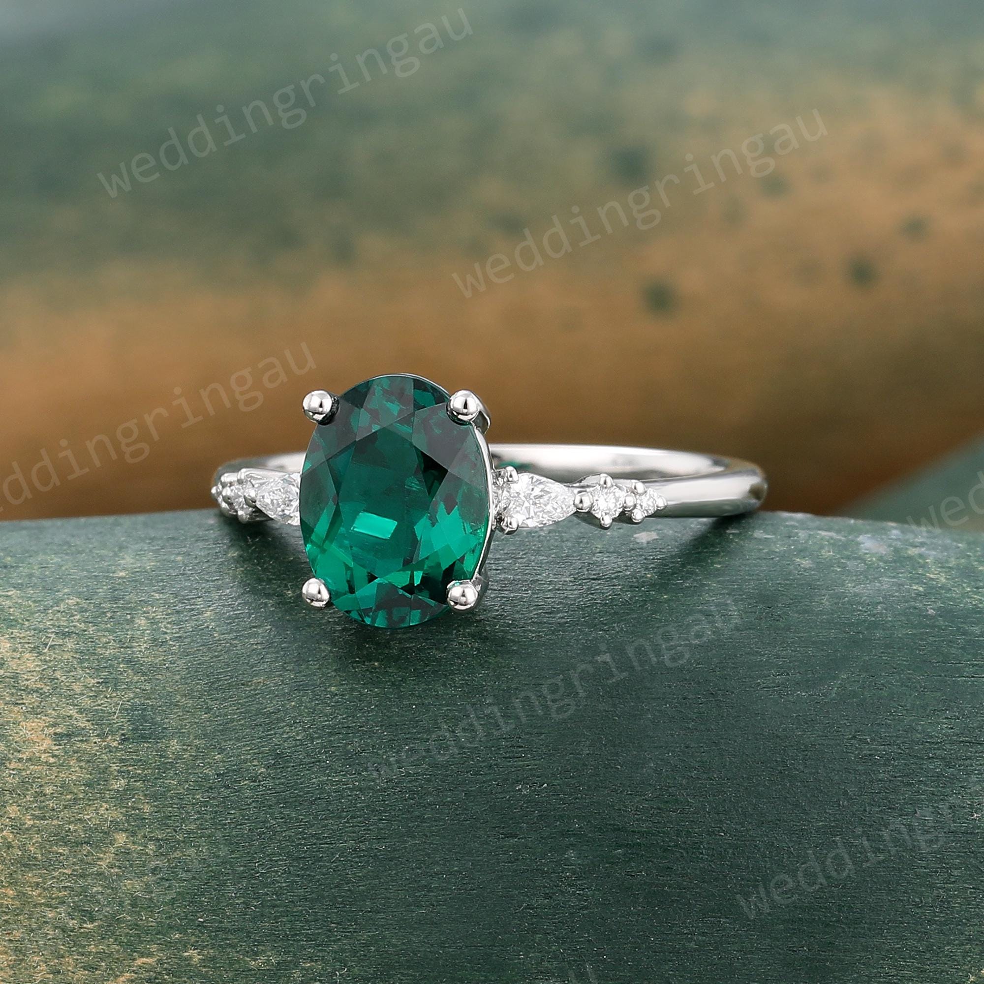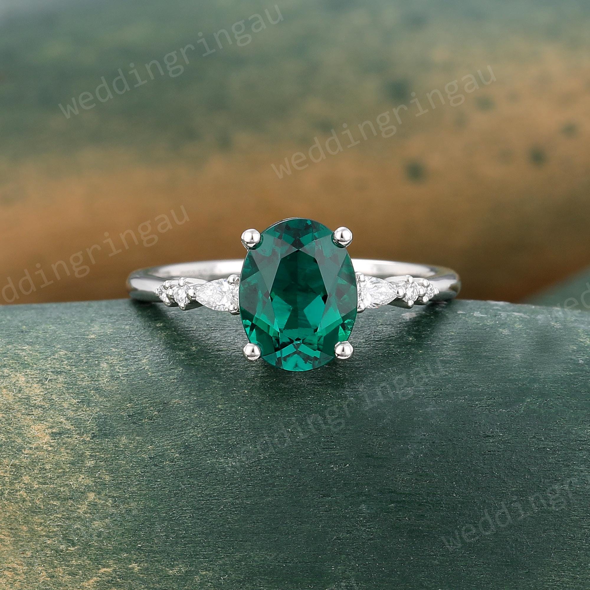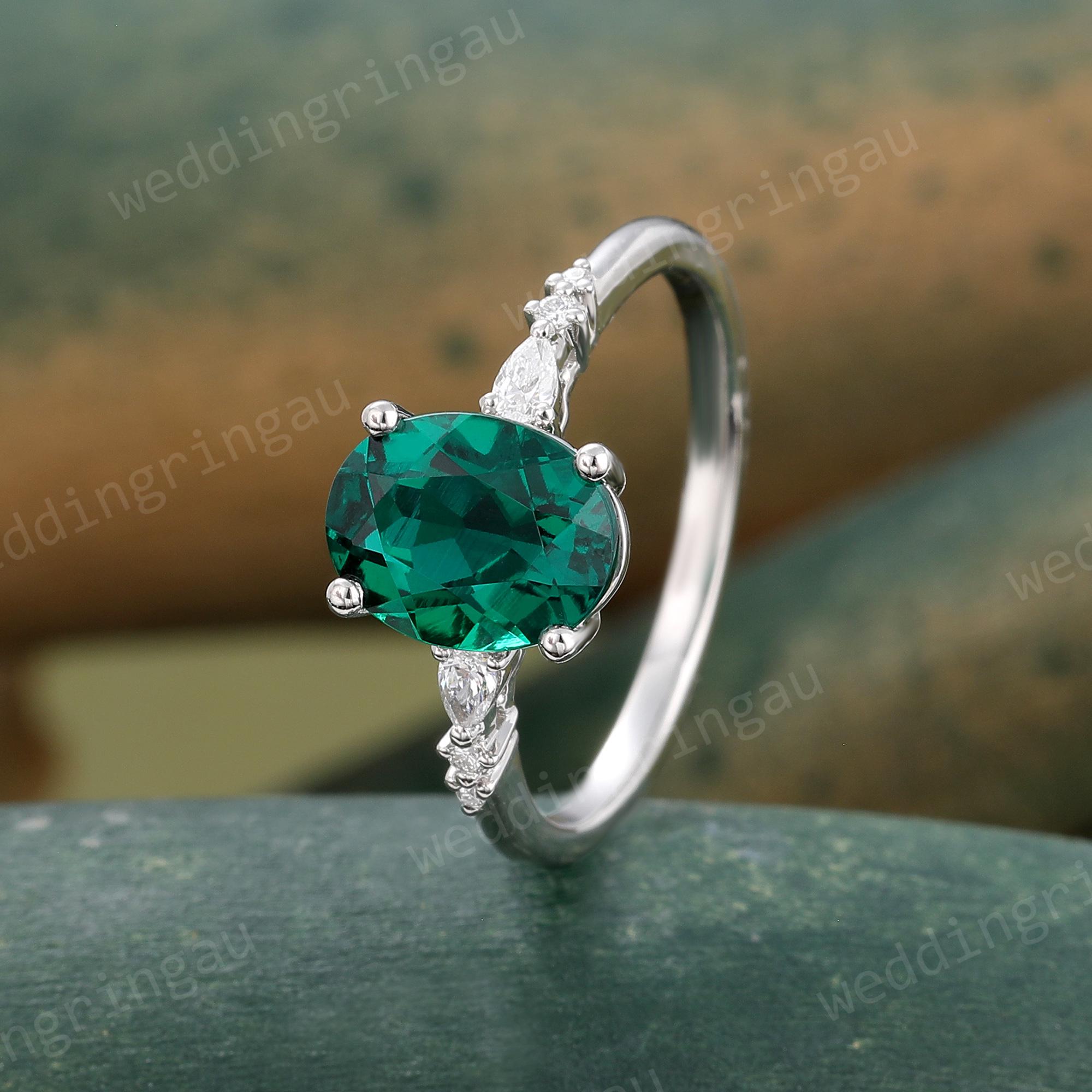 Oval Cut Emerald Engagement Ring Vintage Sterling Silver Pear Moissanite Unique Wedding Anniversary Ring May Birthstone Ring Jewelry