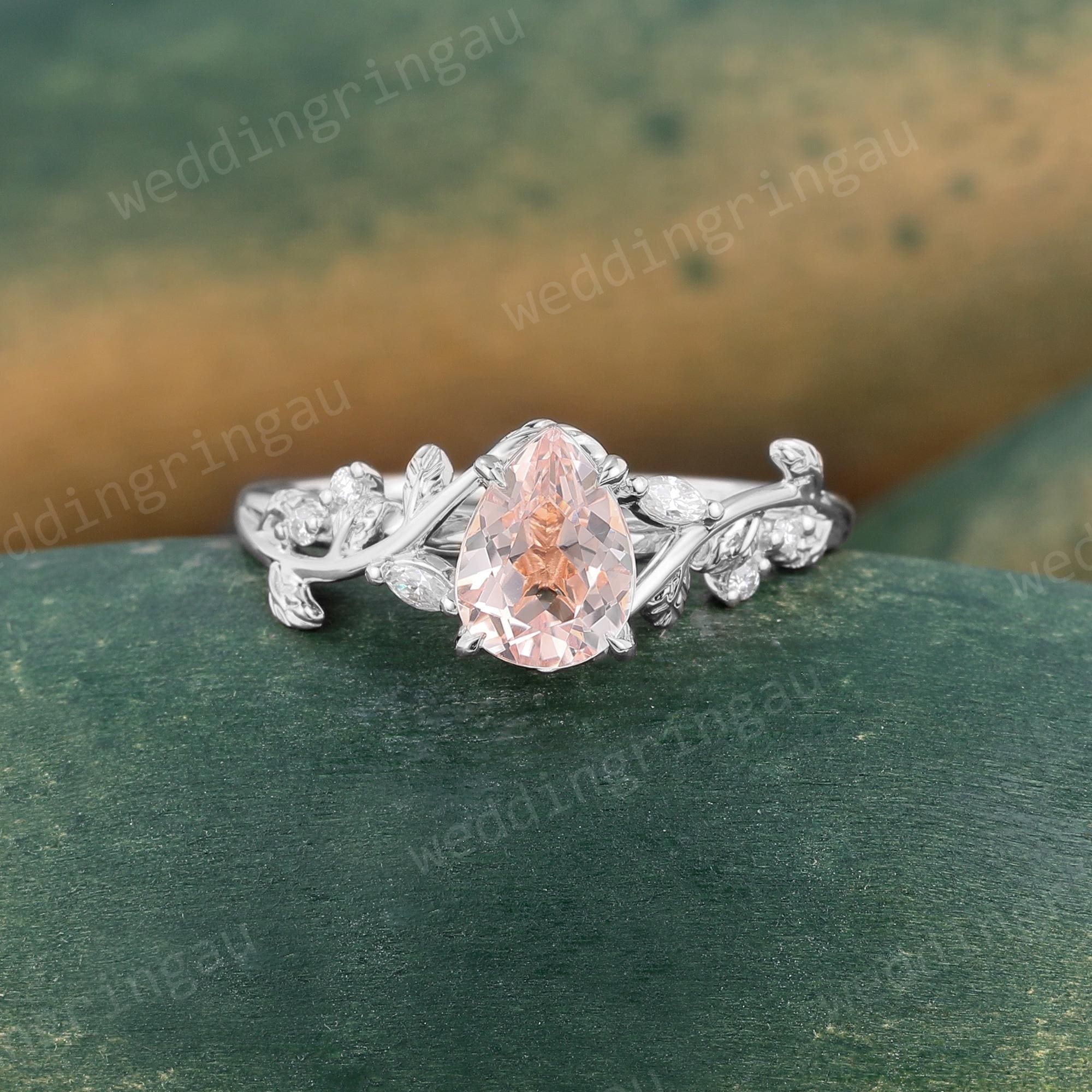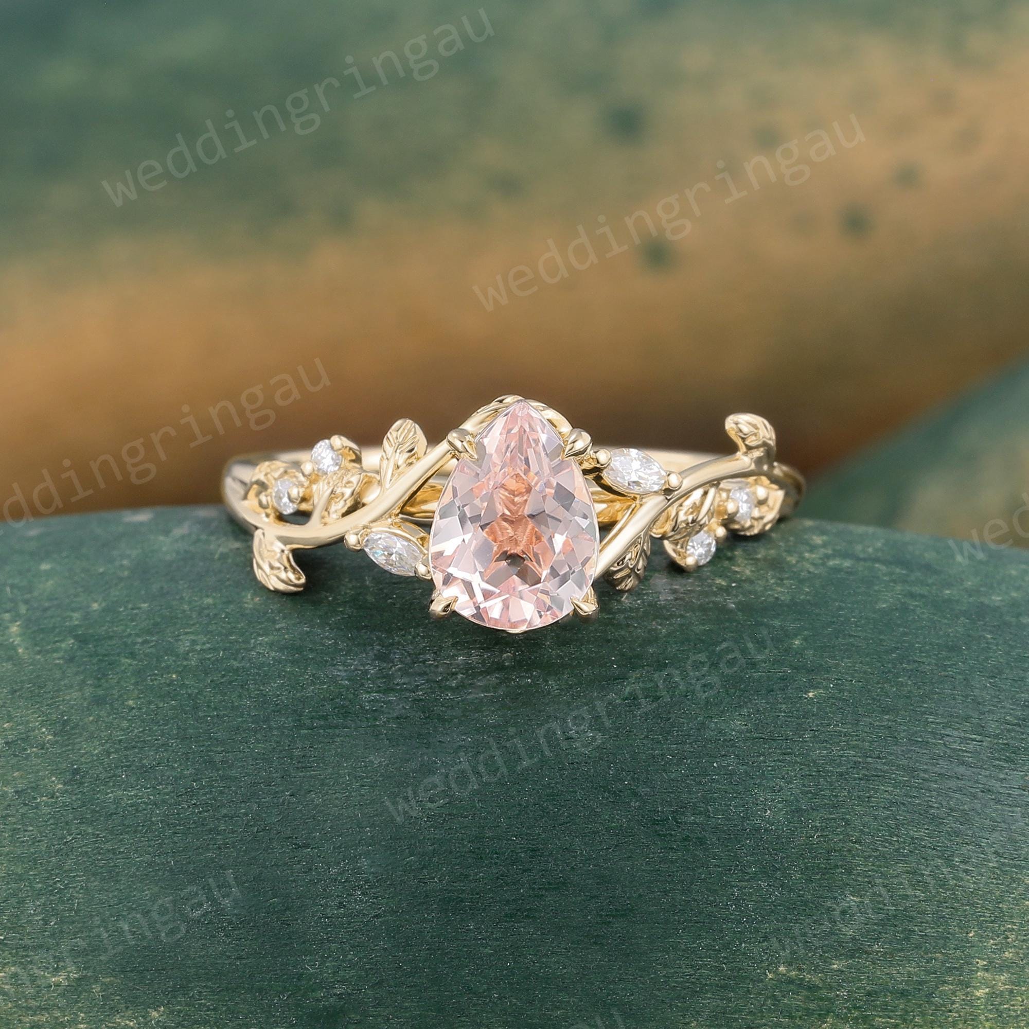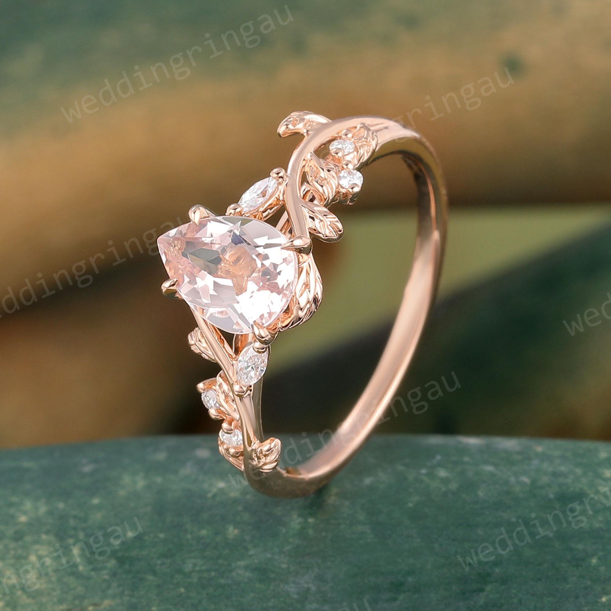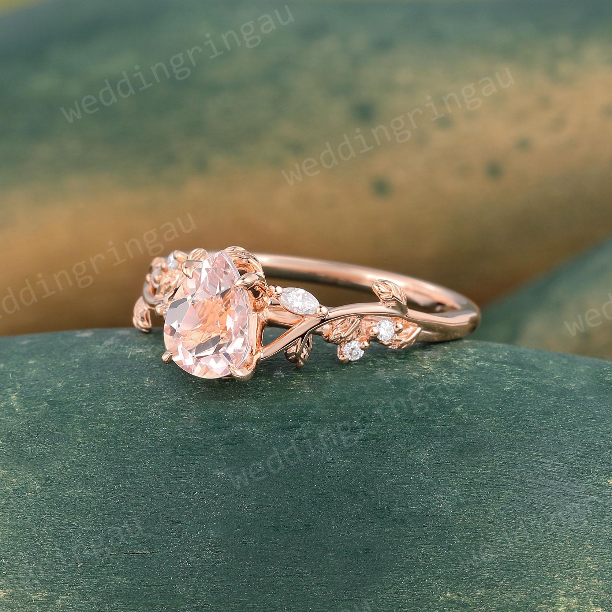 Pear Shaped Orange Pink Morganite Engagement Ring Dainty Rose Gold Marquise Cut Leaf Twig Moissanite Wedding Ring Promise Anniversary Ring