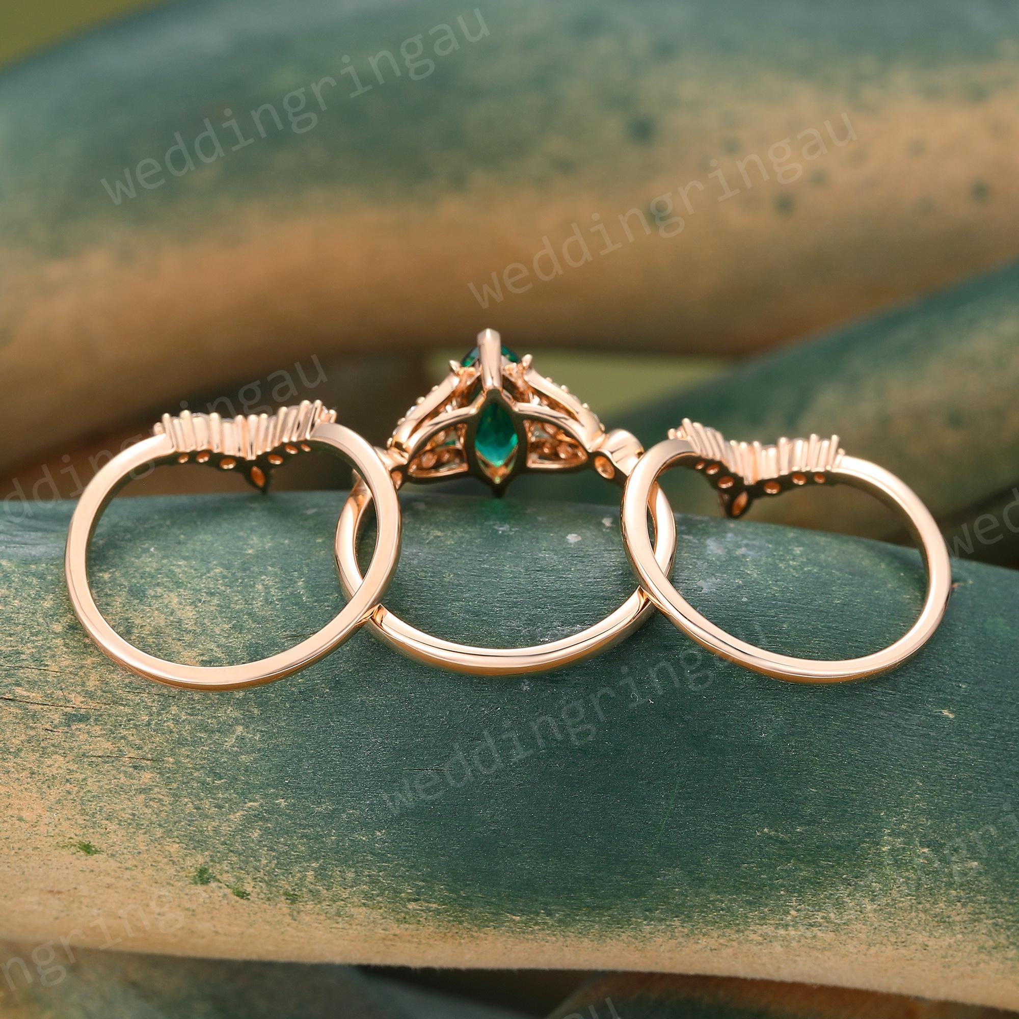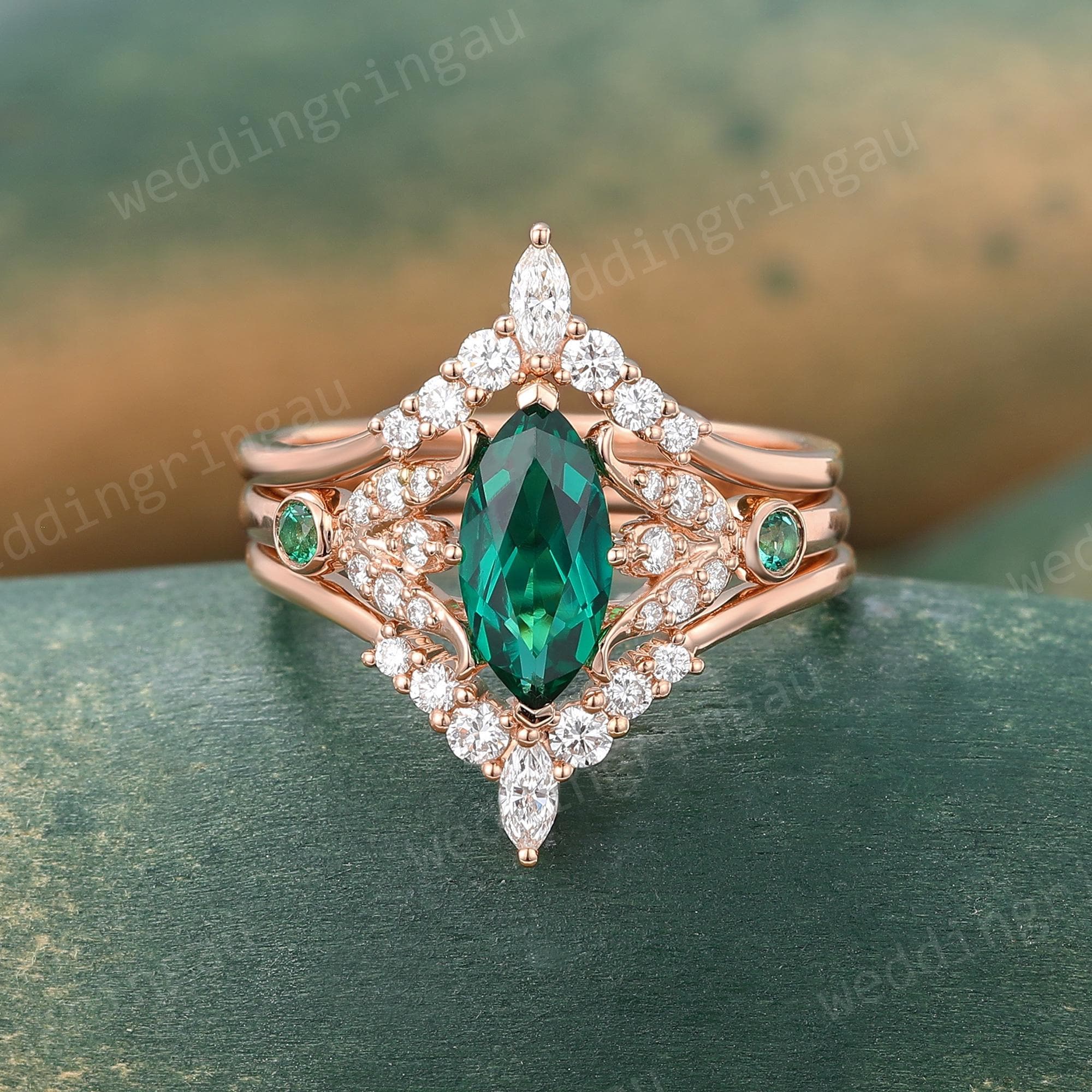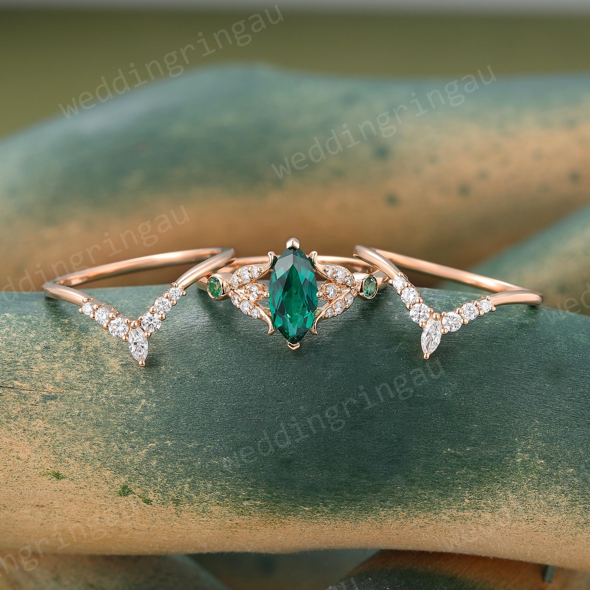 3PCS Marquise Cut Emerald Engagement Ring Set Vintage Rose Gold Round Moissanite Iris Bridal Ring Set Dainty Bridal Chevron Promise Ring