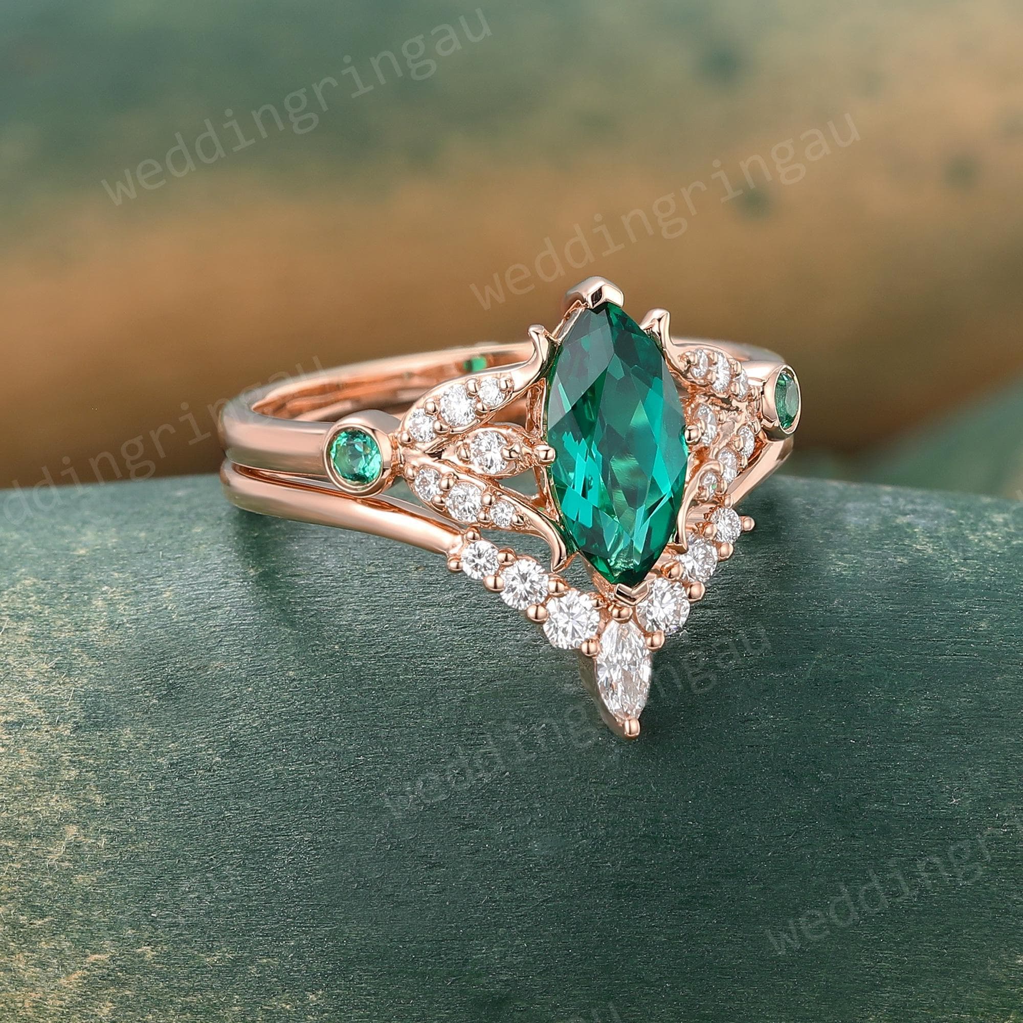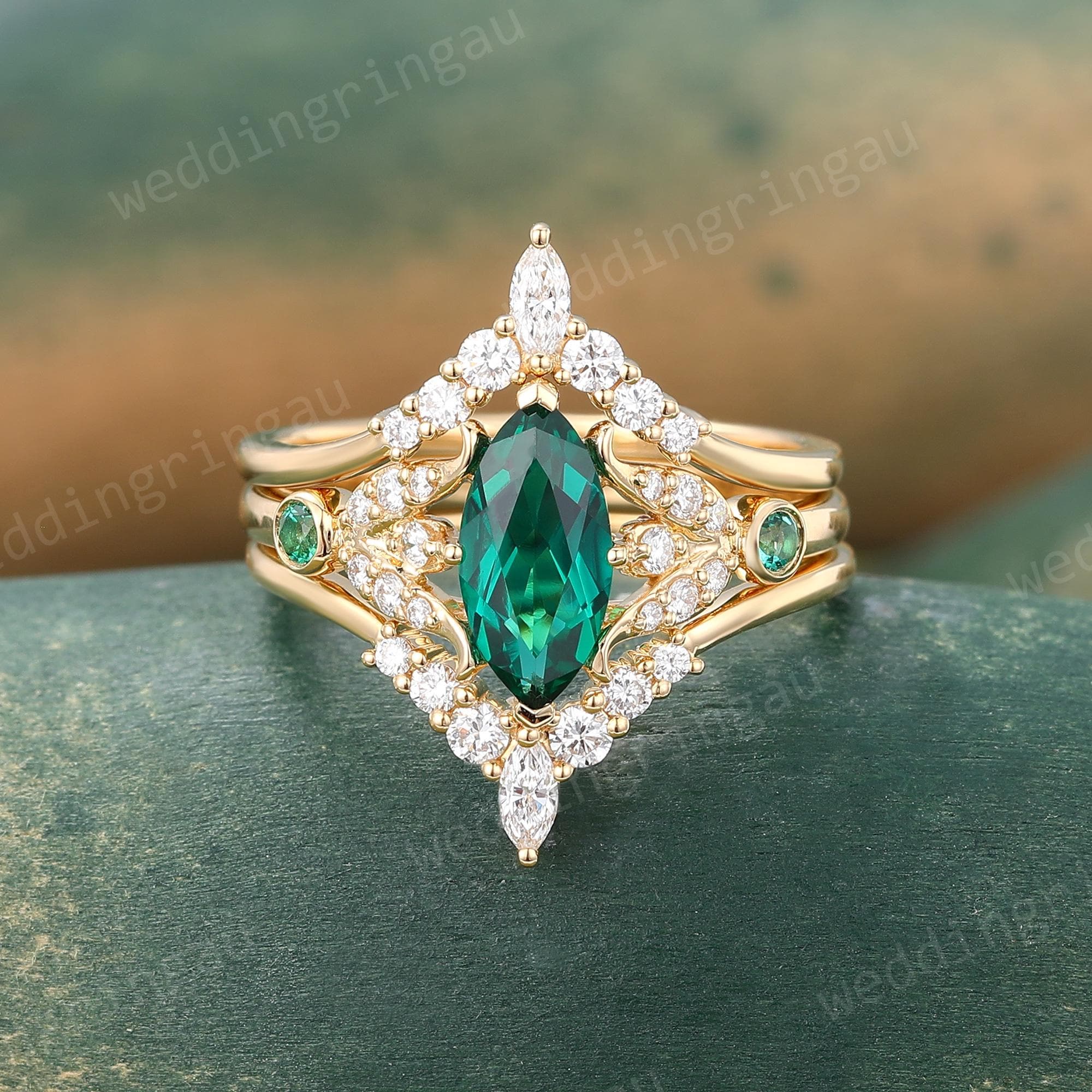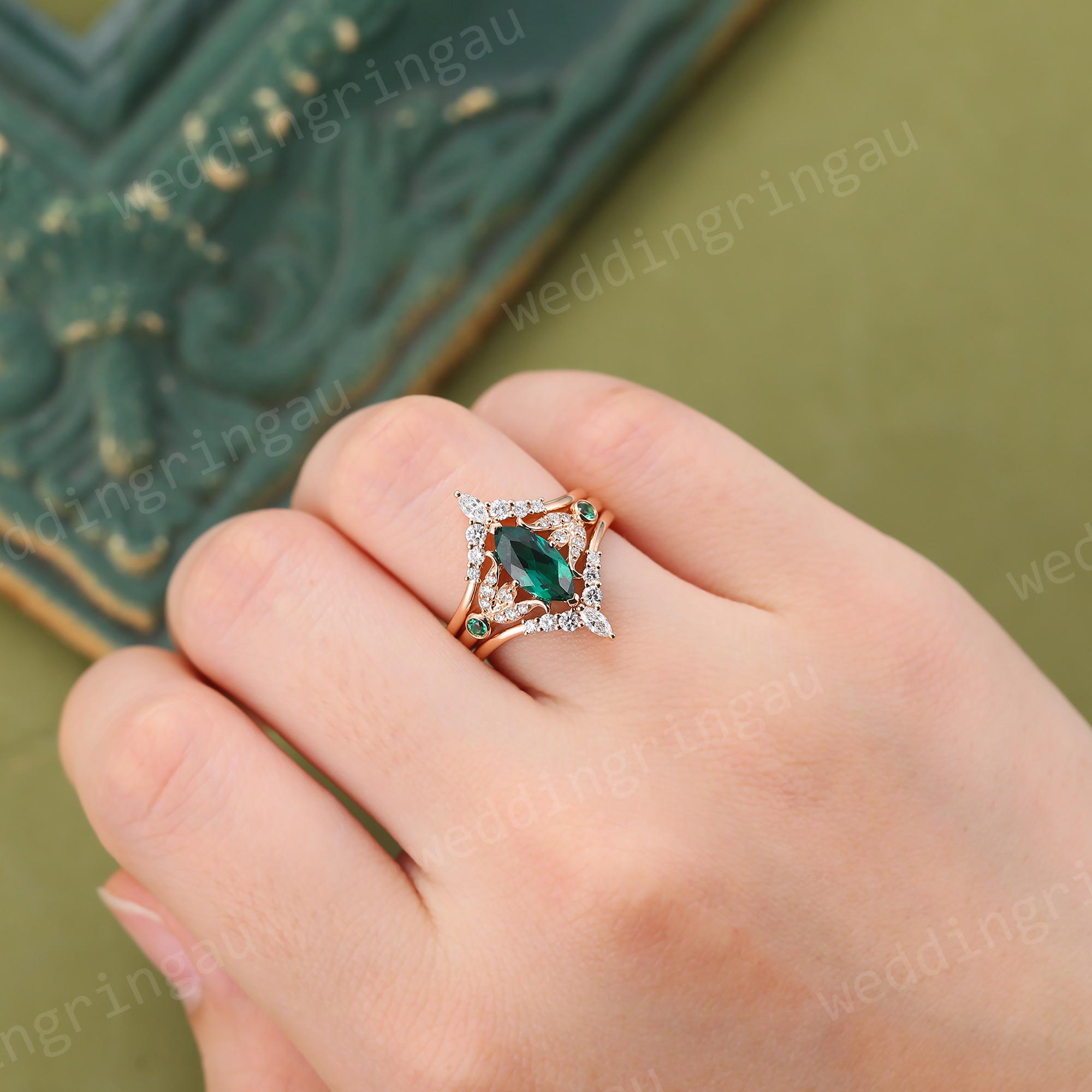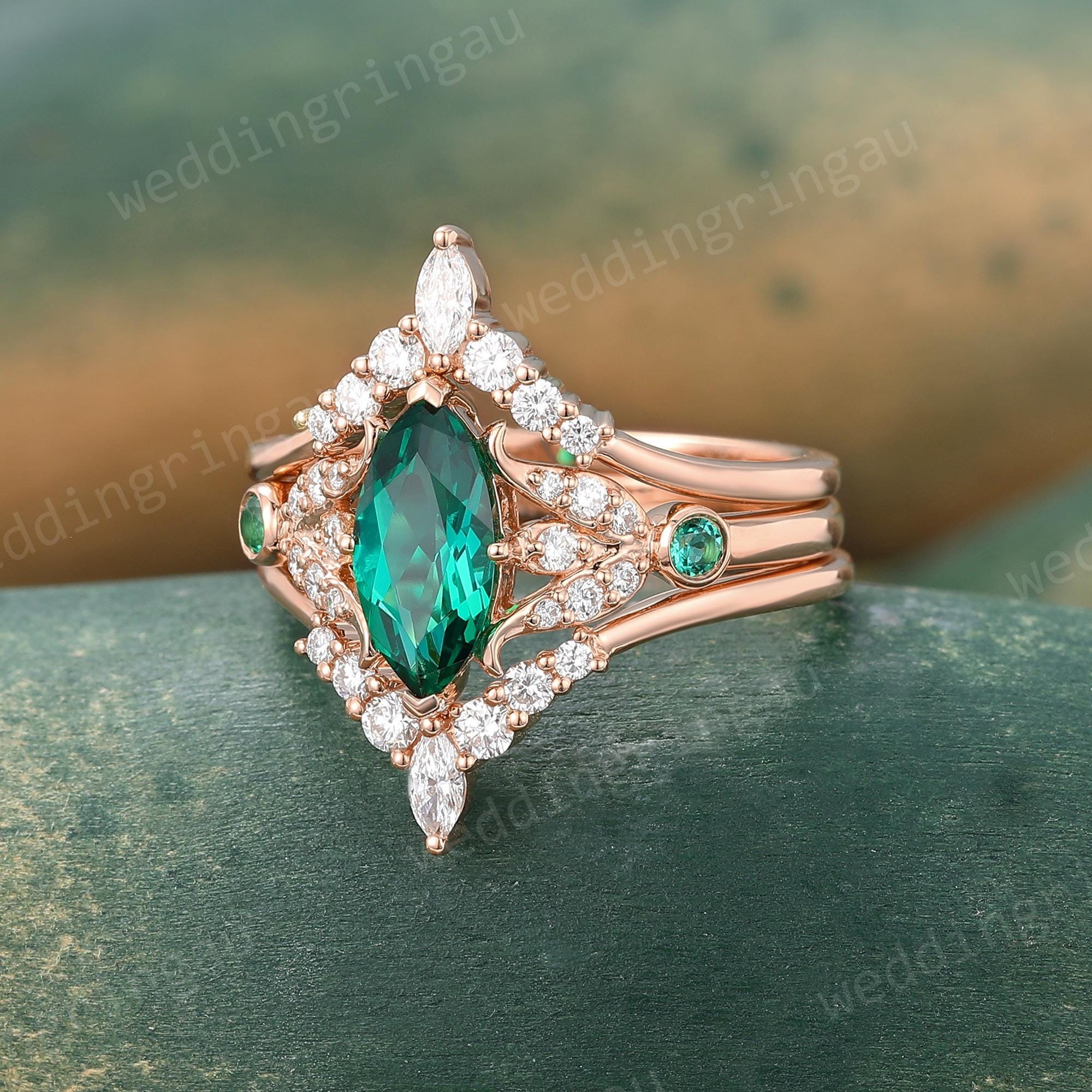 3PCS Marquise Cut Emerald Engagement Ring Set Vintage Rose Gold Round Moissanite Iris Bridal Ring Set Dainty Bridal Chevron Promise Ring