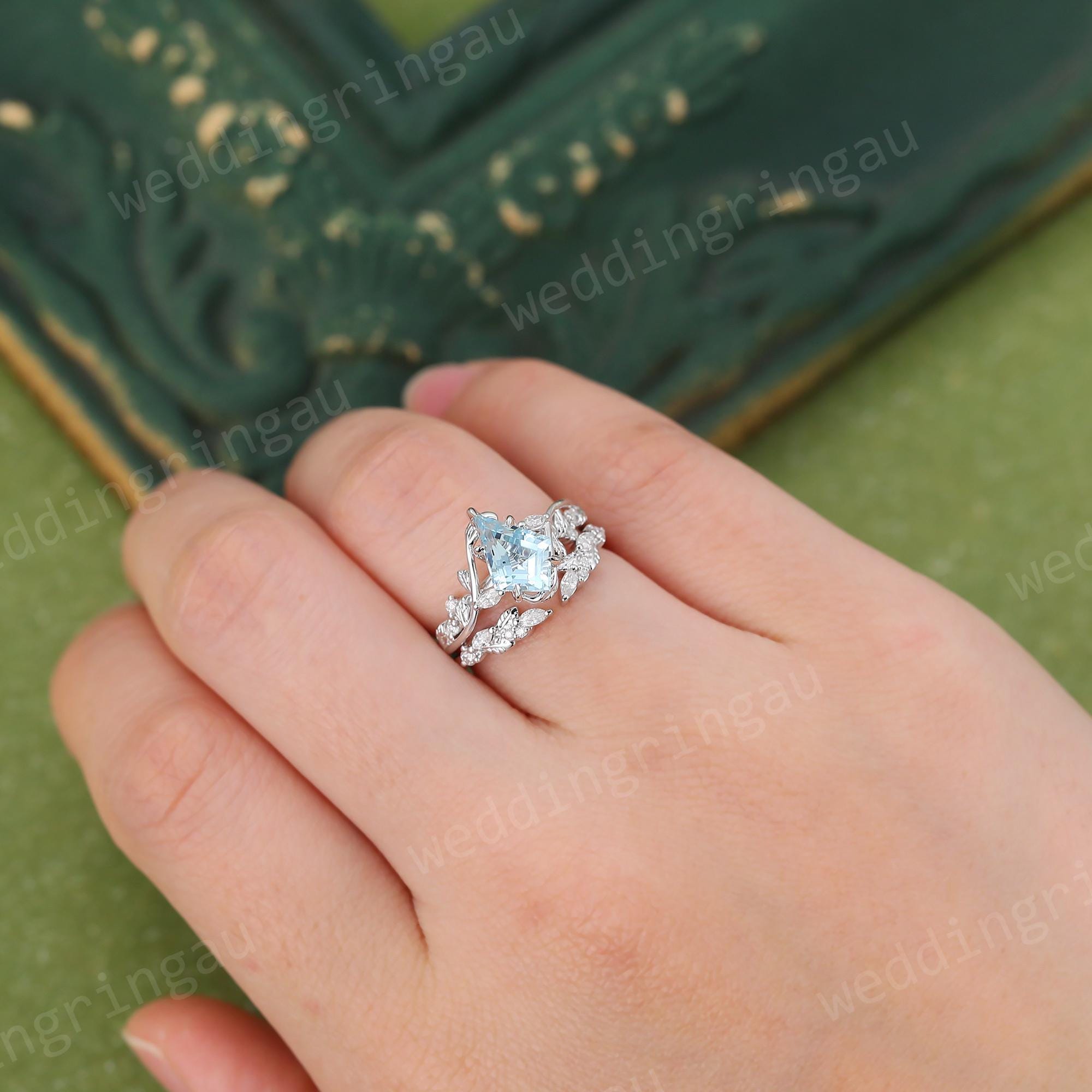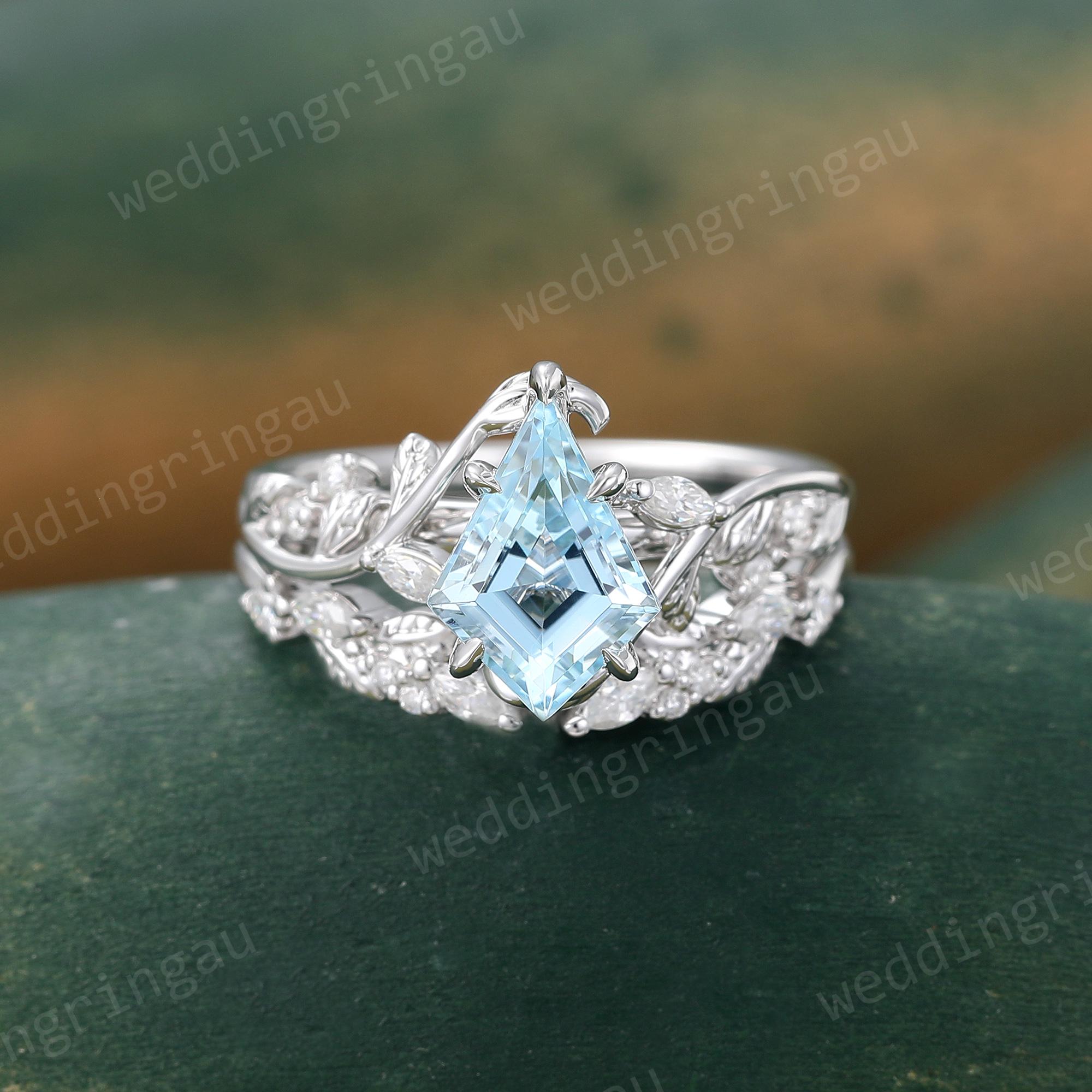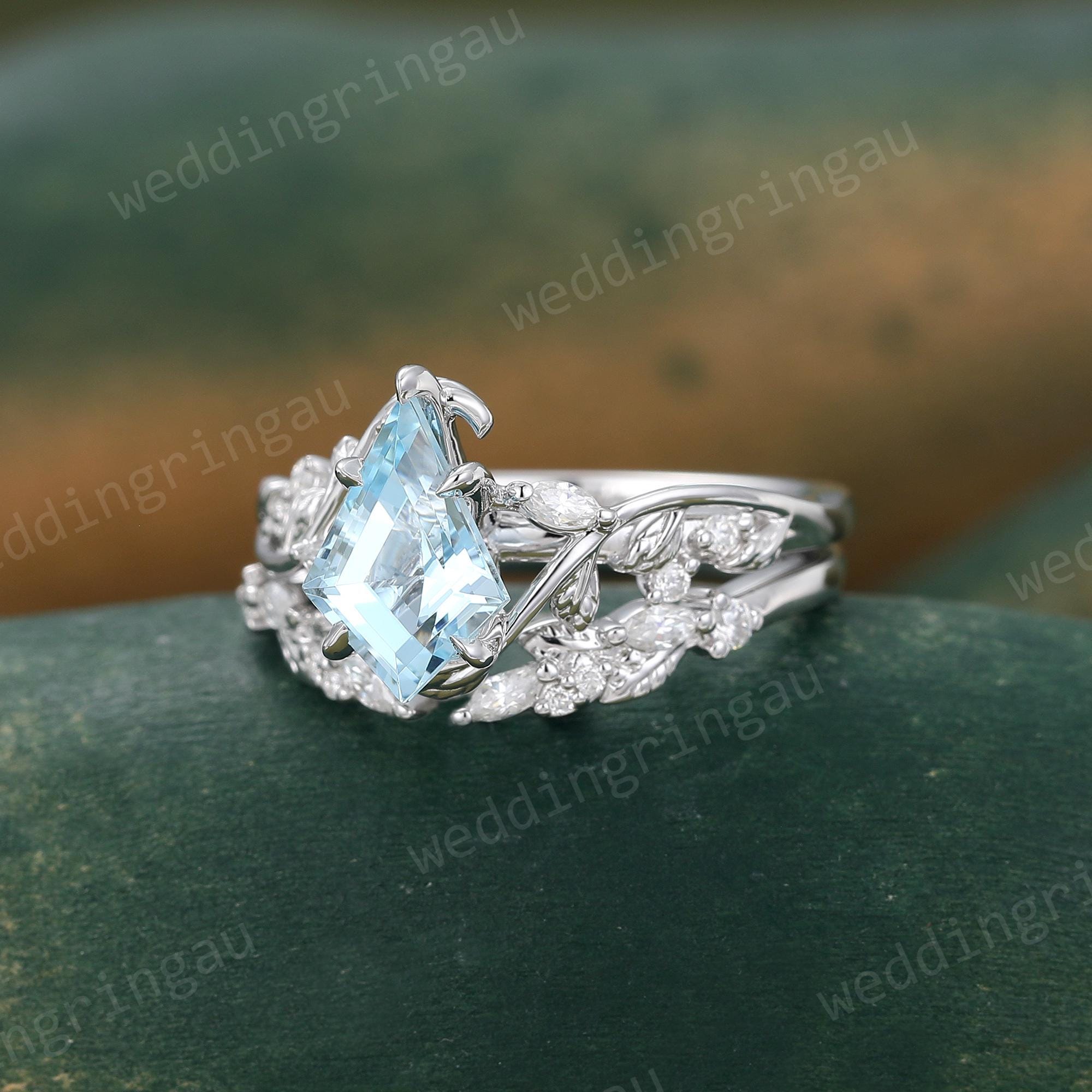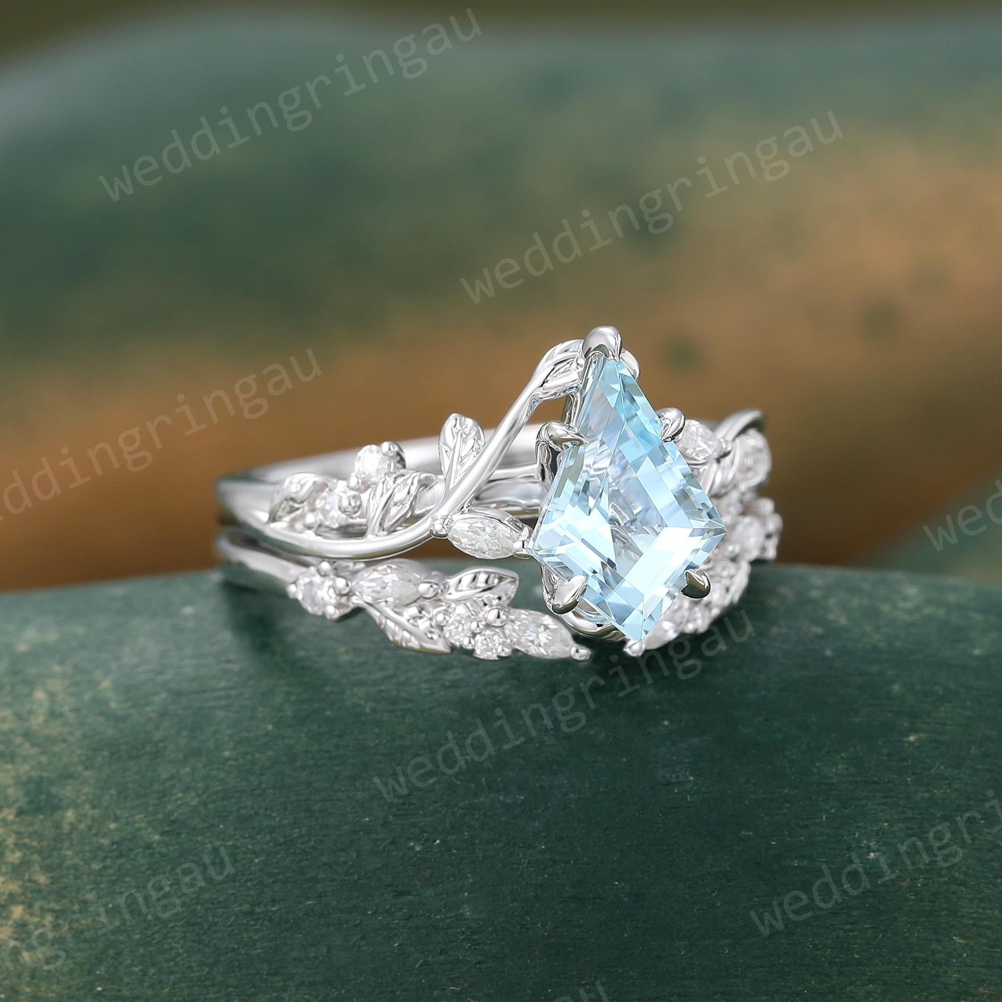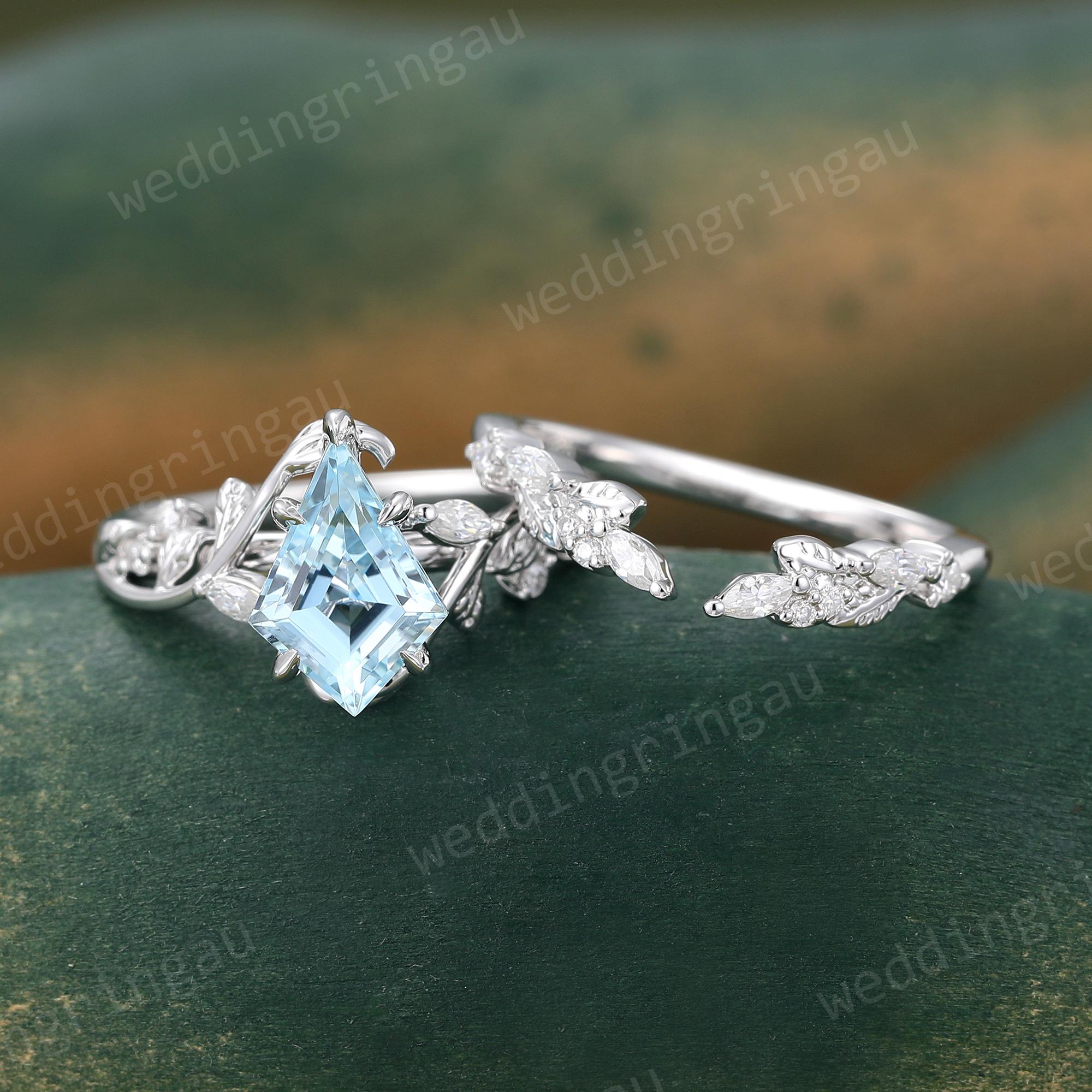 Vintage Kite Cut Aquamarine Engagement Ring Set White Gold Marquise Cut Moissanite Twig Branch Wedding Bridal Nature Inspired Promise Ring