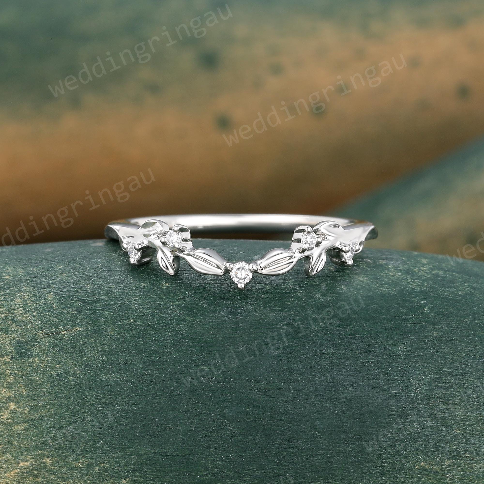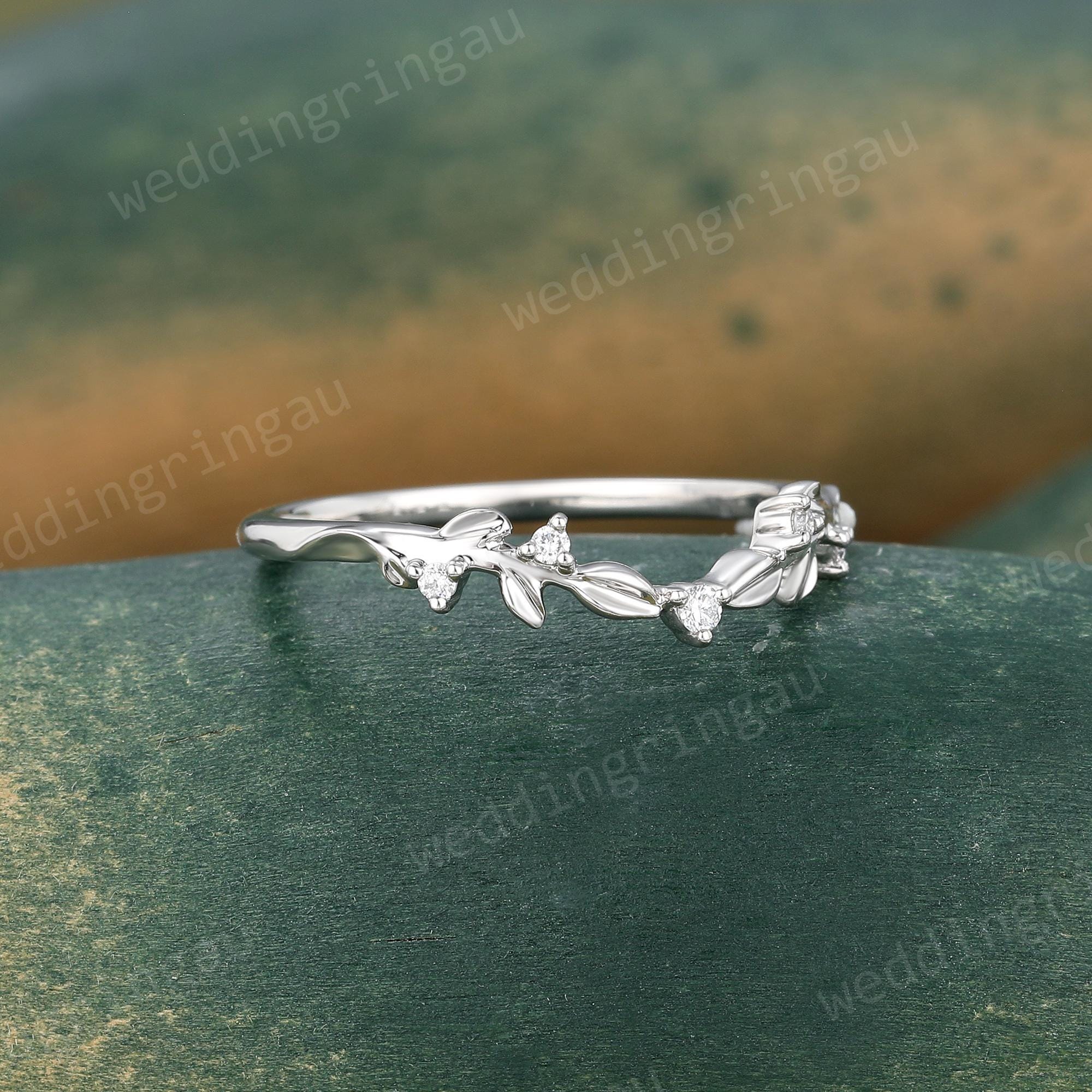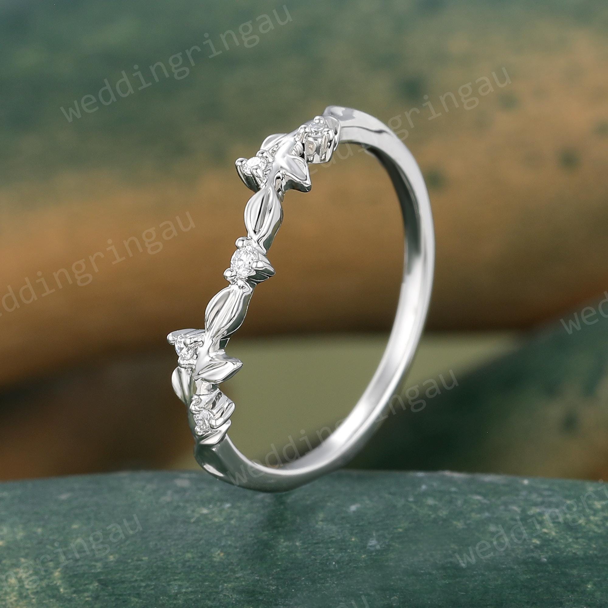 Round Cut Diamond Wedding Band Unique White Gold Moissanite Curved Wedding Band Vintage Art deco Leaf Bridal Stackable Matching Ring