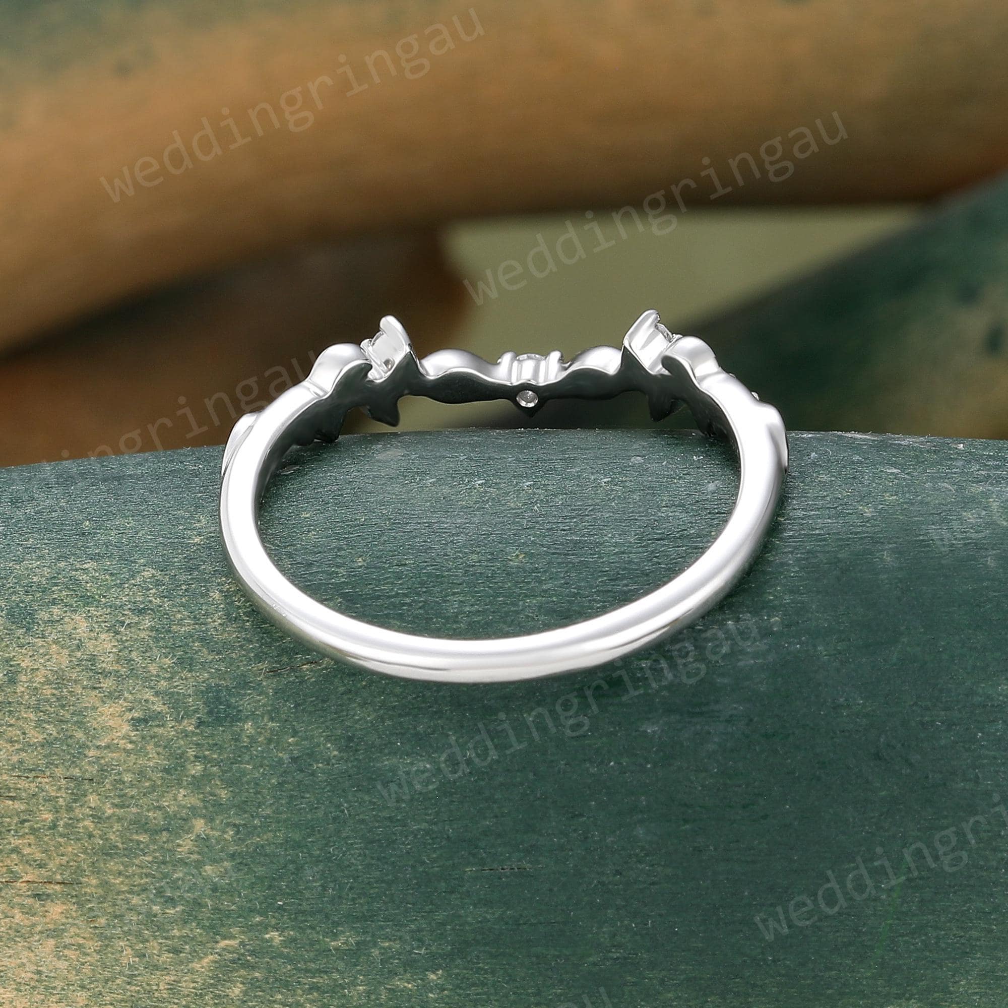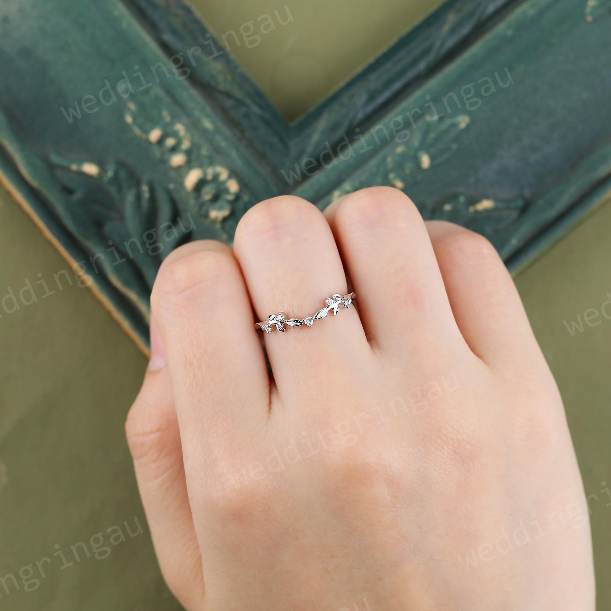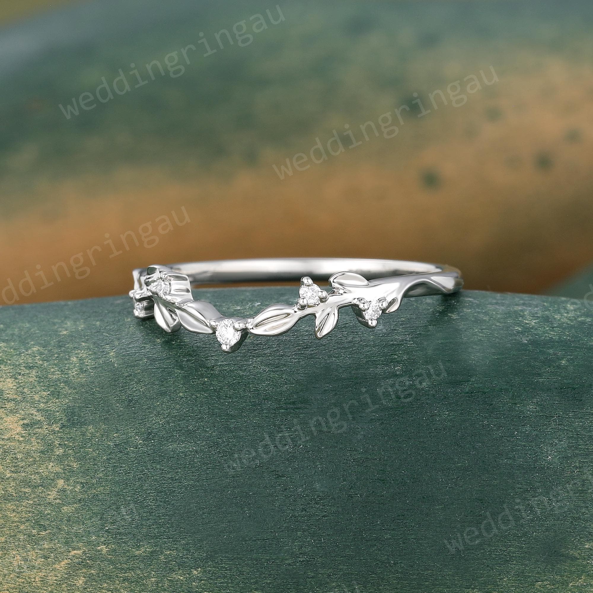 Round Cut Diamond Wedding Band Unique White Gold Moissanite Curved Wedding Band Vintage Art deco Leaf Bridal Stackable Matching Ring