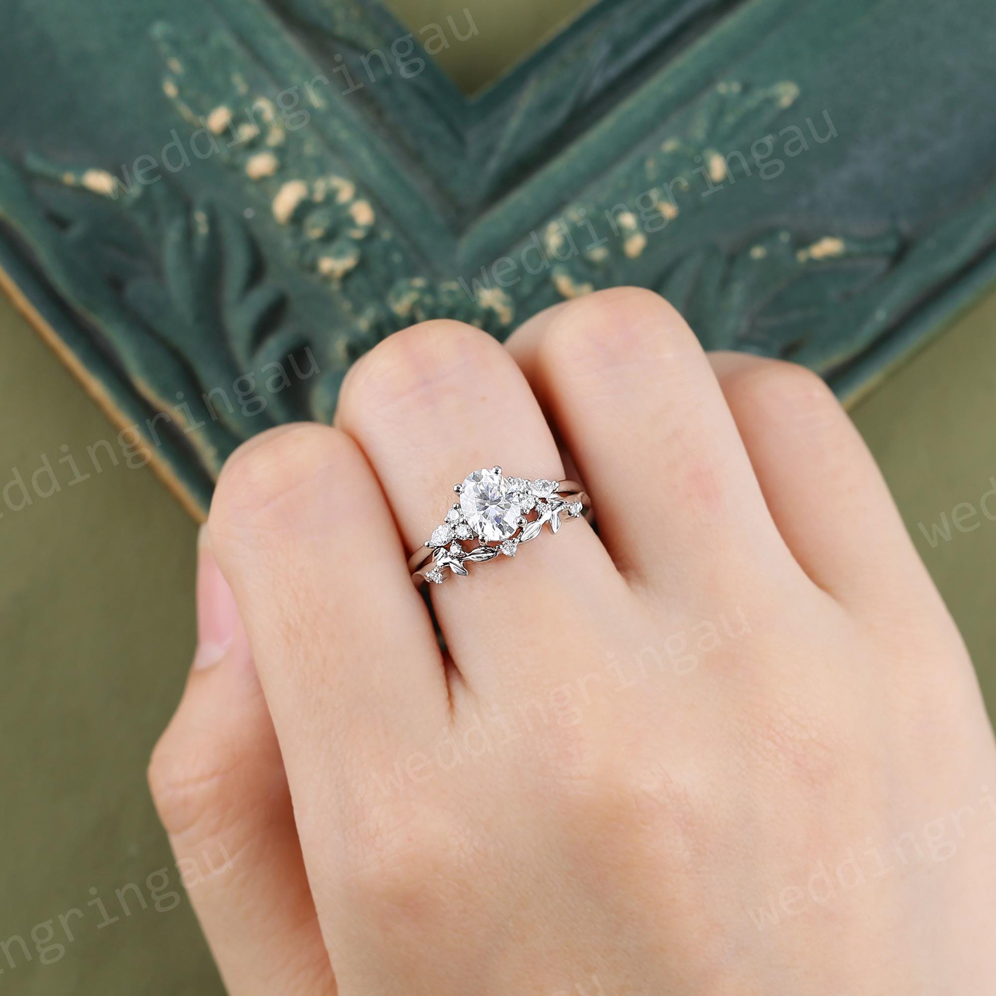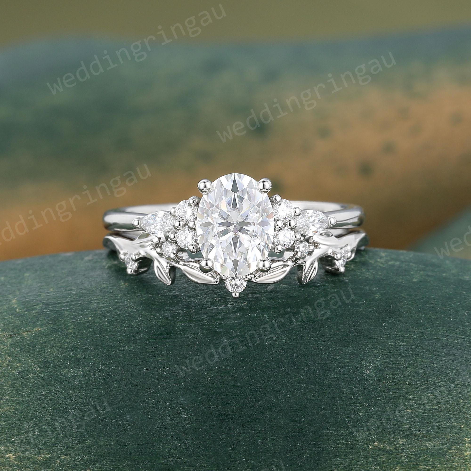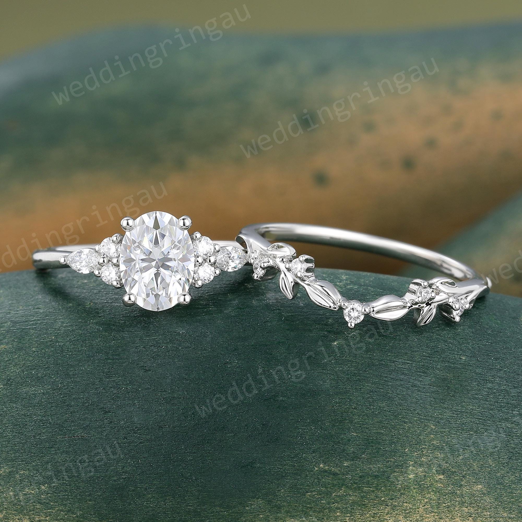 Oval Cut Moissanite Engagement Ring Set Unique White Gold Diamond Bridal Ring Set Round Leaf Wedding Band Art Deco Promise Anniversary Ring
