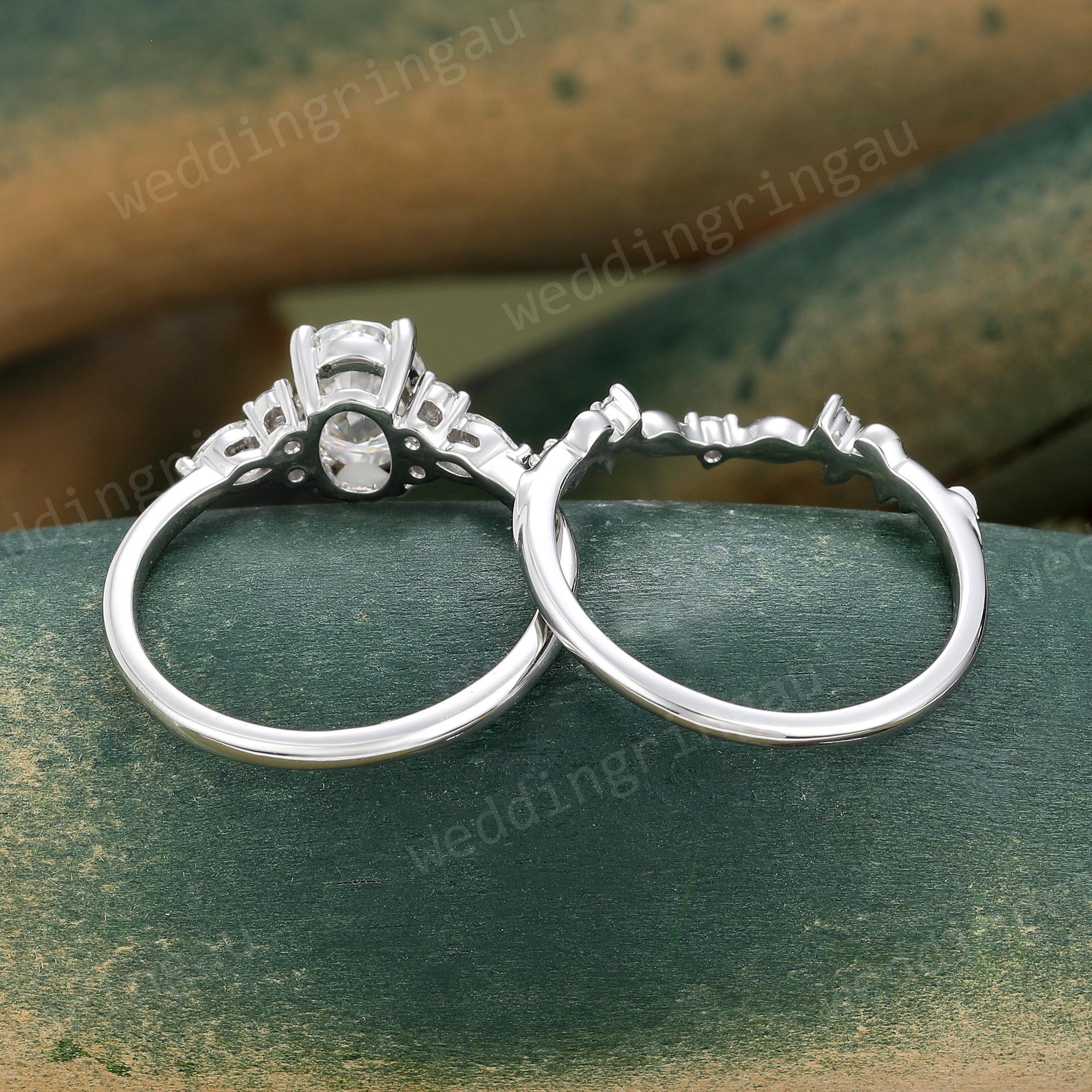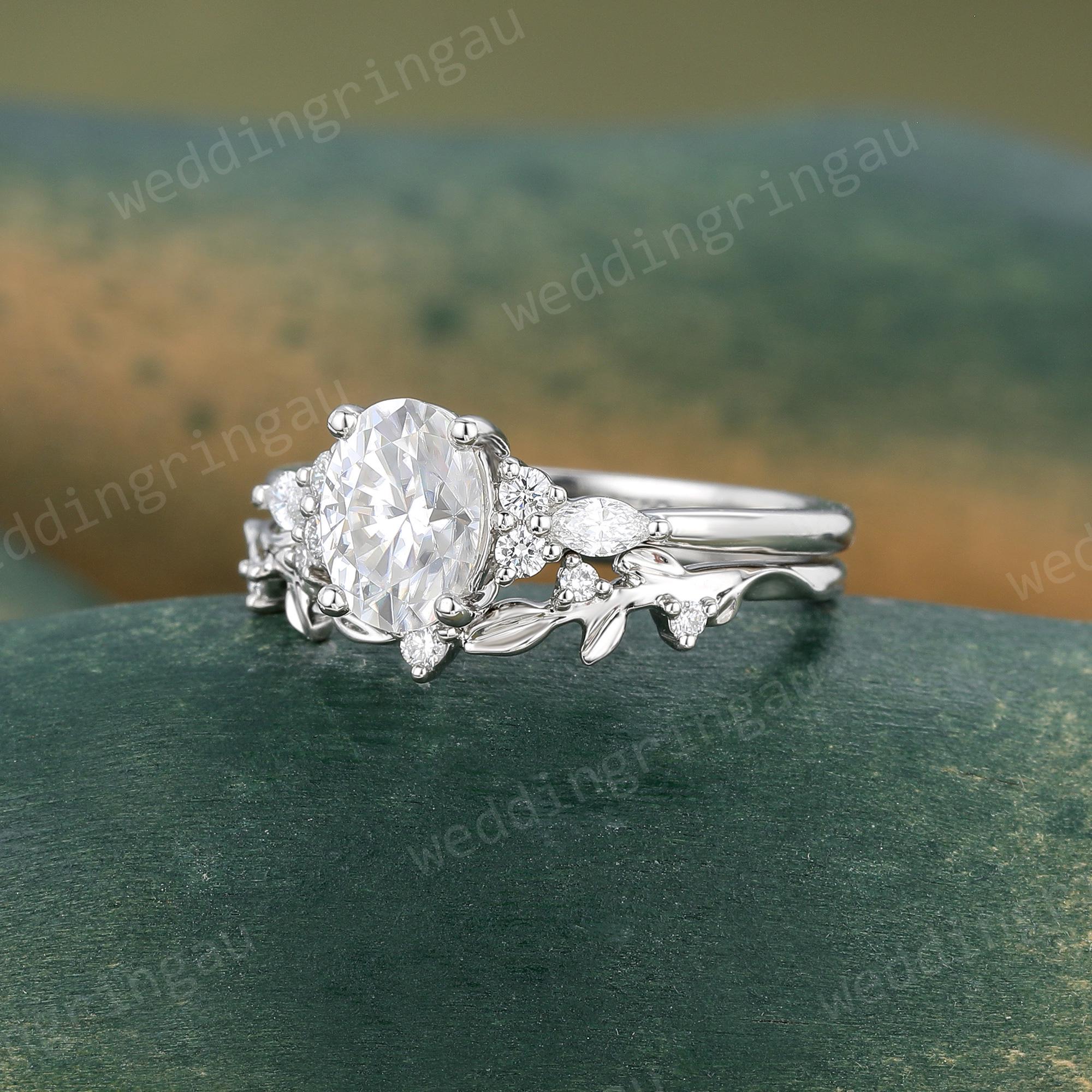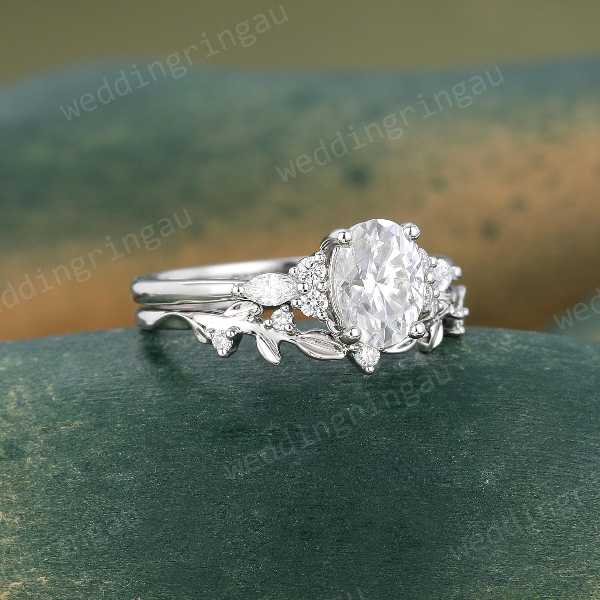 Oval Cut Moissanite Engagement Ring Set Unique White Gold Diamond Bridal Ring Set Round Leaf Wedding Band Art Deco Promise Anniversary Ring