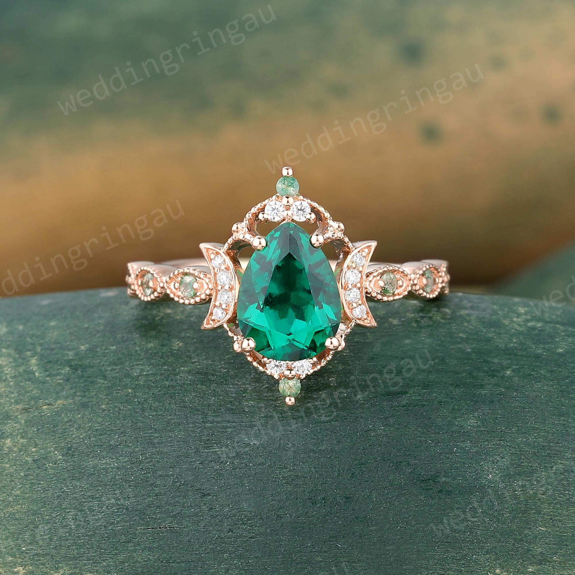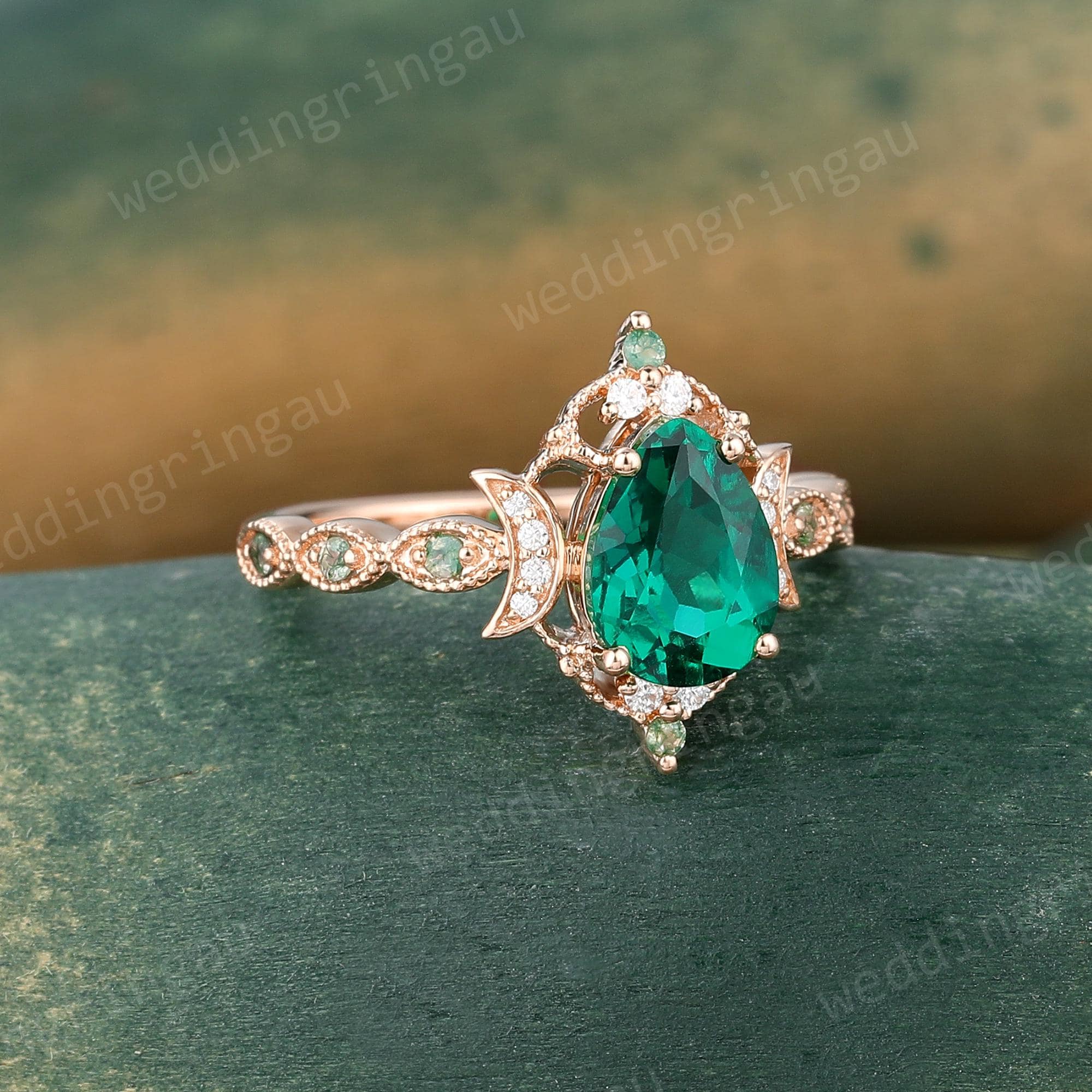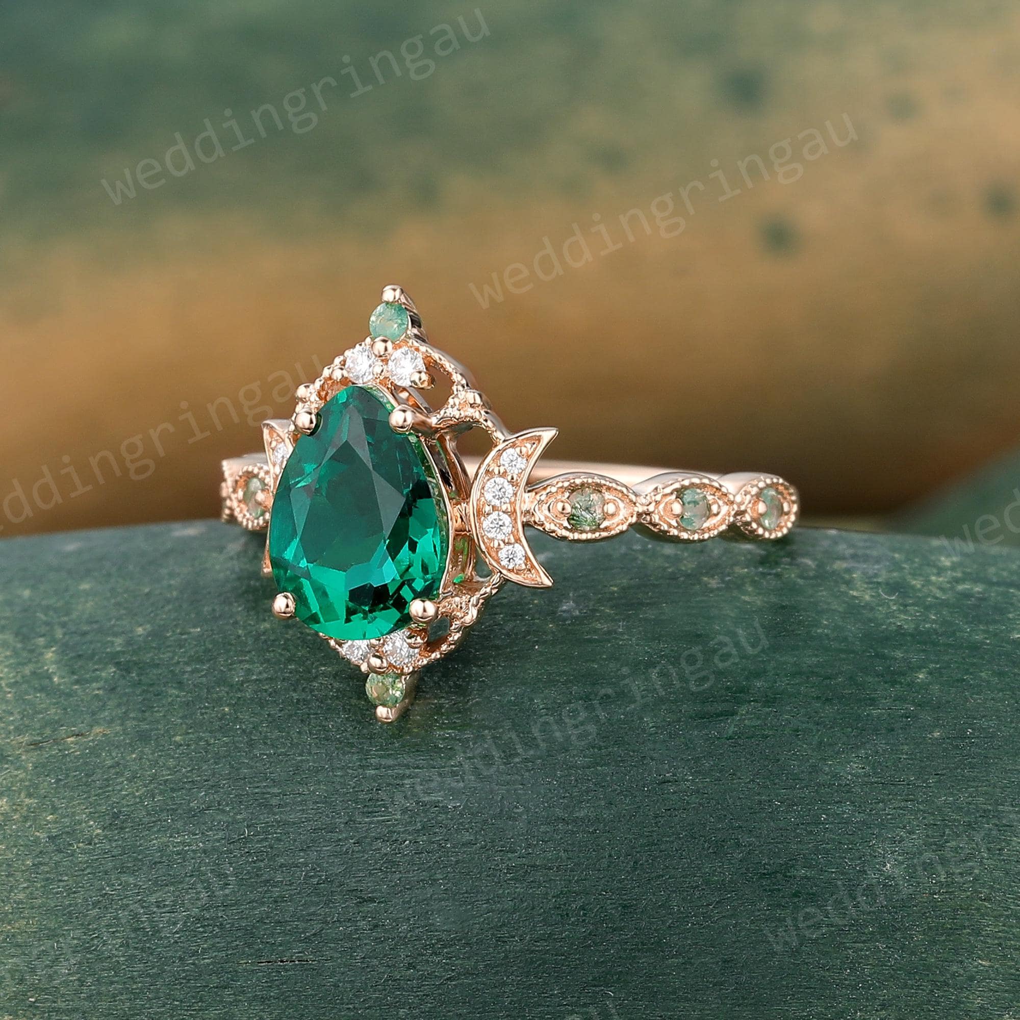 Pear Shaped Emerald Engagement Ring Rose Gold Milgrain Round Moss Agate Star Moon Moissanite Wedding Bridal Promise Anniversary Ring