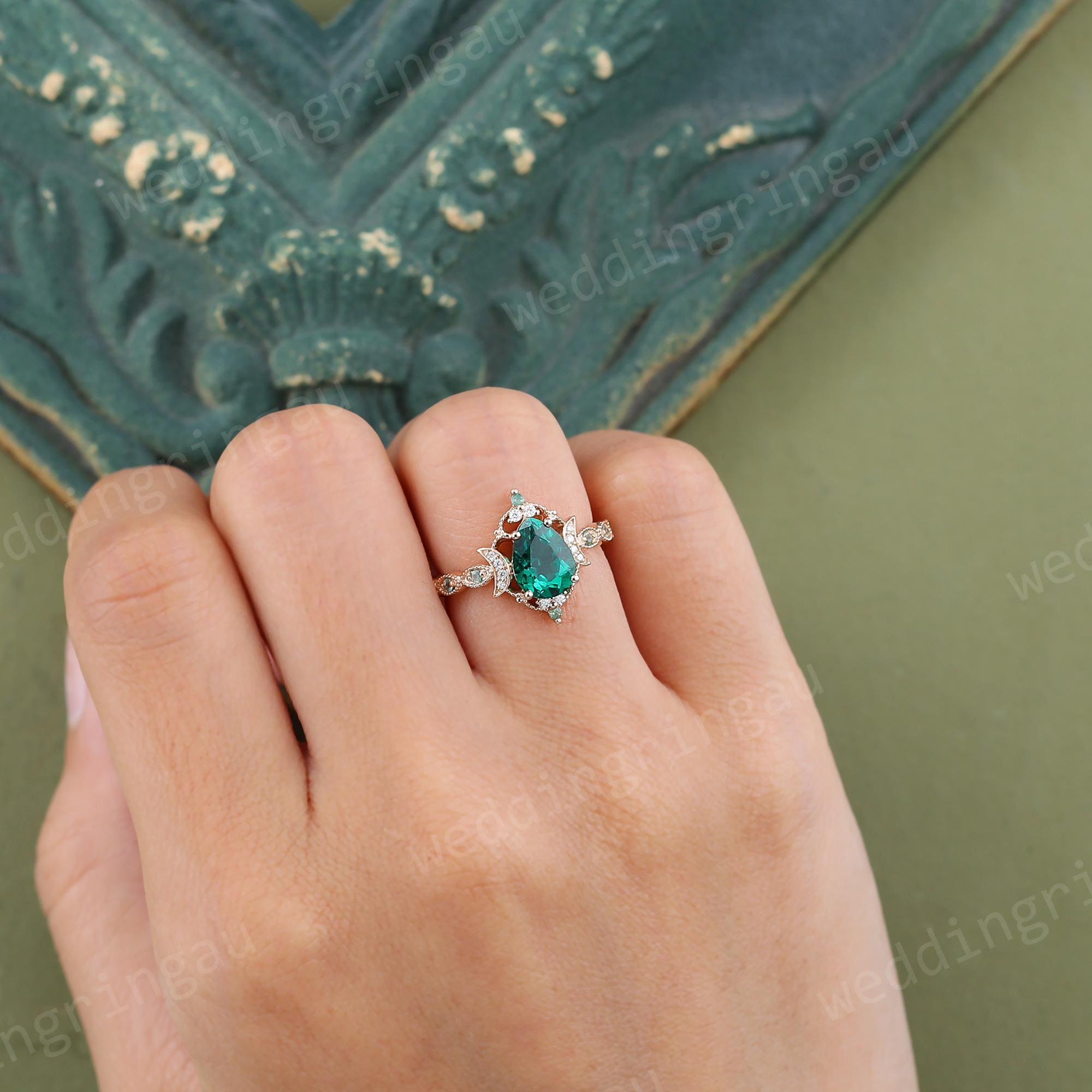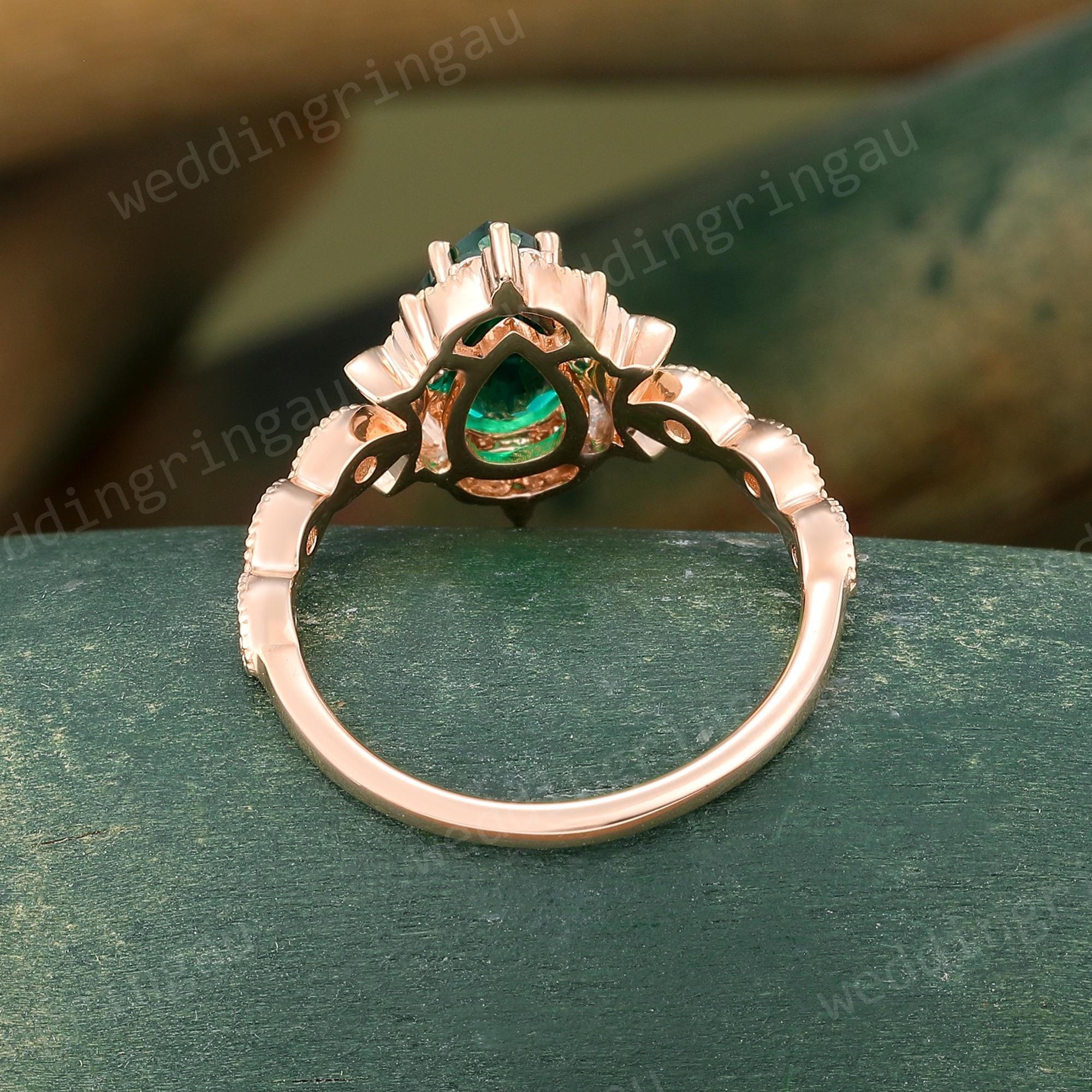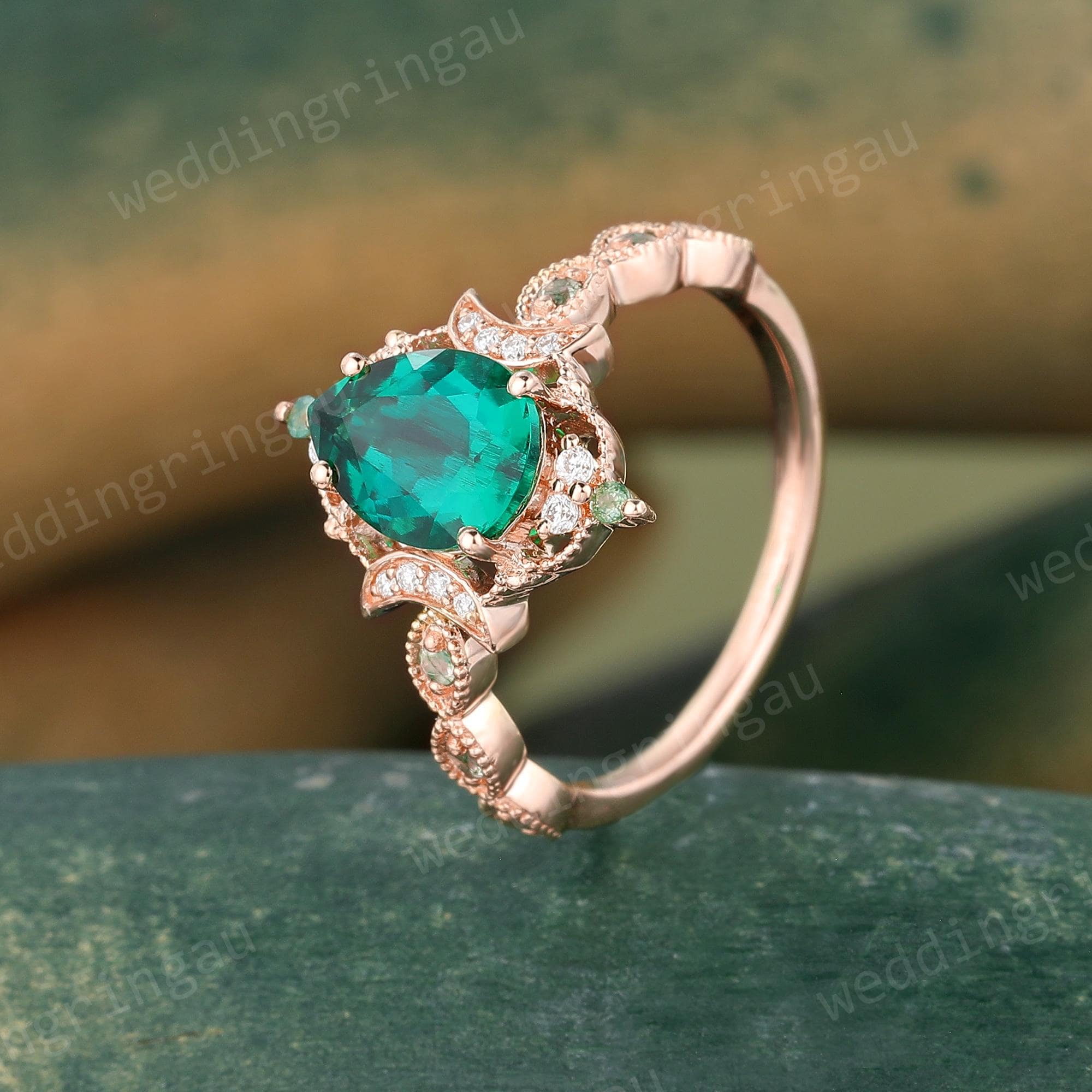 Pear Shaped Emerald Engagement Ring Rose Gold Milgrain Round Moss Agate Star Moon Moissanite Wedding Bridal Promise Anniversary Ring