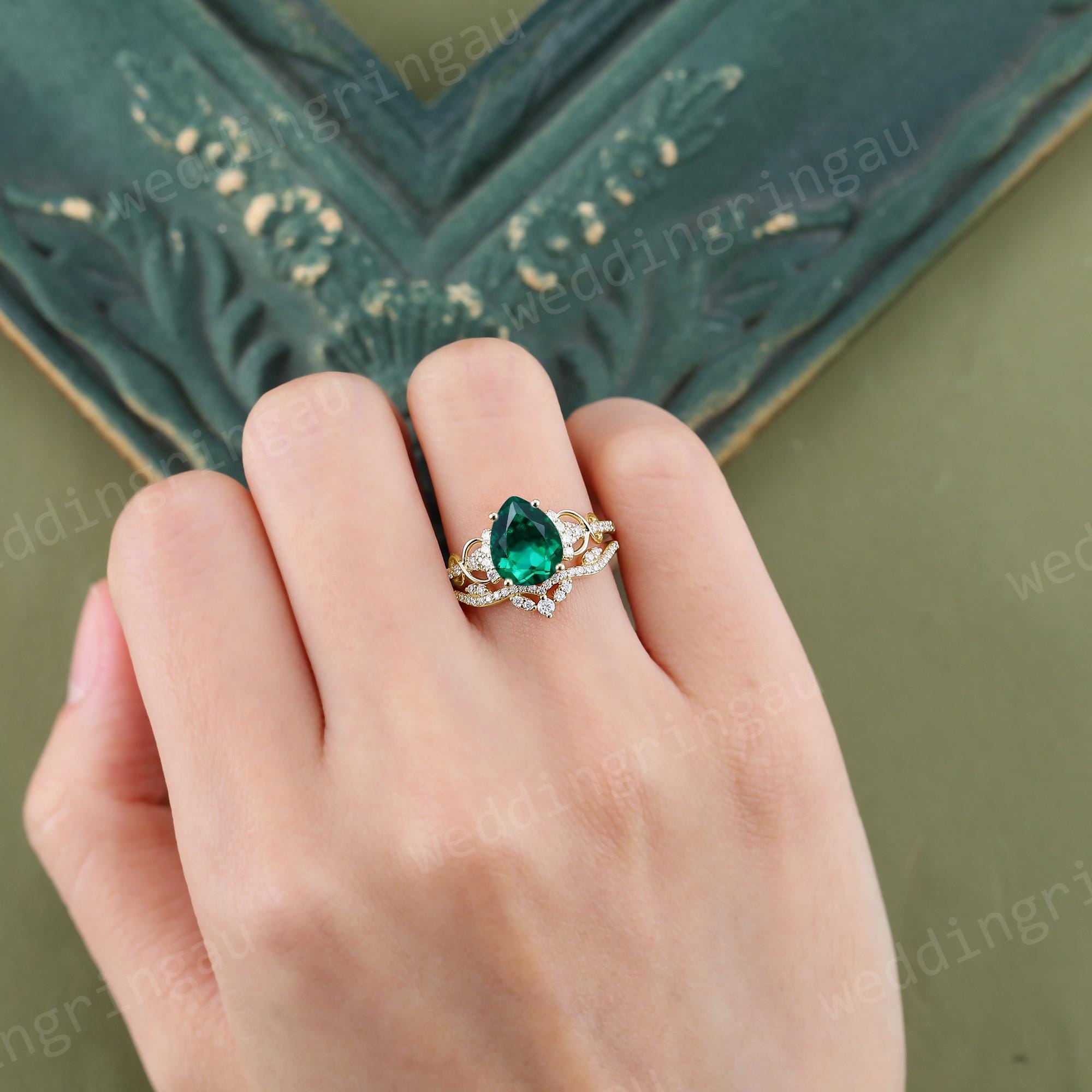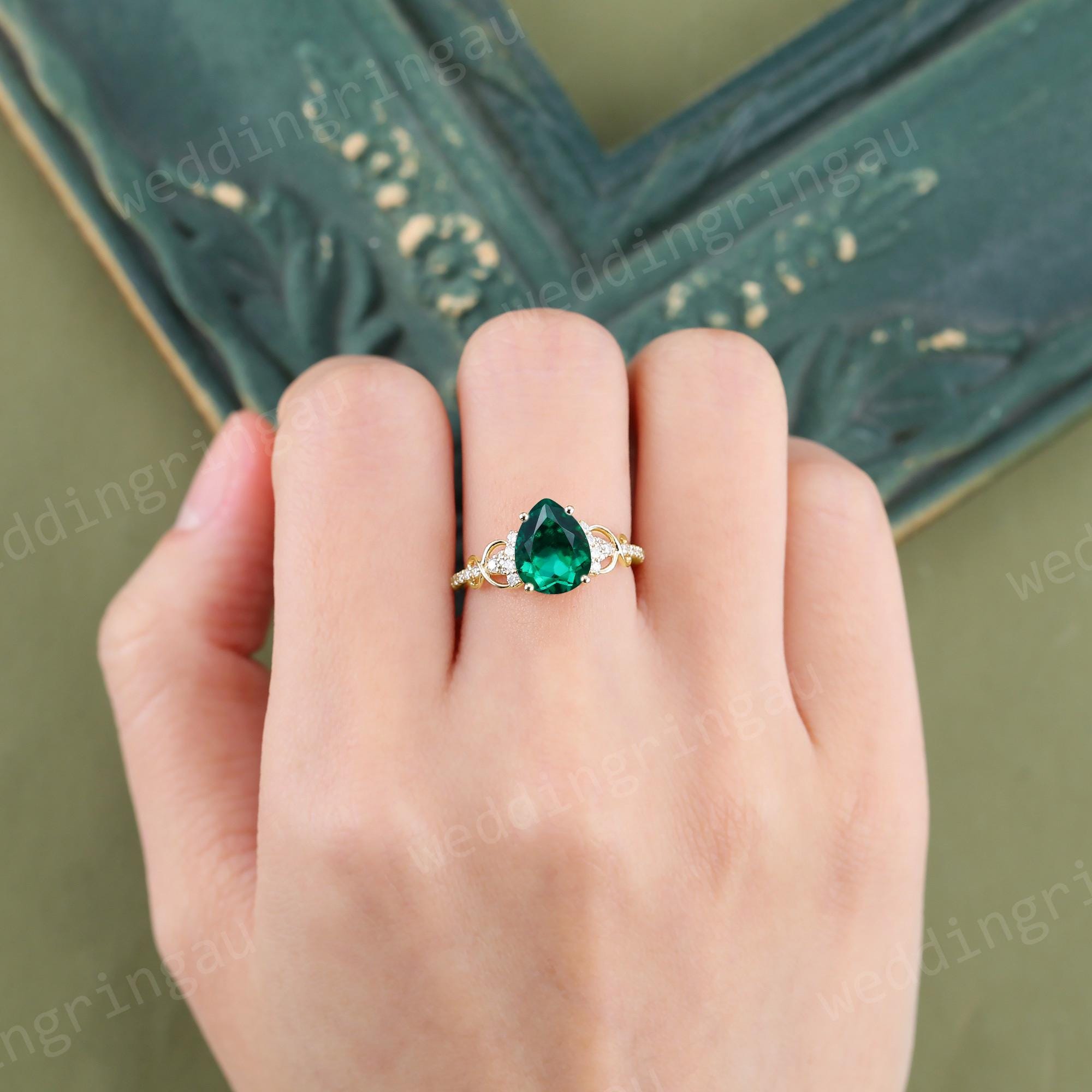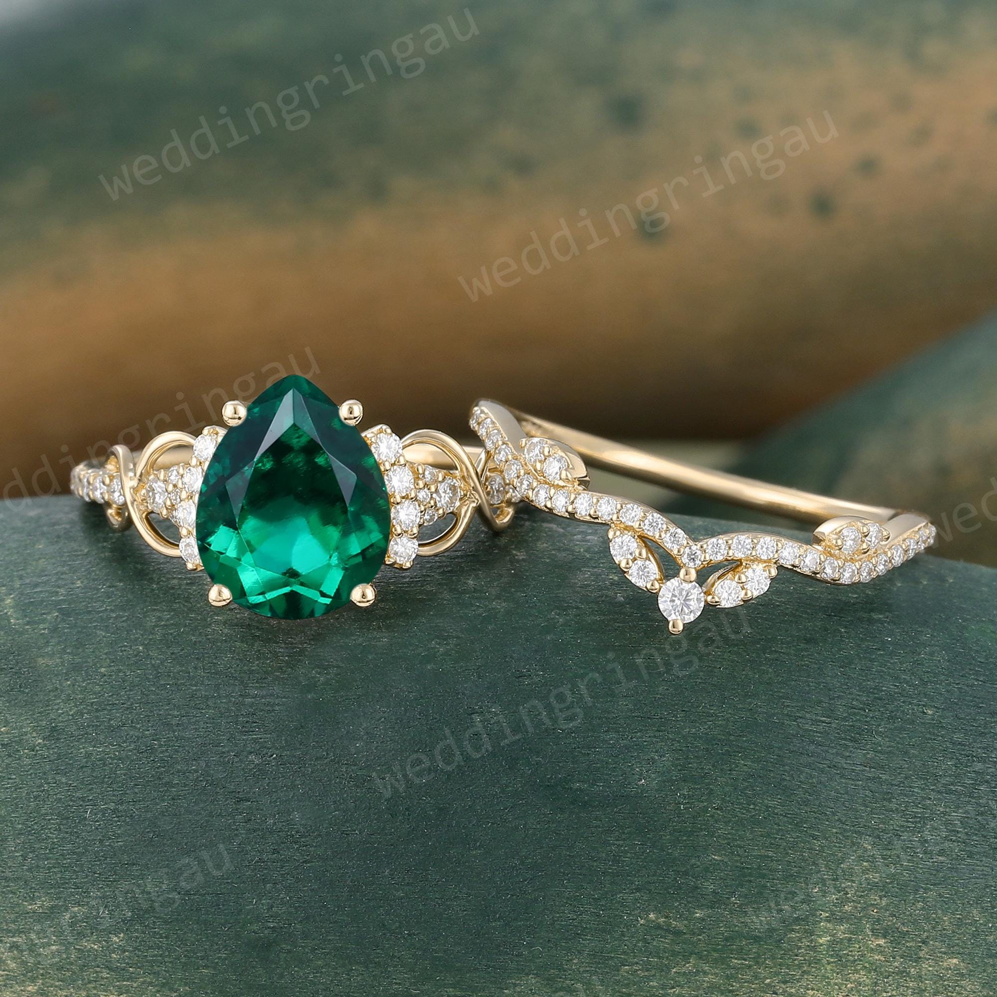 Pear Shaped Emerald Engagement Ring Set Vintage Yellow Gold Round Diamond Infinity Twist Ring Set Wedding Bridal Promise Anniversary Ring