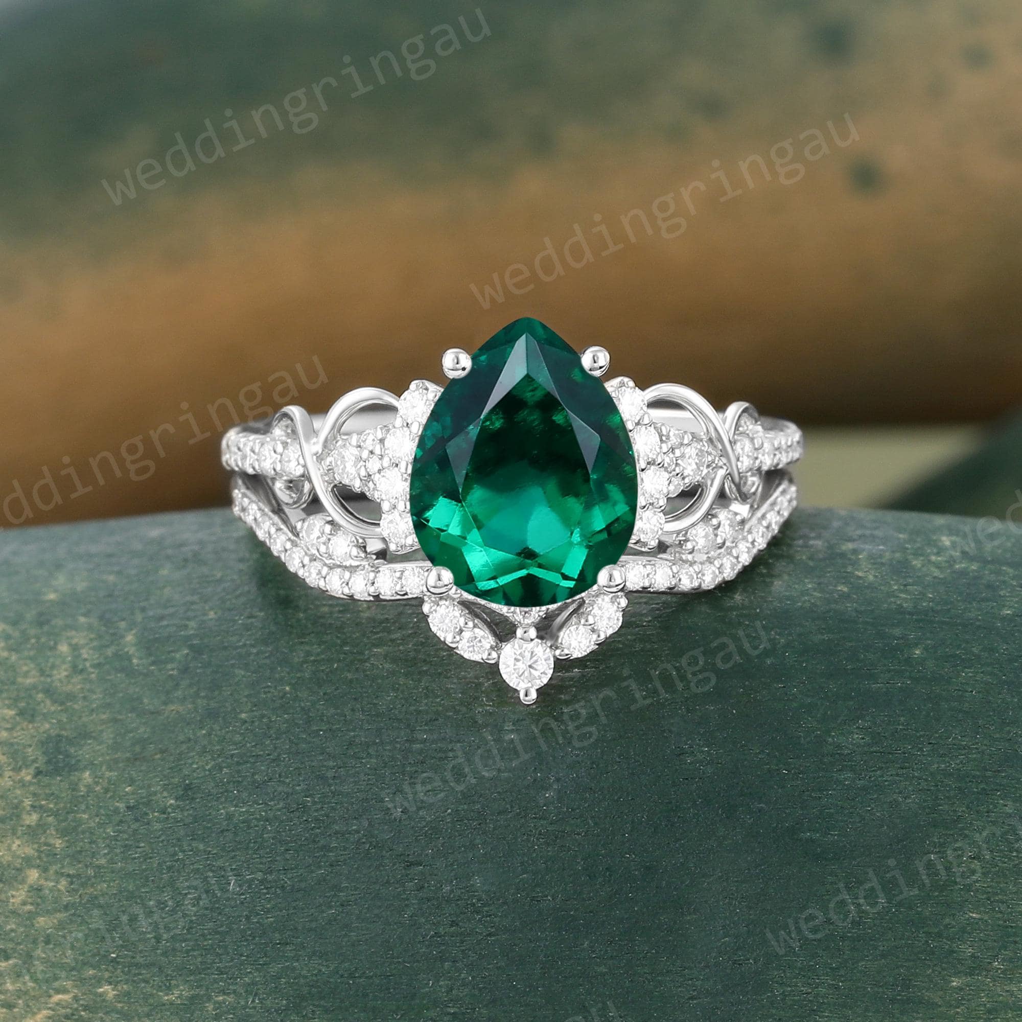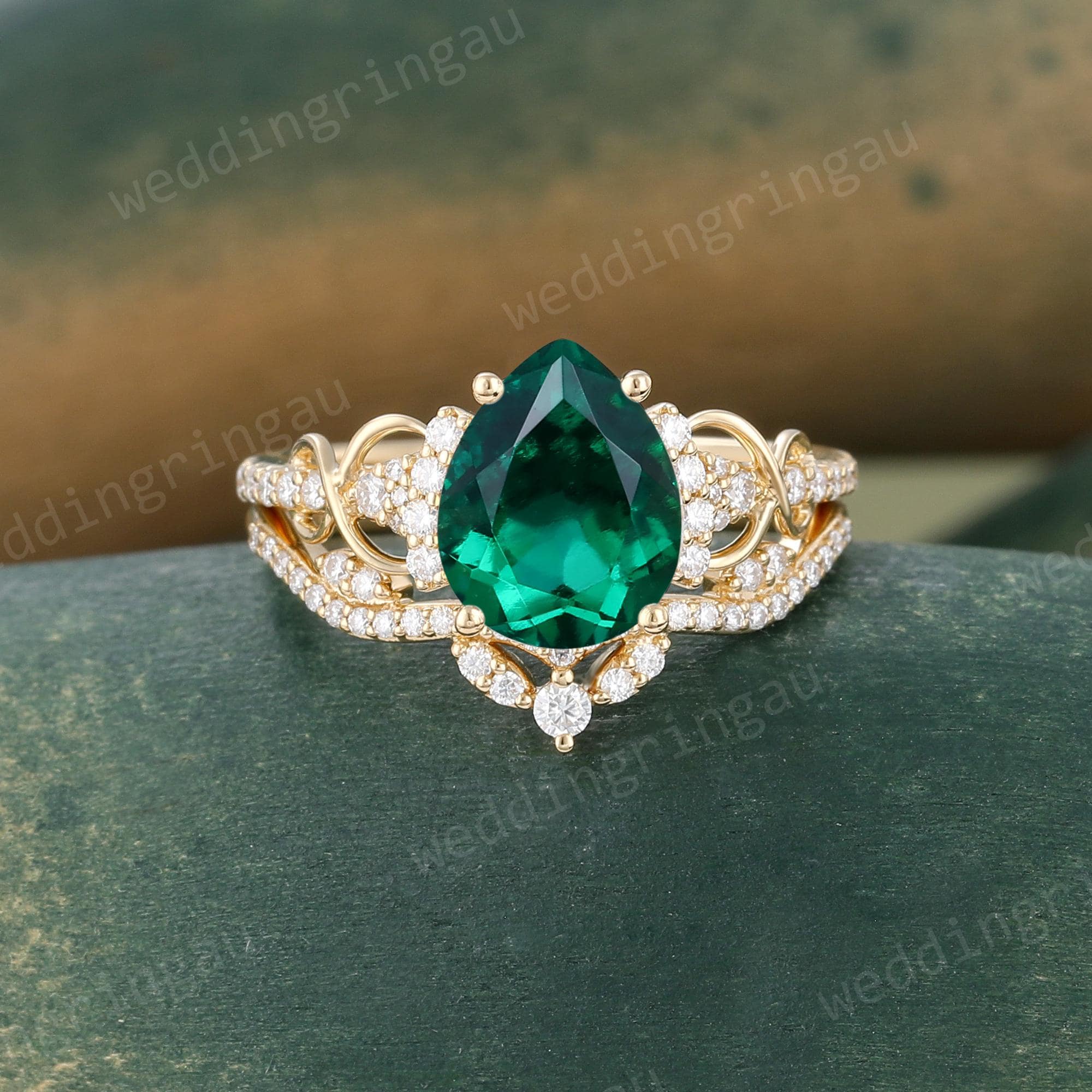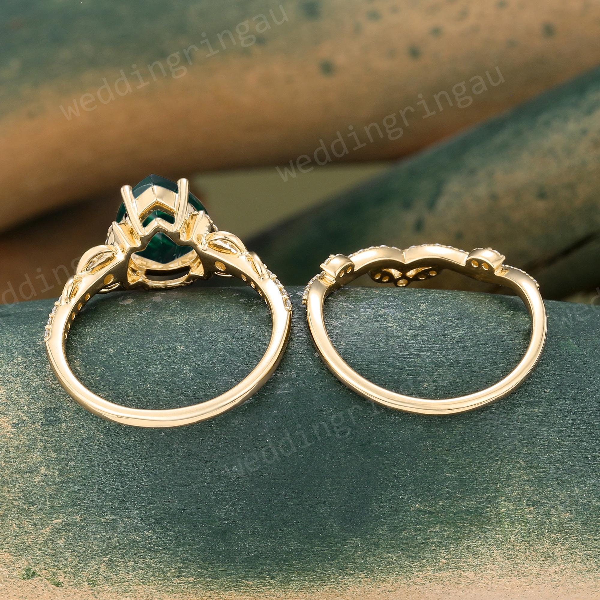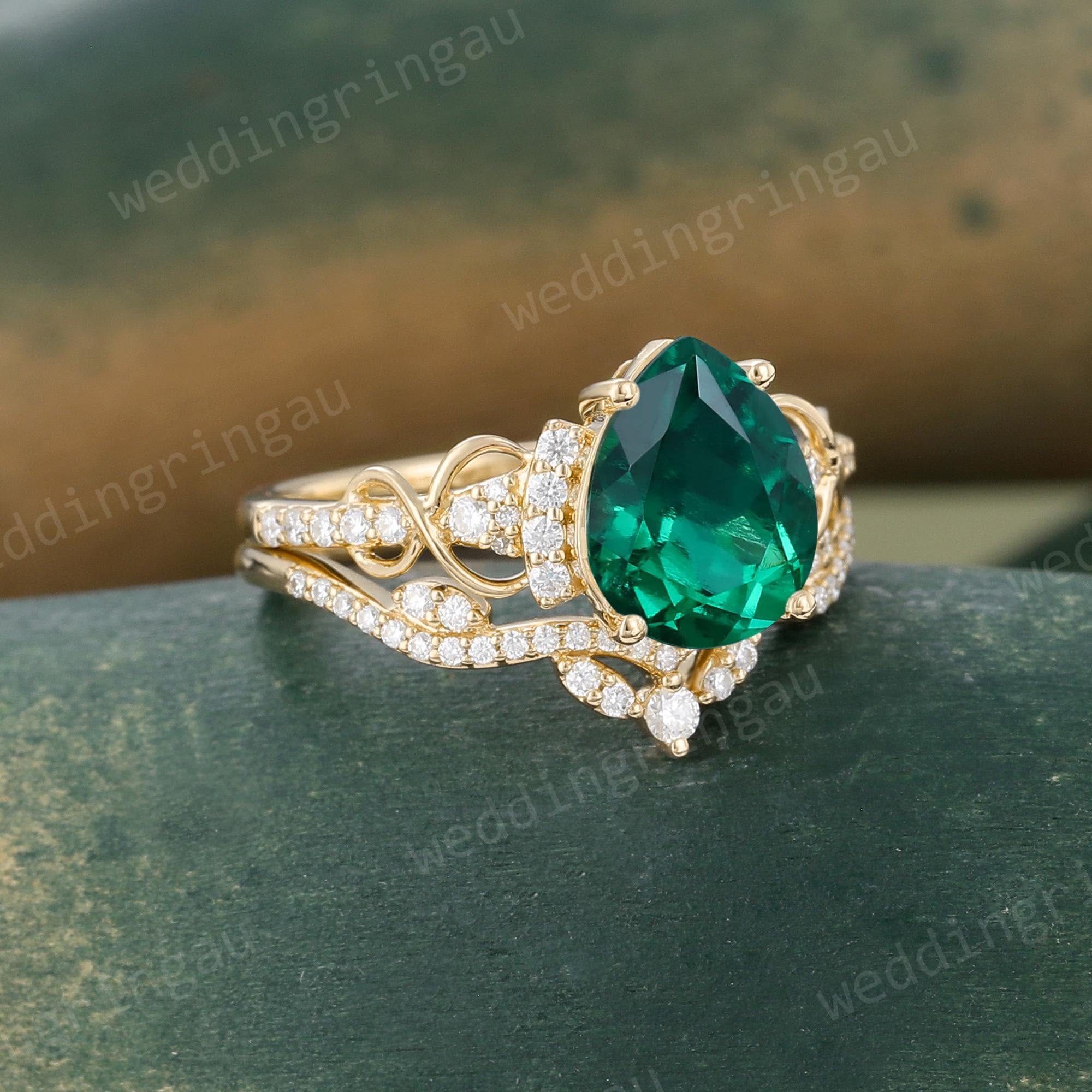 Pear Shaped Emerald Engagement Ring Set Vintage Yellow Gold Round Diamond Infinity Twist Ring Set Wedding Bridal Promise Anniversary Ring