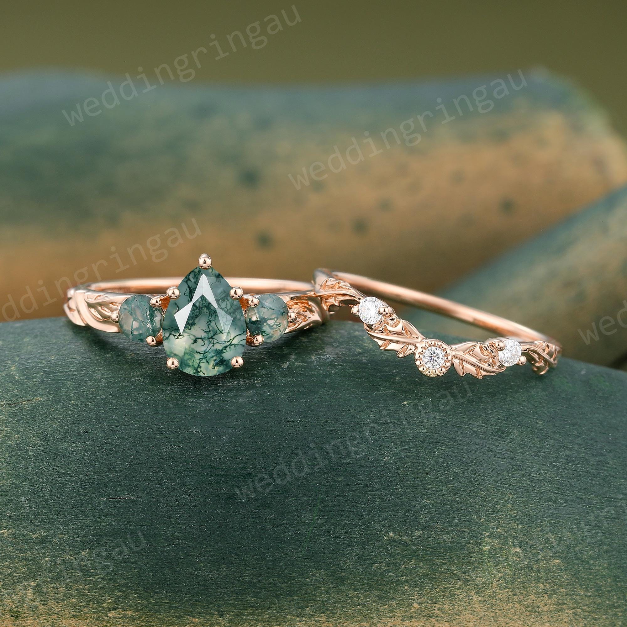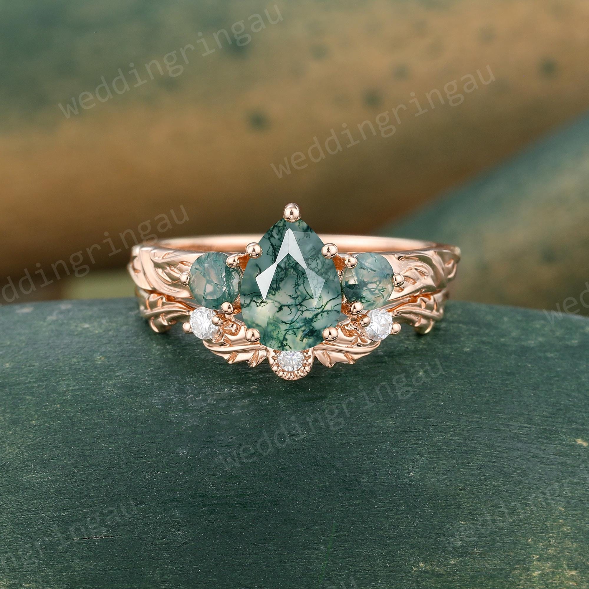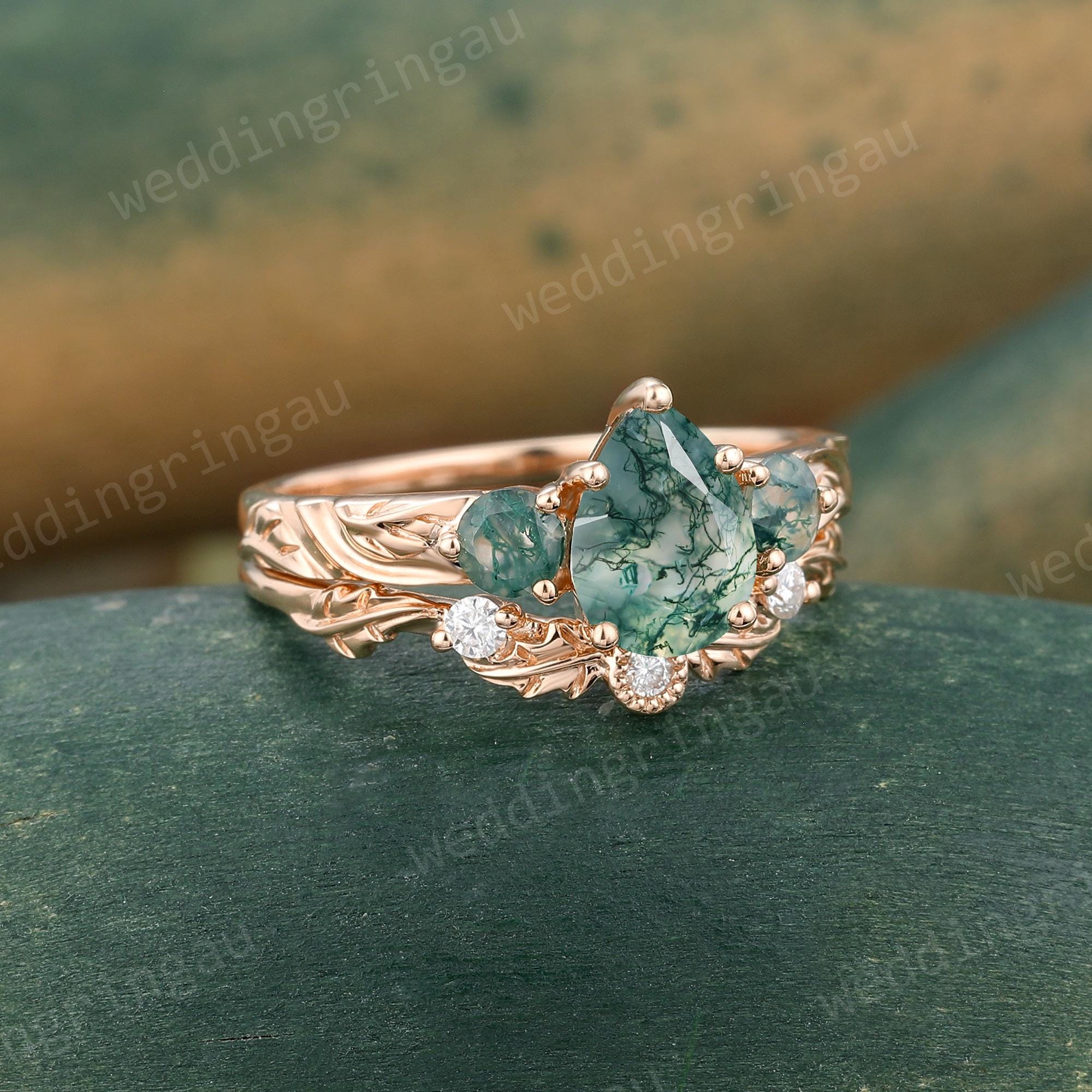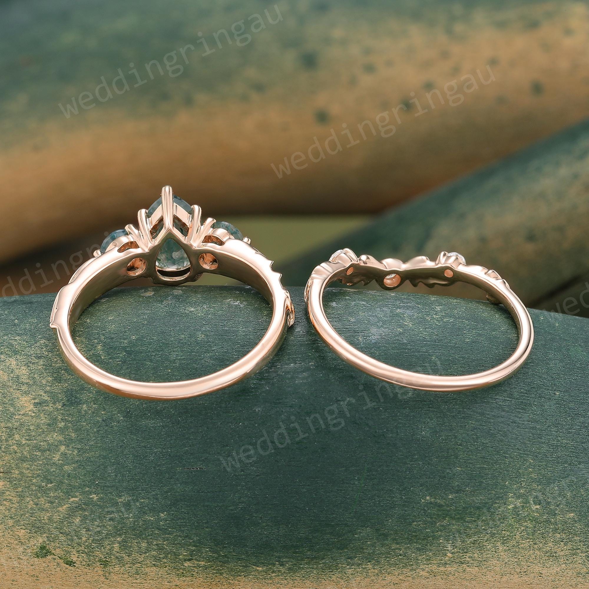 Pear Shaped Moss Agate Engagement Ring Set Rose Gold Round Diamond Ring Unique Leaf Three Stone Wedding Ring Women Promise Ring Set