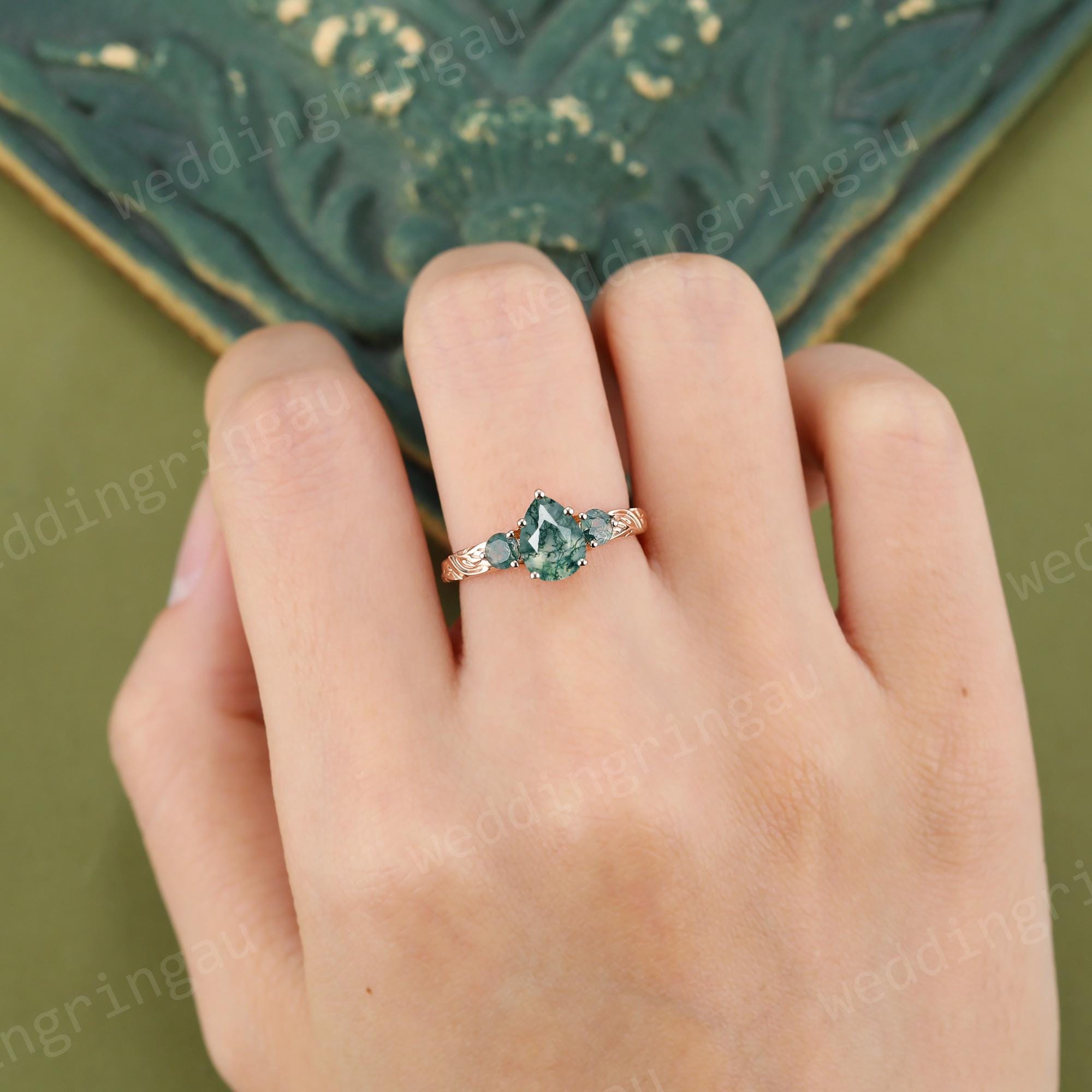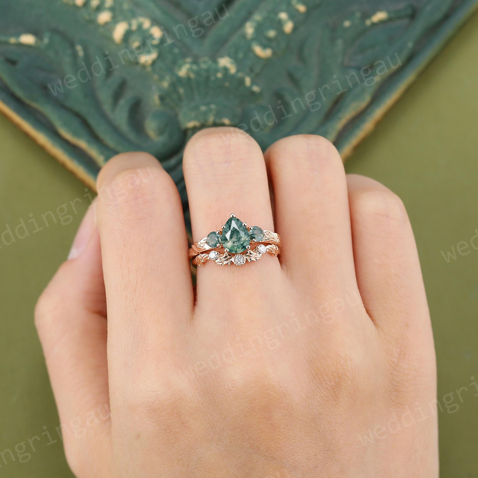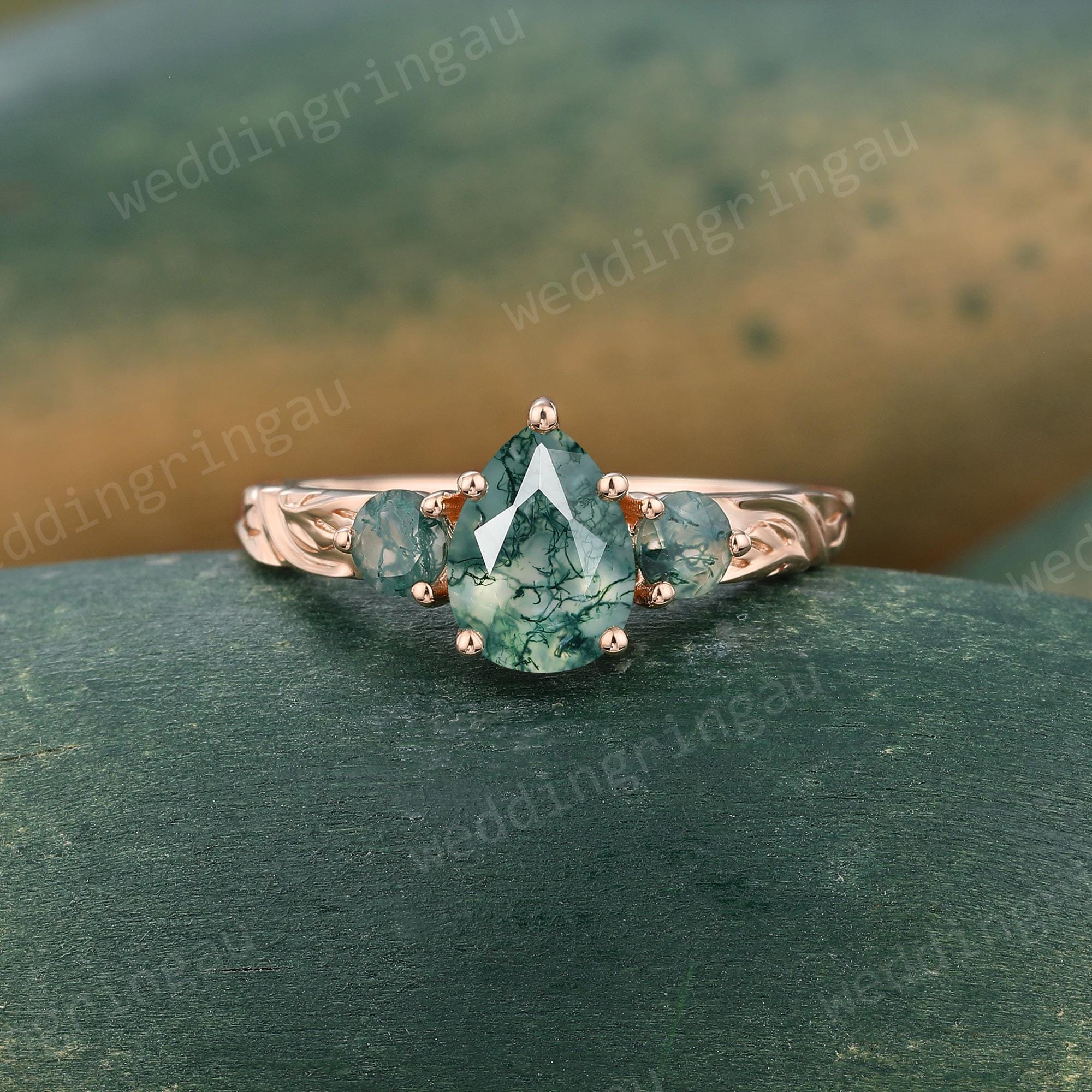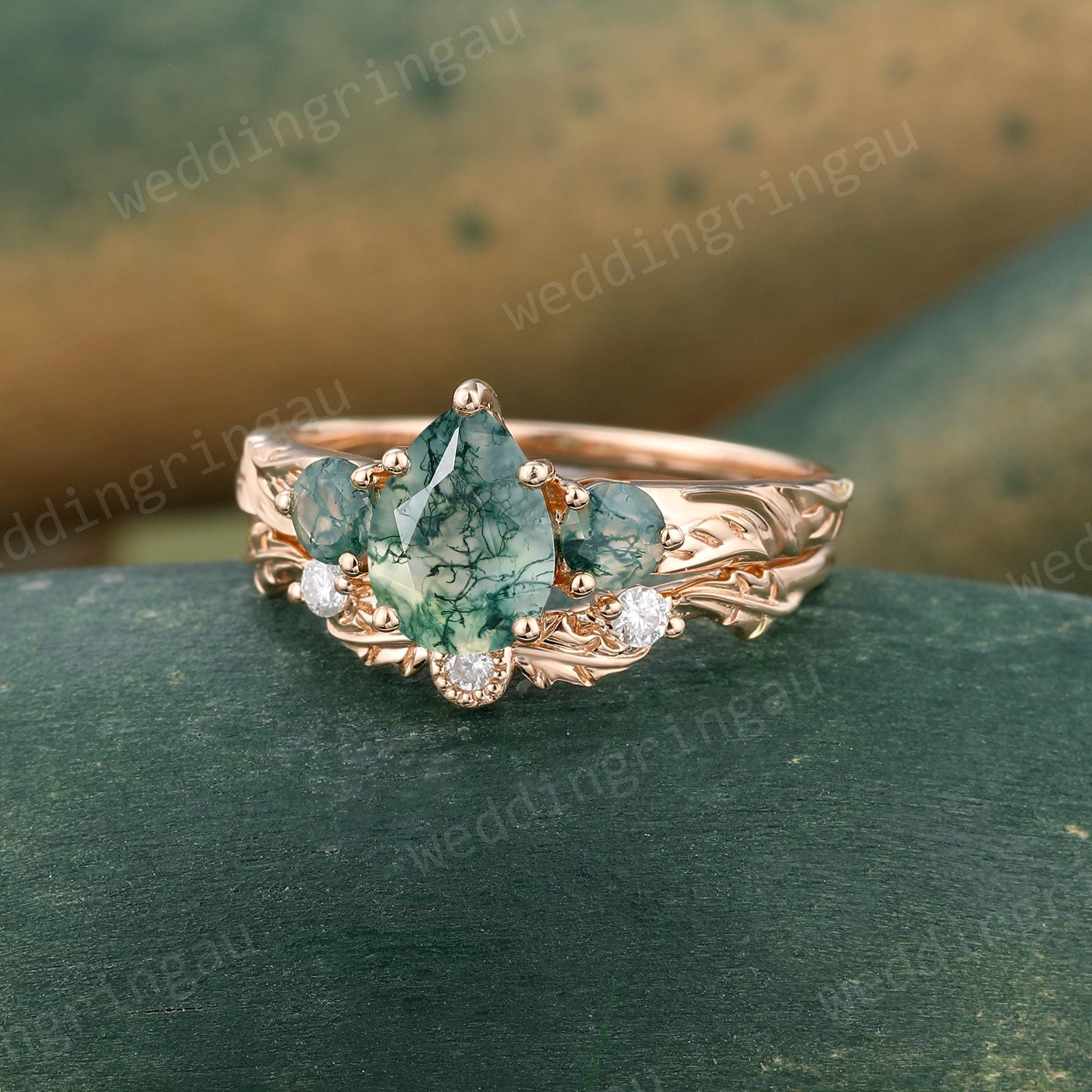 Pear Shaped Moss Agate Engagement Ring Set Rose Gold Round Diamond Ring Unique Leaf Three Stone Wedding Ring Women Promise Ring Set