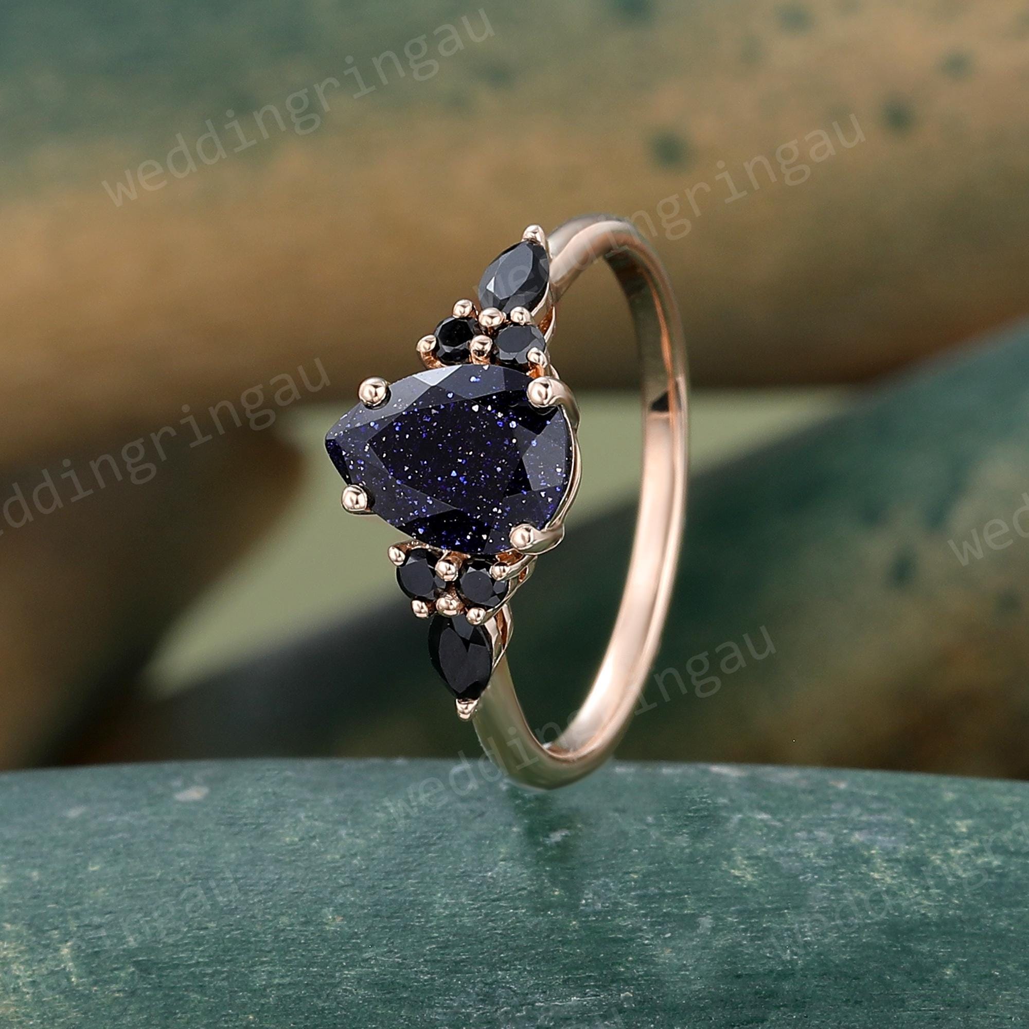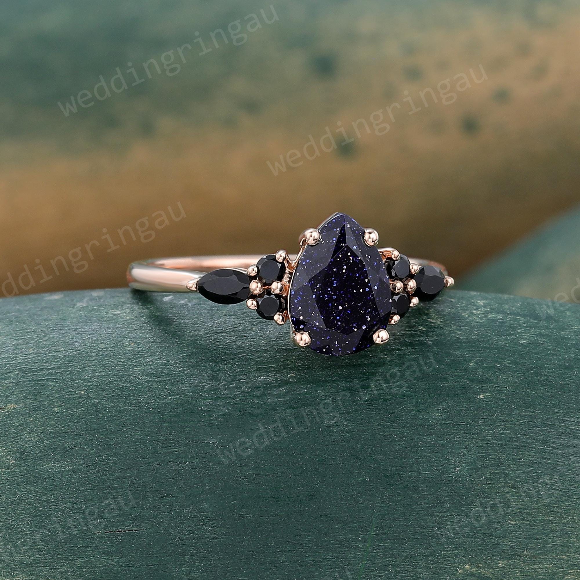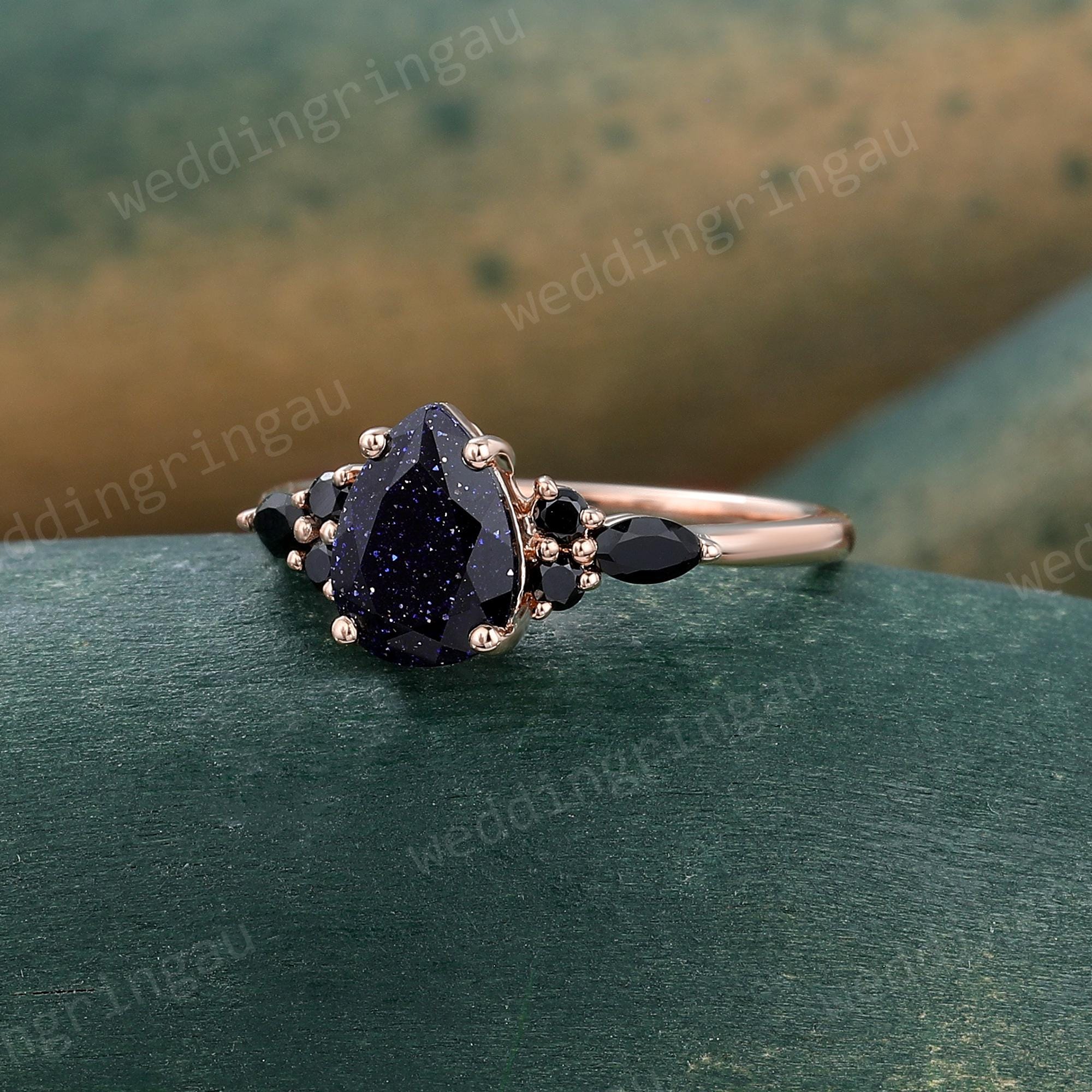 Pear Shaped Blue Sandstone Engagement Ring Rose Gold Round Black Onyx Ring Unique Art Deco Wedding Promise Bridal Anniversary Ring