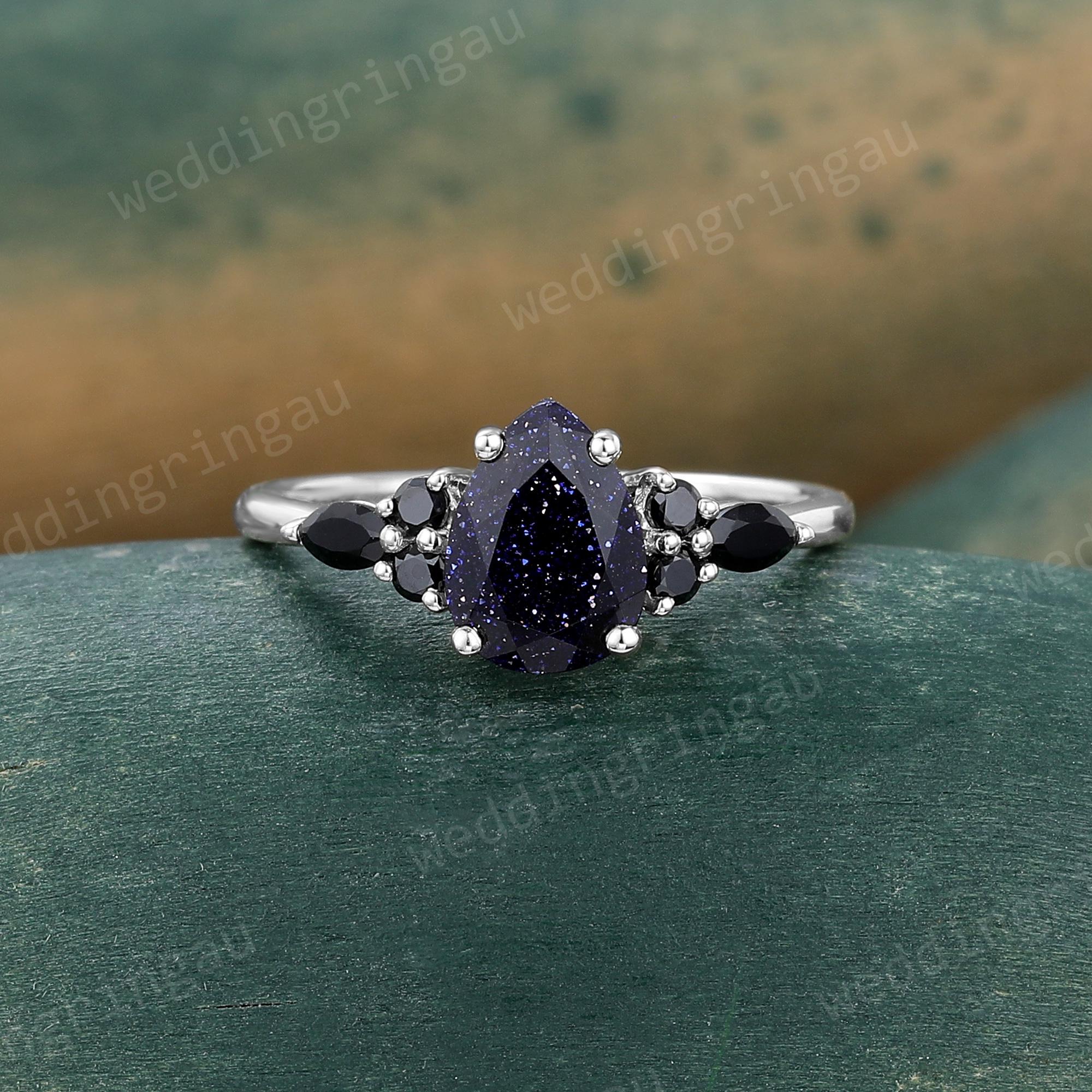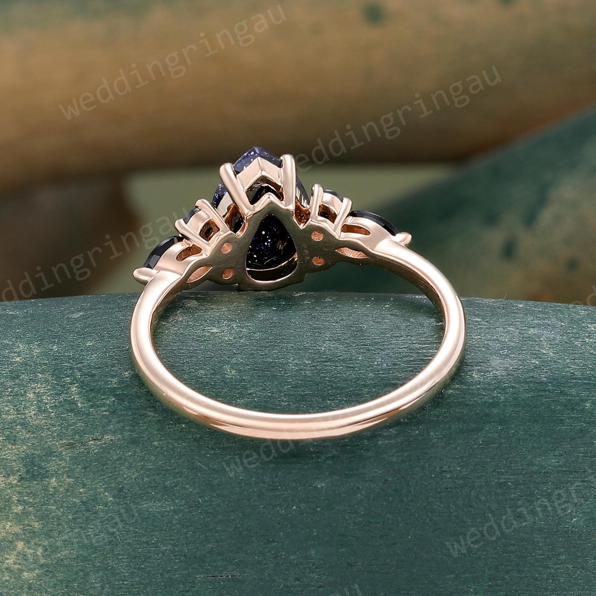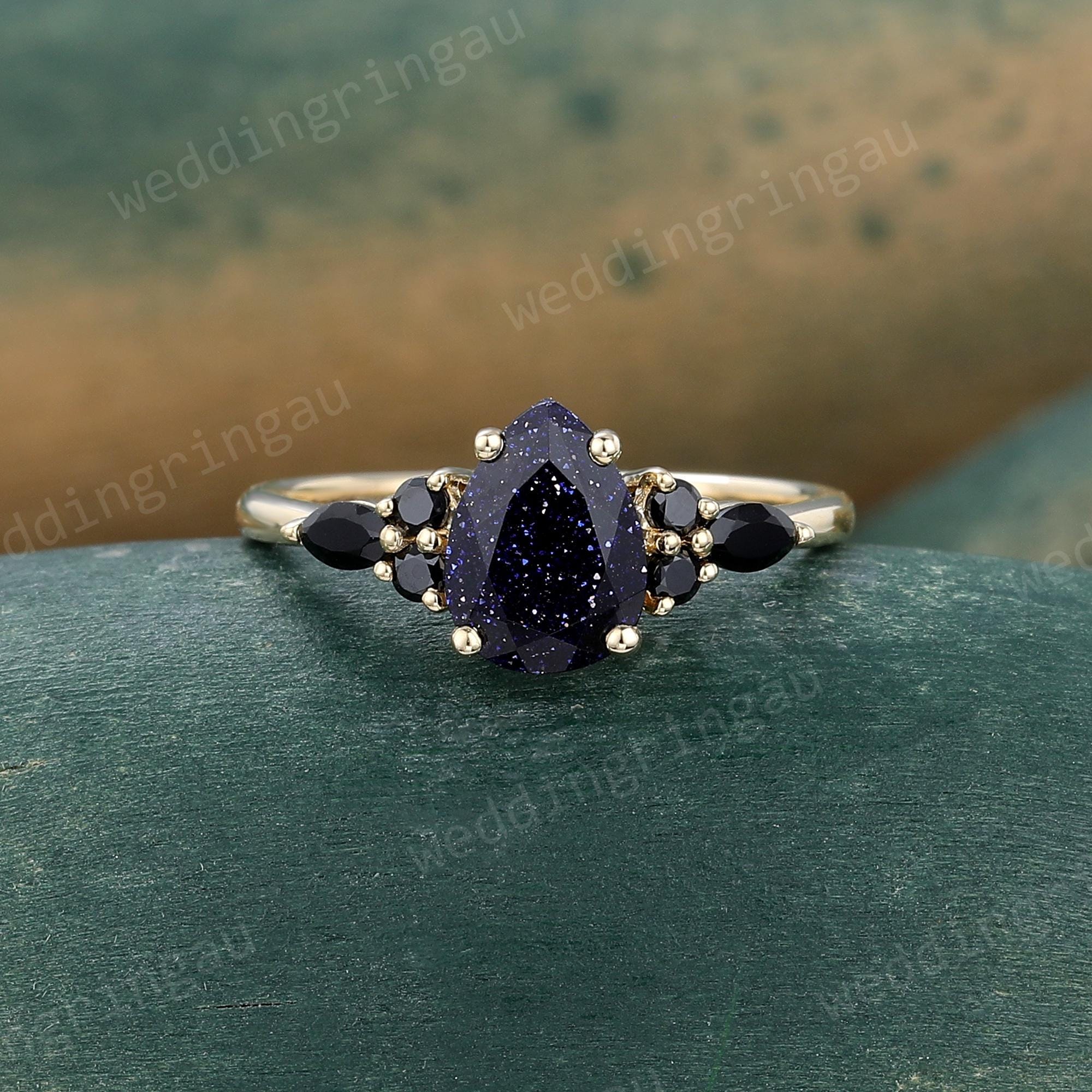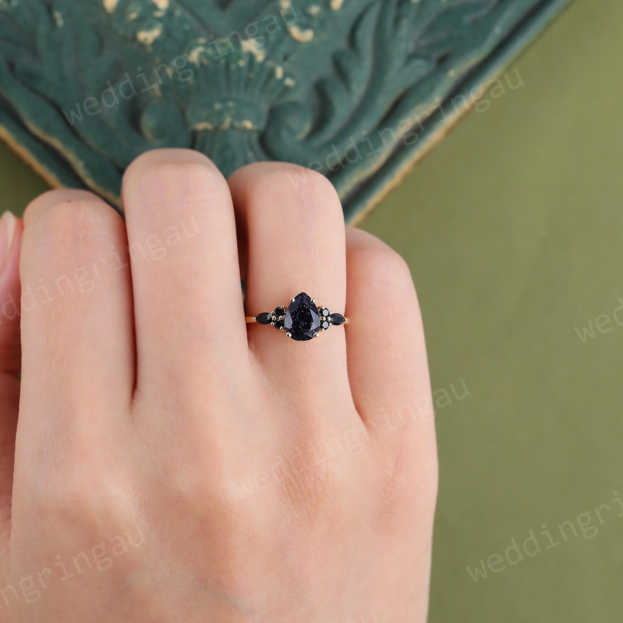Pear Shaped Blue Sandstone Engagement Ring Rose Gold Round Black Onyx Ring Unique Art Deco Wedding Promise Bridal Anniversary Ring