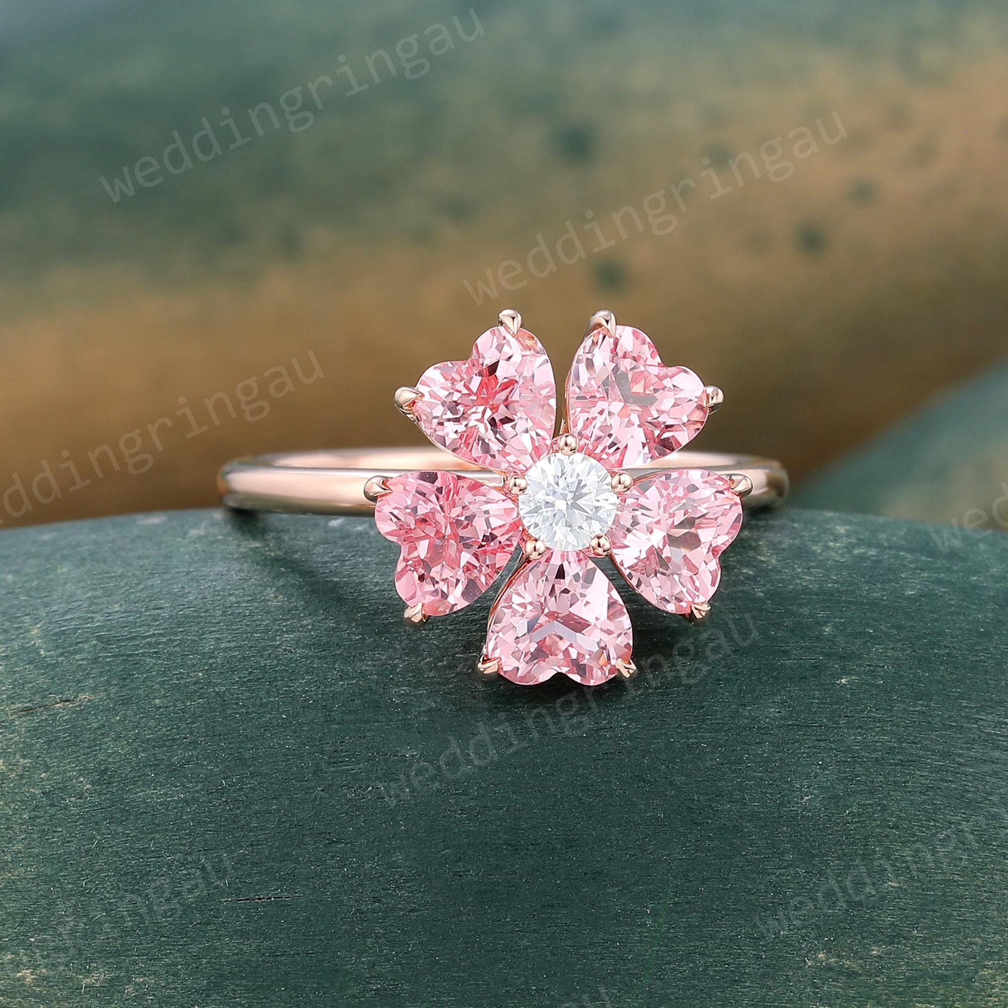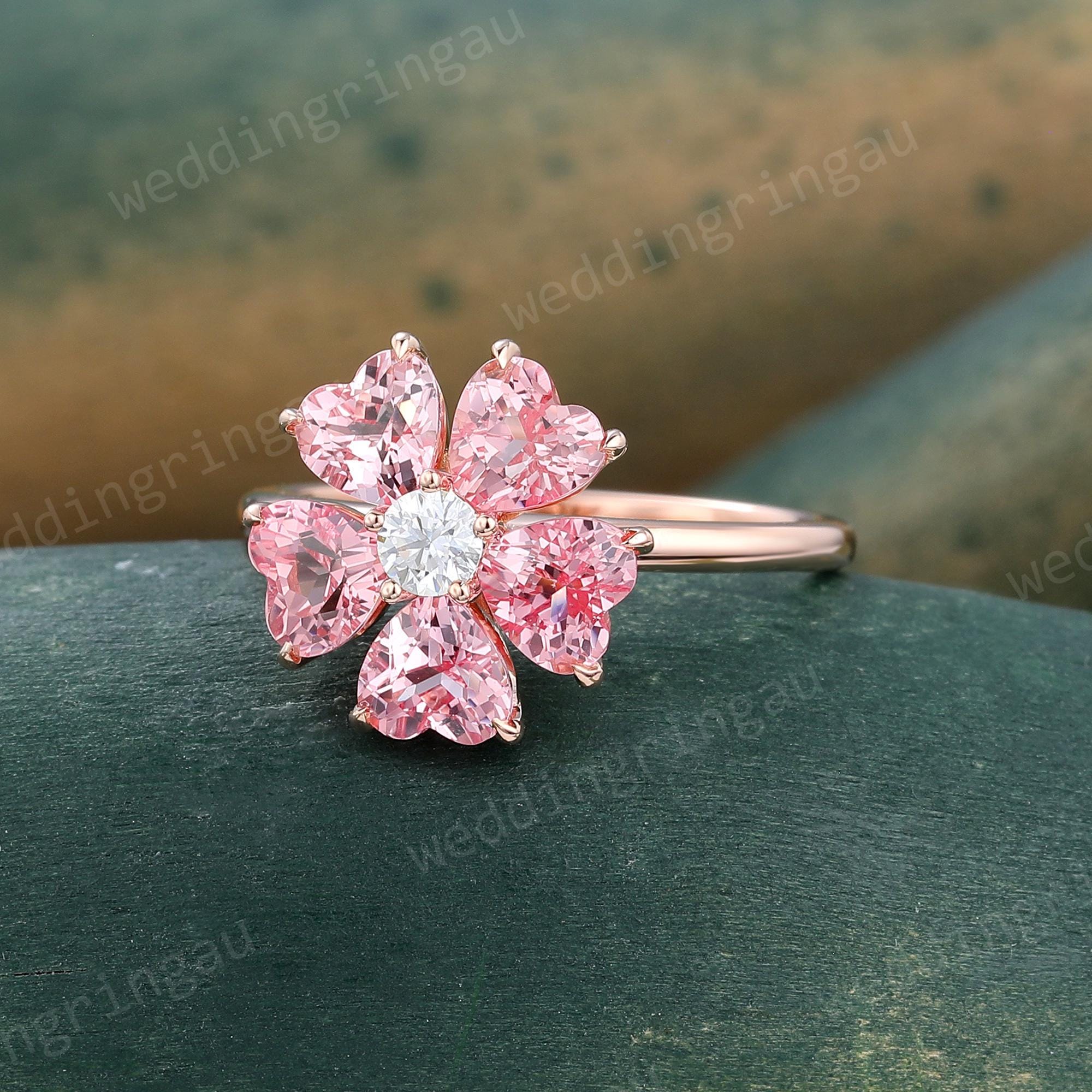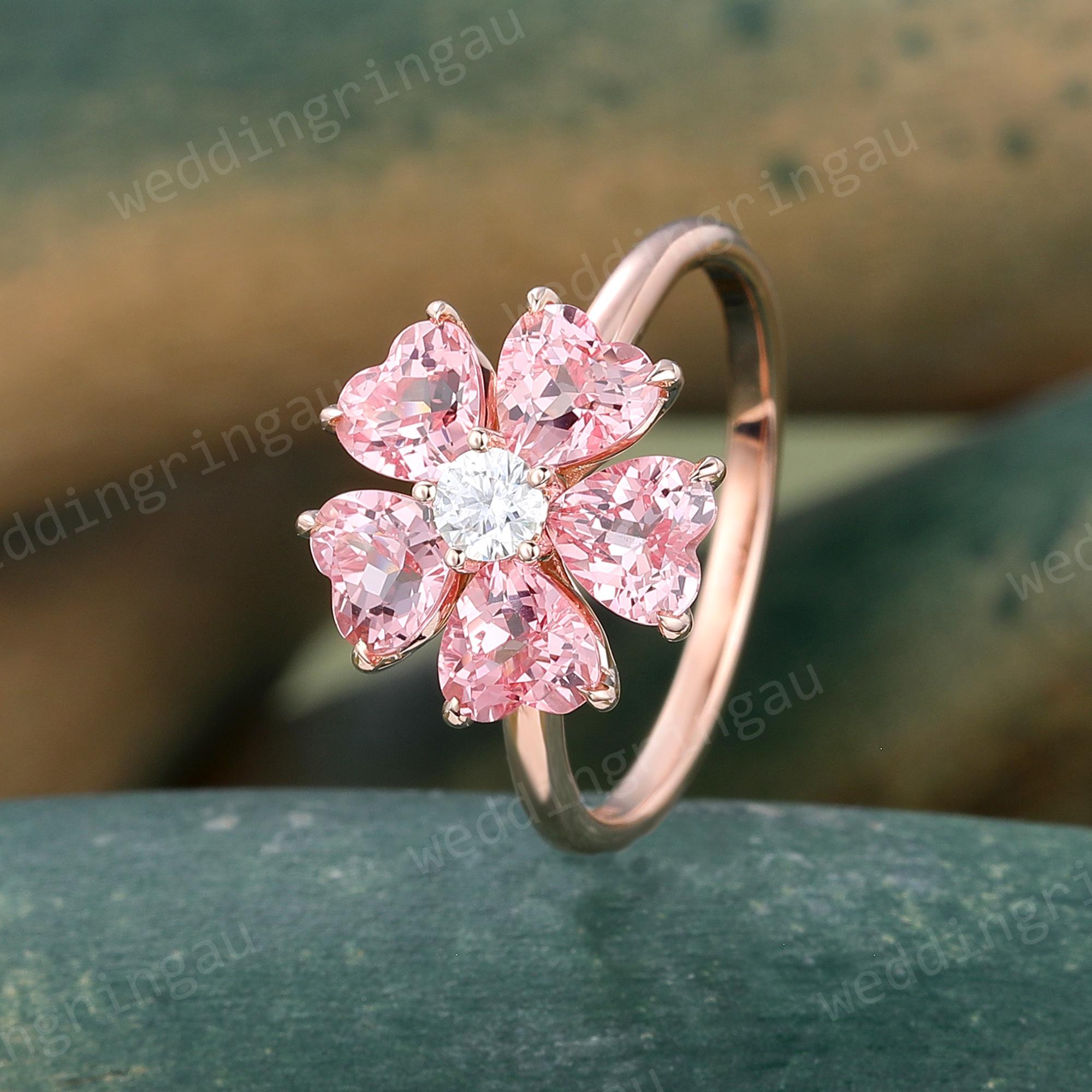 Floral Pink Sapphire Ring Unique Rose Gold Heart Shaped Engagement Ring Moissanite Art Deco Bridal Ring Nature Inspired Promise Ring