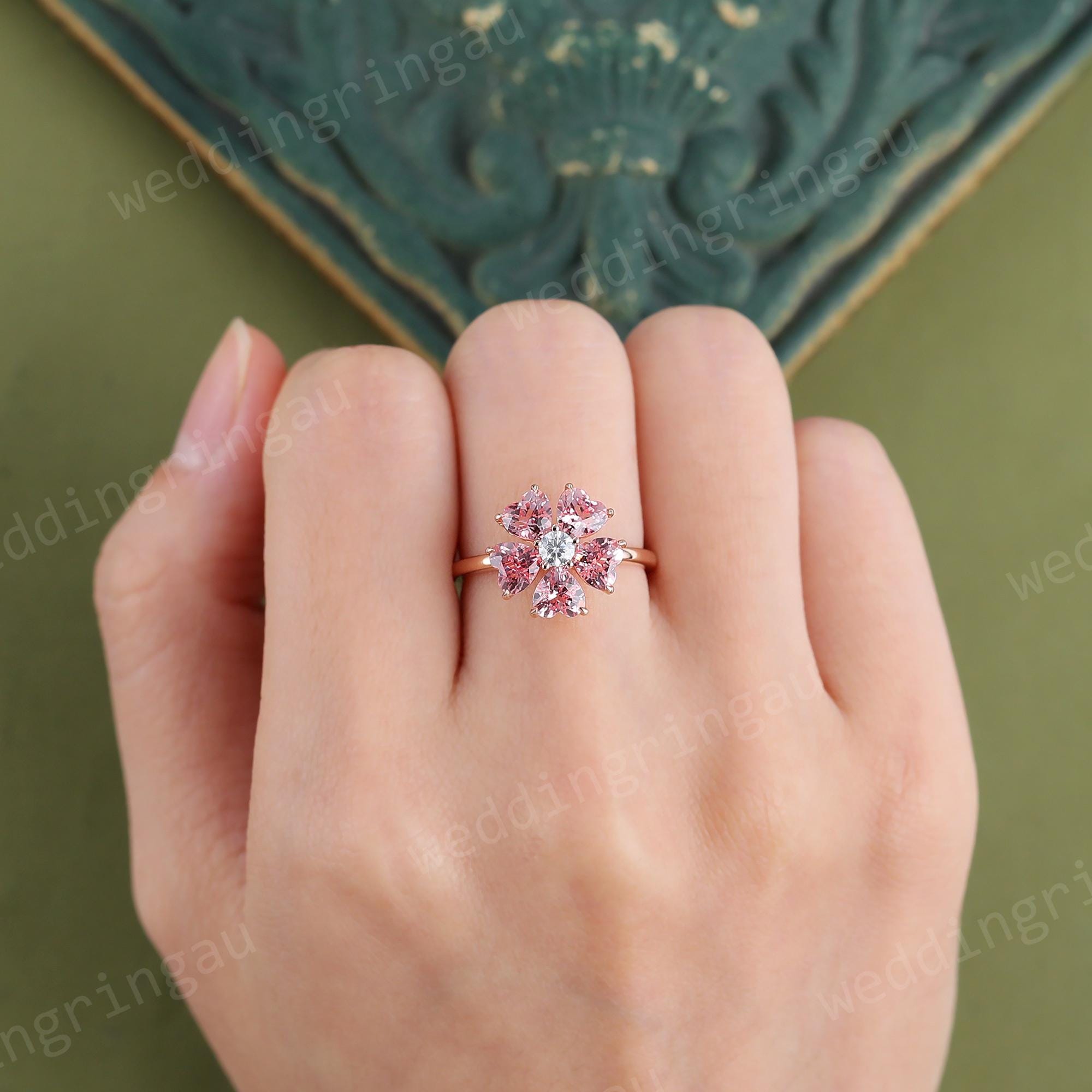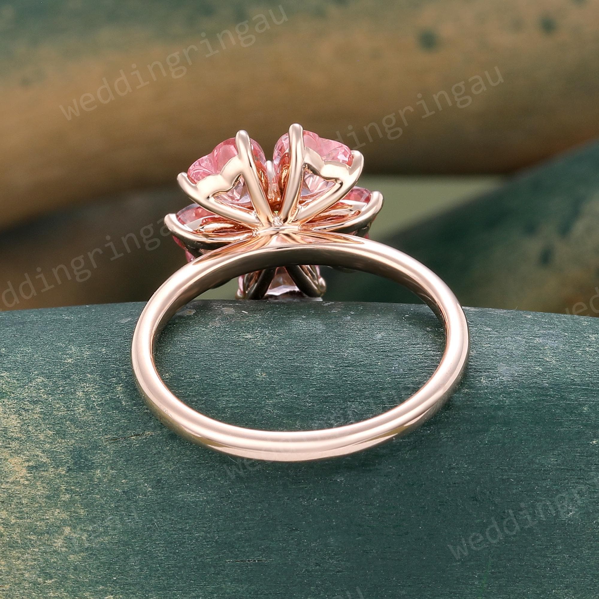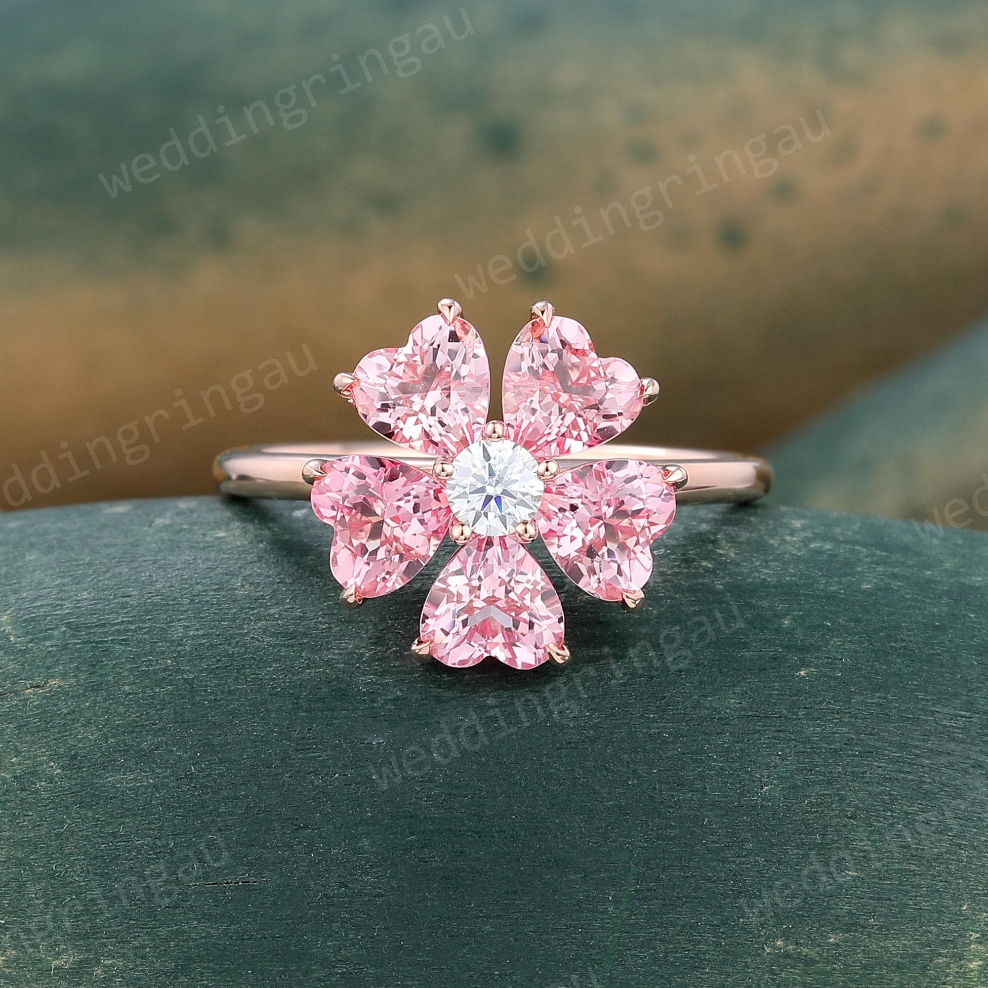 Floral Pink Sapphire Ring Unique Rose Gold Heart Shaped Engagement Ring Moissanite Art Deco Bridal Ring Nature Inspired Promise Ring