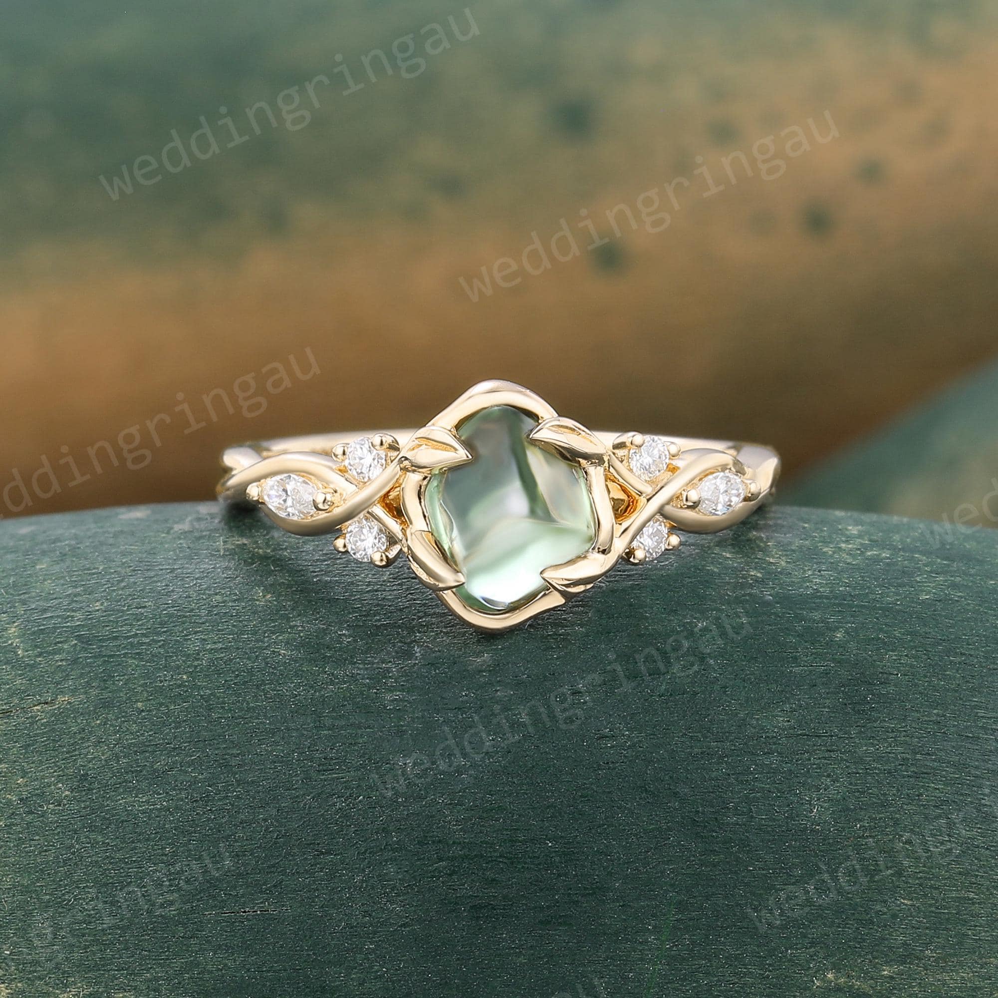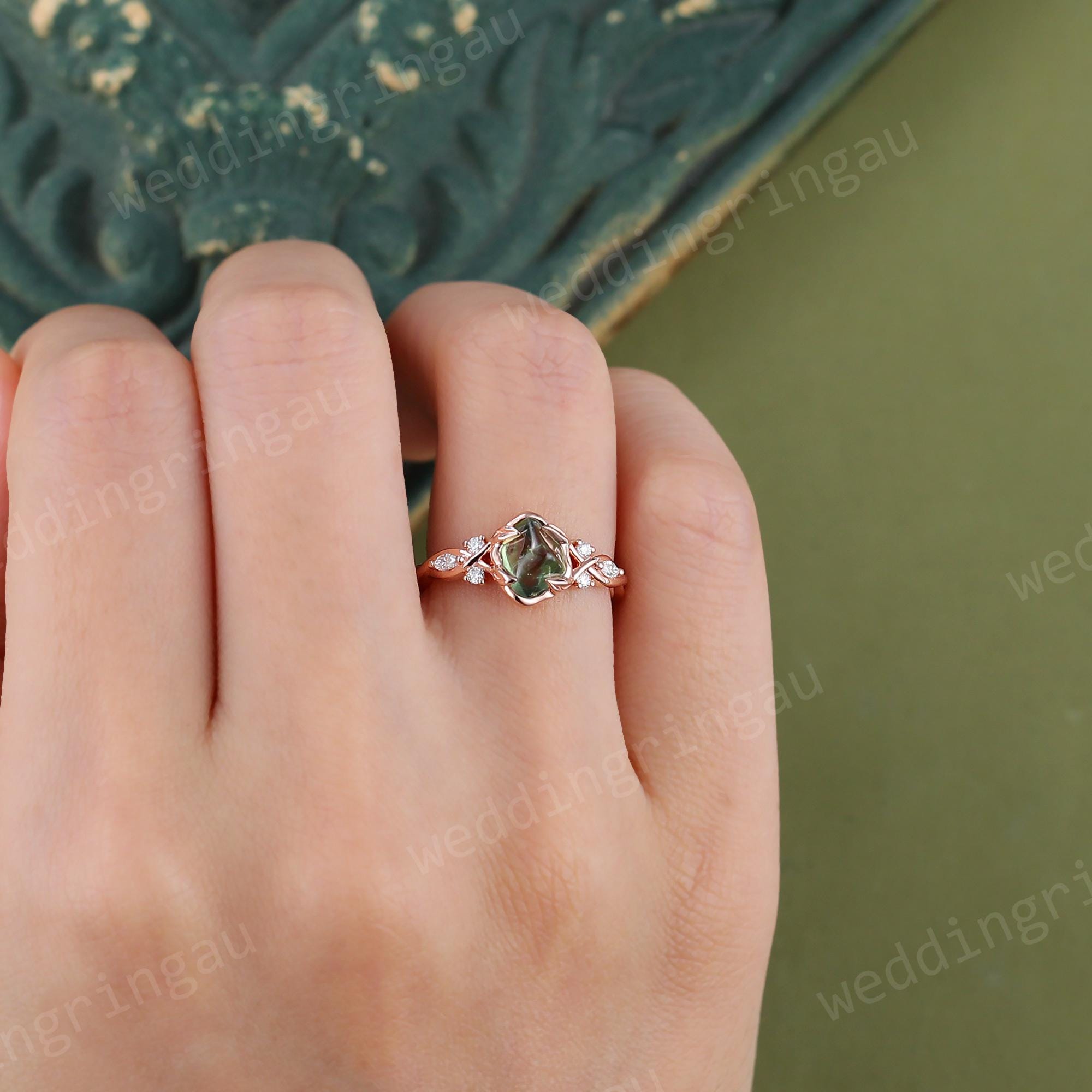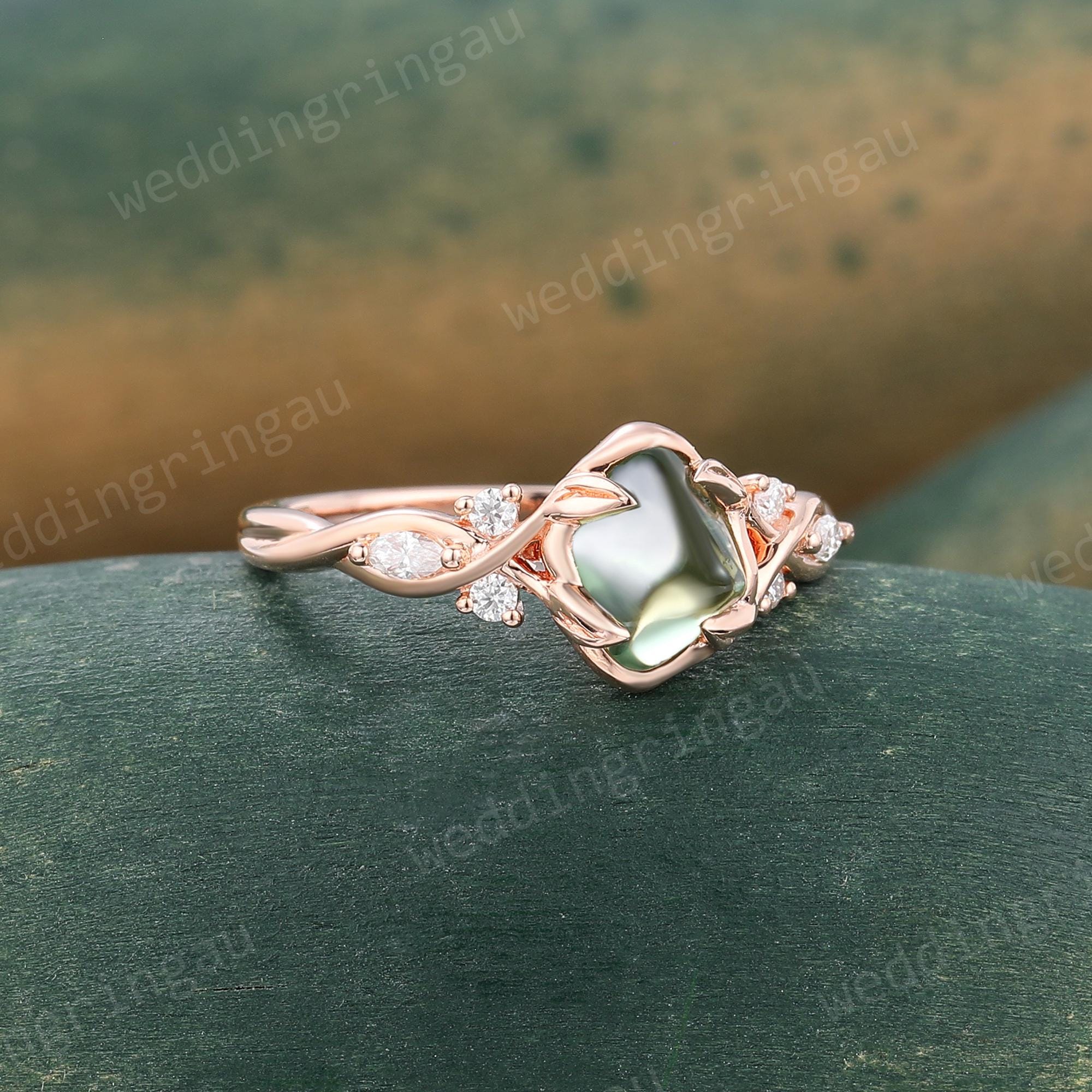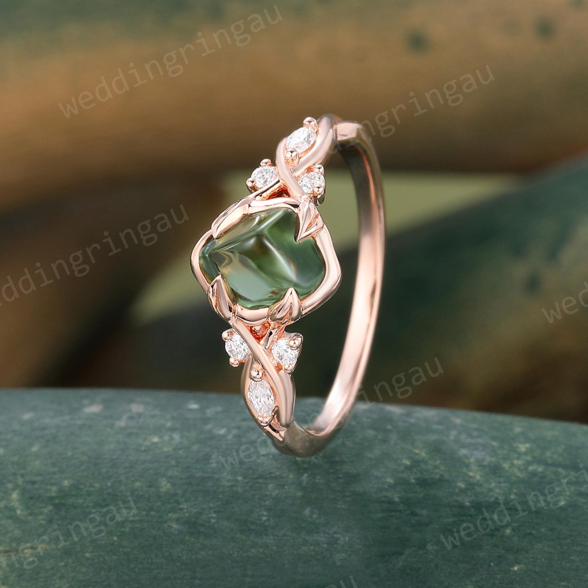 Irregular Cut Green Sapphire Ring Unique Shaped Engagement Ring Rose Gold Marquise Moissanite Wedding Promise Ring Art Deco Twisted Ring