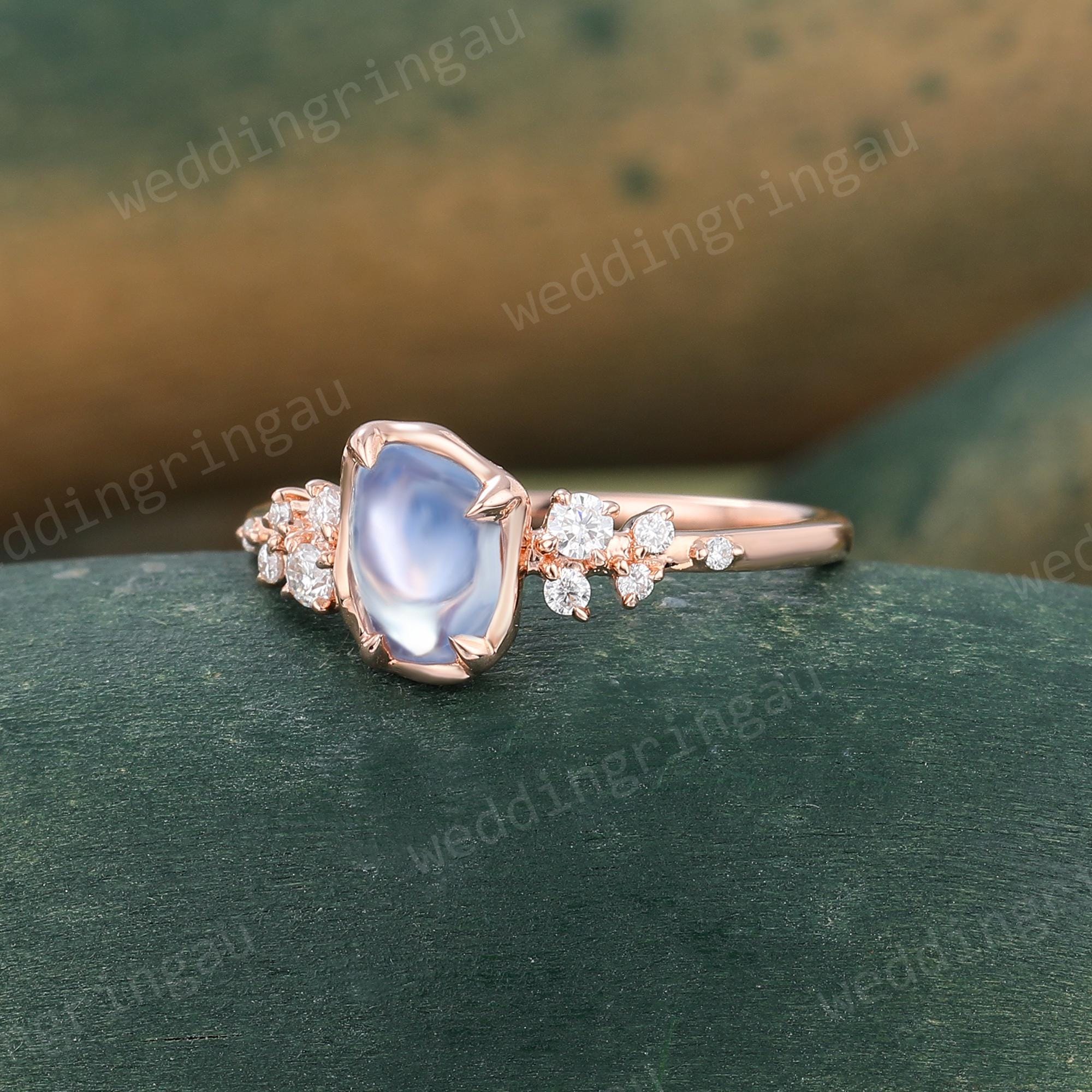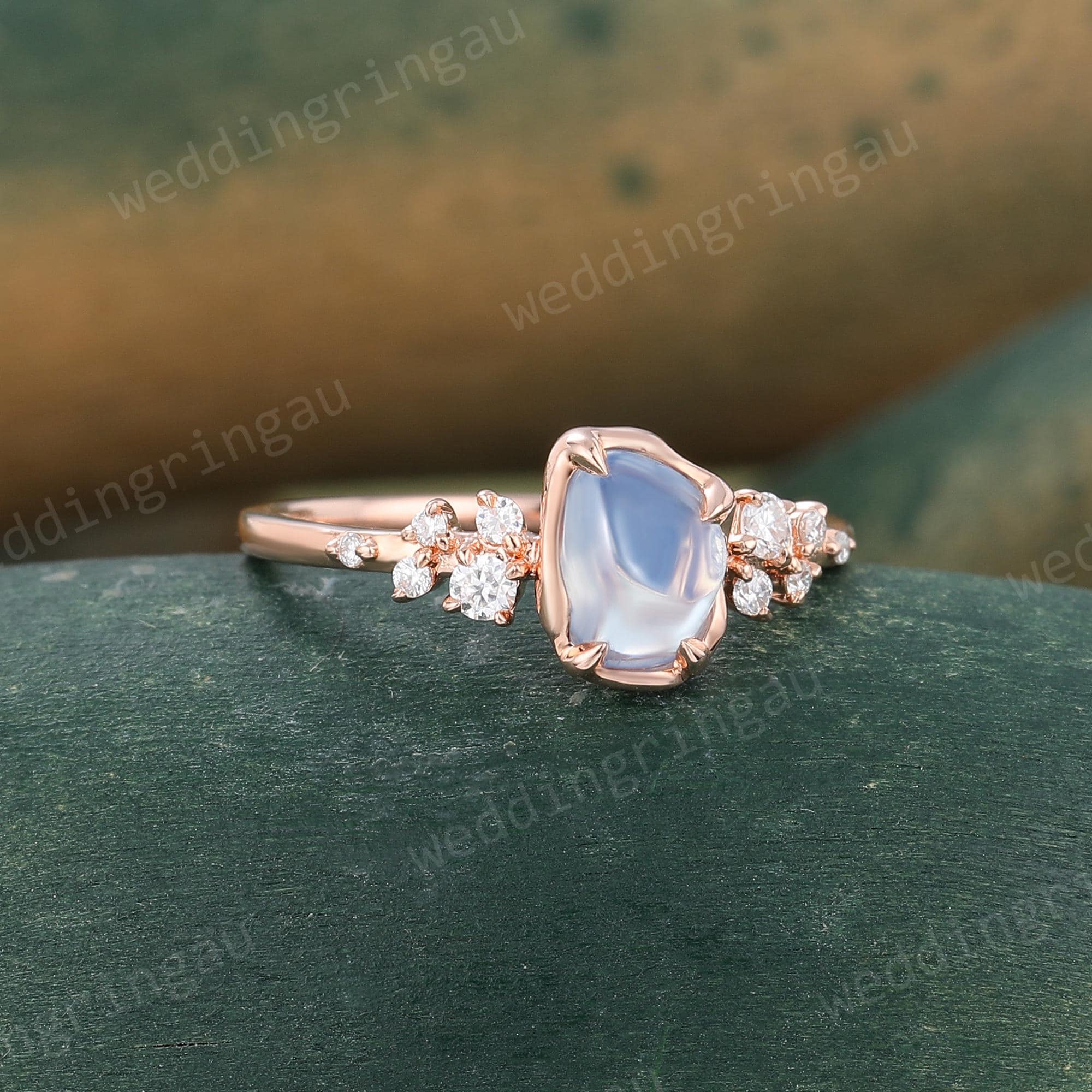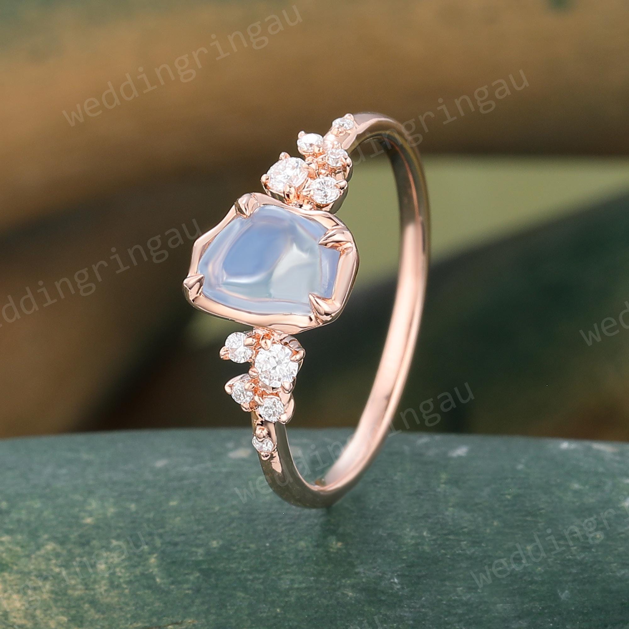 Irregular Cut Raw Sapphire Ring Unique Shaped Engagement Ring Rose Gold Moissanite Cluster Wedding Promise Ring Art Deco Ring Gift for Her