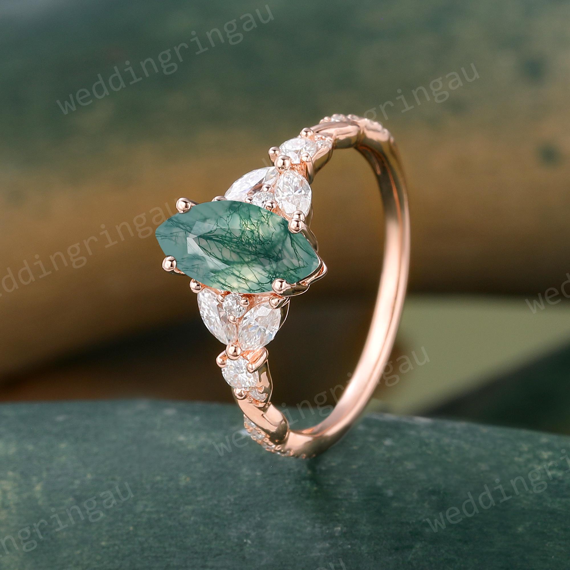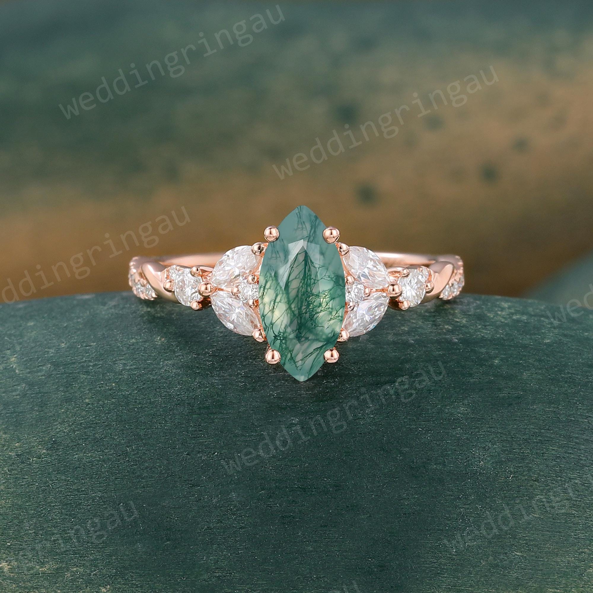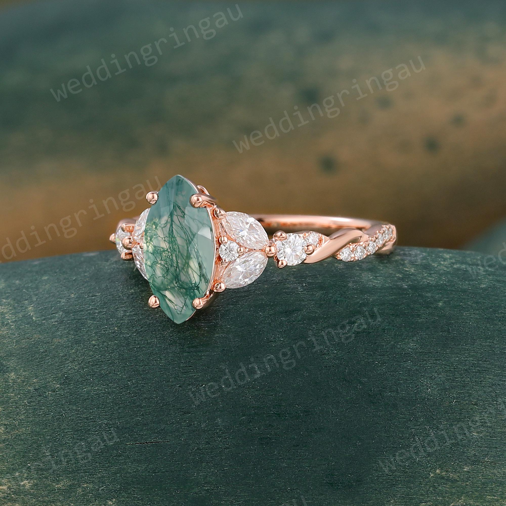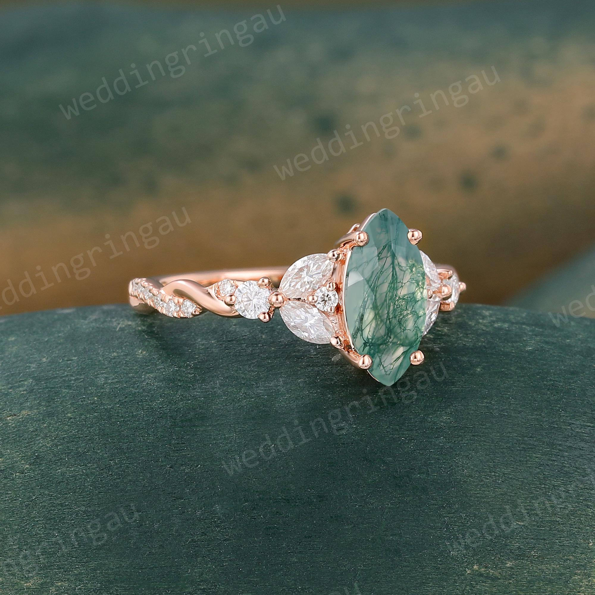 Marquise Cut Moss Agate Ring Rose Gold Green Agate Engagement Ring Moissanite Diamond Cluster Twisted Wedding Ring Bridal Promise Ring Gift
