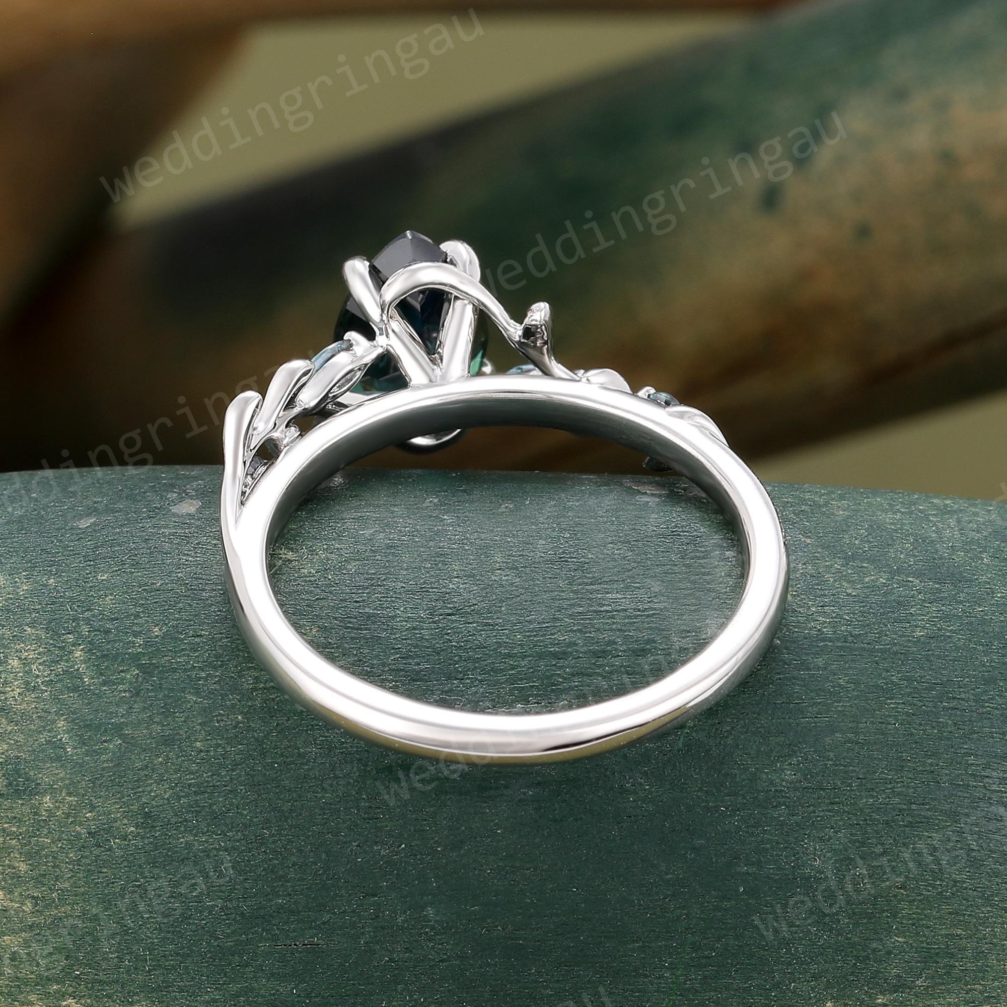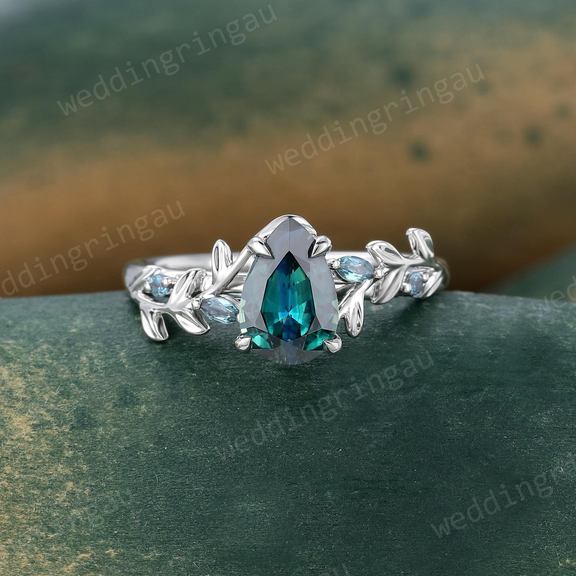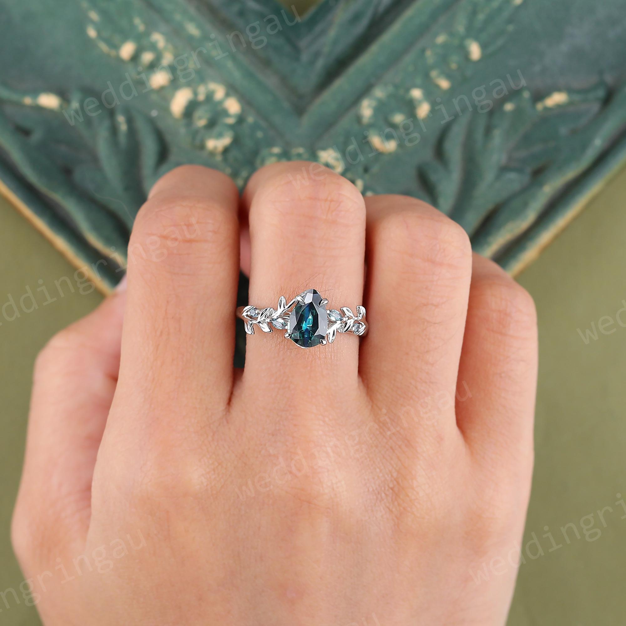 Natural Green Blue Sapphire Engagement Ring Unique White Gold Pear Shaped Saphire Fine Cut Sapphire Twig Leaf Wedding Alexandrite Ring Gift