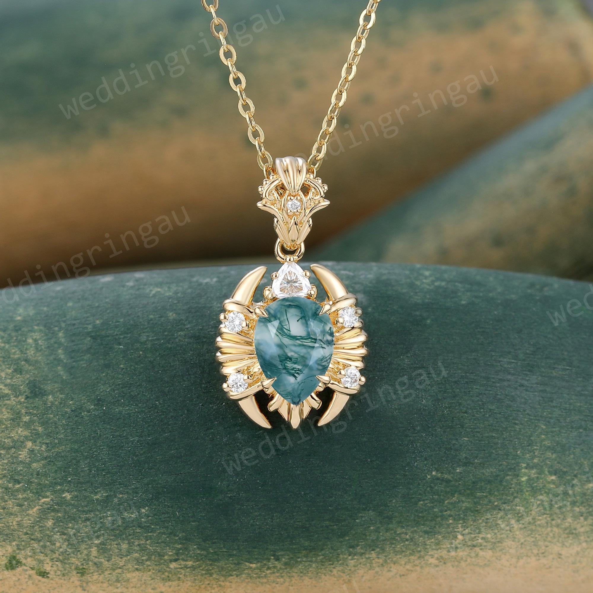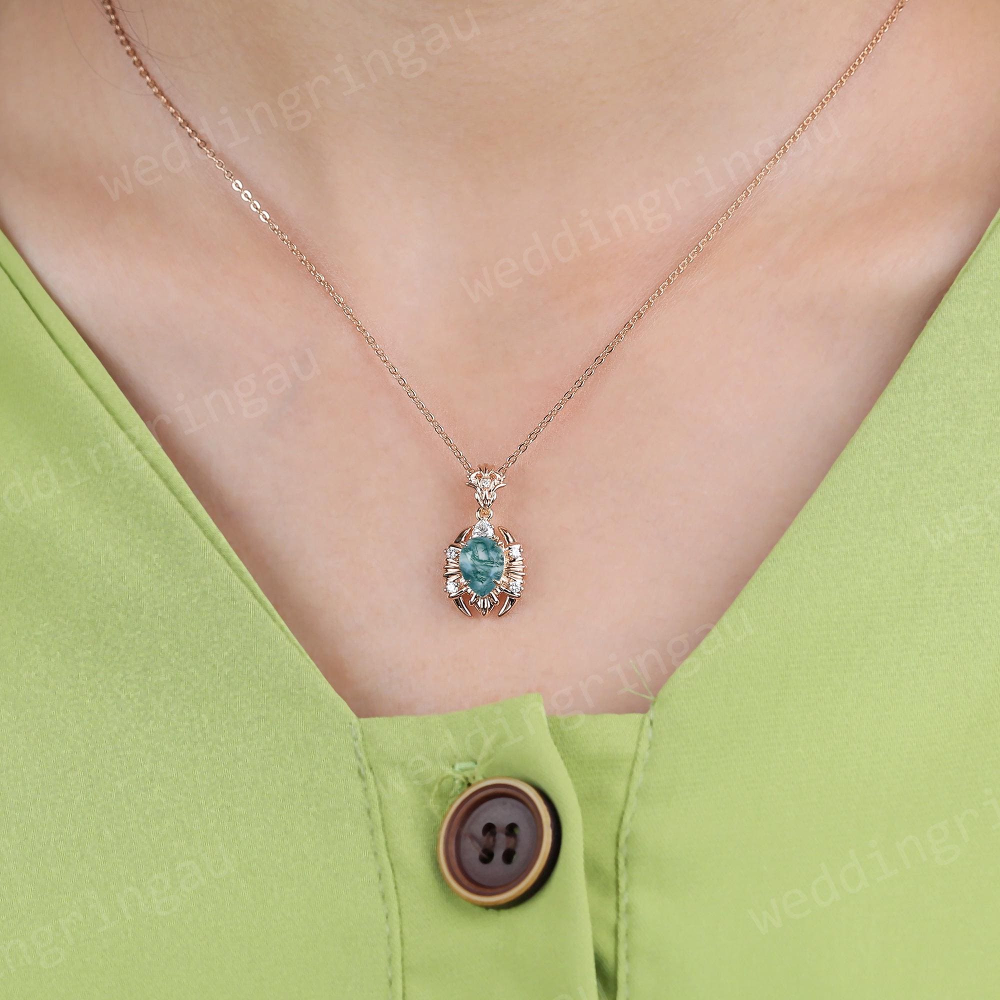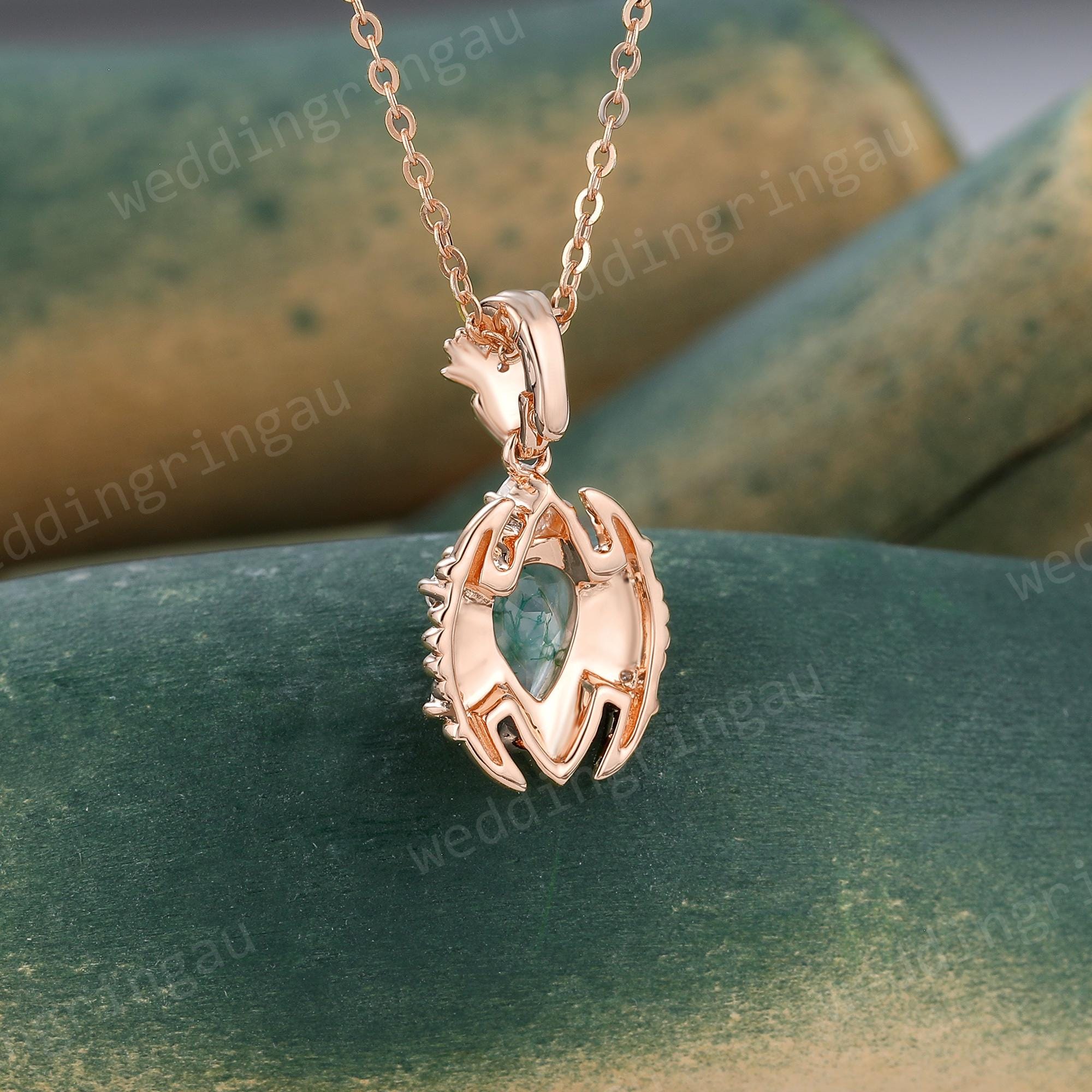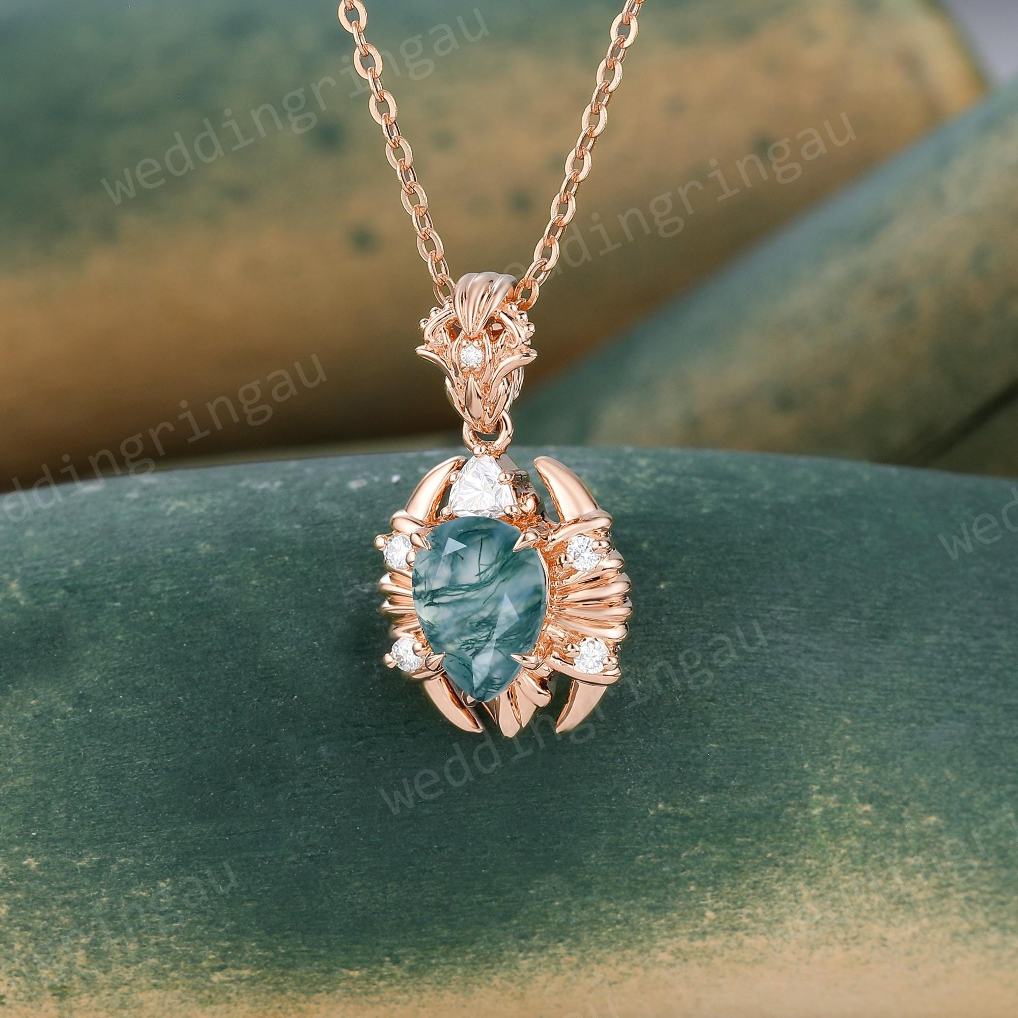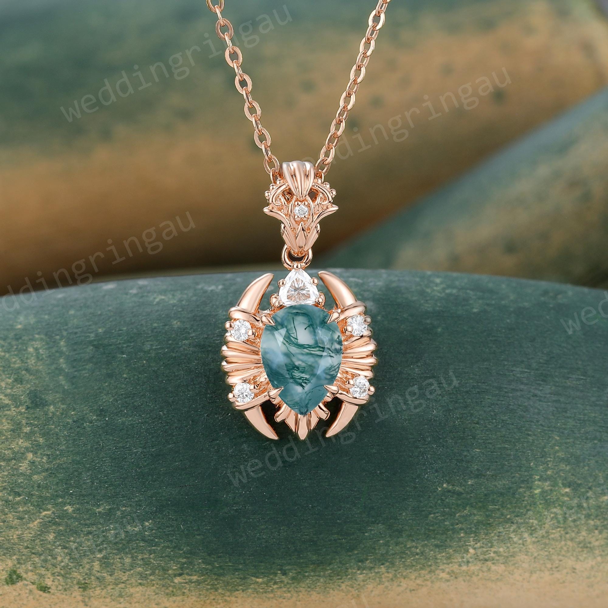 Pear Shaped Moss Agate Necklace Rose Gold Unique Teardrop Pendant Women Moissanite Pendant Necklace Art Deco Bridal Anniversary Gift