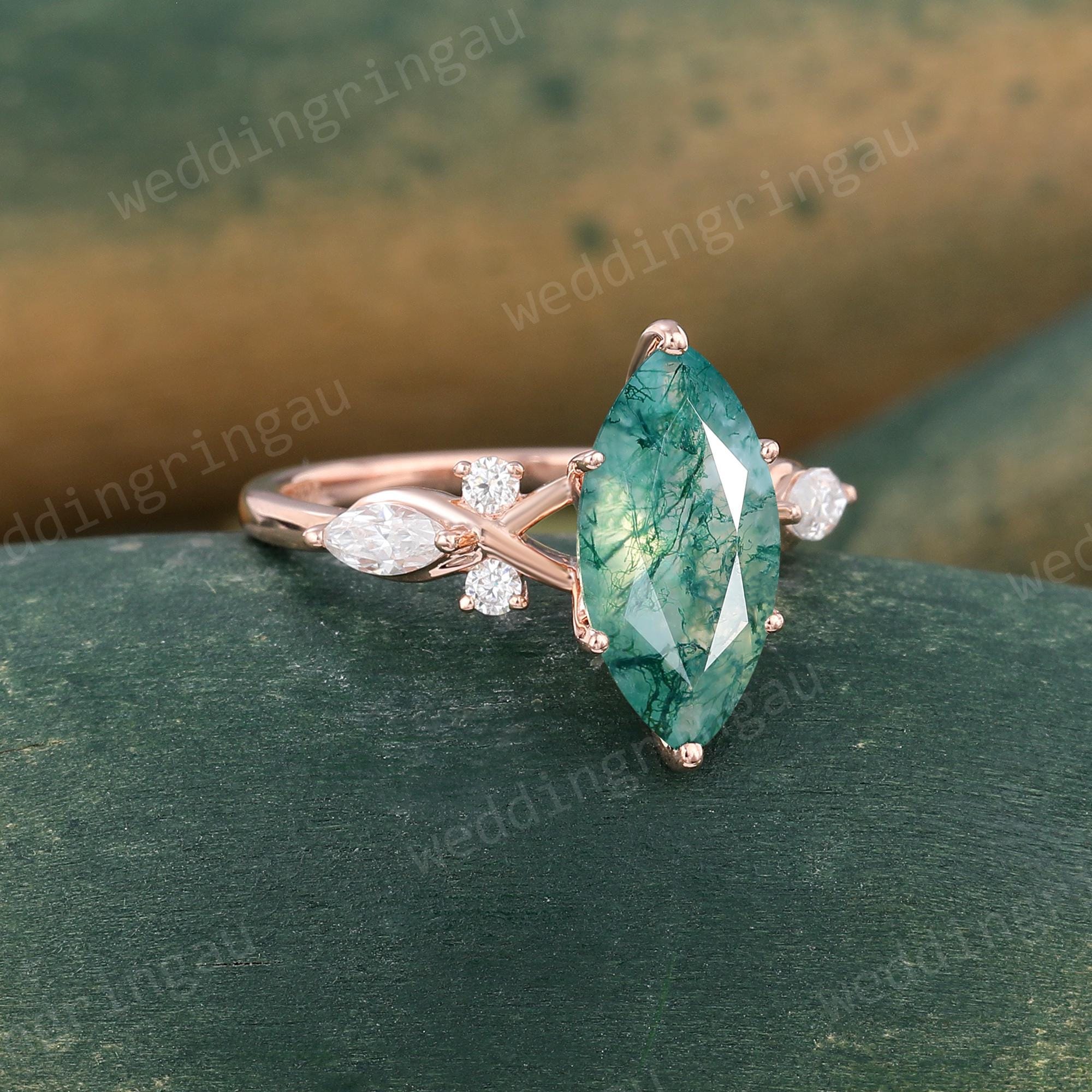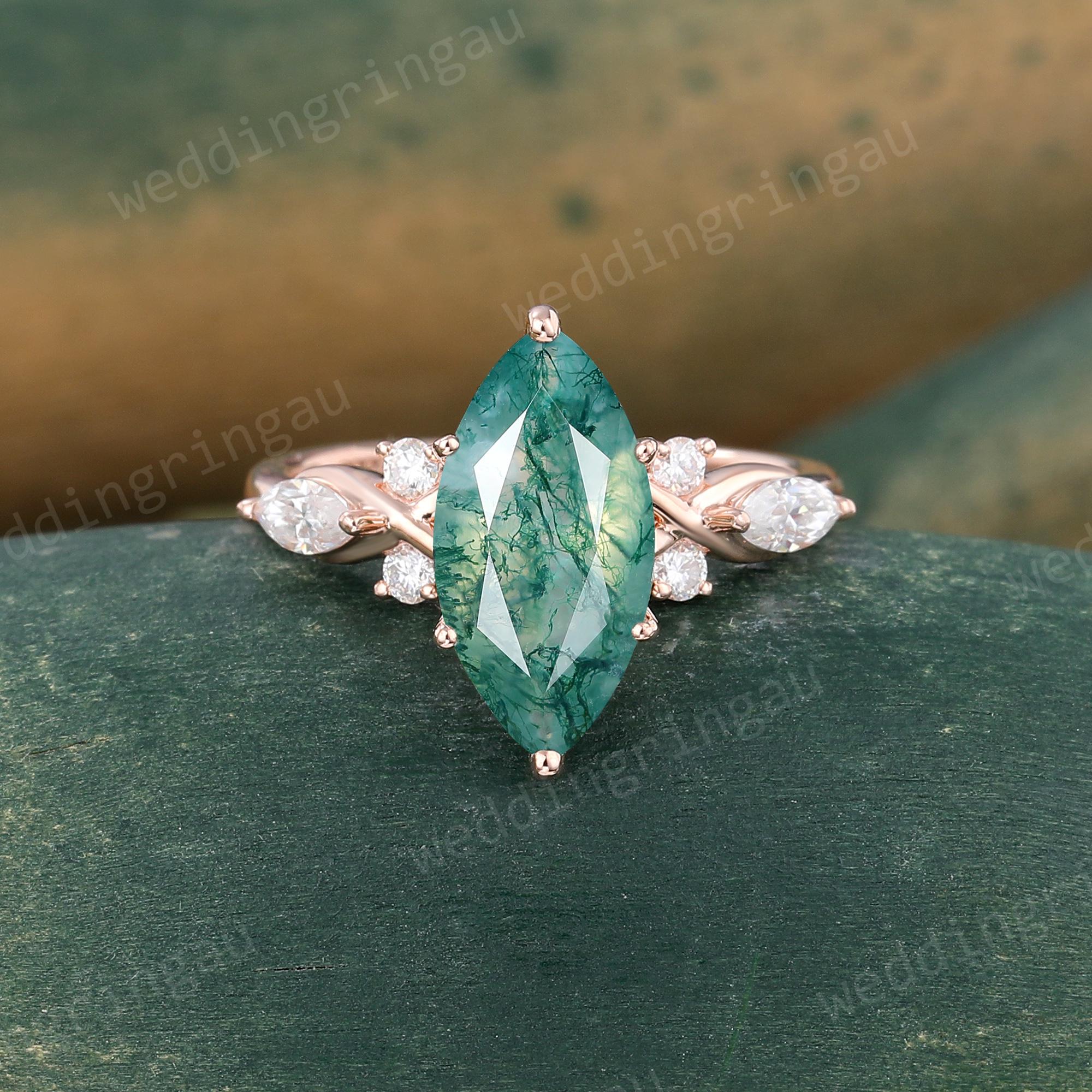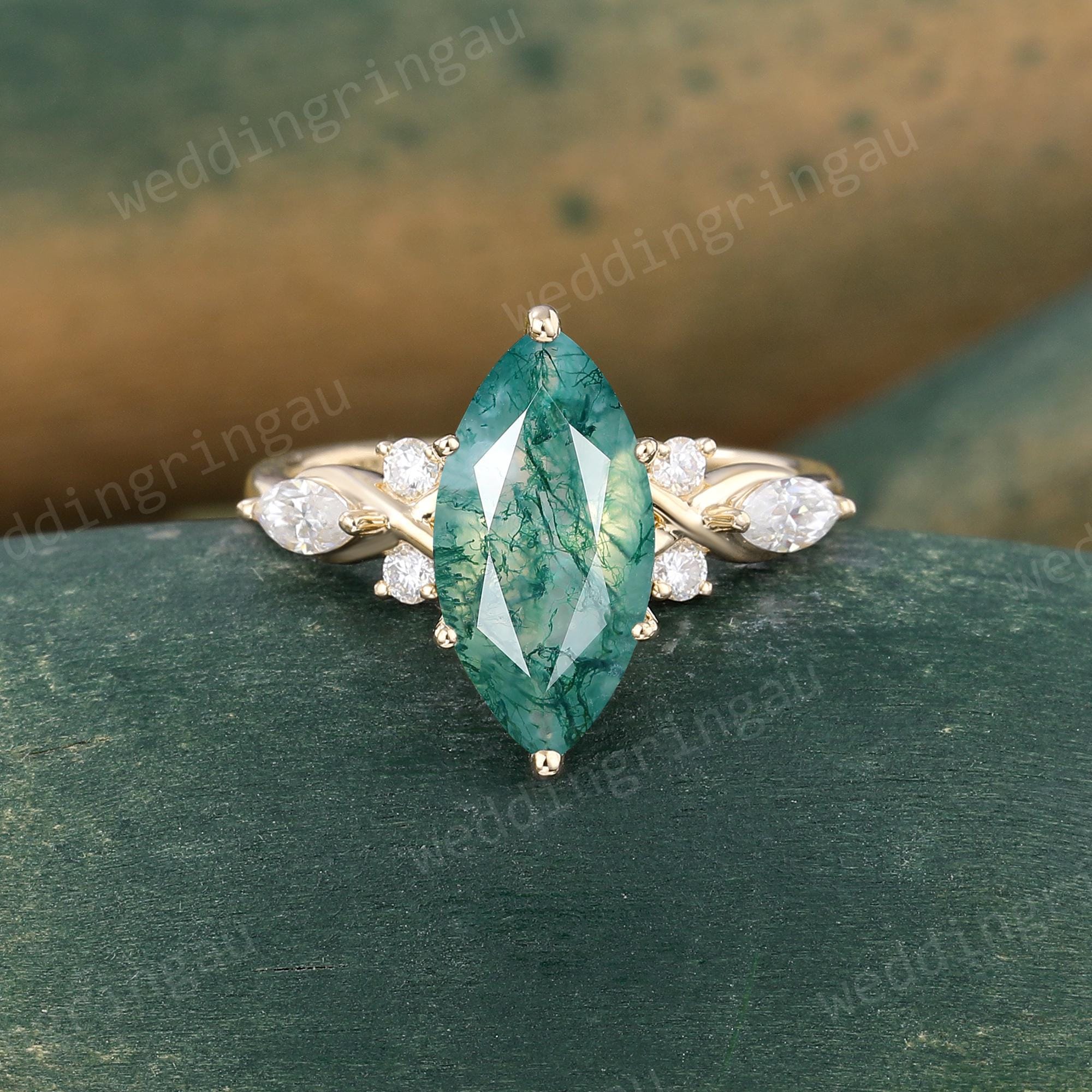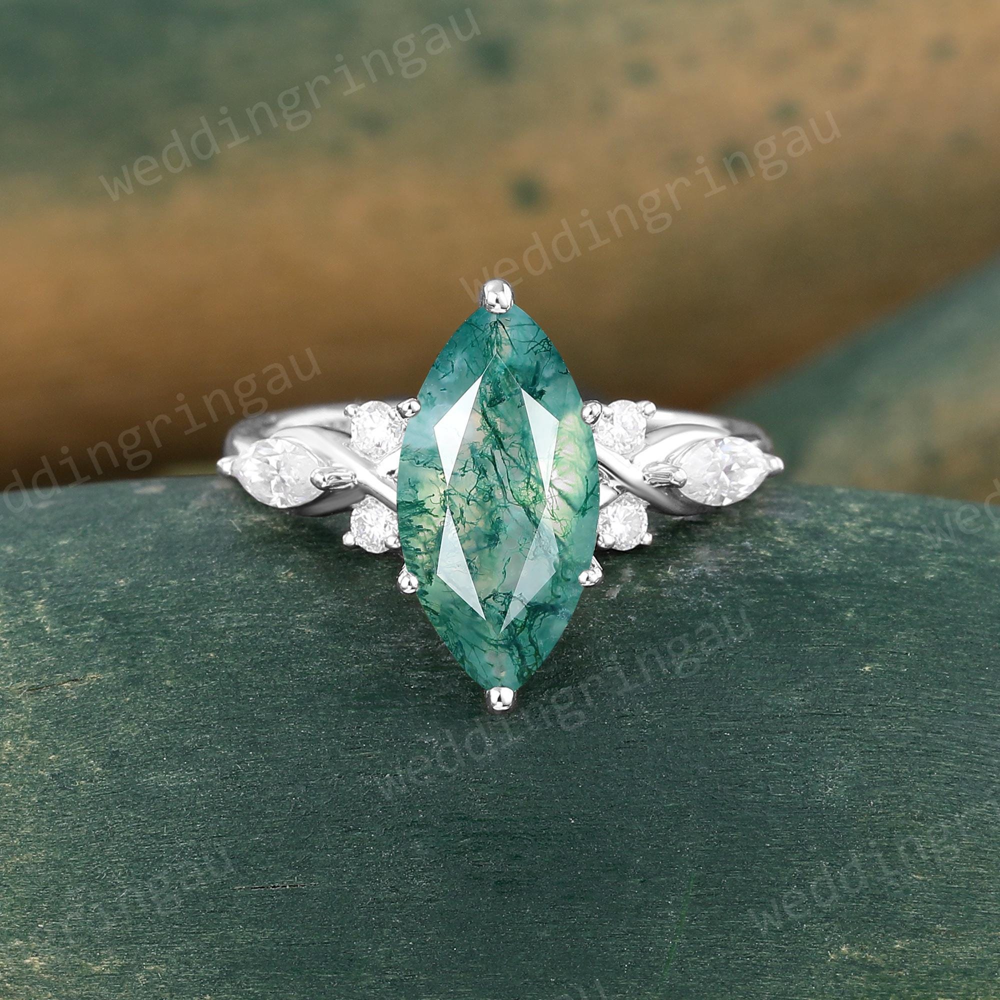 Large Moss Agate Ring Unique Marquise Cut Green Agate Engagement Ring Art Deco Moissanite Diamond Wedding Promise Bridal Anniversary Ring