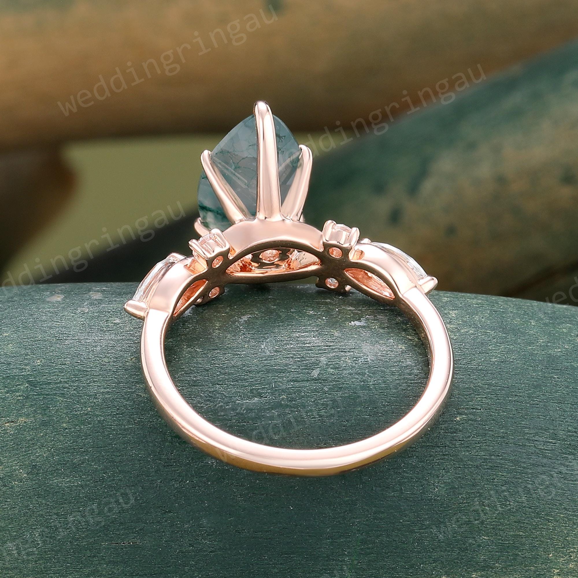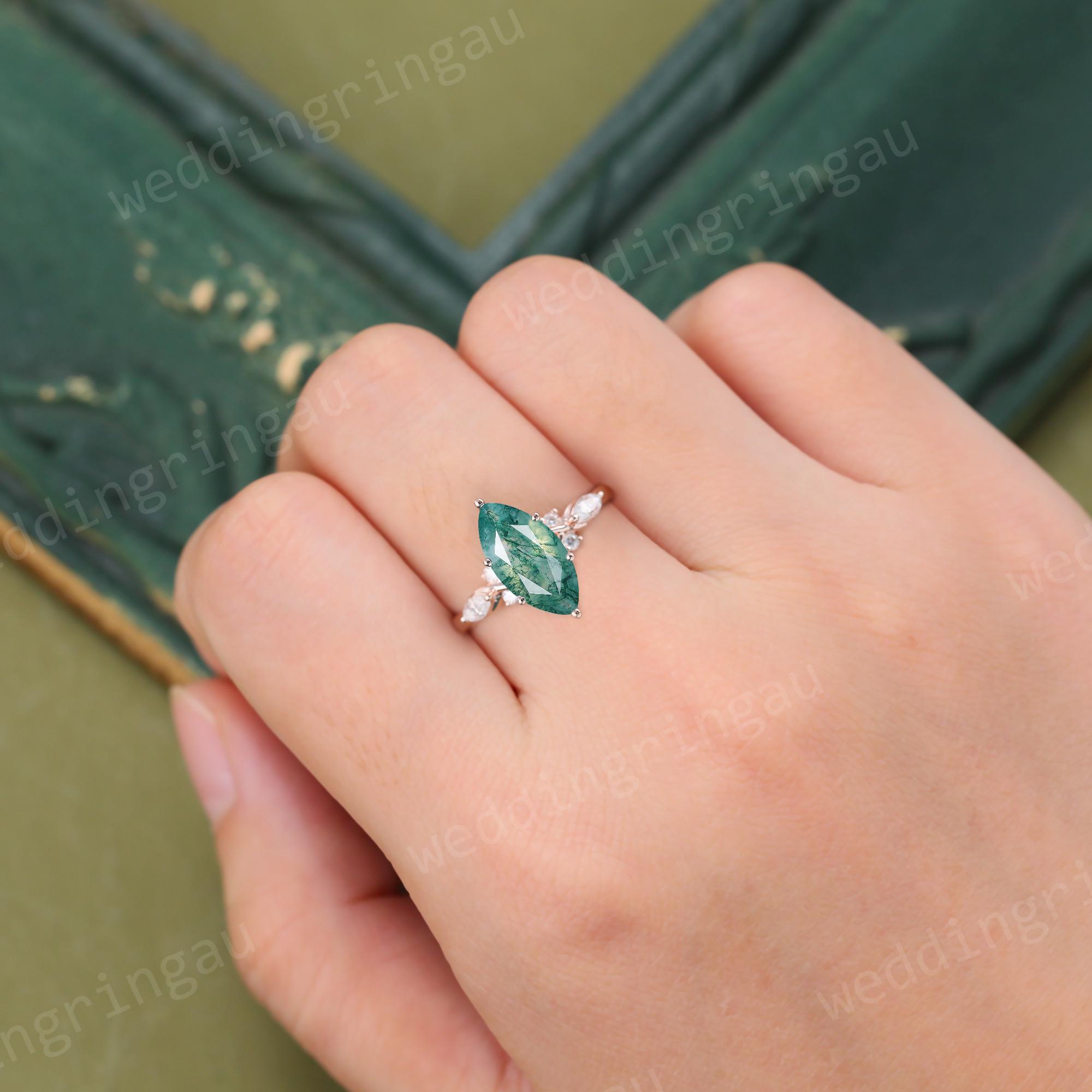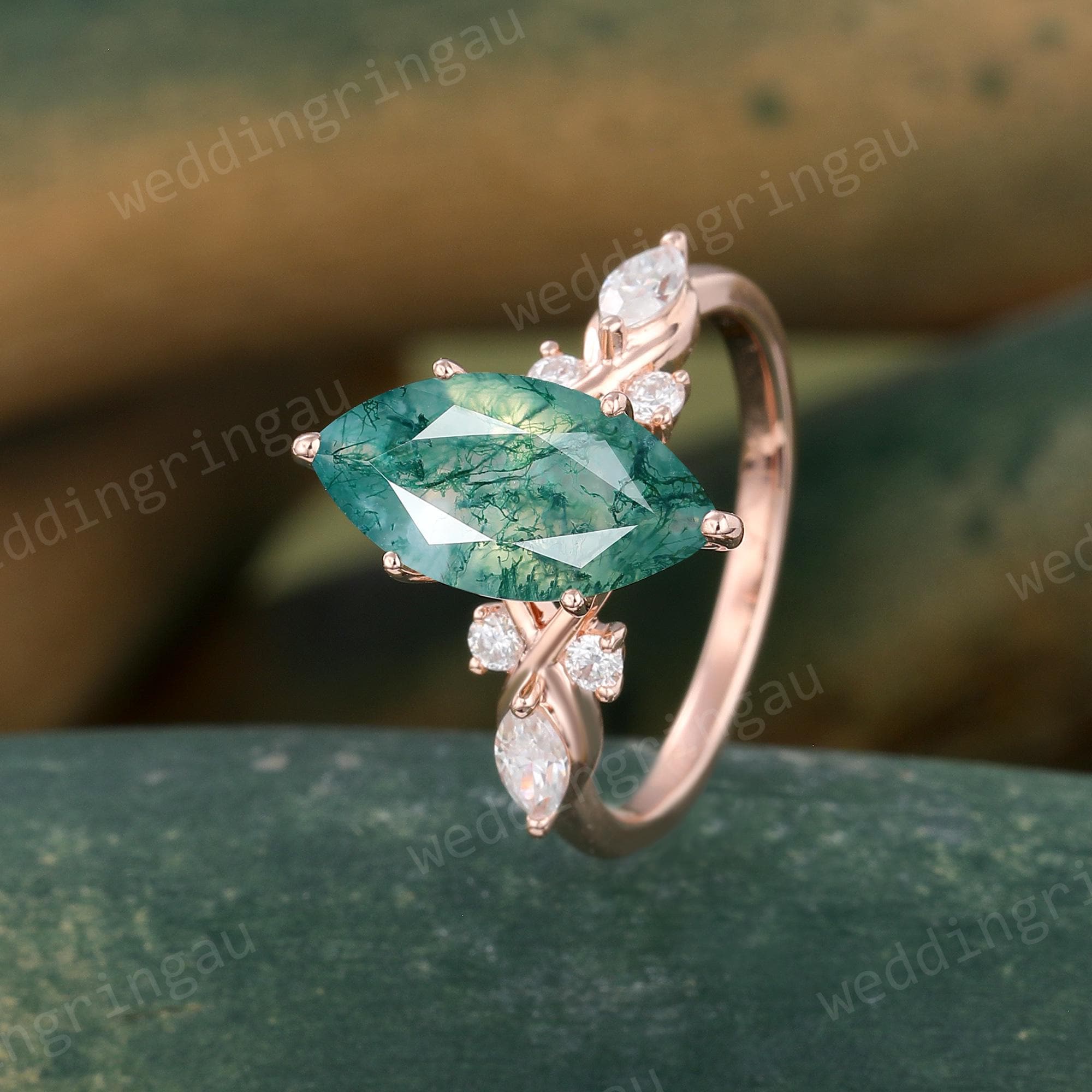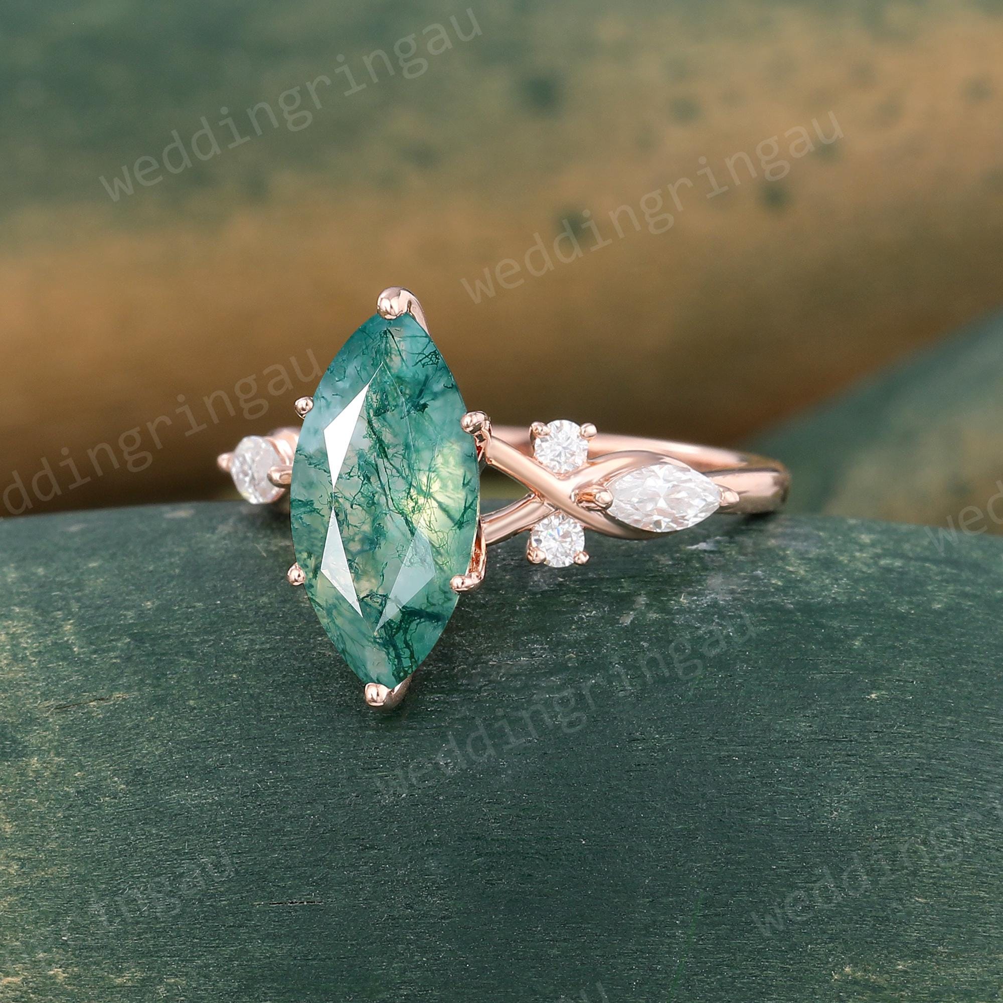 Large Moss Agate Ring Unique Marquise Cut Green Agate Engagement Ring Art Deco Moissanite Diamond Wedding Promise Bridal Anniversary Ring