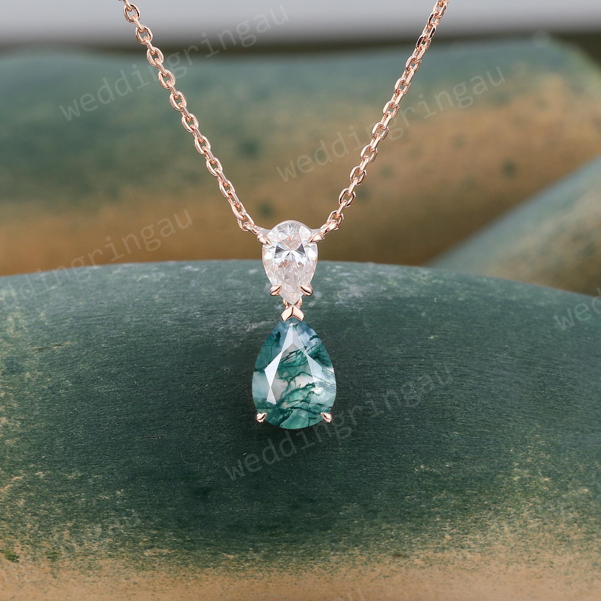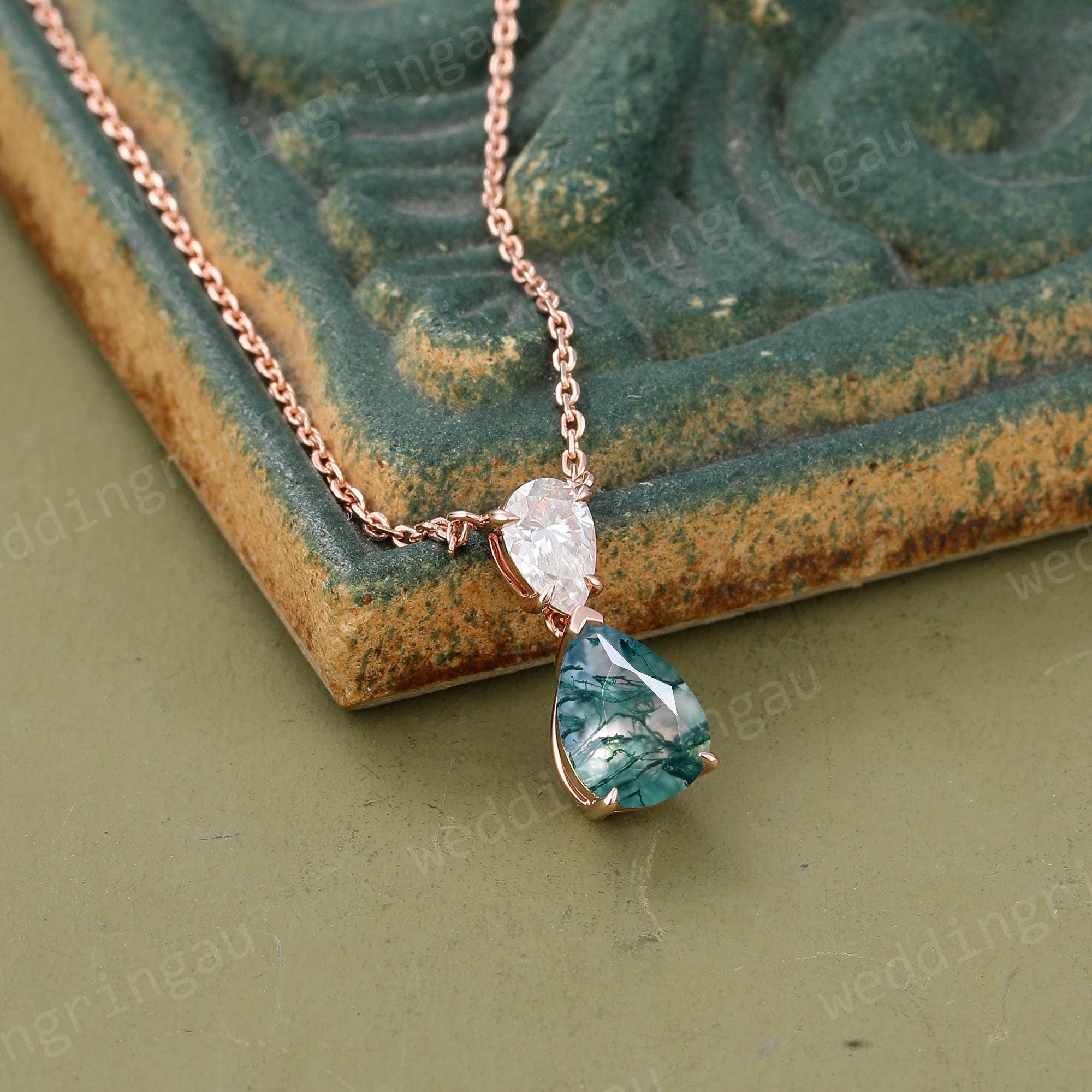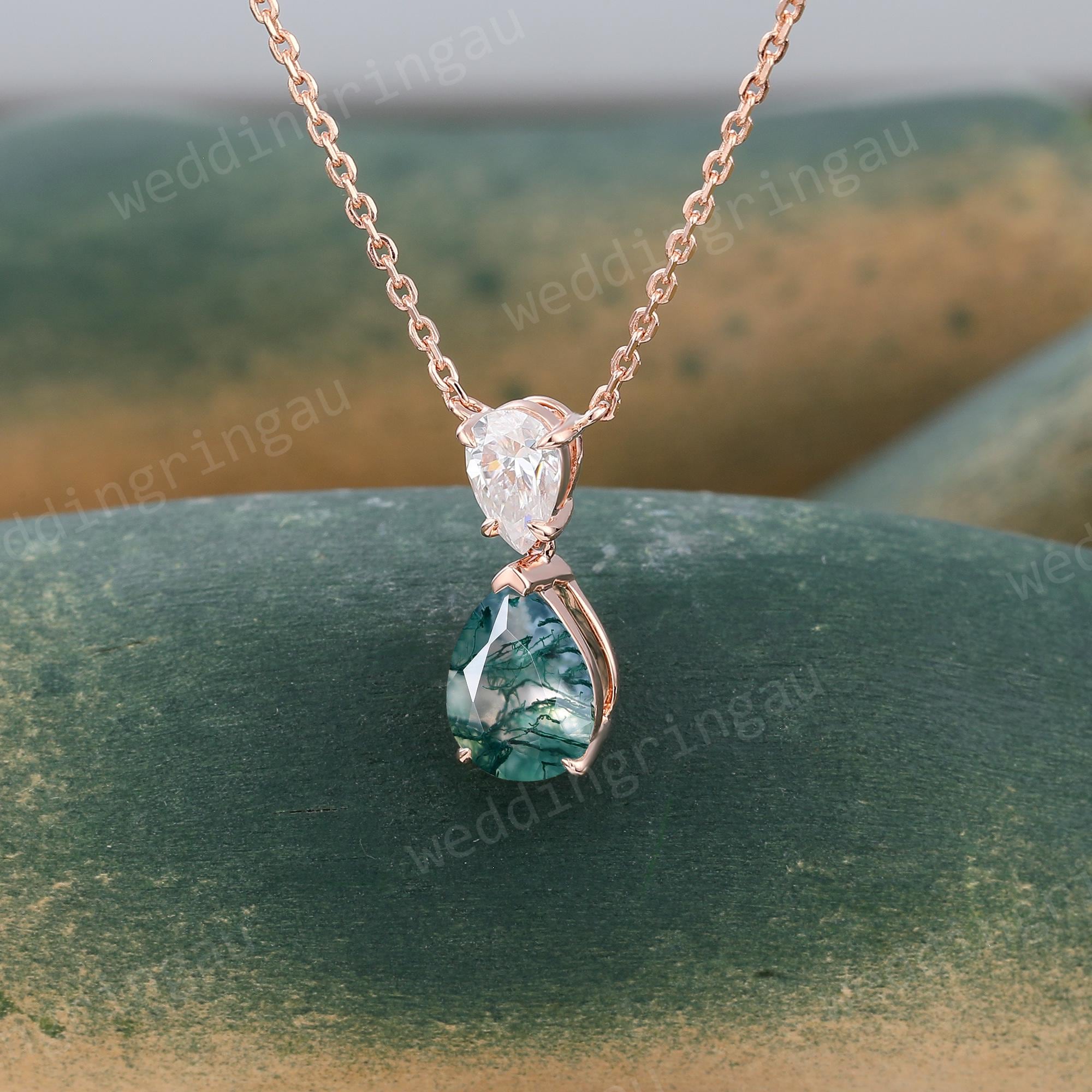 Two Stone Moss Agate & Moissanite Pendant Necklace Unique Rose Gold Pear Shaped Personalized Pendant for Women Anniversary Bridal Gift