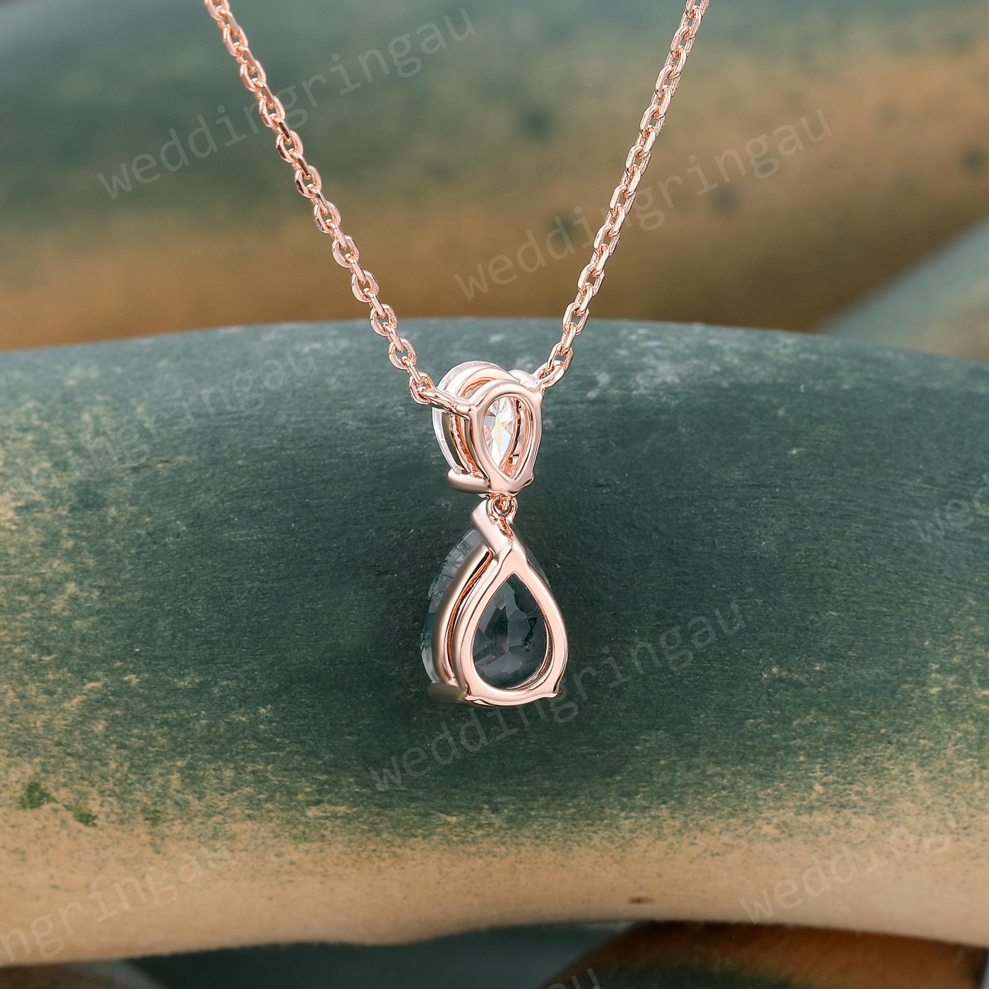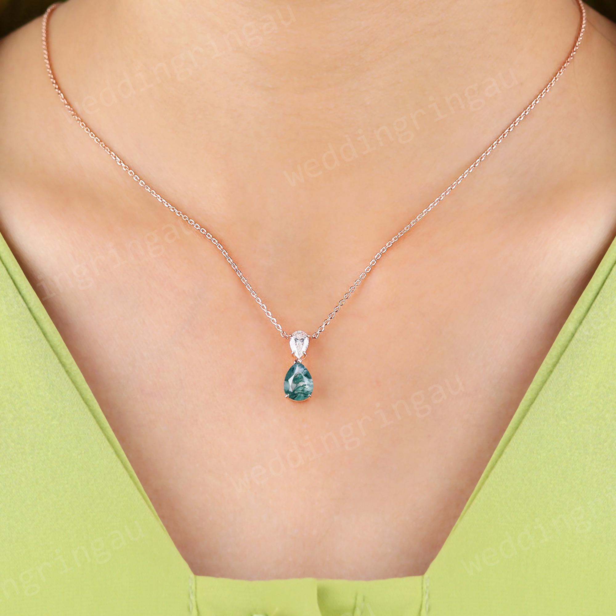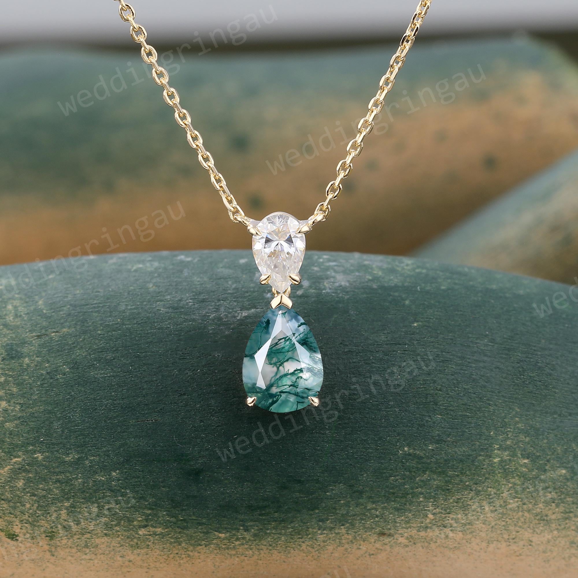Two Stone Moss Agate & Moissanite Pendant Necklace Unique Rose Gold Pear Shaped Personalized Pendant for Women Anniversary Bridal Gift