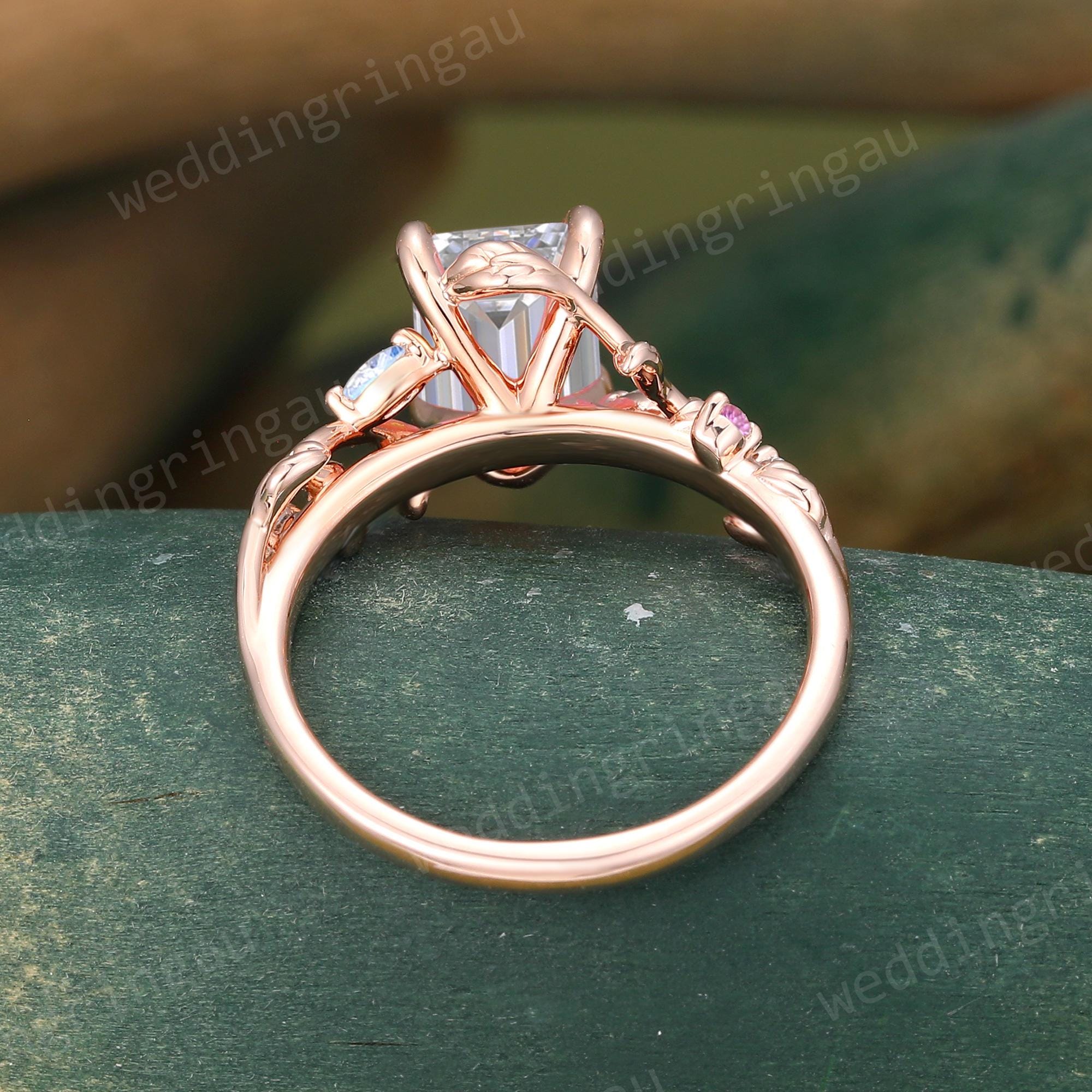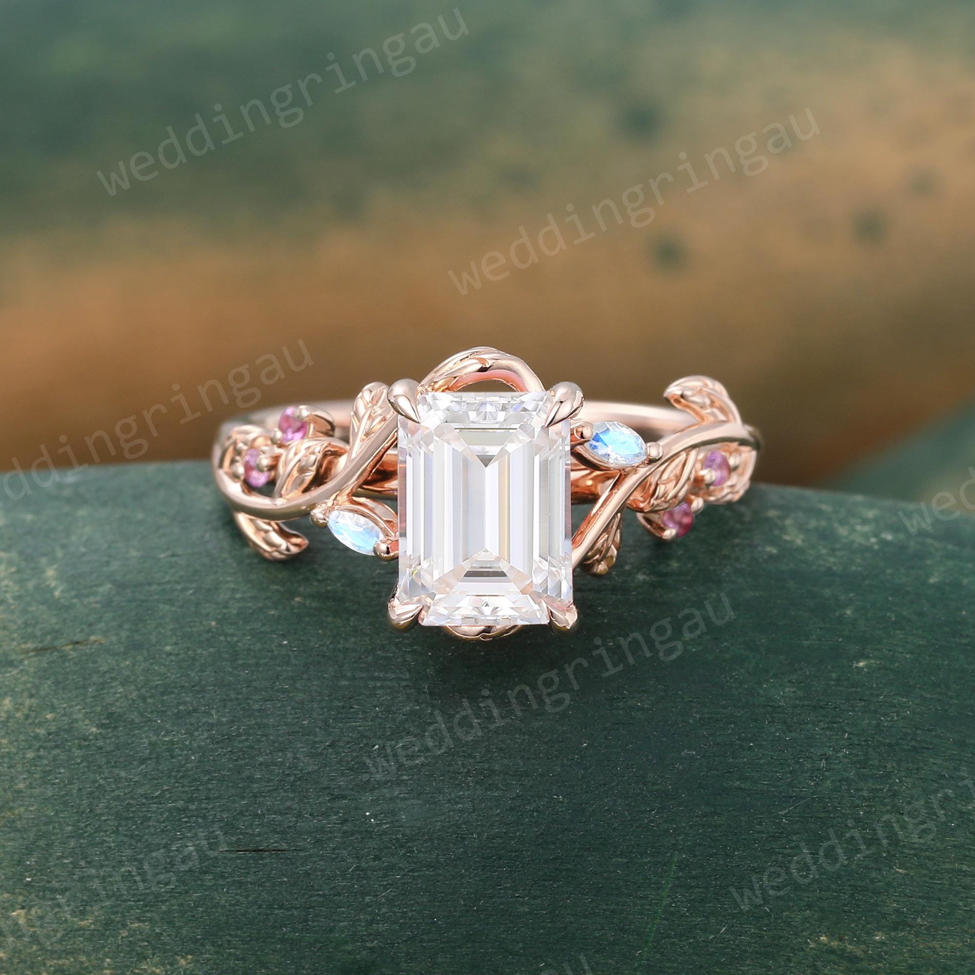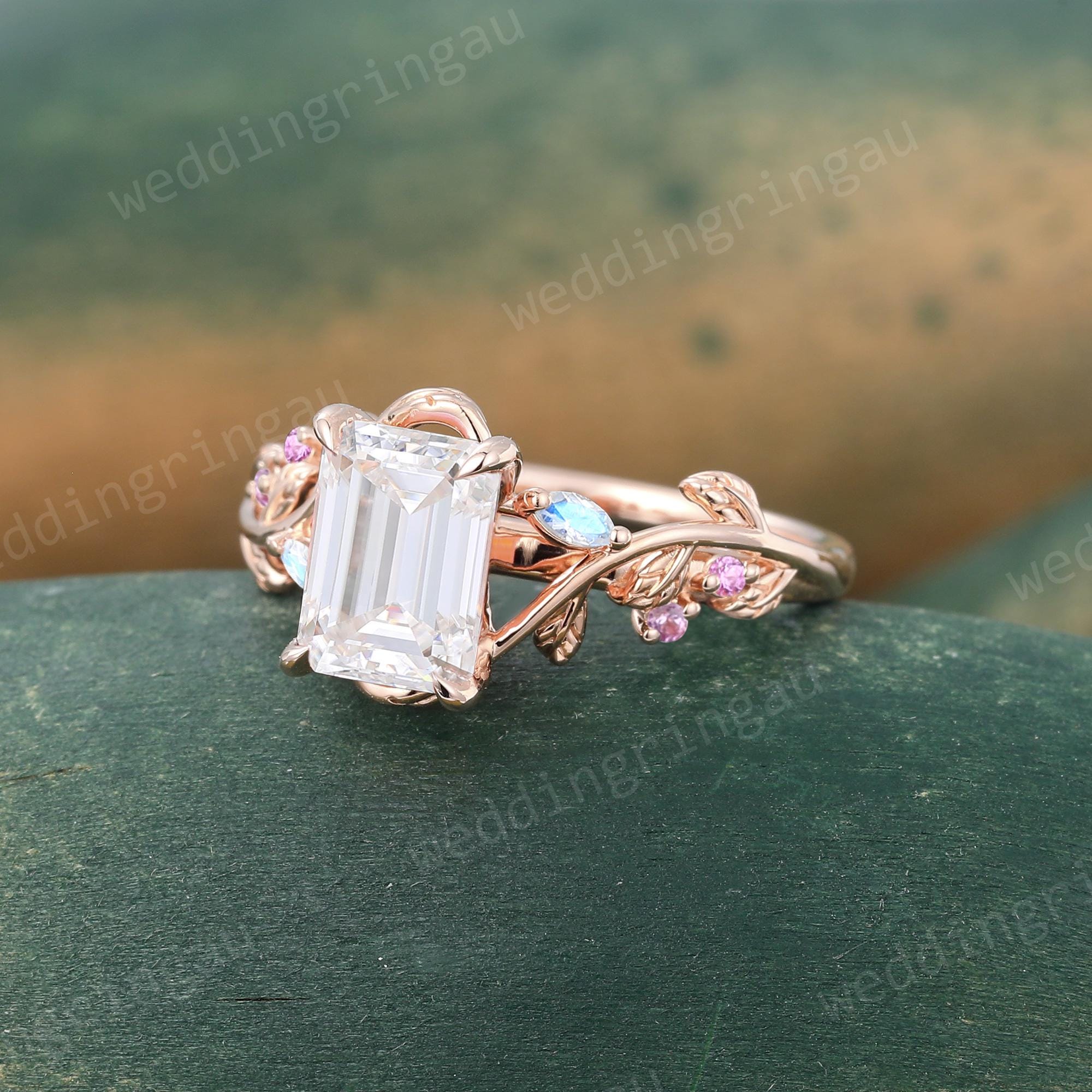 Emerald Cut Moissanite Ring Unique Rose Gold Branch Vine Engagement Ring Marquise Cut Moonstone Ring Nature Inspired Twig Ring Gift