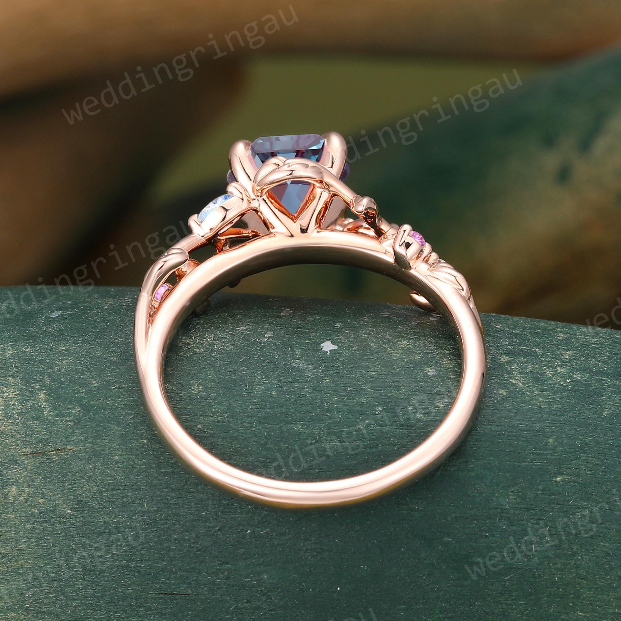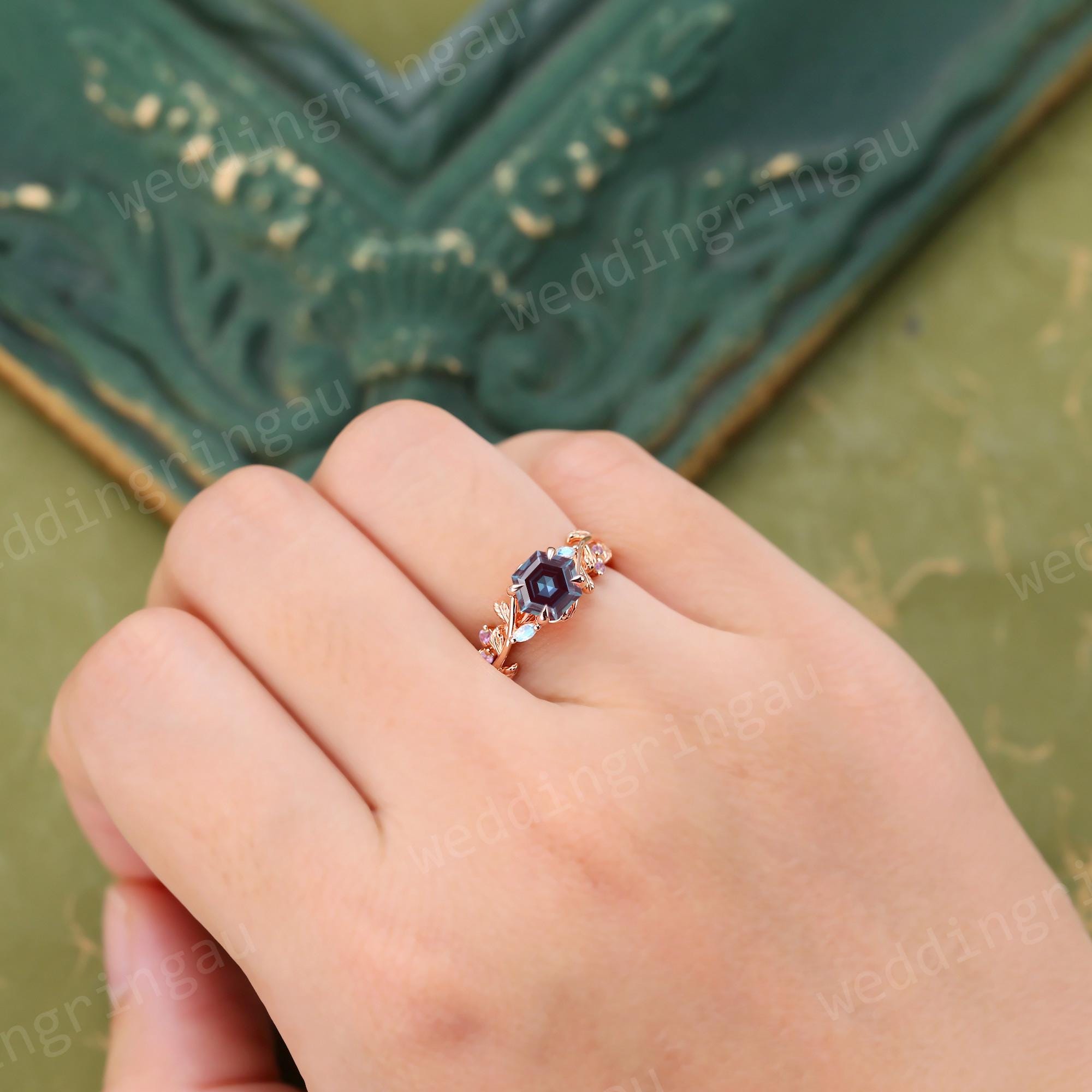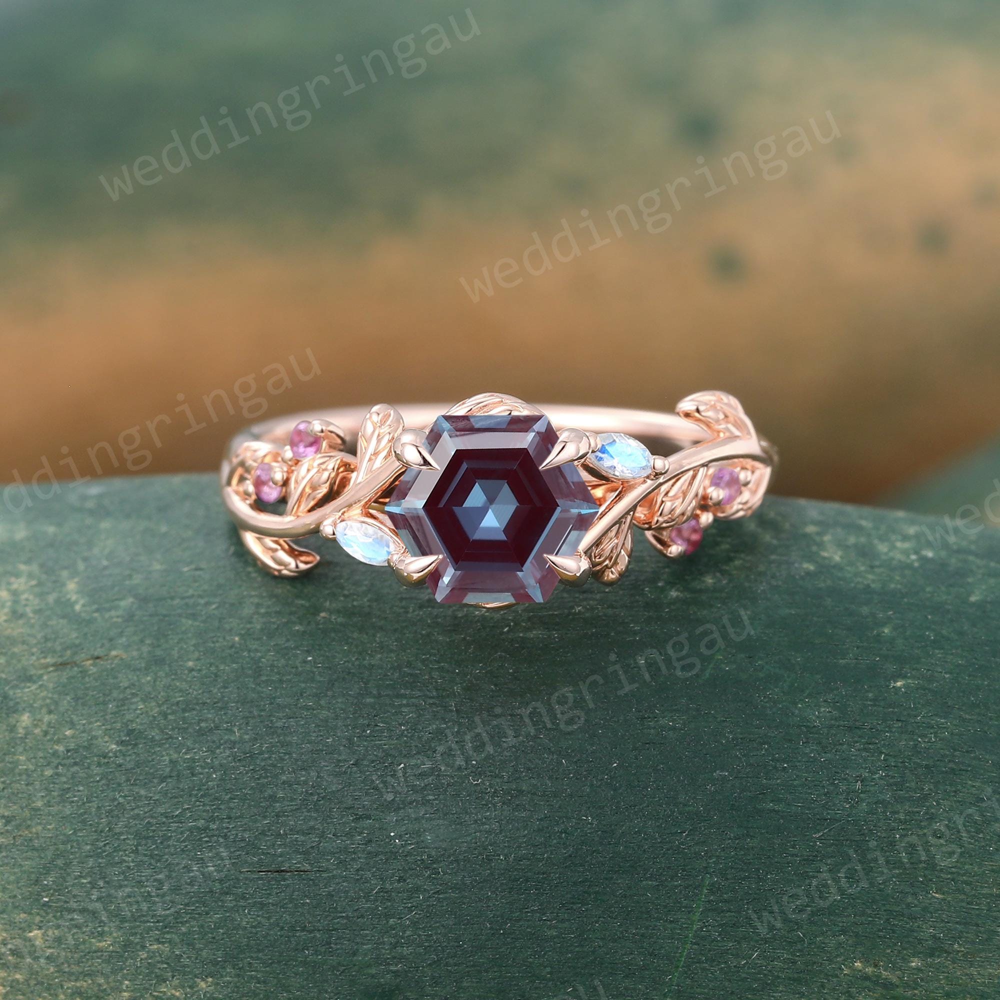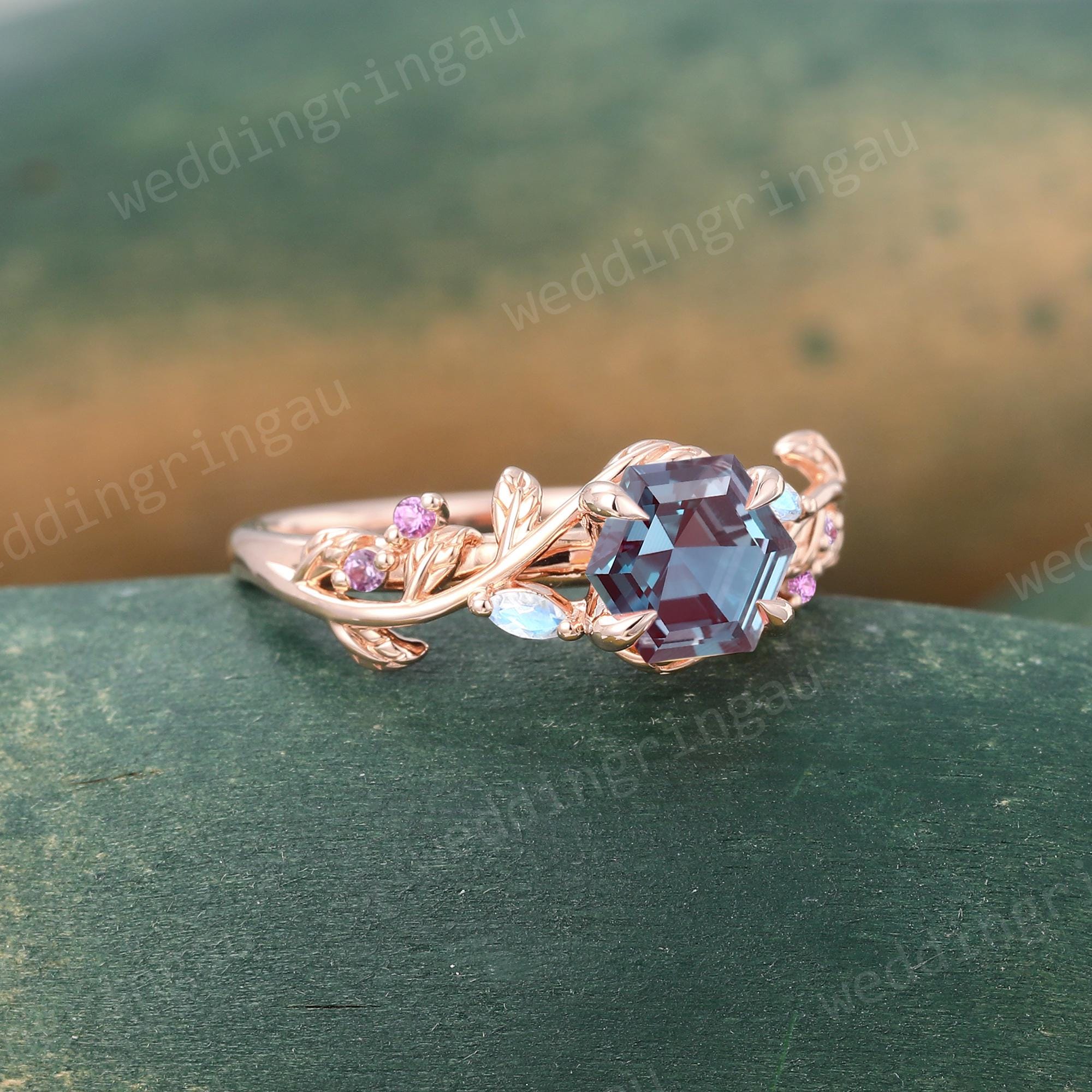 Vintage Hexagon cut Alexandrite Ring Unique Rose Gold Floral Leaf Engagement Ring Marquise cut Moonstone ring Amethyst Ring Anniversary Gift